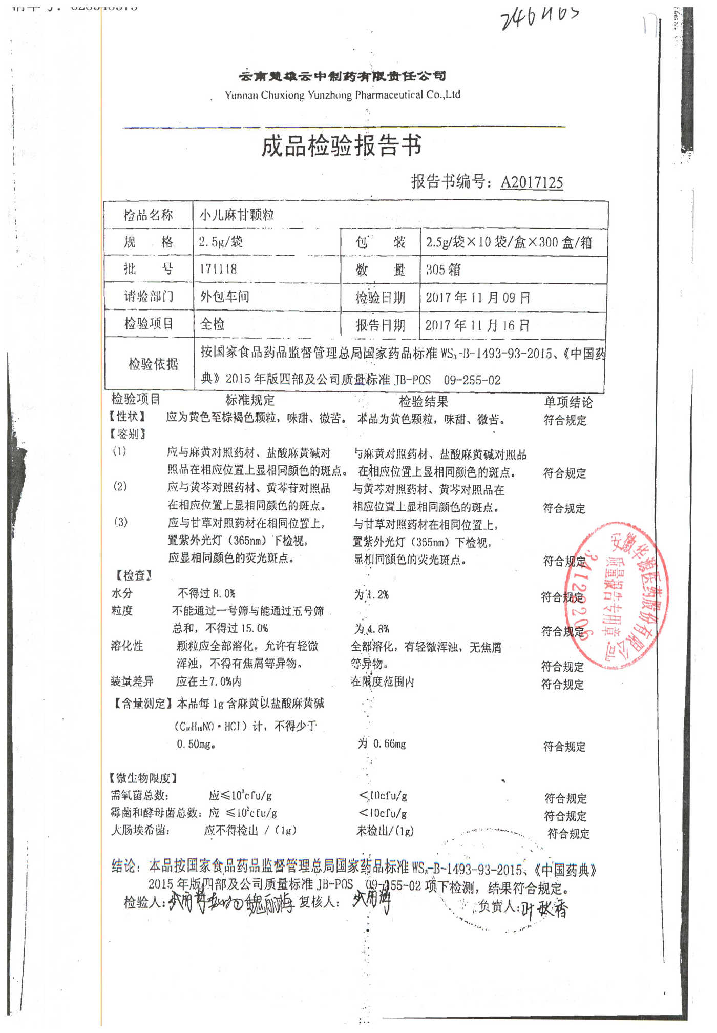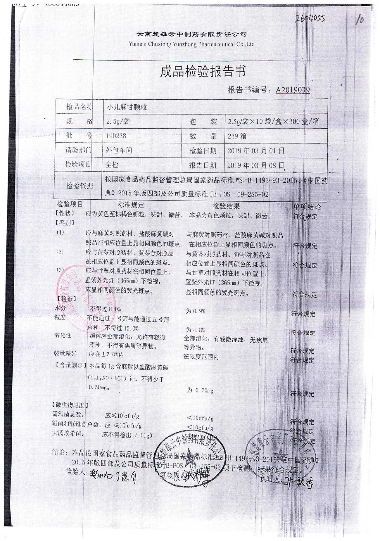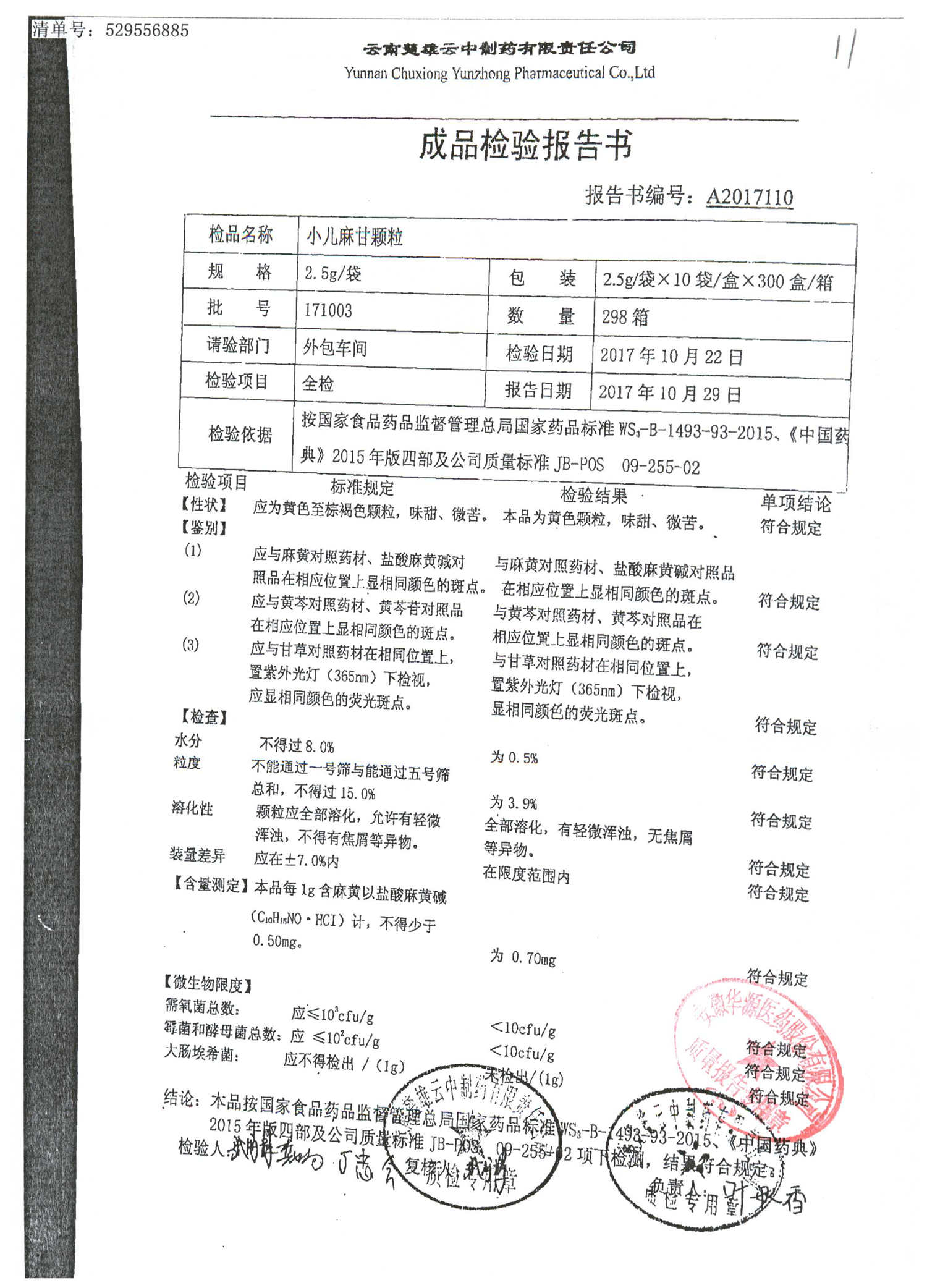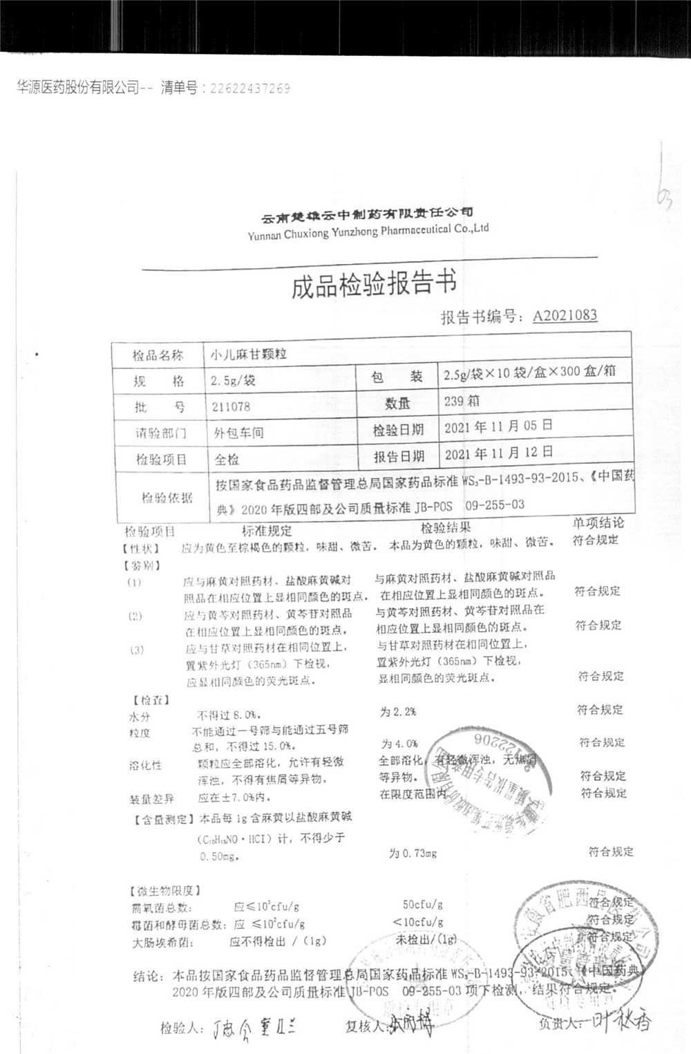 名称 | 规格 | 批号 | 药检报告 |