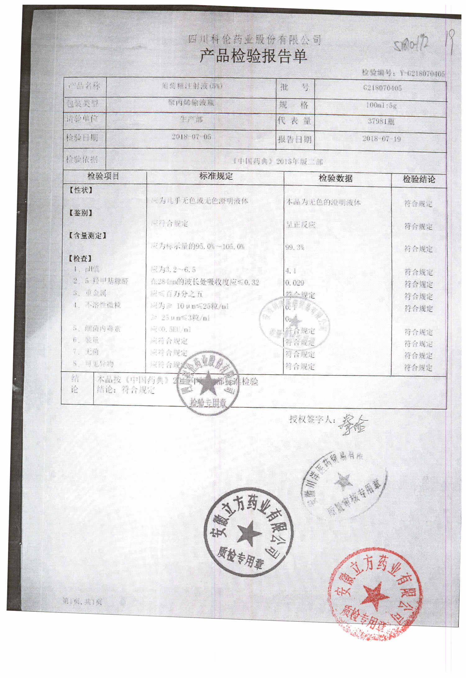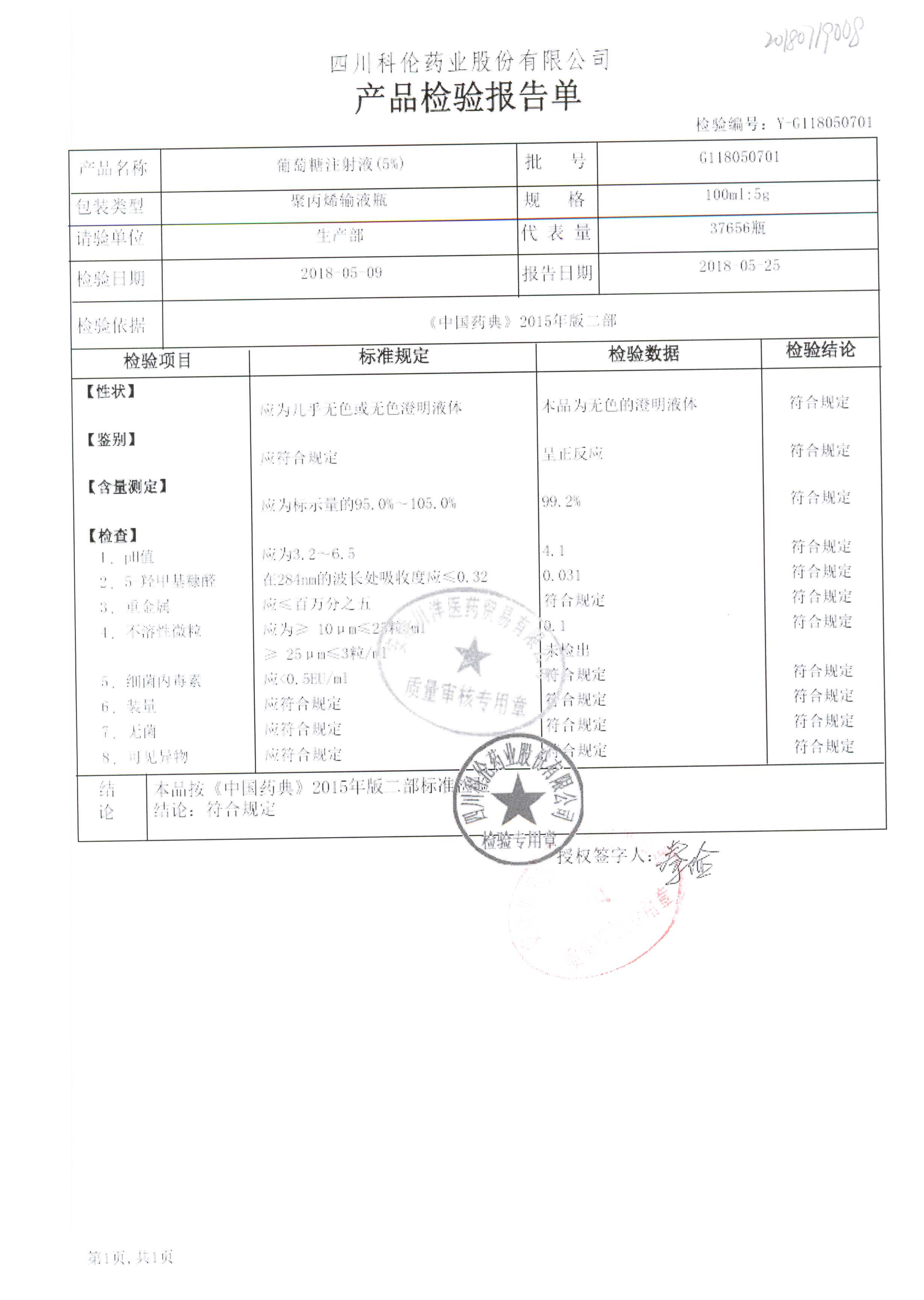 葡萄糖注射液 | 100ml:5g | G118050701 | 查看详情 |