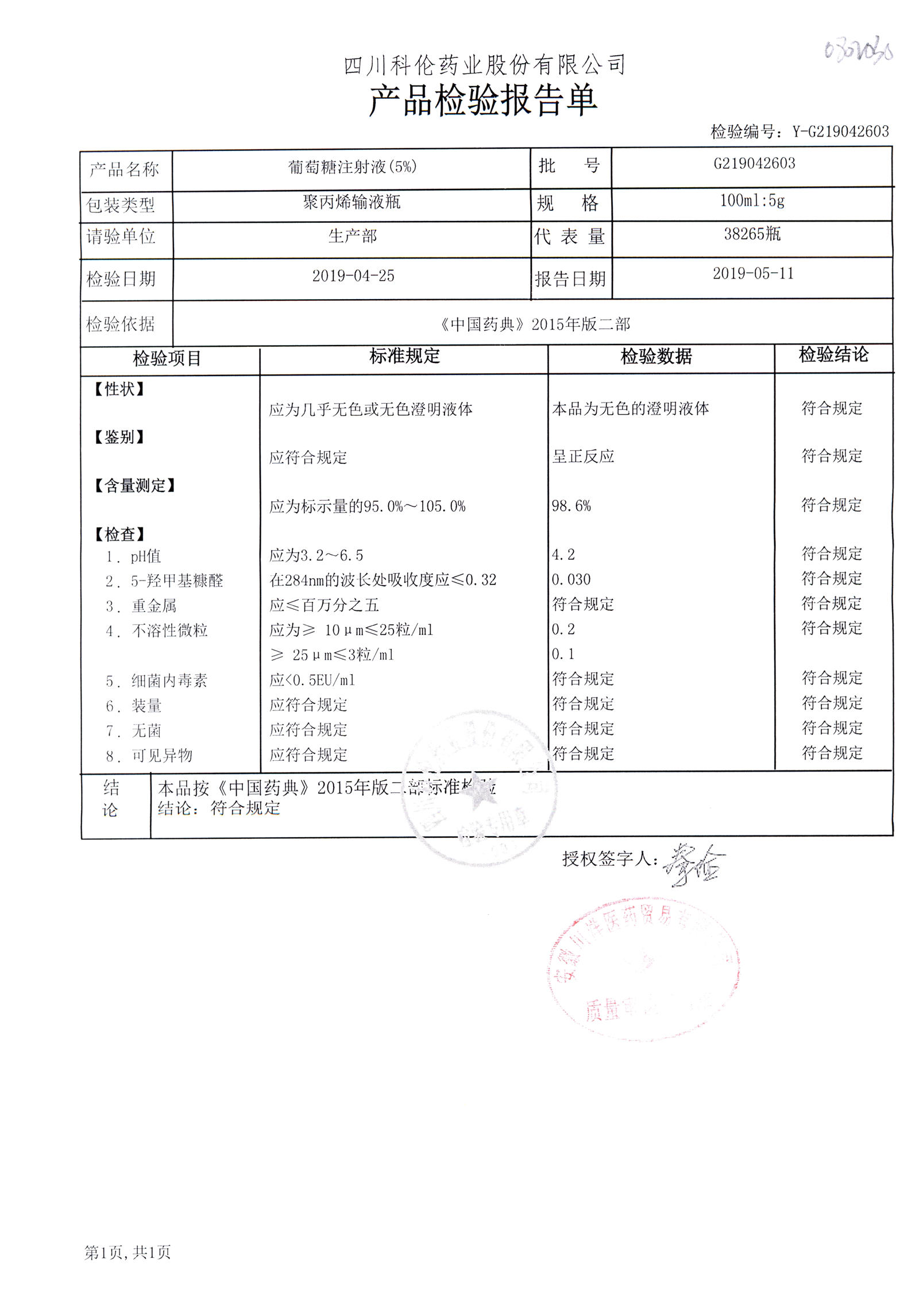 葡萄糖注射液 | 100ml:5g | G219042603 | 查看详情 |