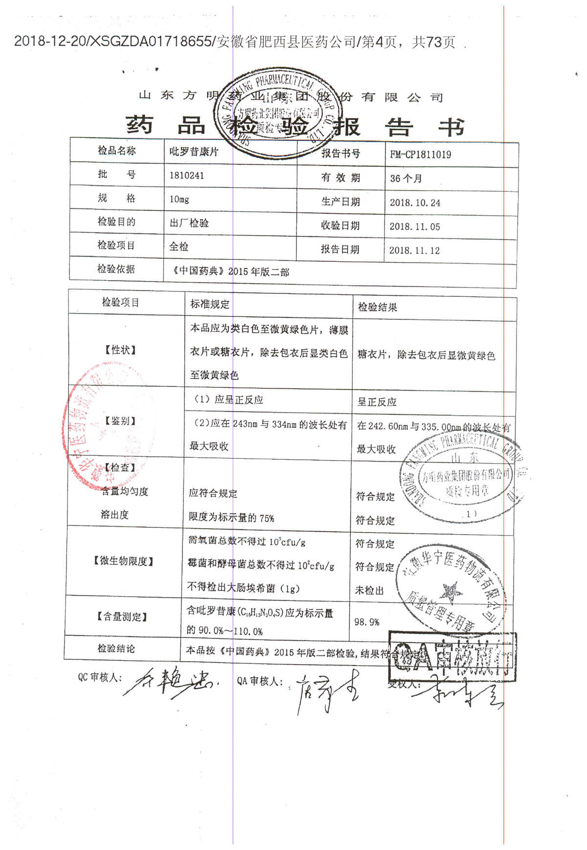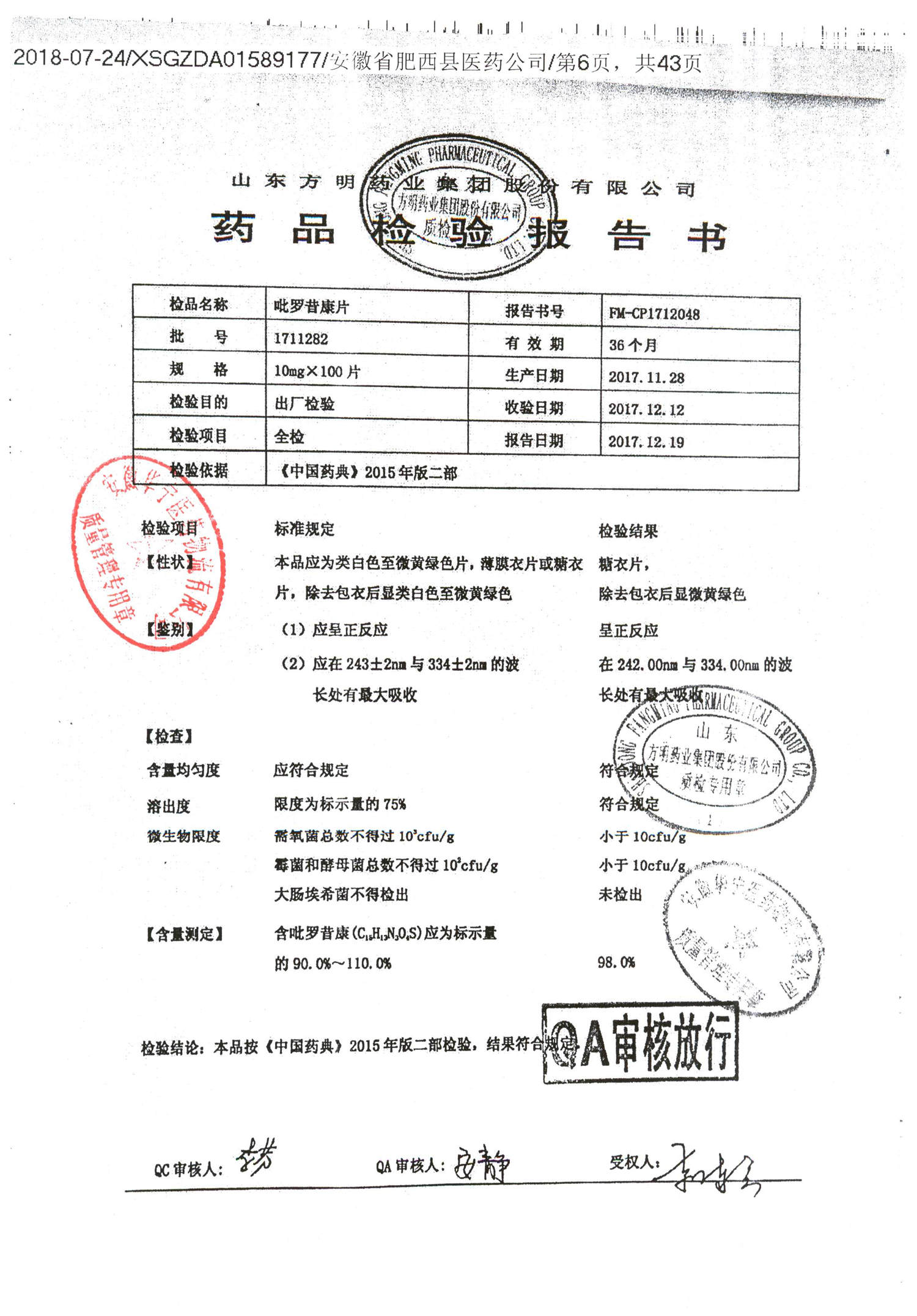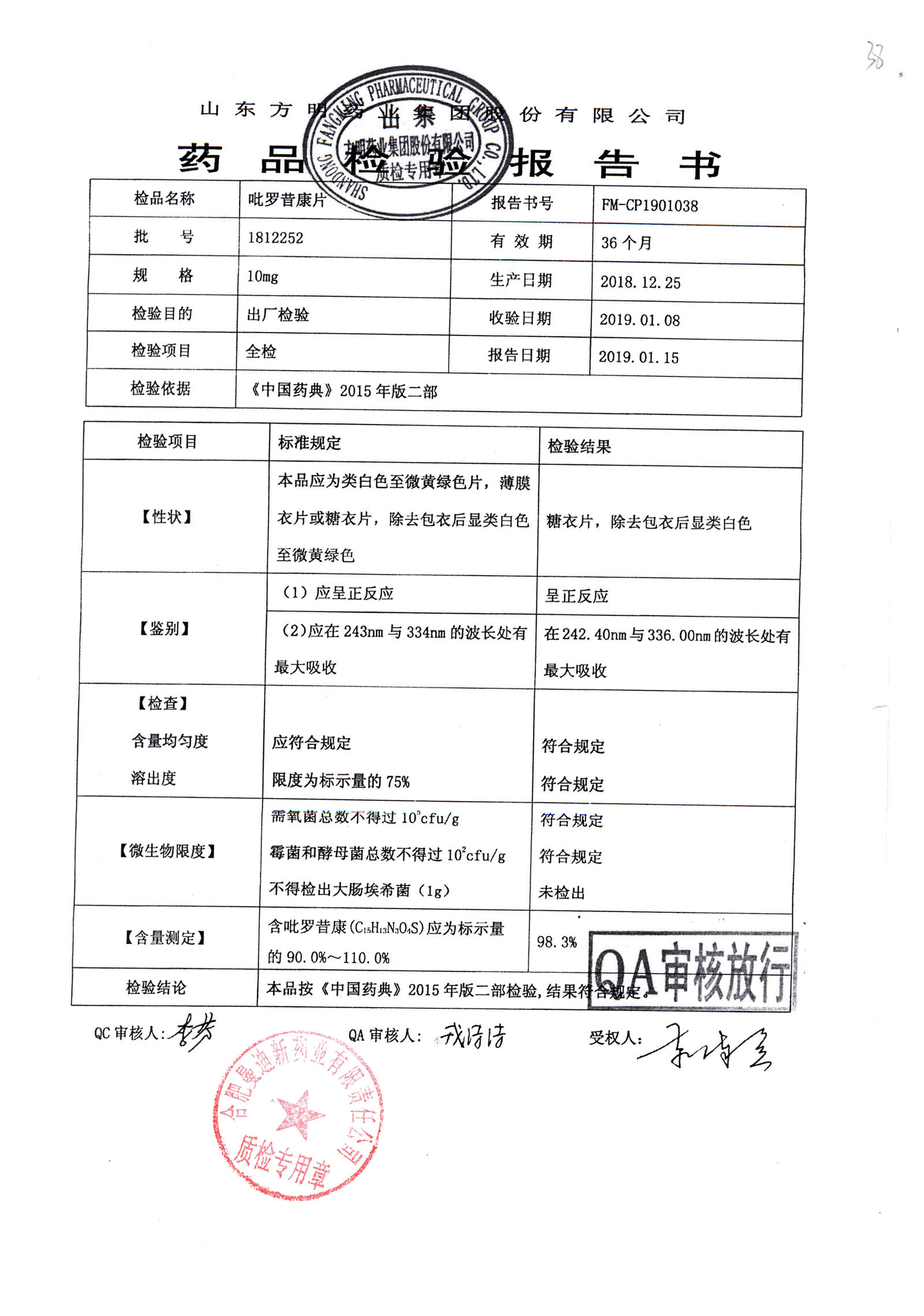 名称 | 规格 | 批号 | 药检报告 |