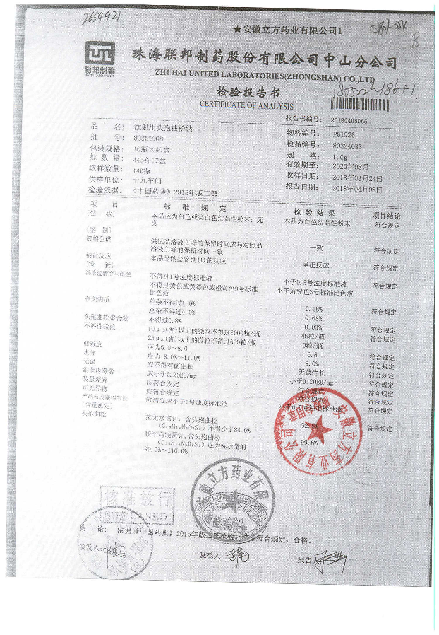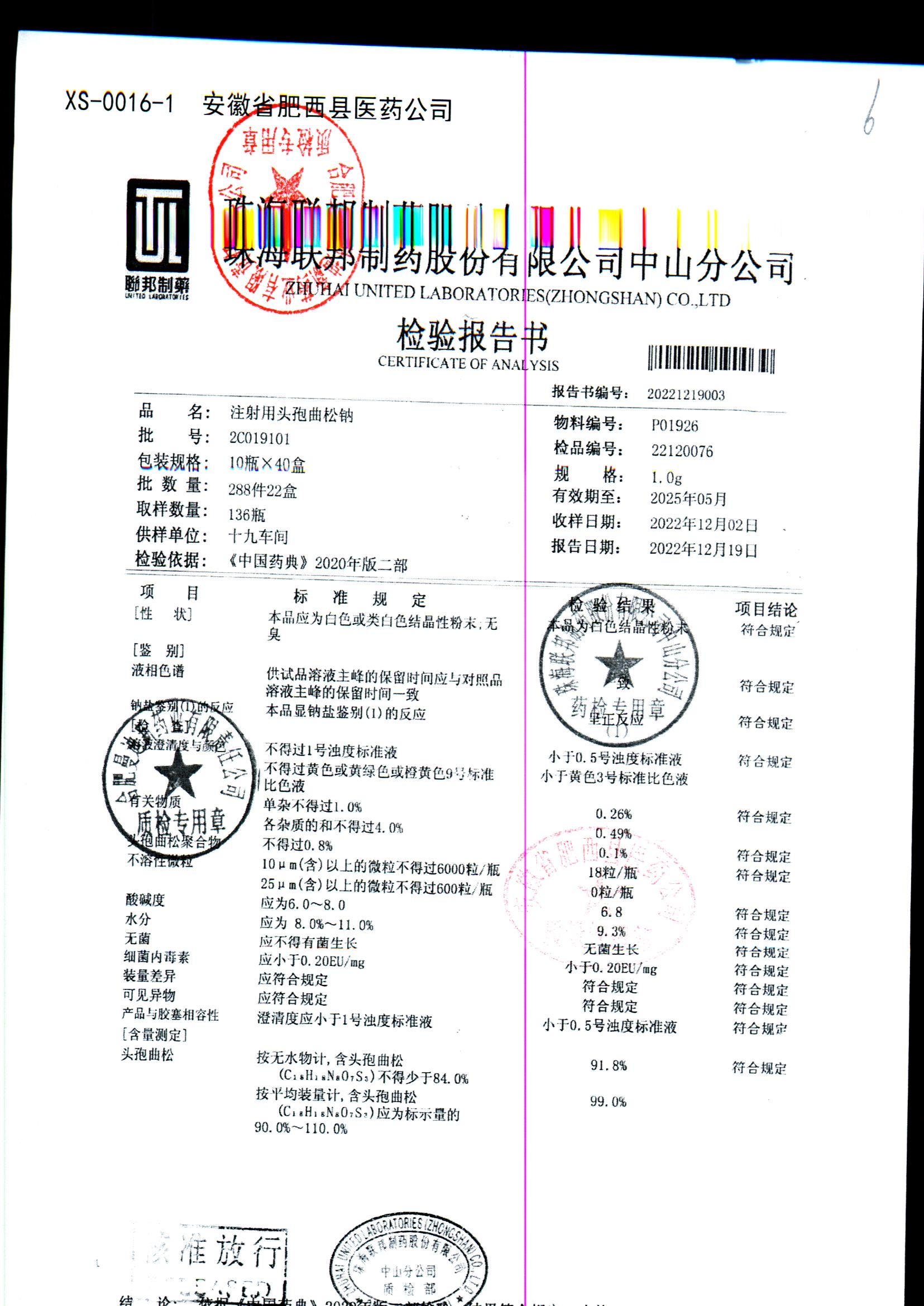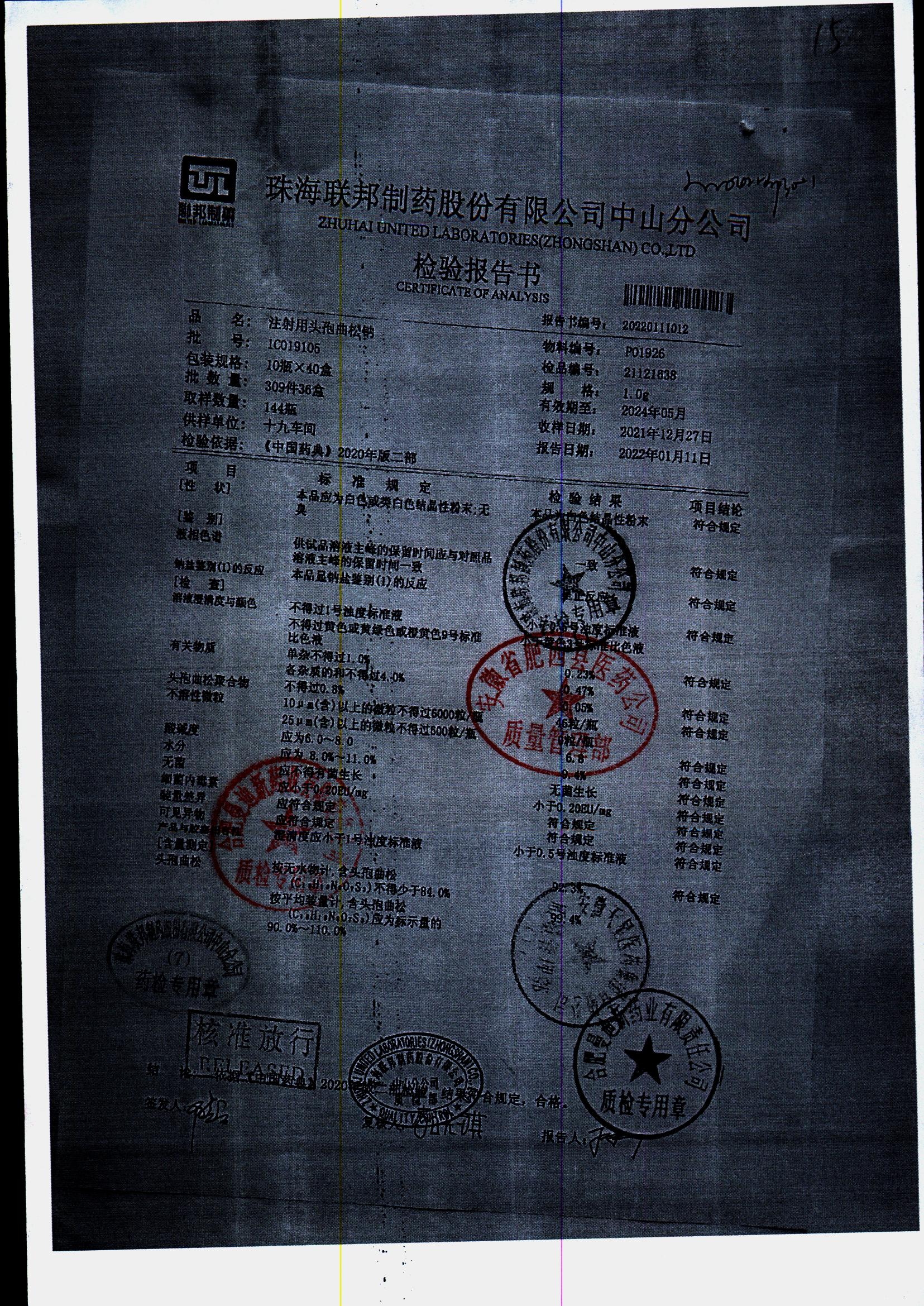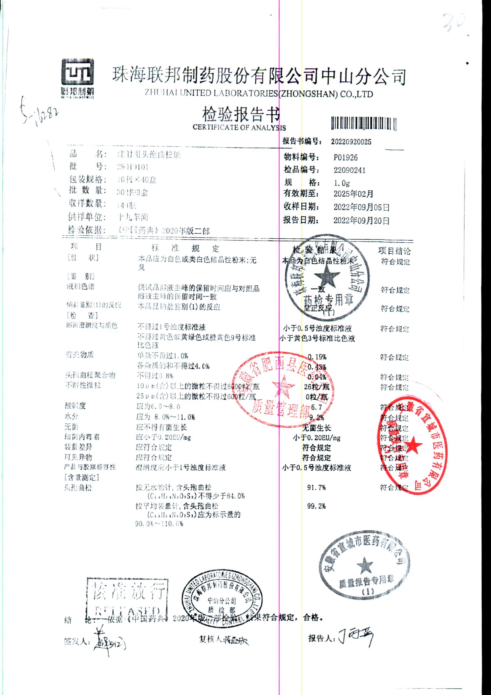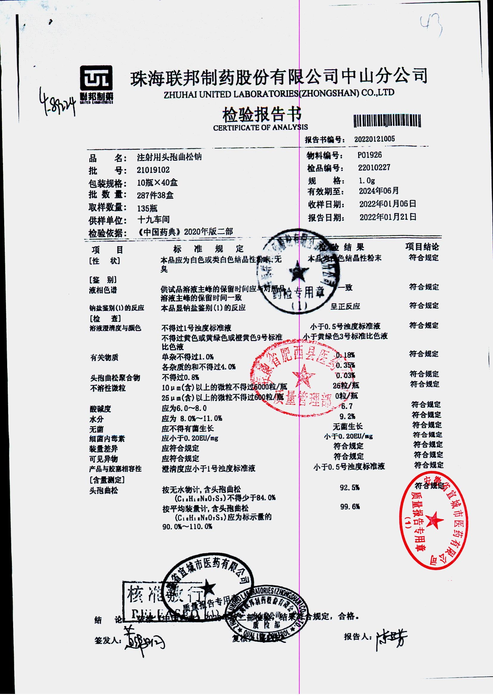 注射用头孢曲松钠 | 1.0g | 0C019102 | 查看详情 |