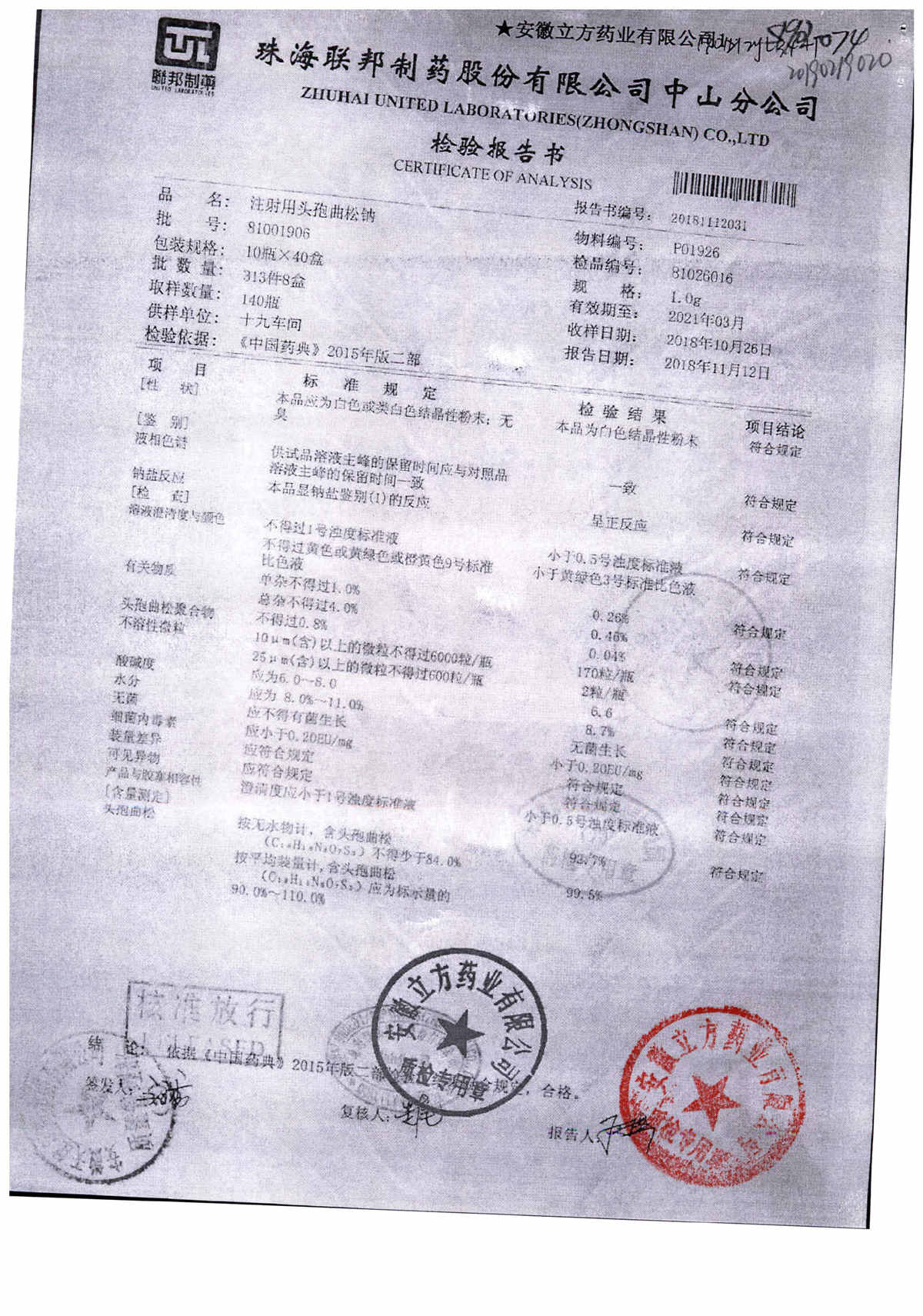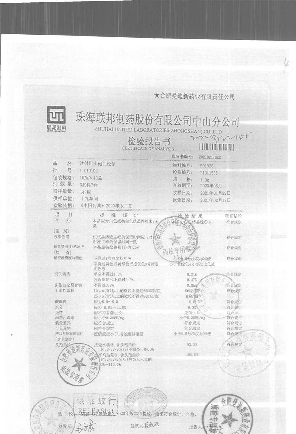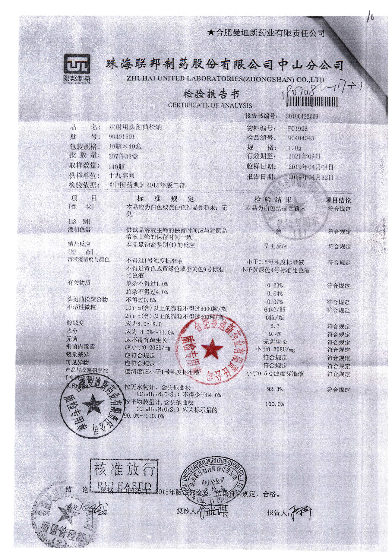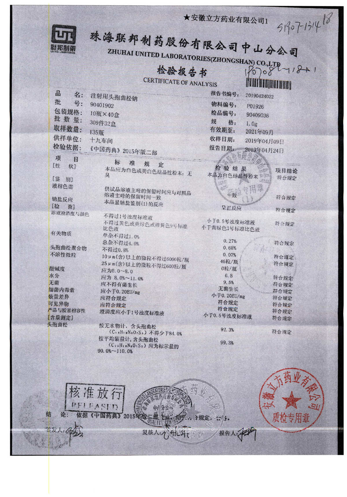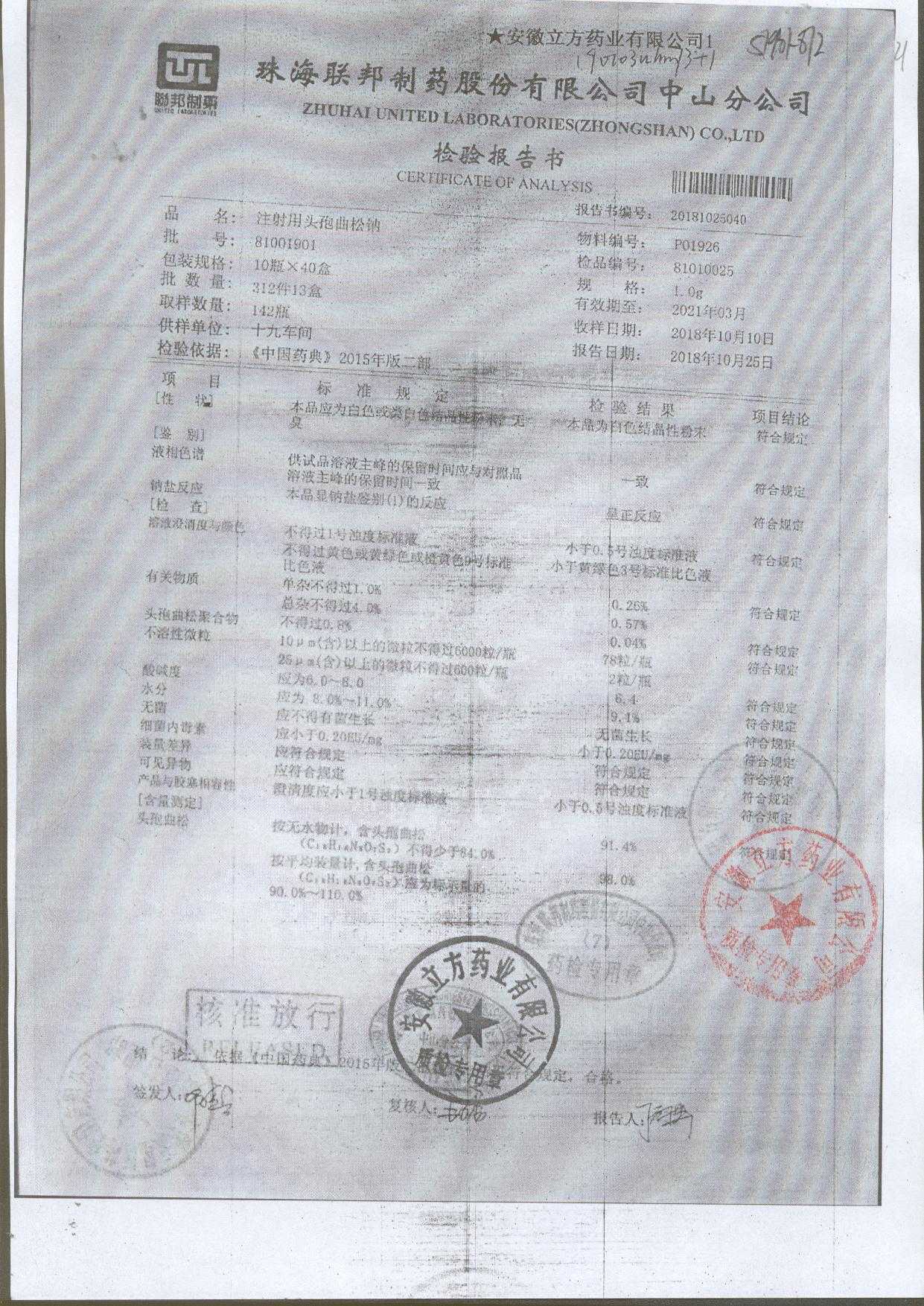 注射用头孢曲松钠 | 1.0g | 0C019102 | 查看详情 |