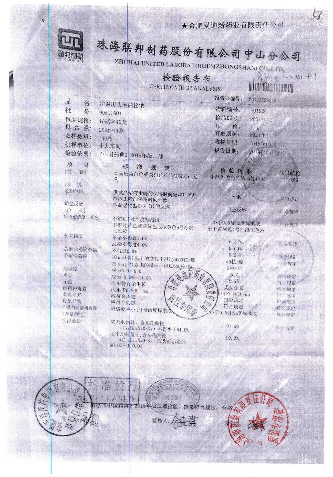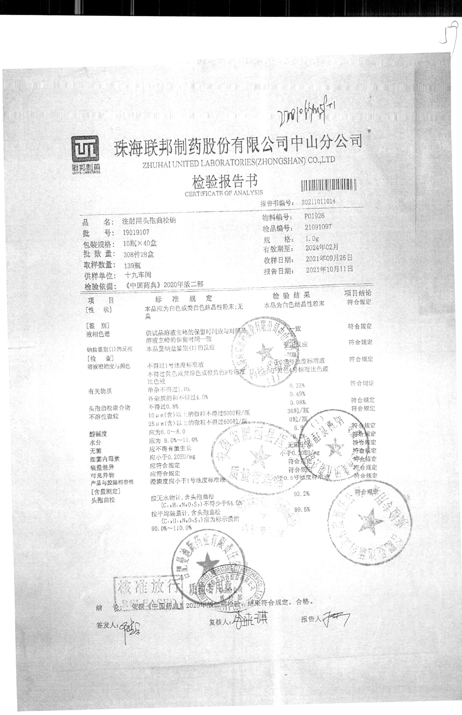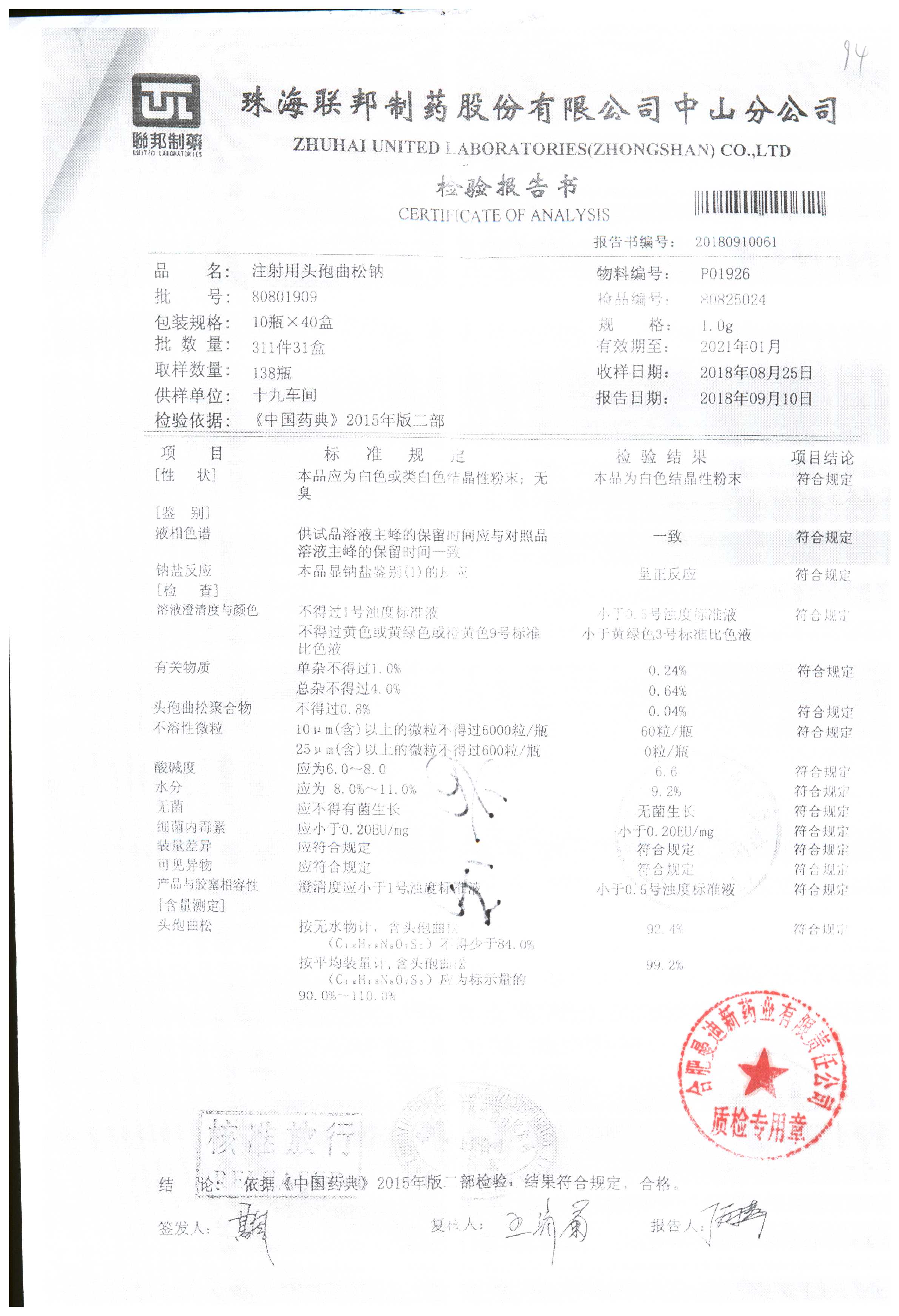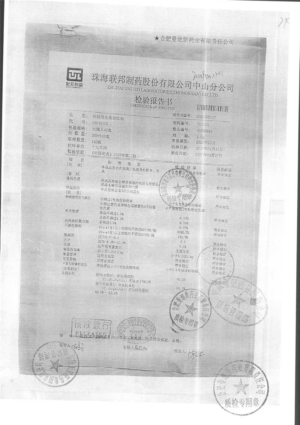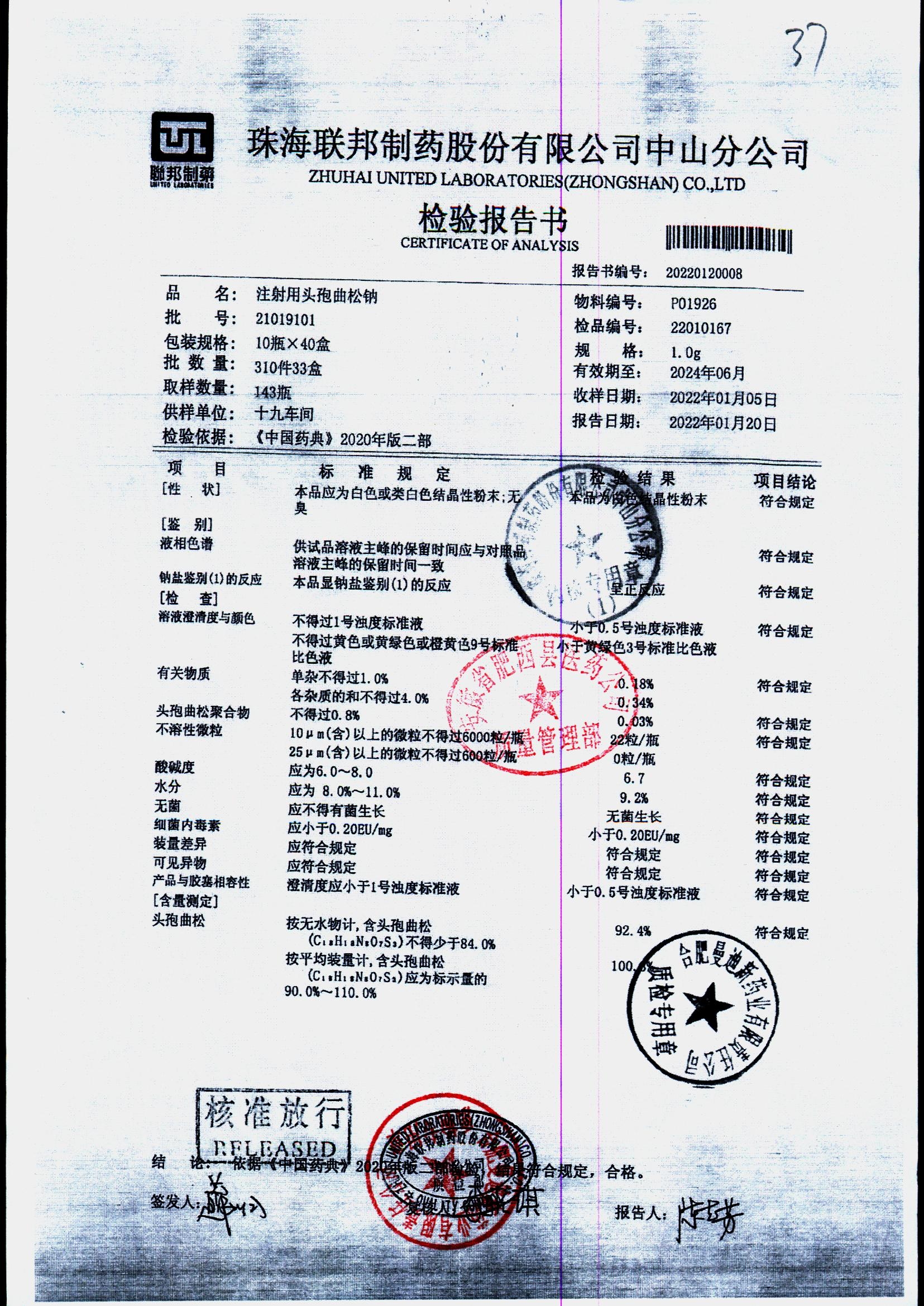 注射用头孢曲松钠 | 1.0g | 0C019102 | 查看详情 |