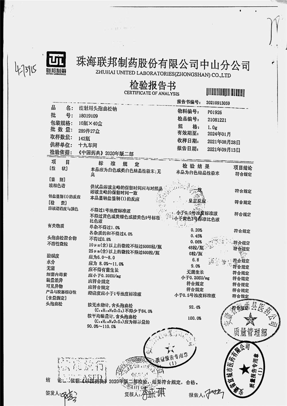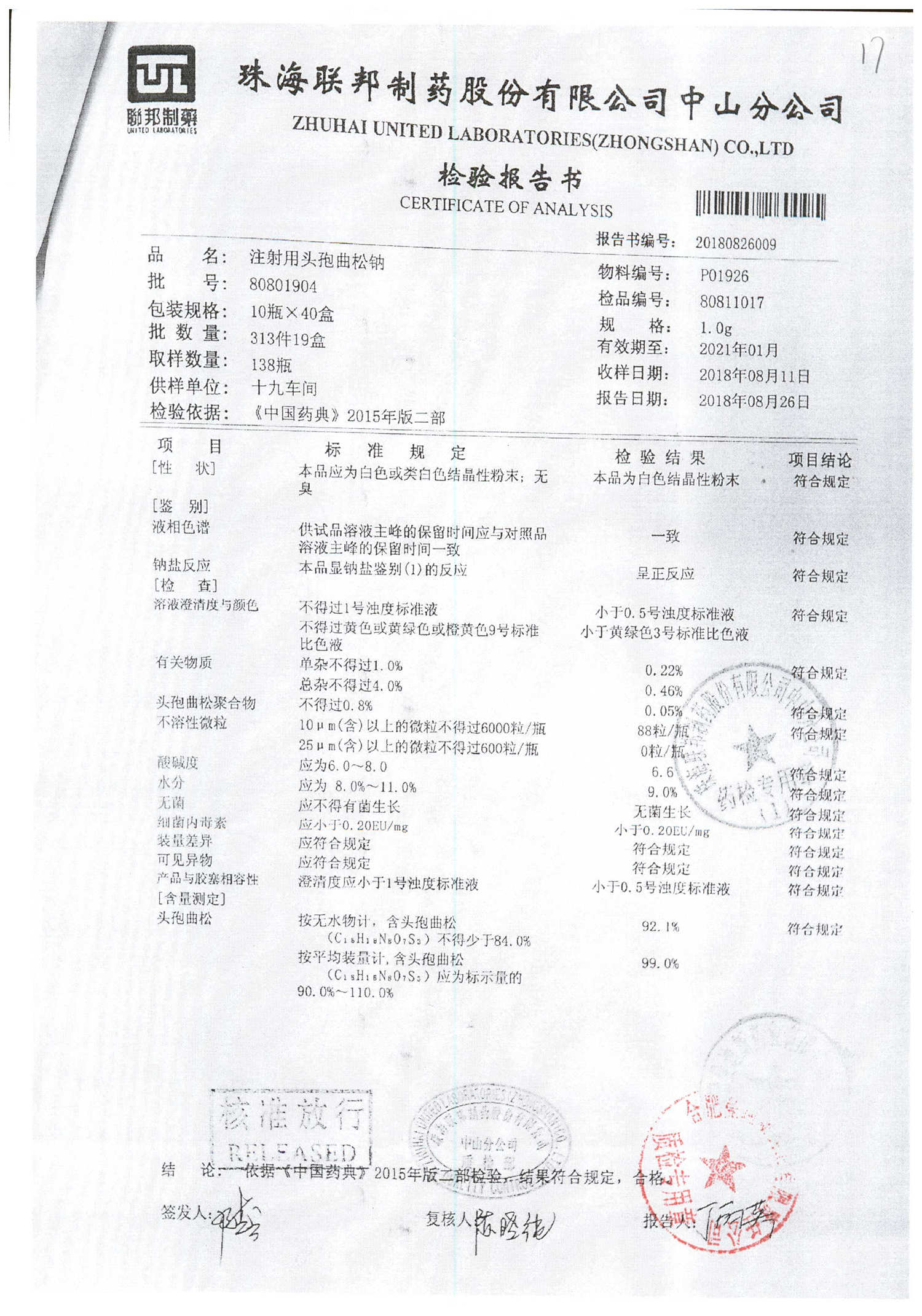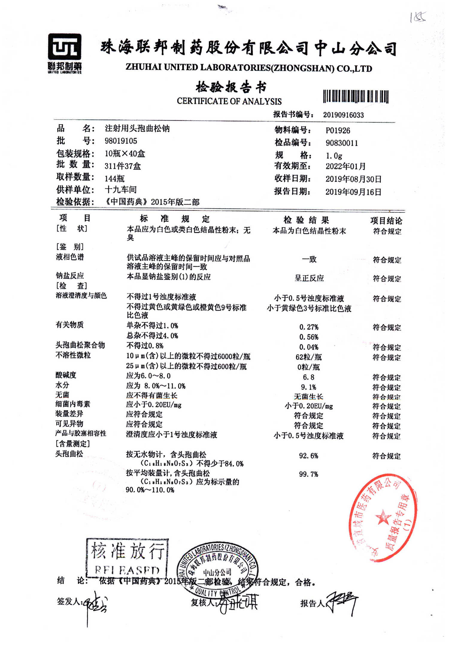 注射用头孢曲松钠 | 1.0g | 9A019103 | 查看详情 |