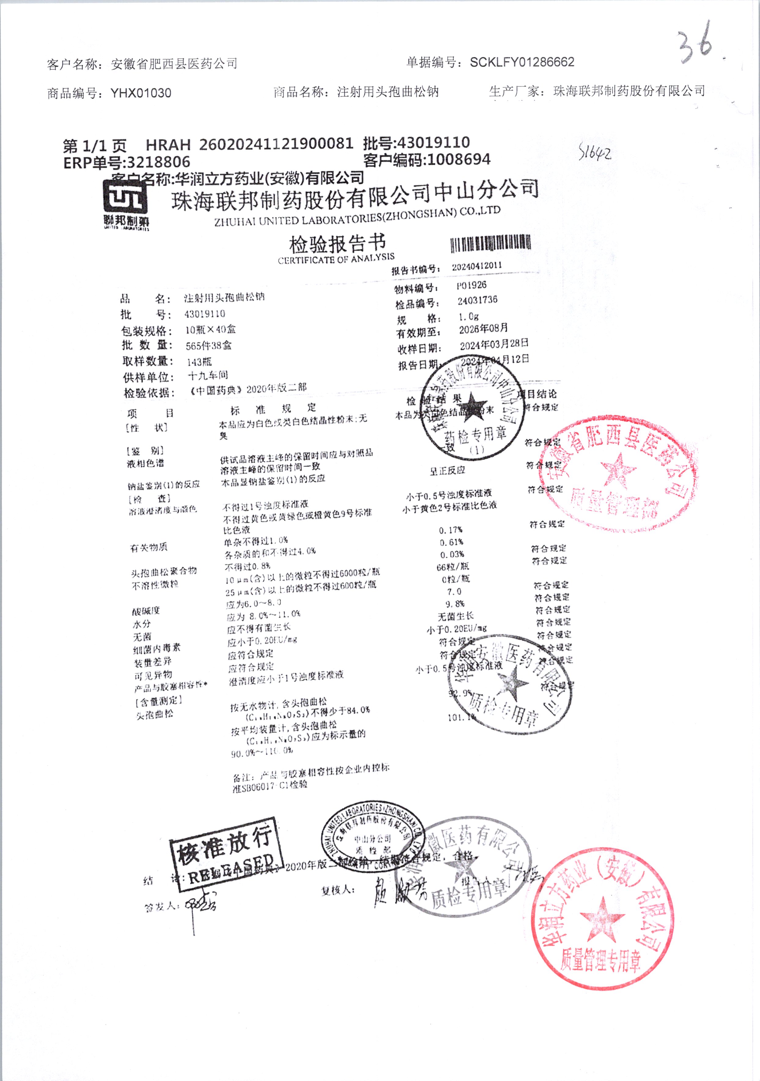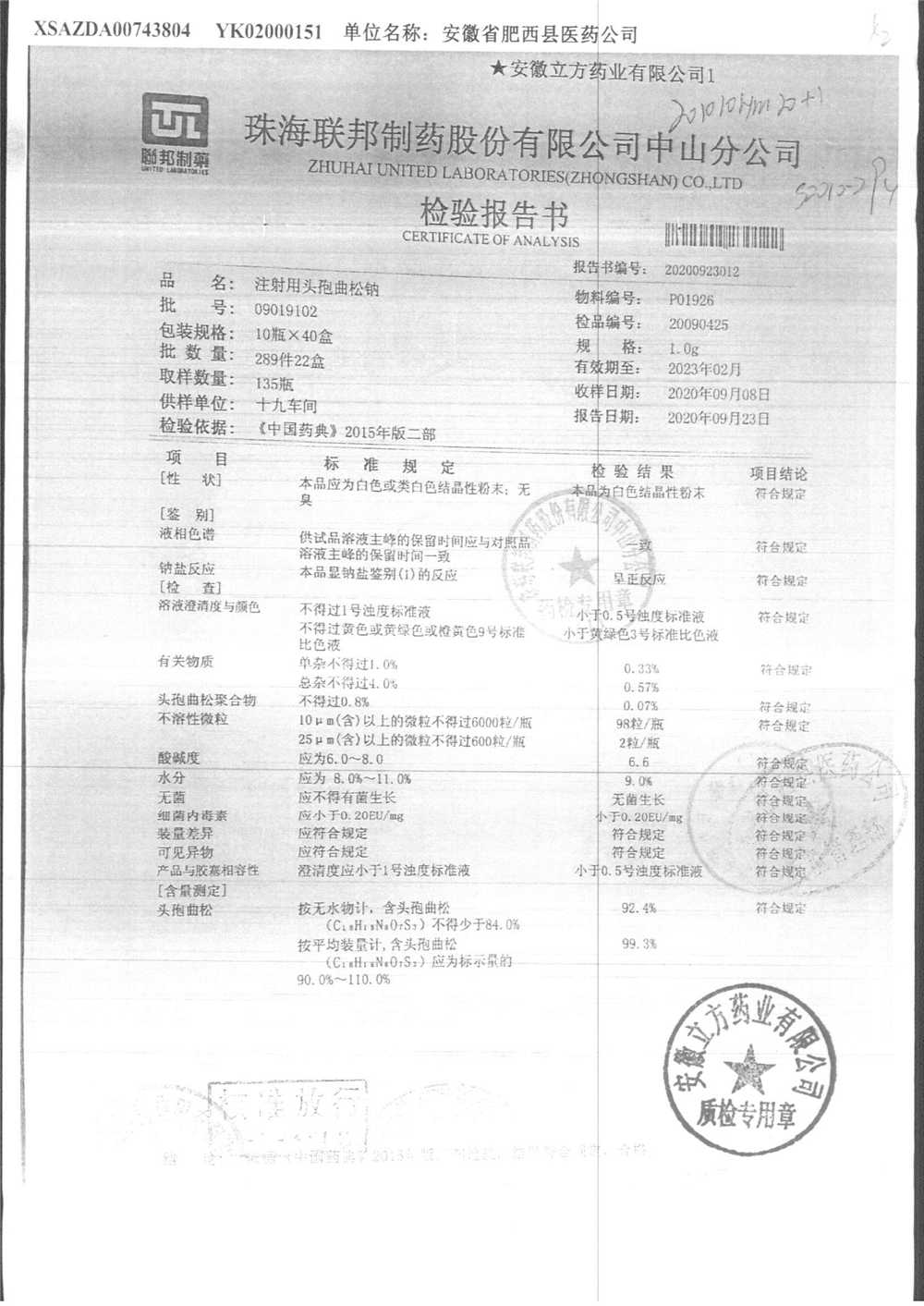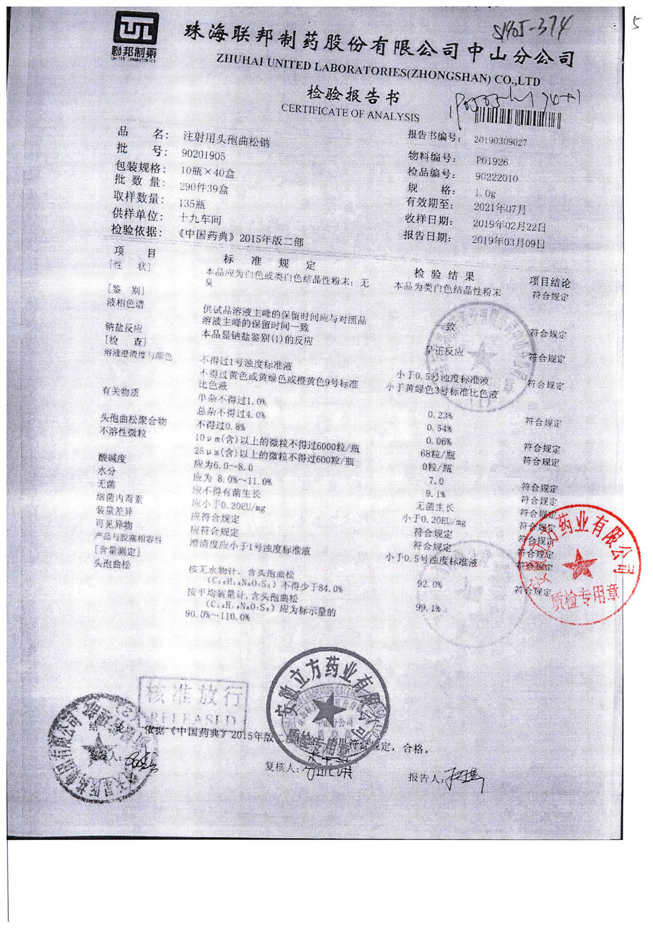 注射用头孢曲松钠 | 1.0g | 9A019103 | 查看详情 |
