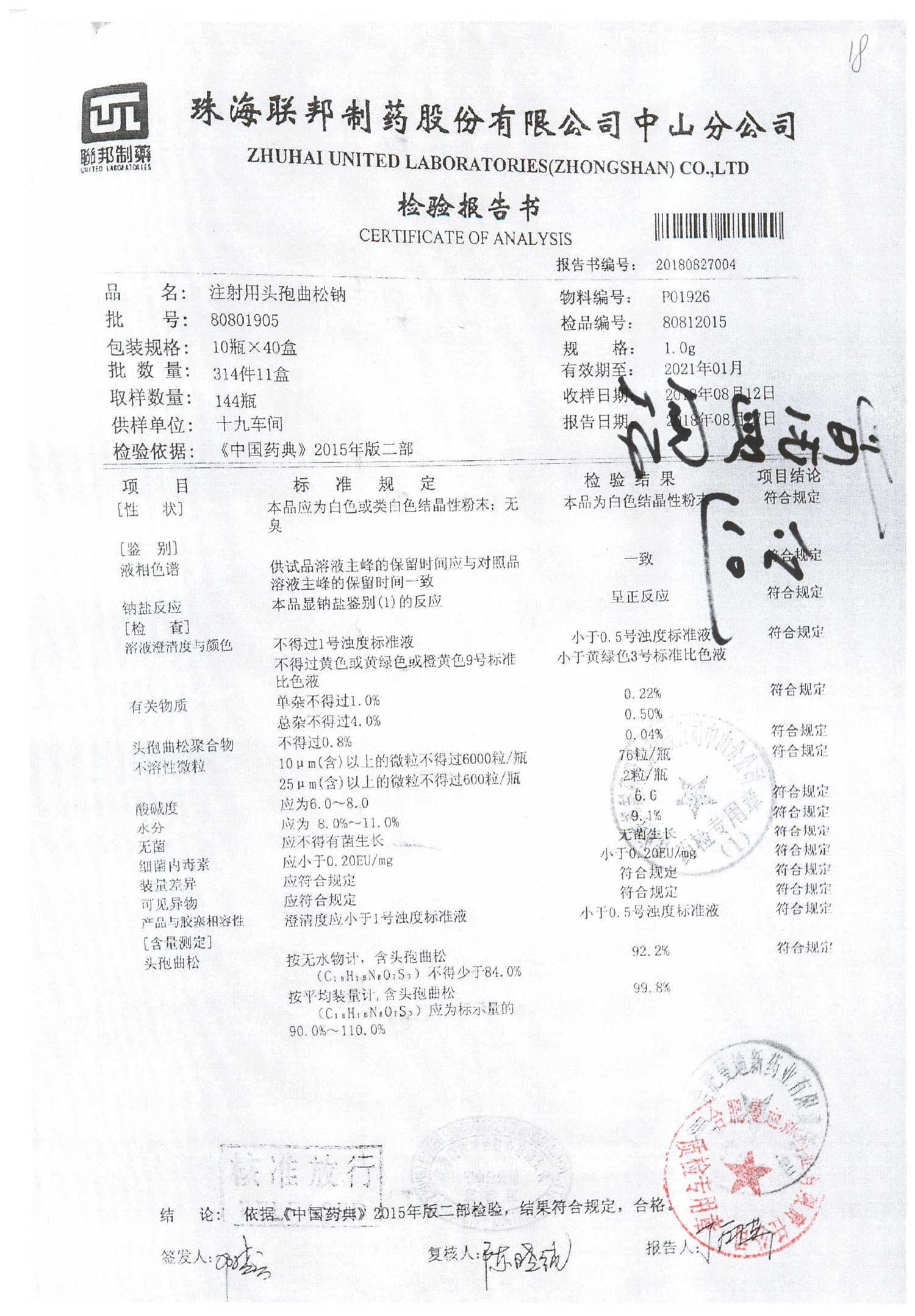 注射用头孢曲松钠 | 1.0g | 80801905 | 查看详情 |