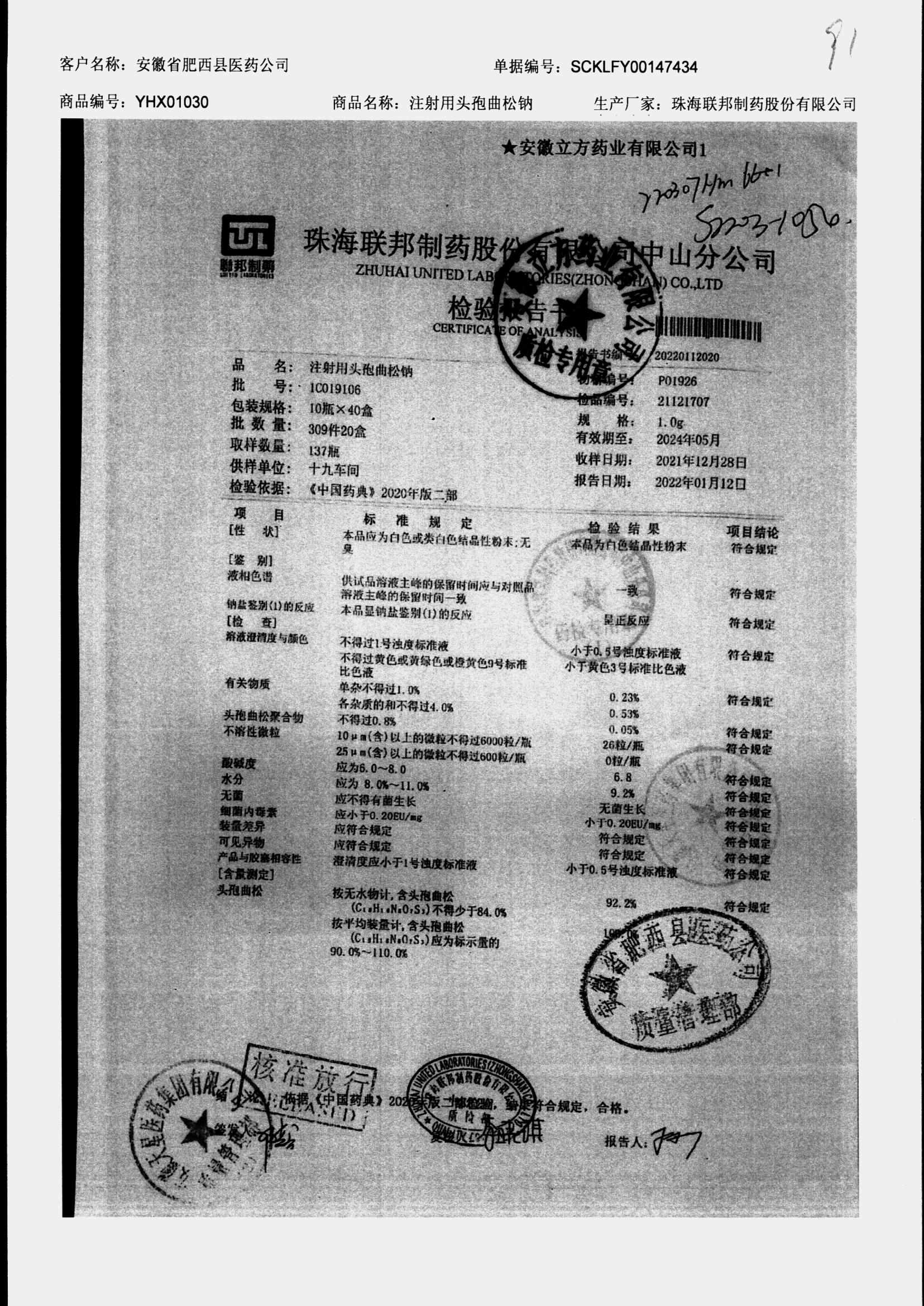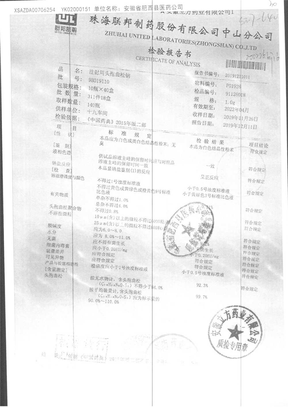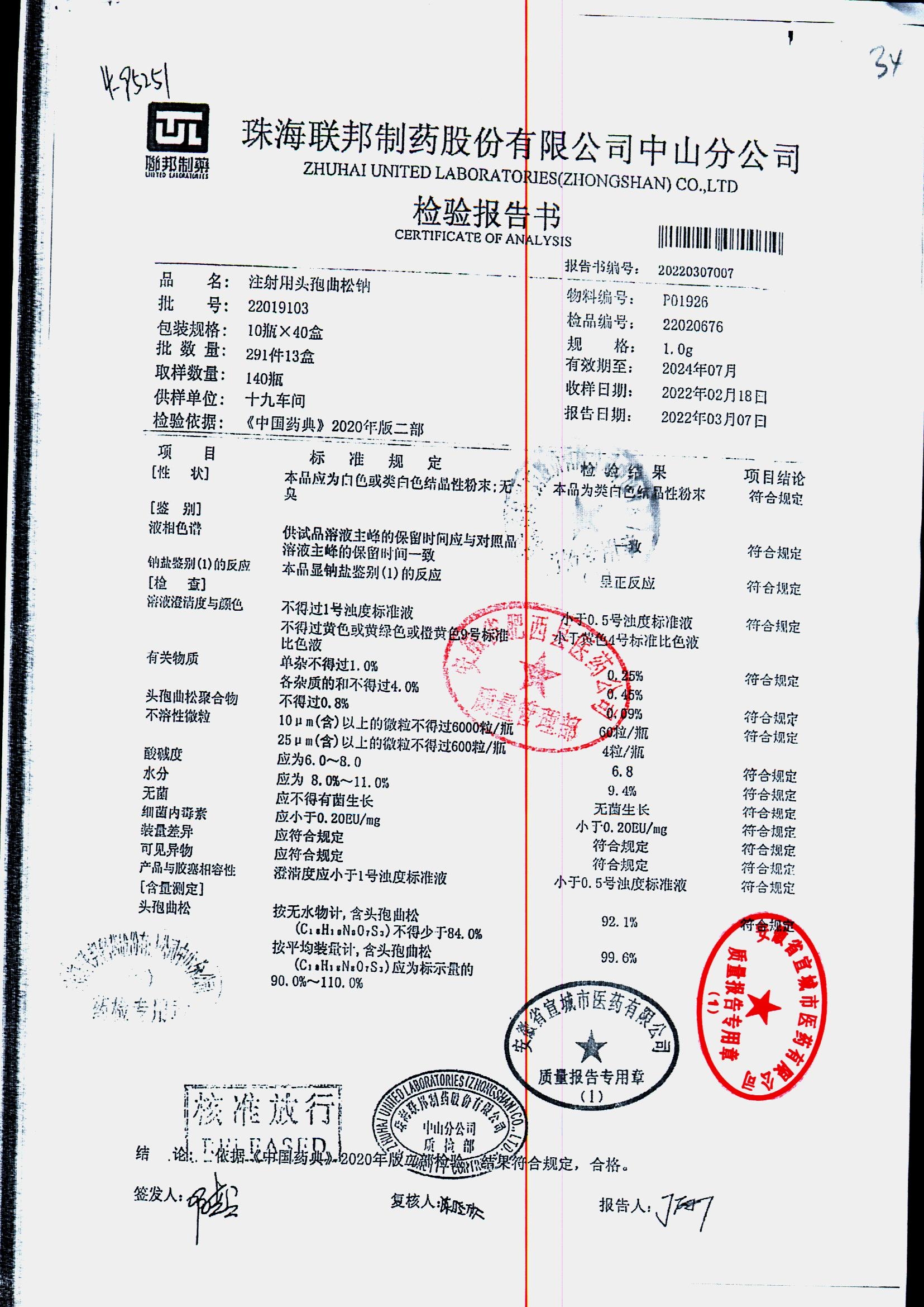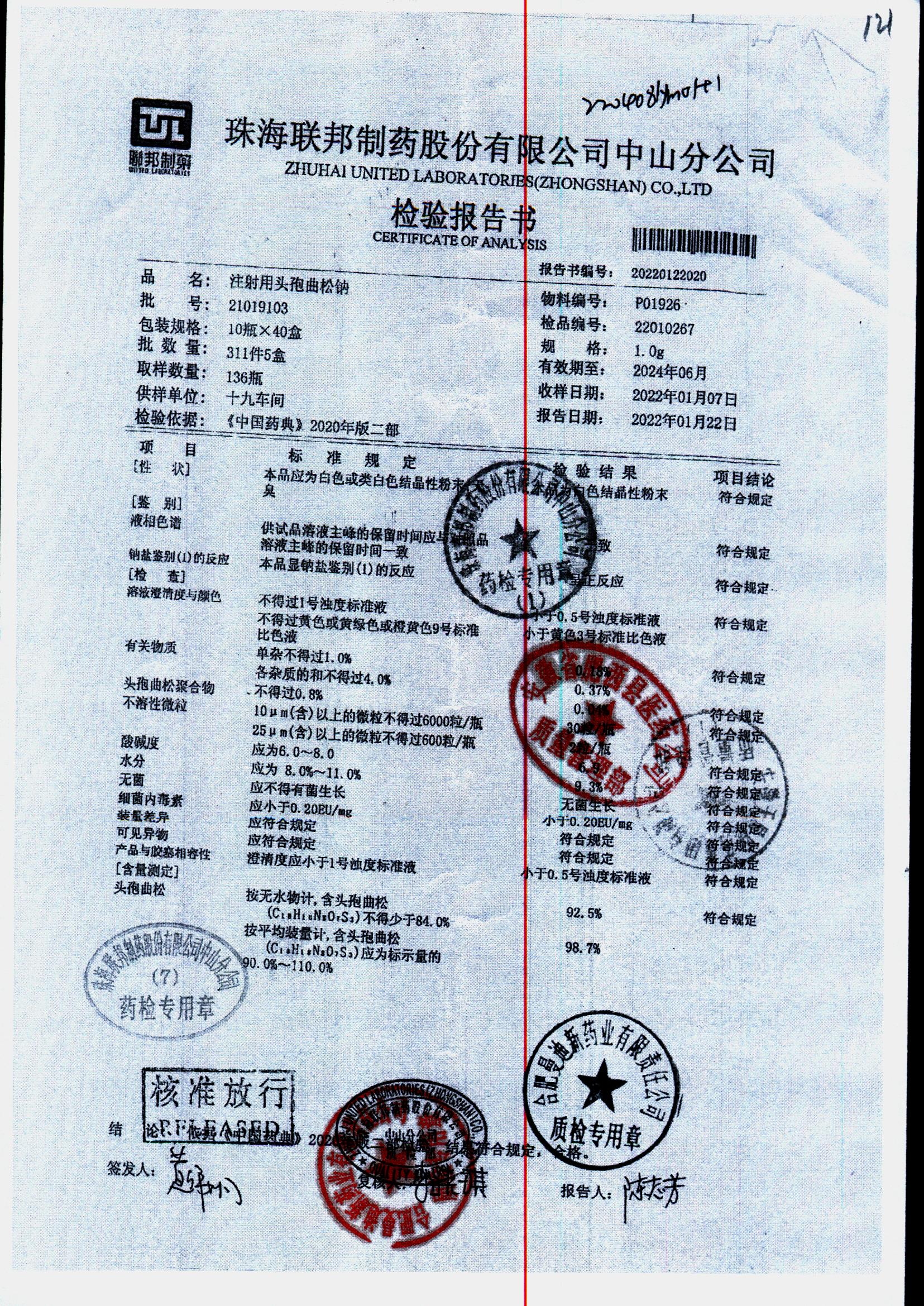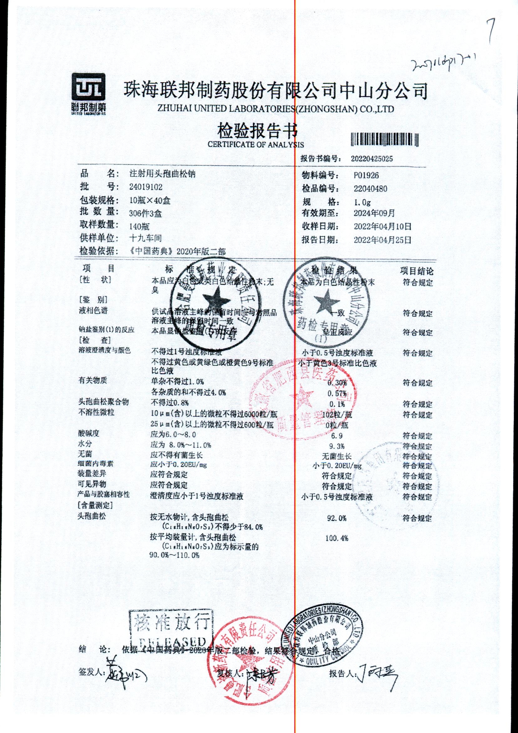 注射用头孢曲松钠 | 1.0g | 22019103 | 查看详情 |