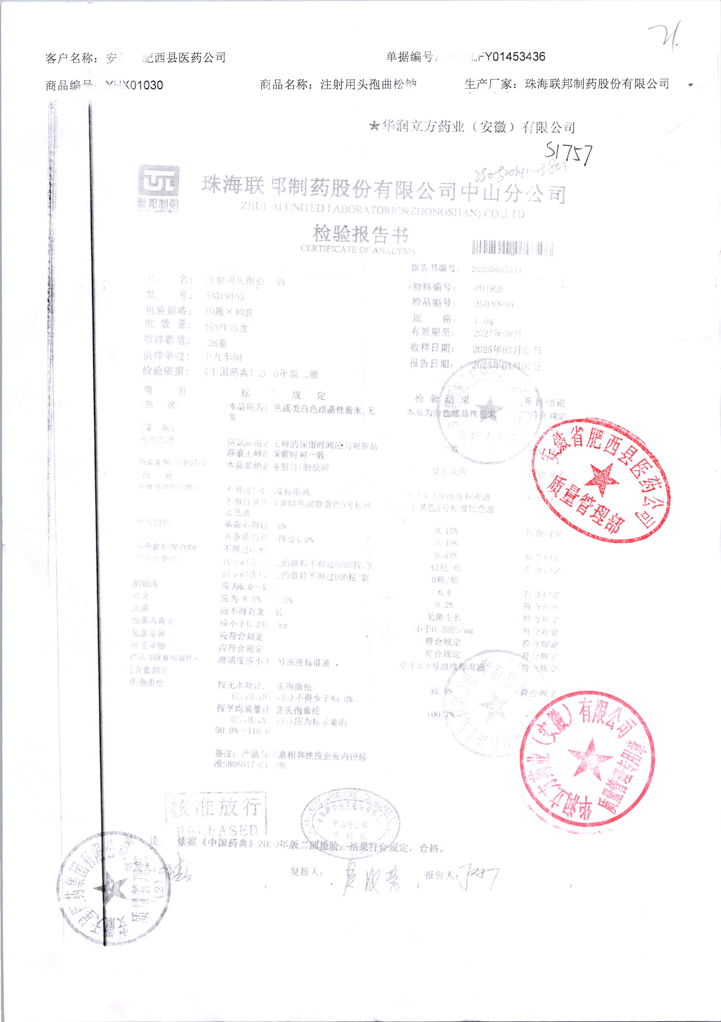 注射用头孢曲松钠 | 1.0g | 4B019104 | 查看详情 |