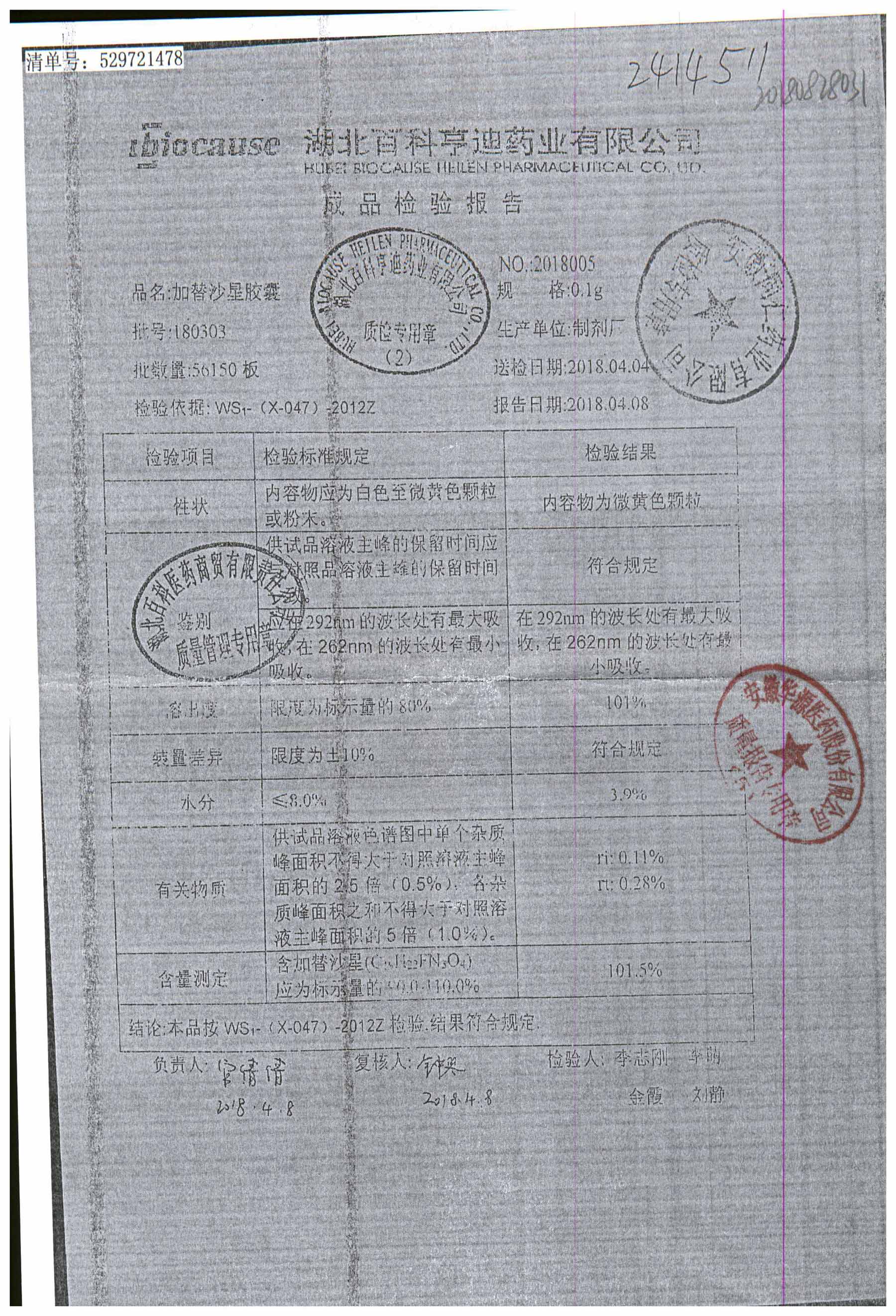 加替沙星胶囊 | 0.1g | 180304(2/2) | 查看详情 |
