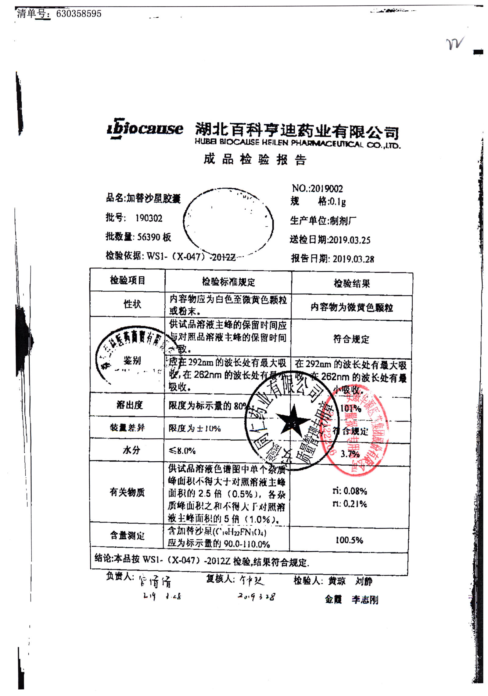 加替沙星胶囊 | 0.1g | 190302(1/2) | 查看详情 |