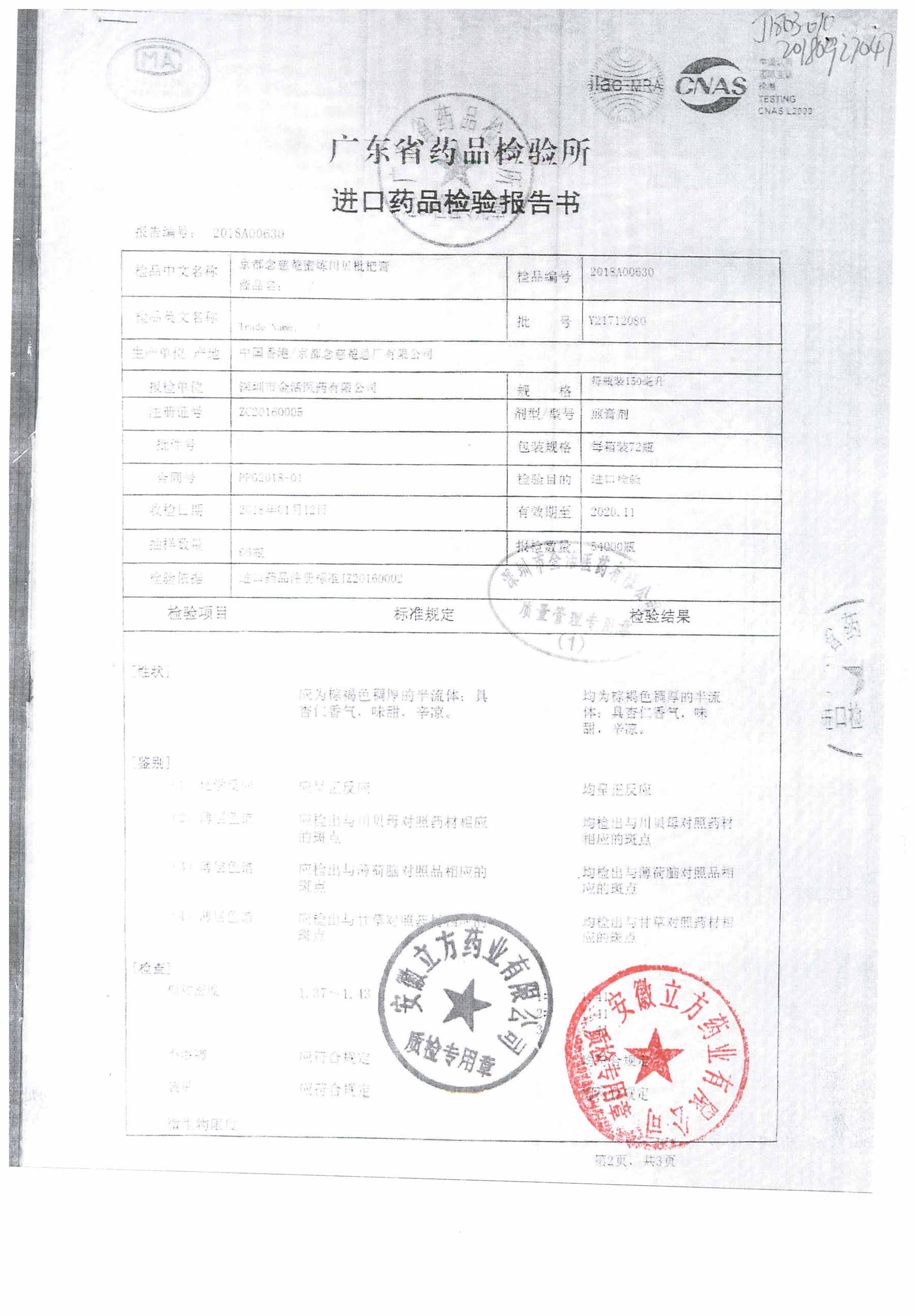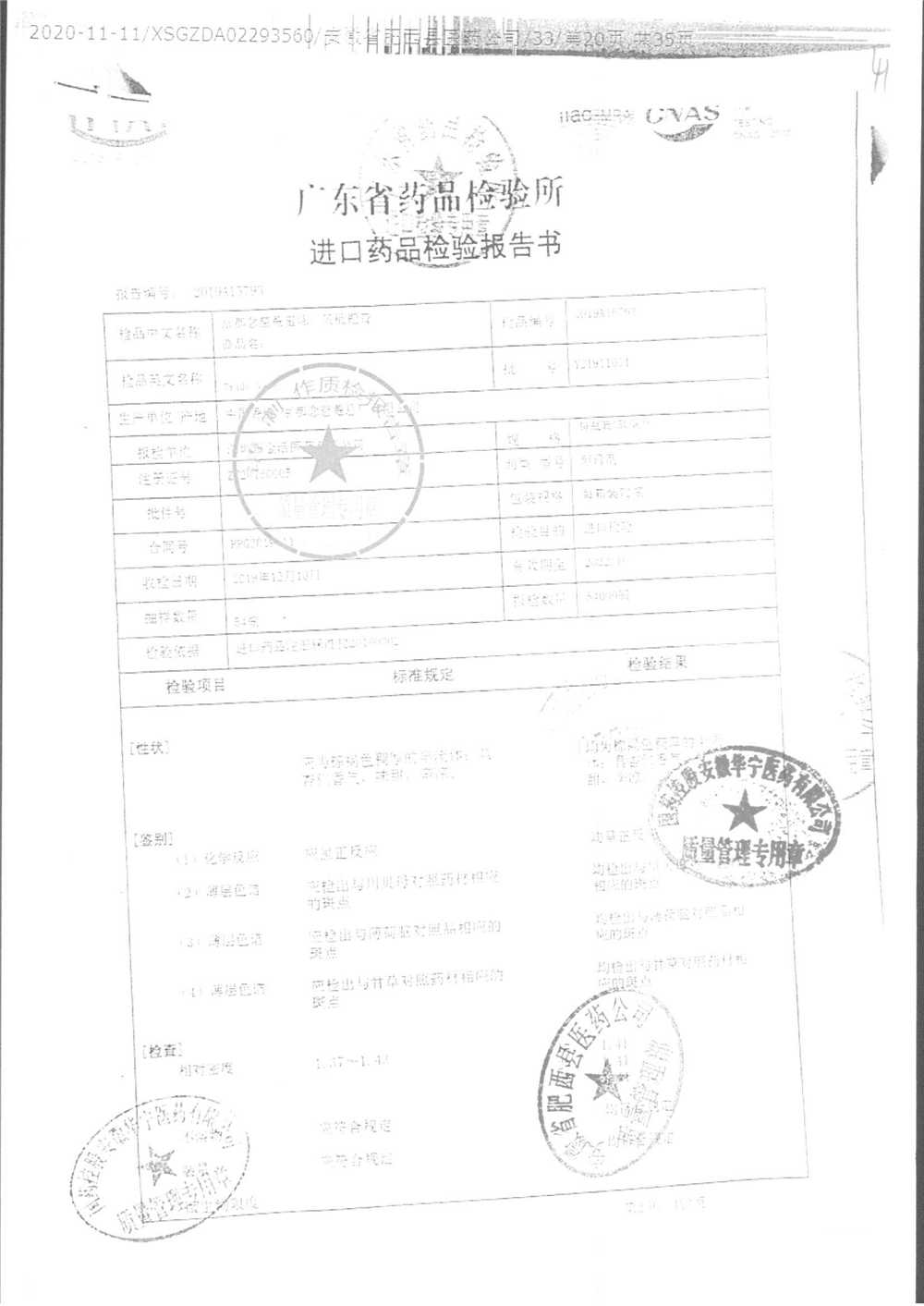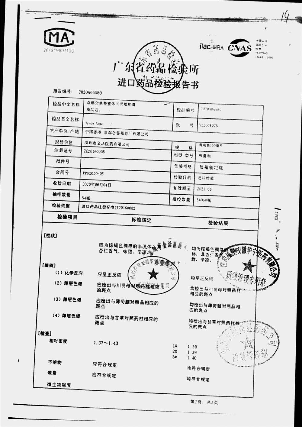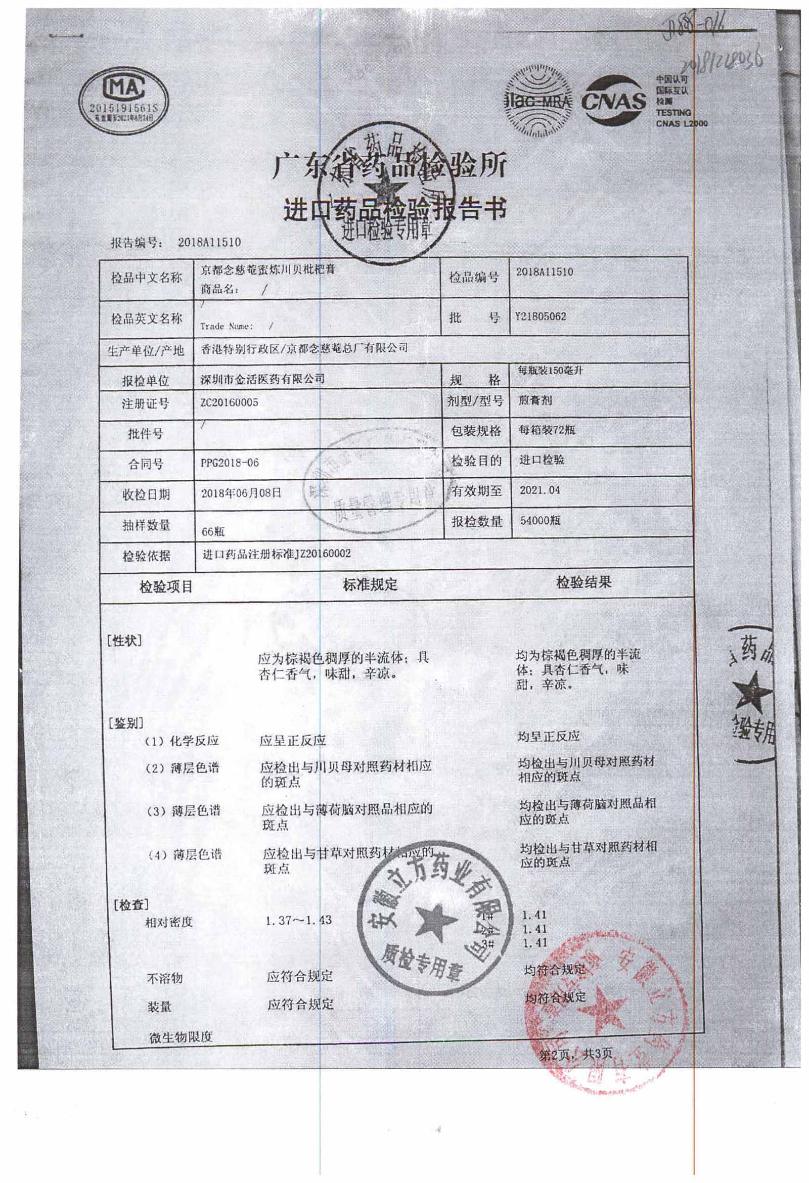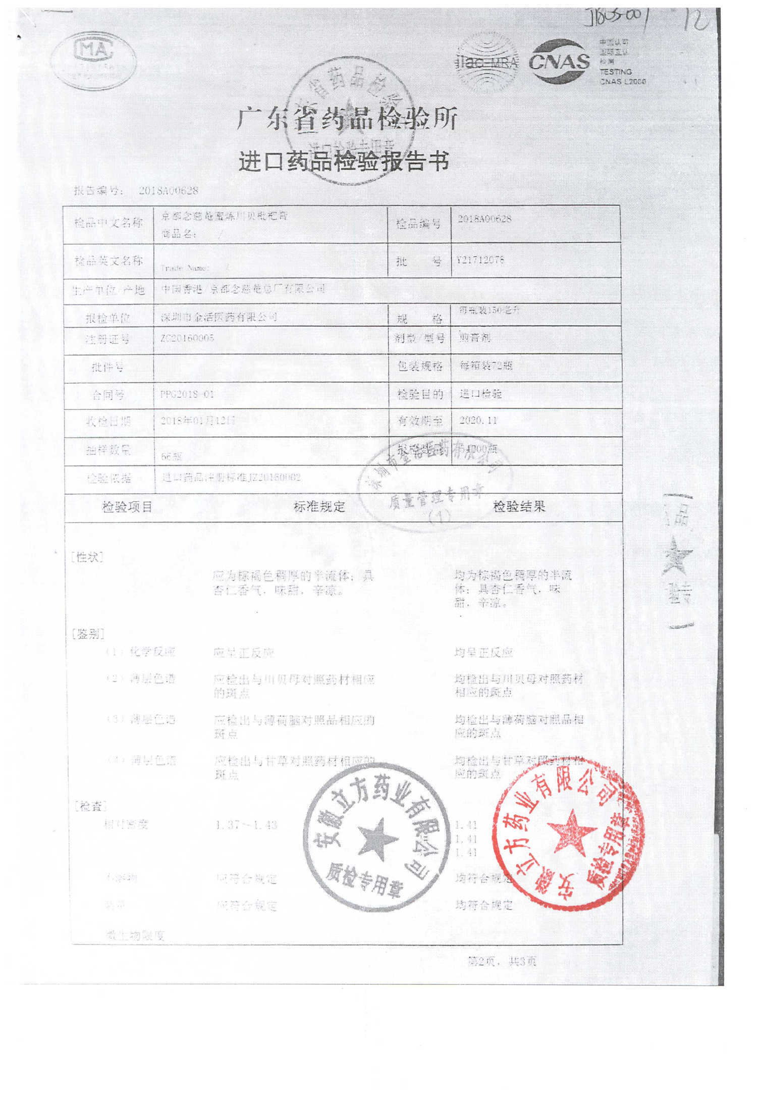 名称 | 规格 | 批号 | 药检报告 |