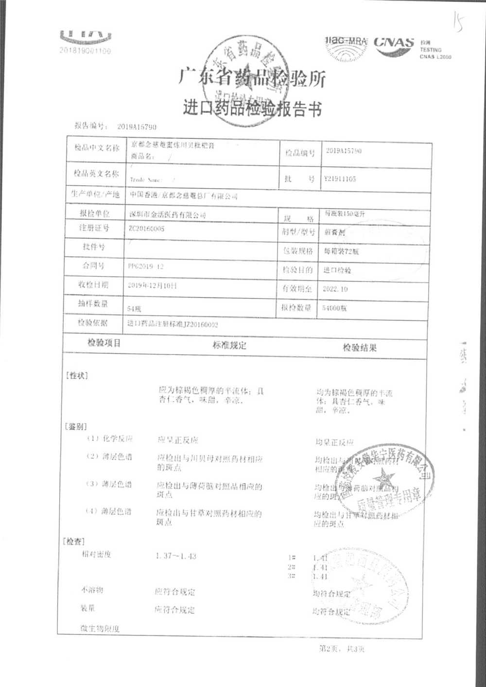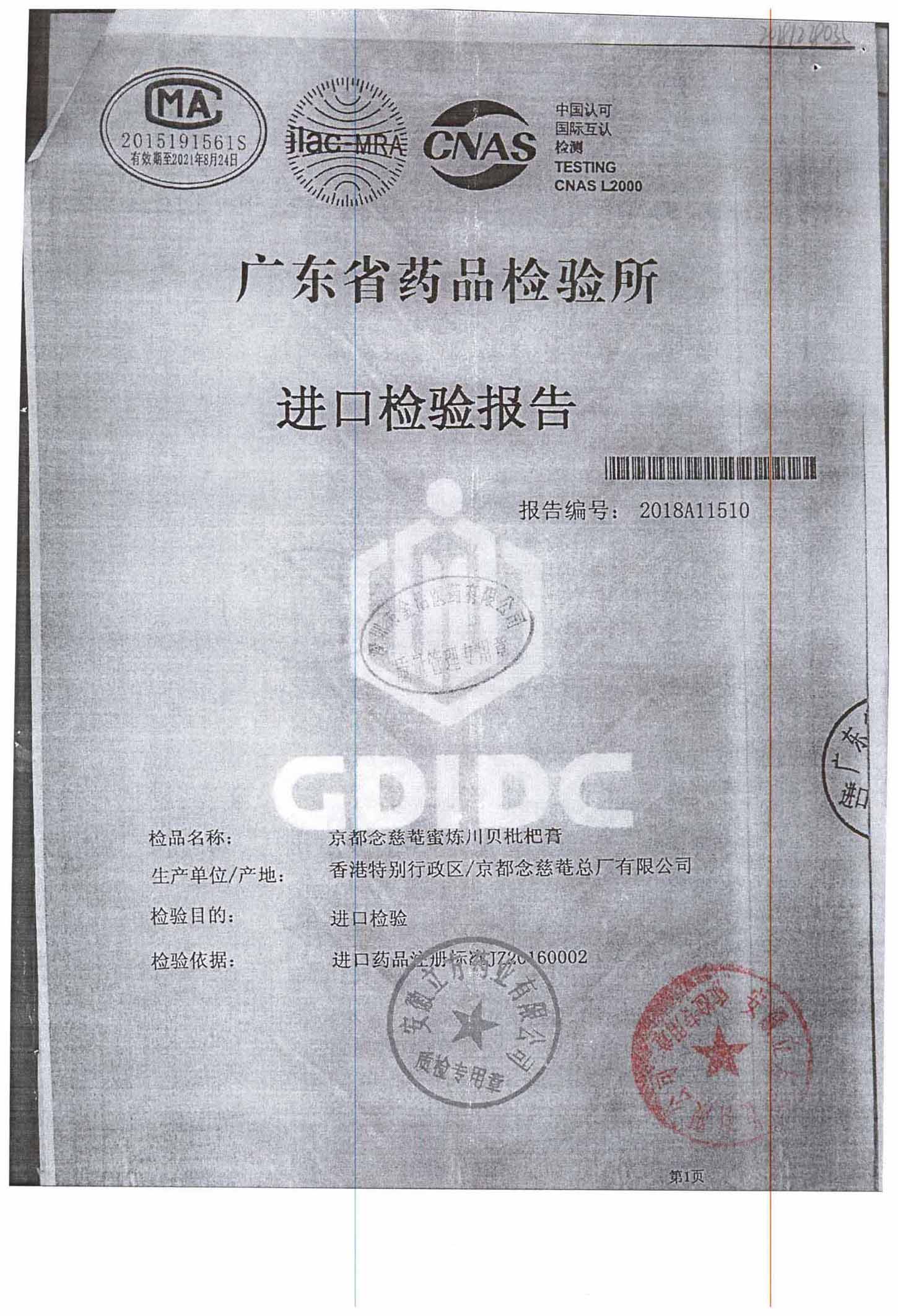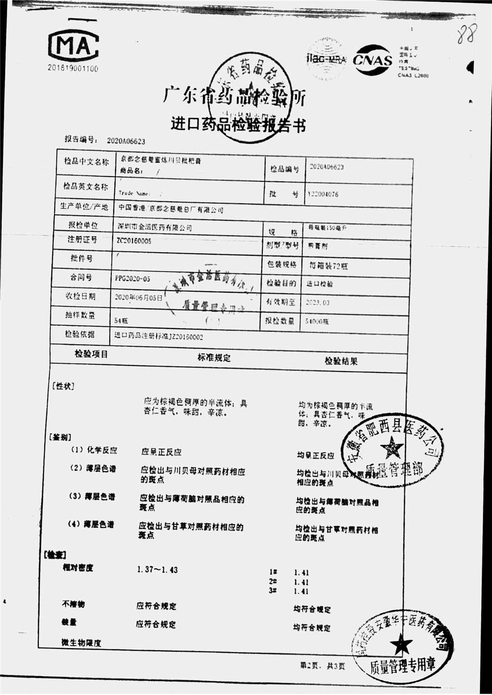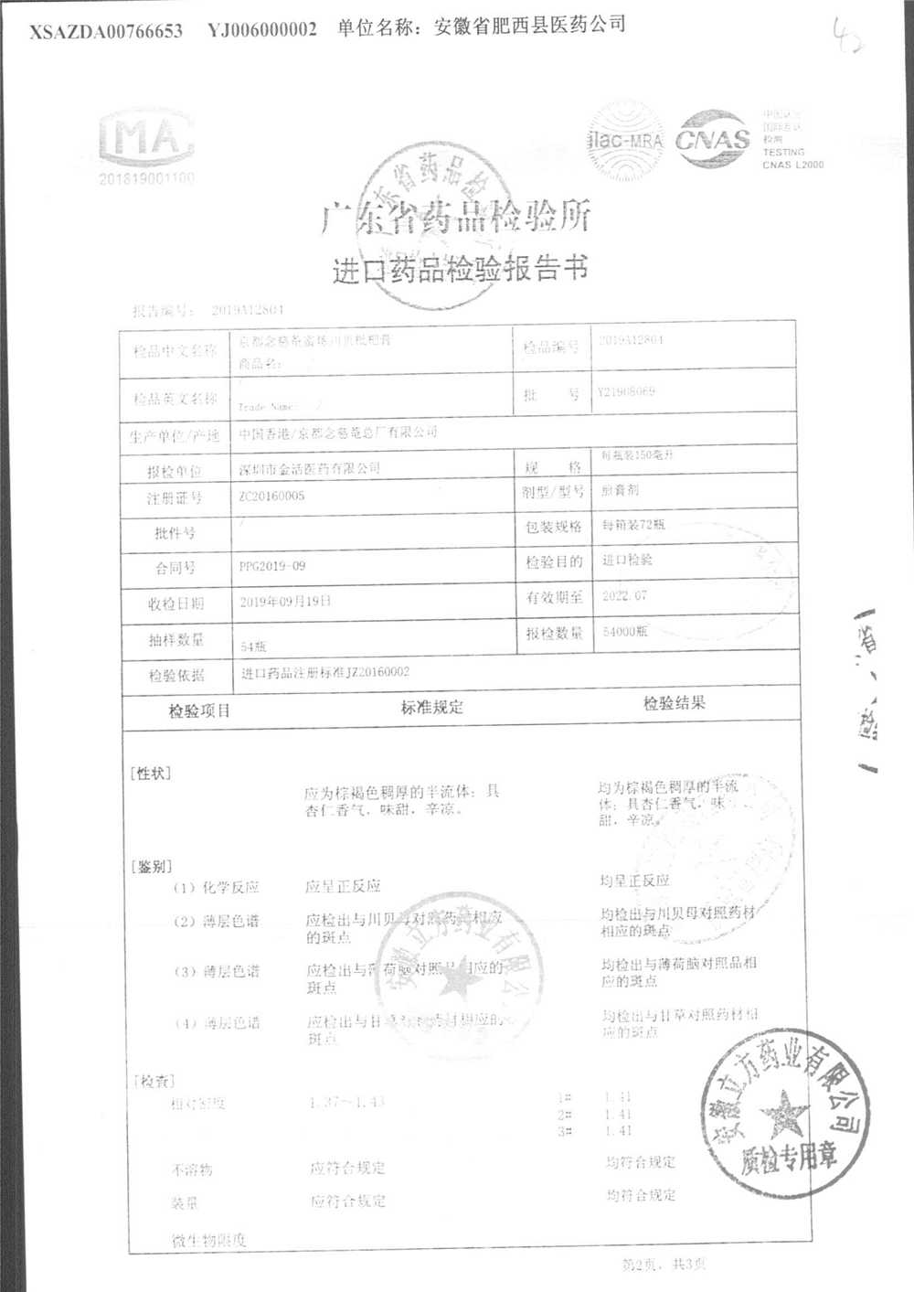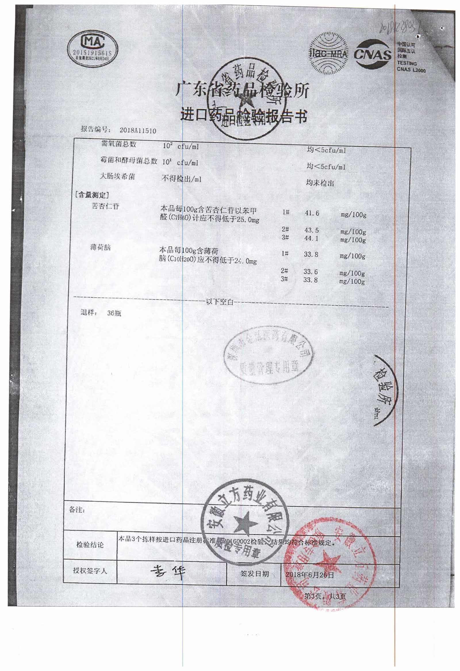 名称 | 规格 | 批号 | 药检报告 |