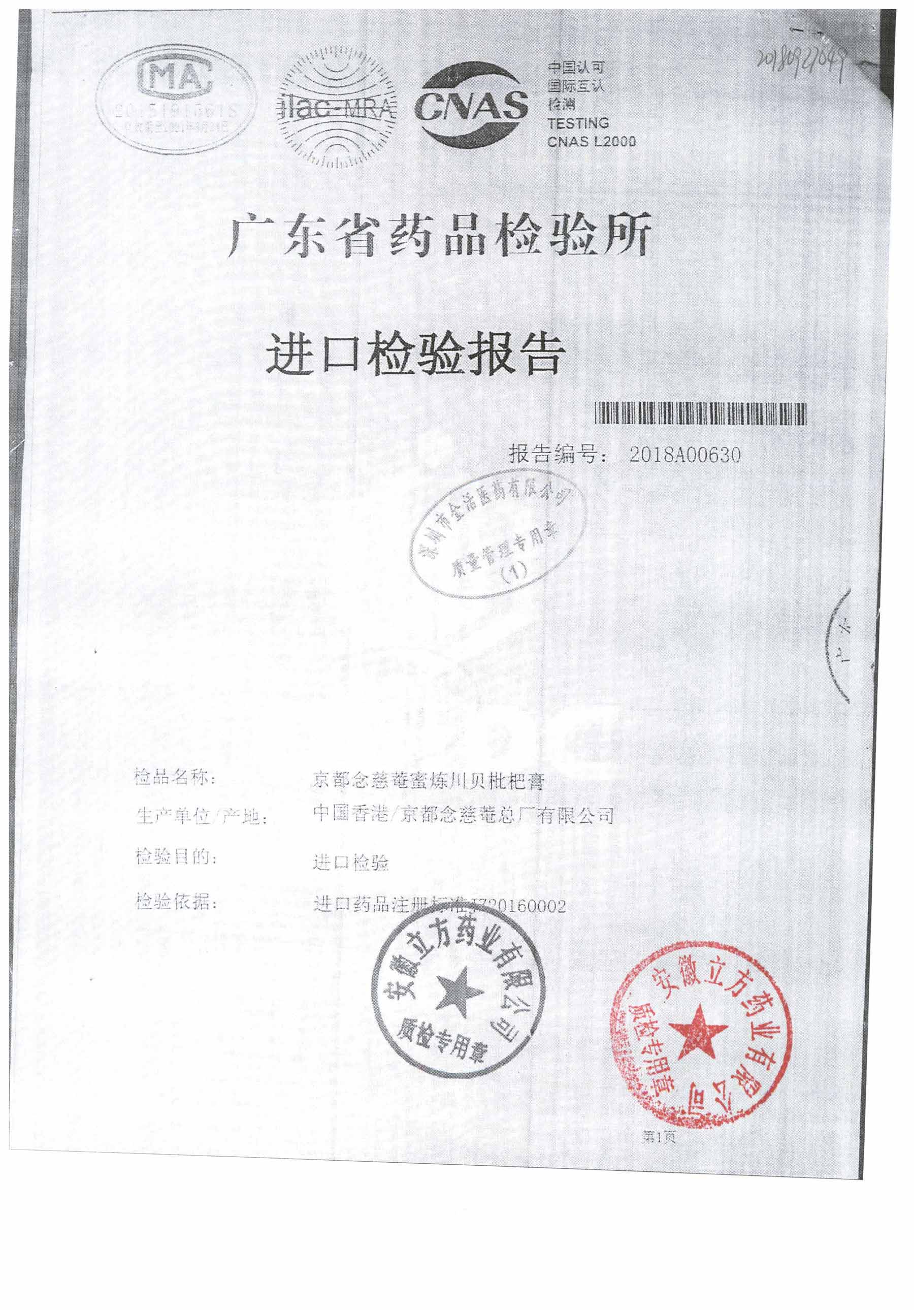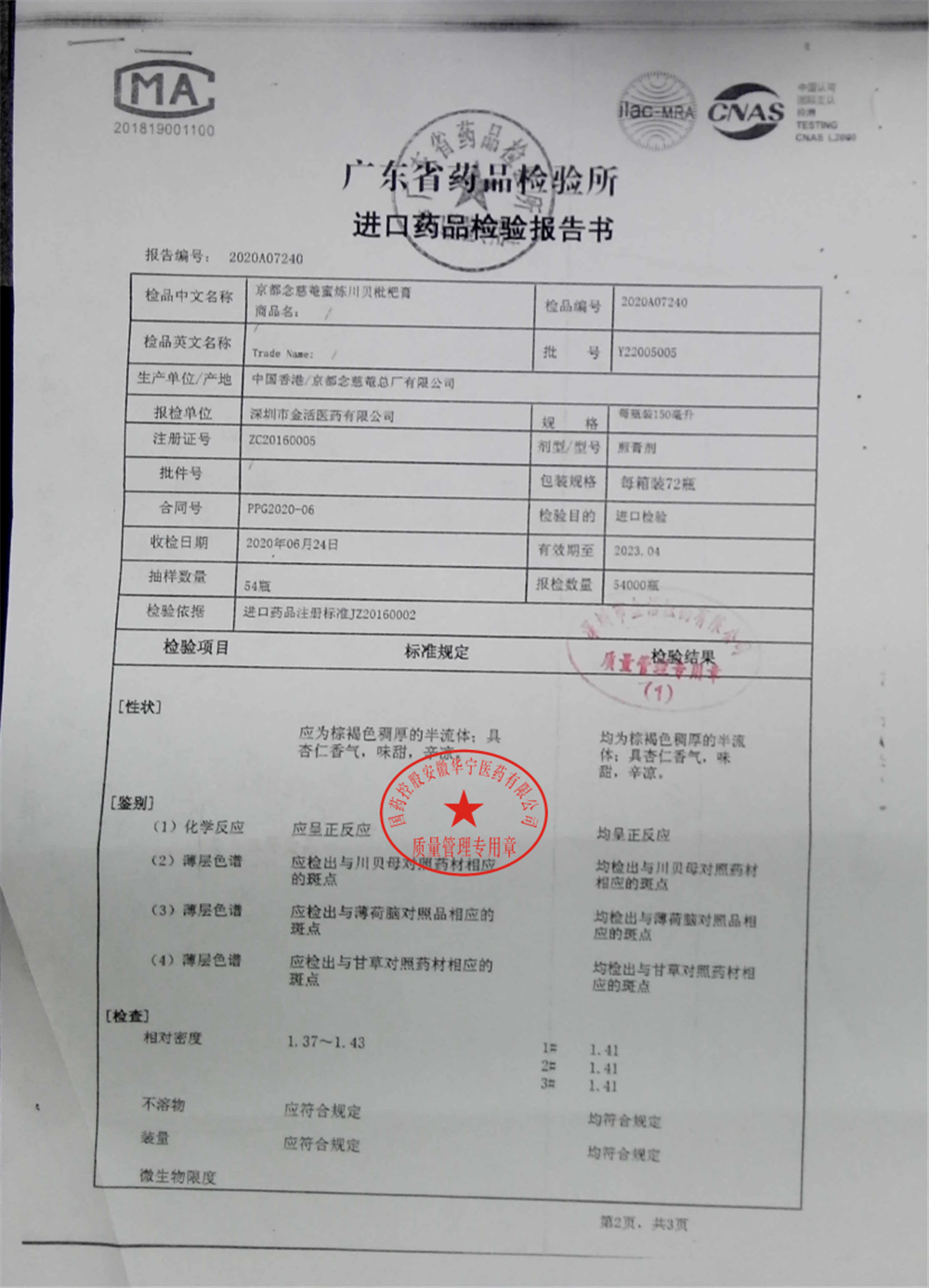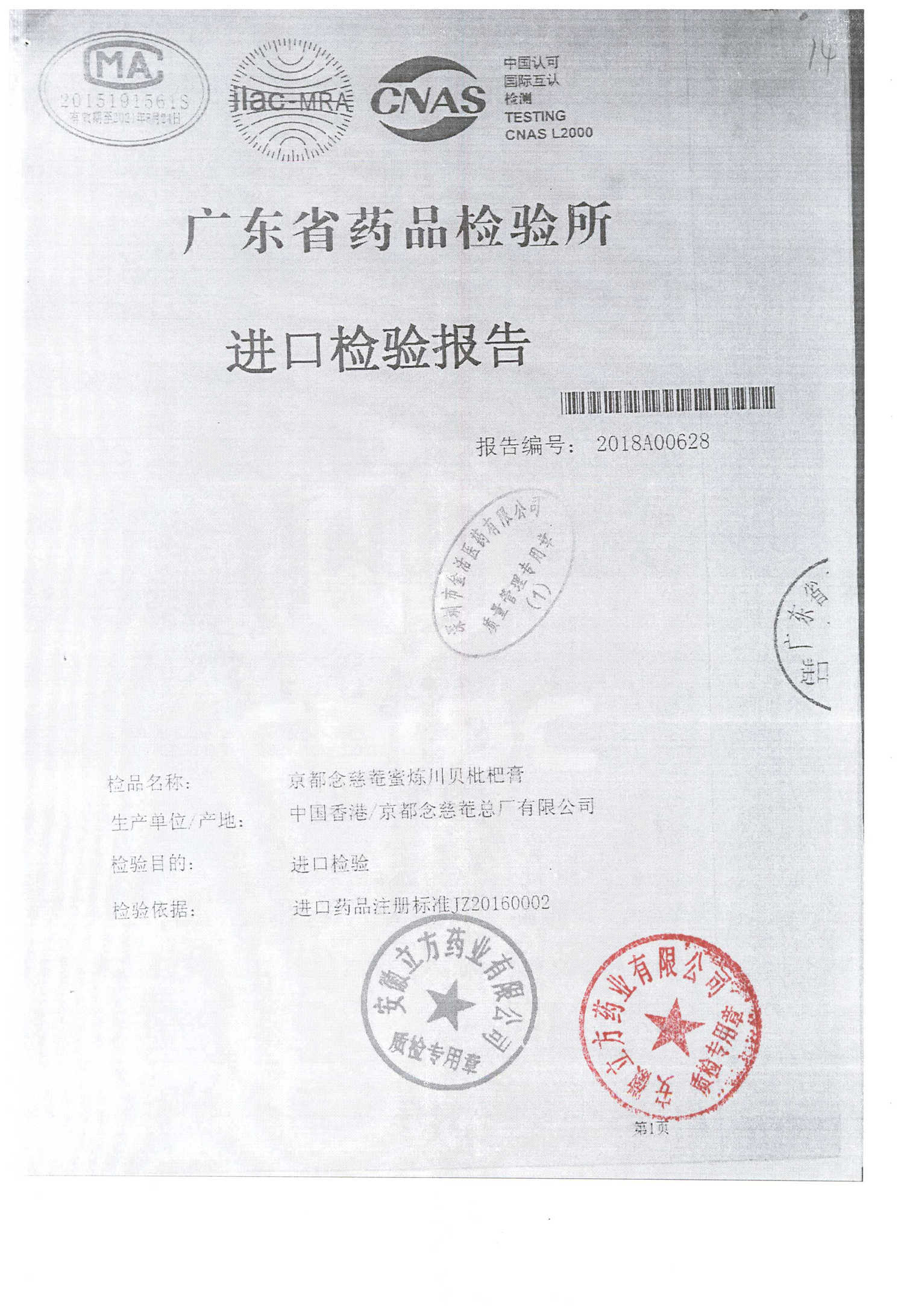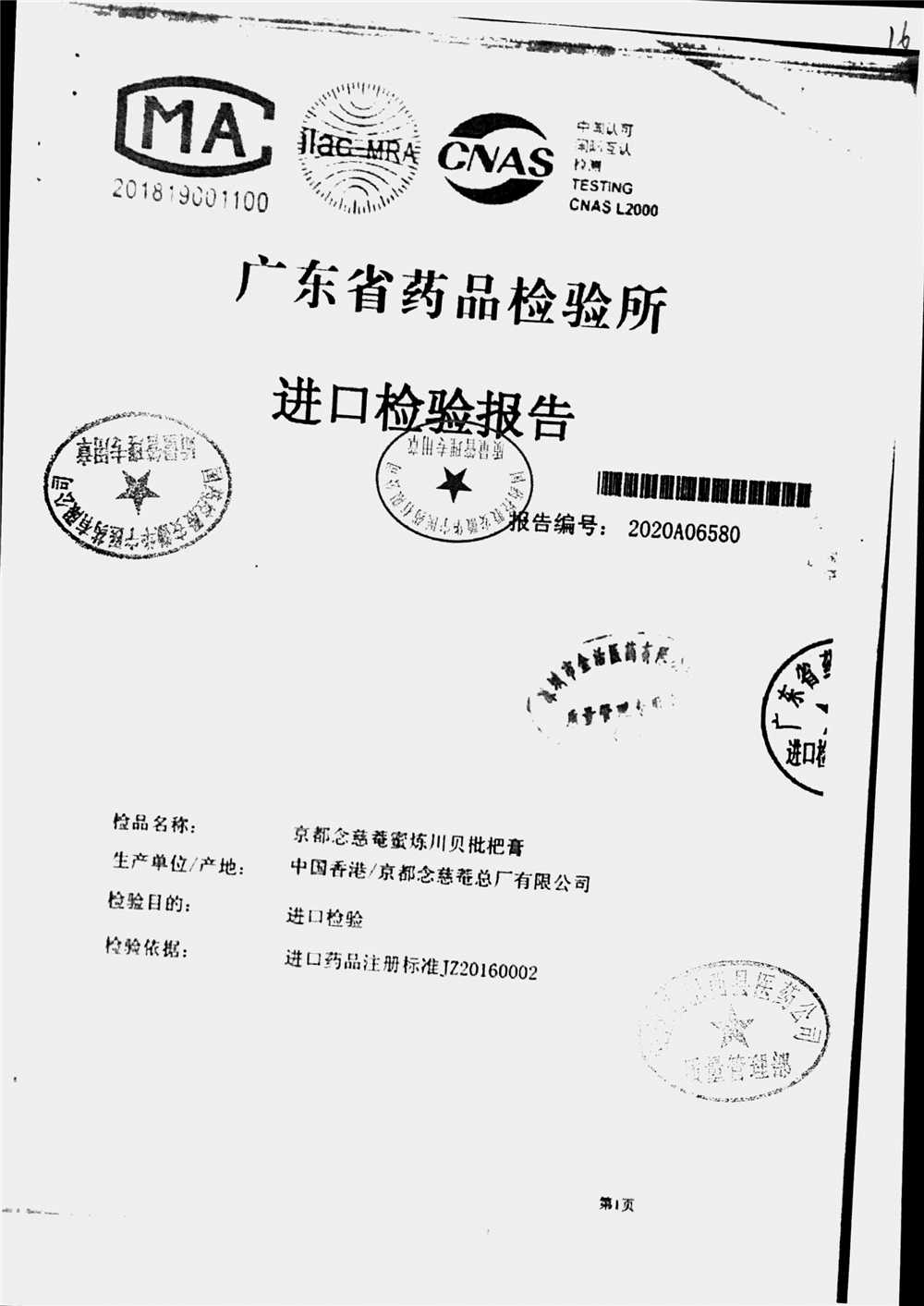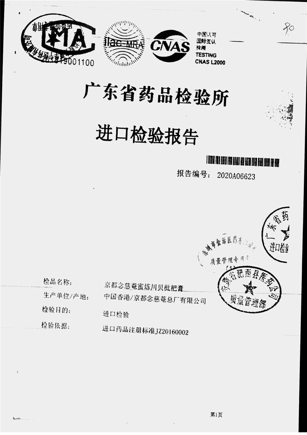 名称 | 规格 | 批号 | 药检报告 |