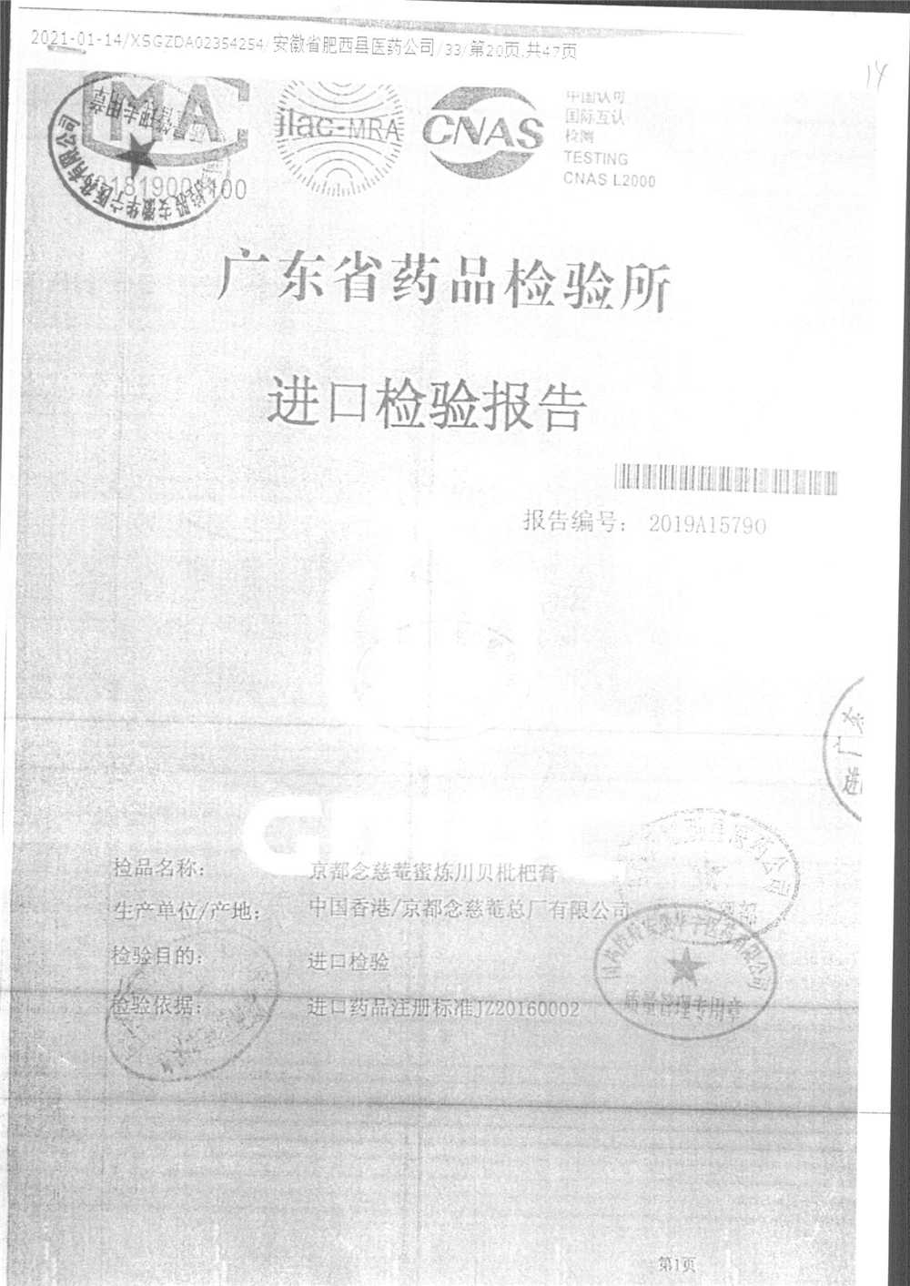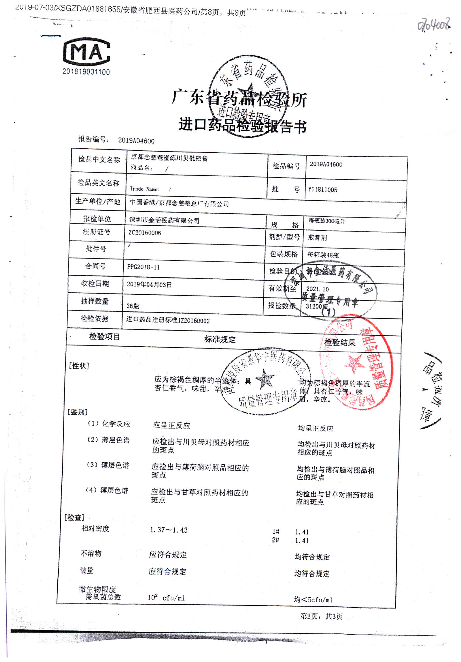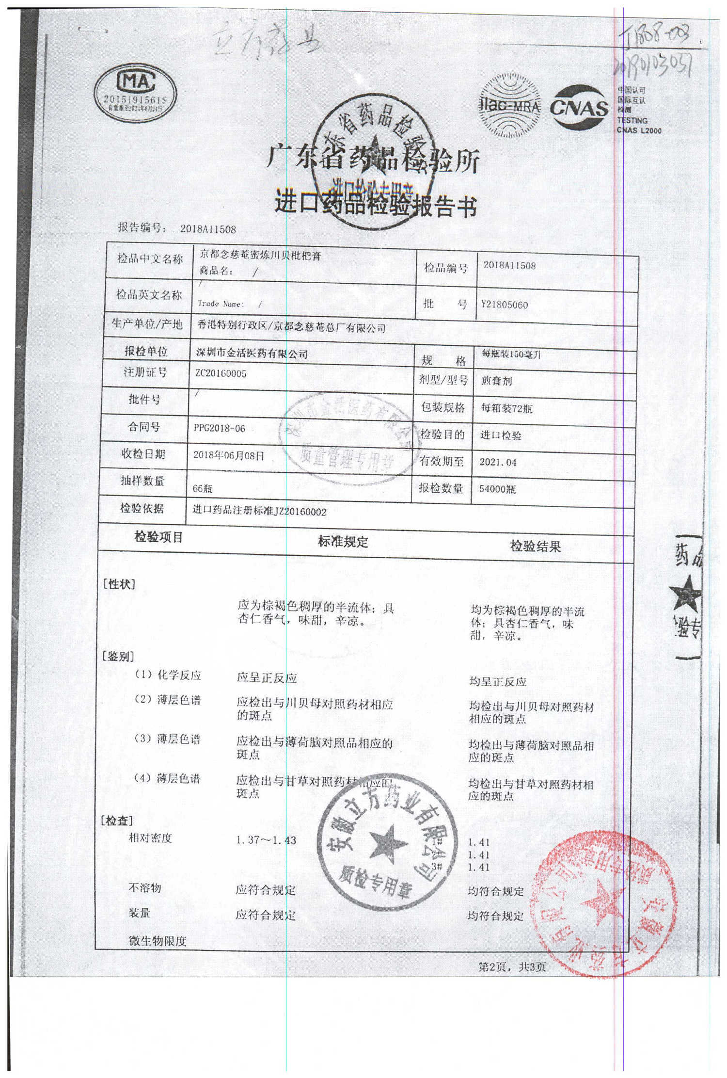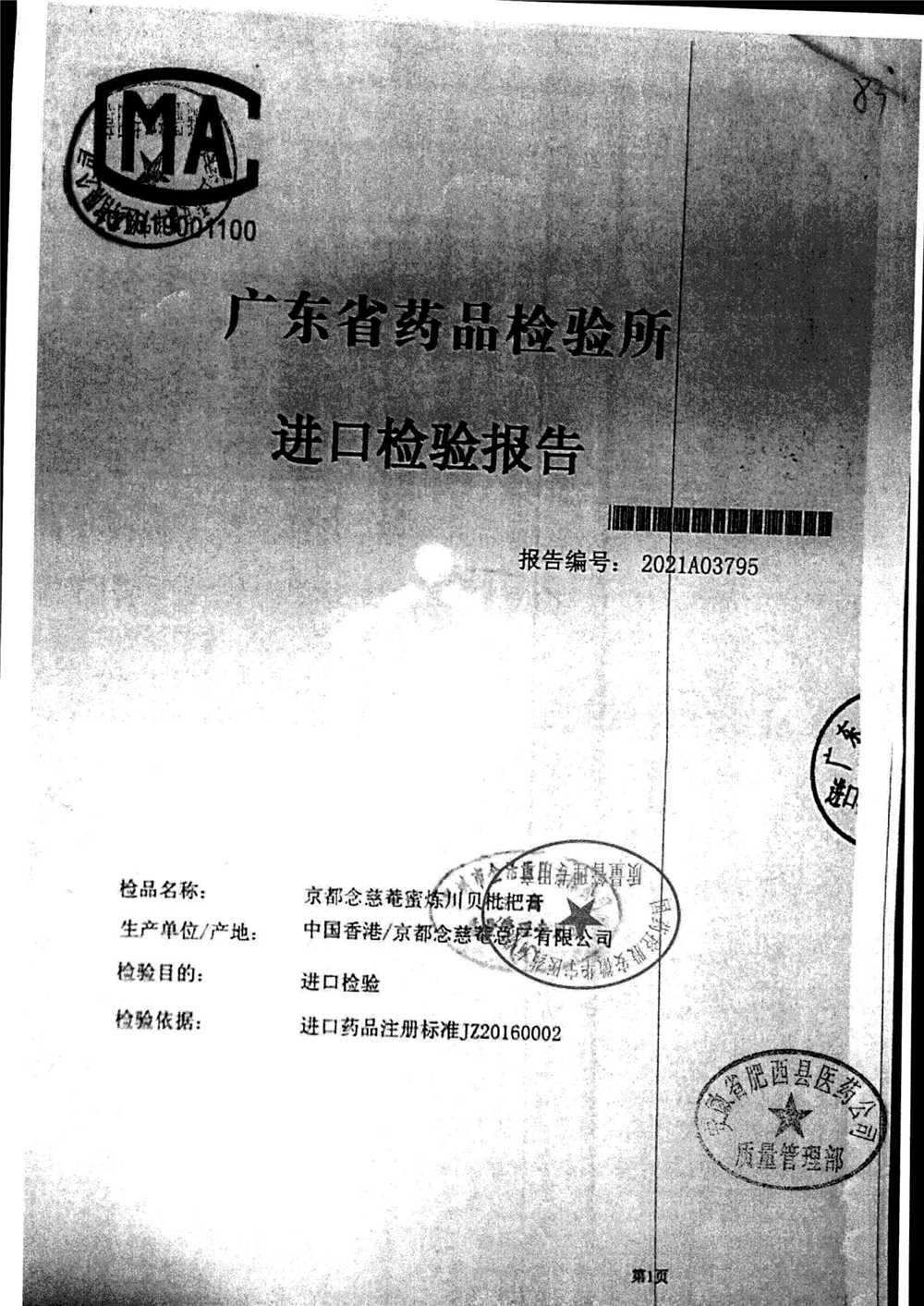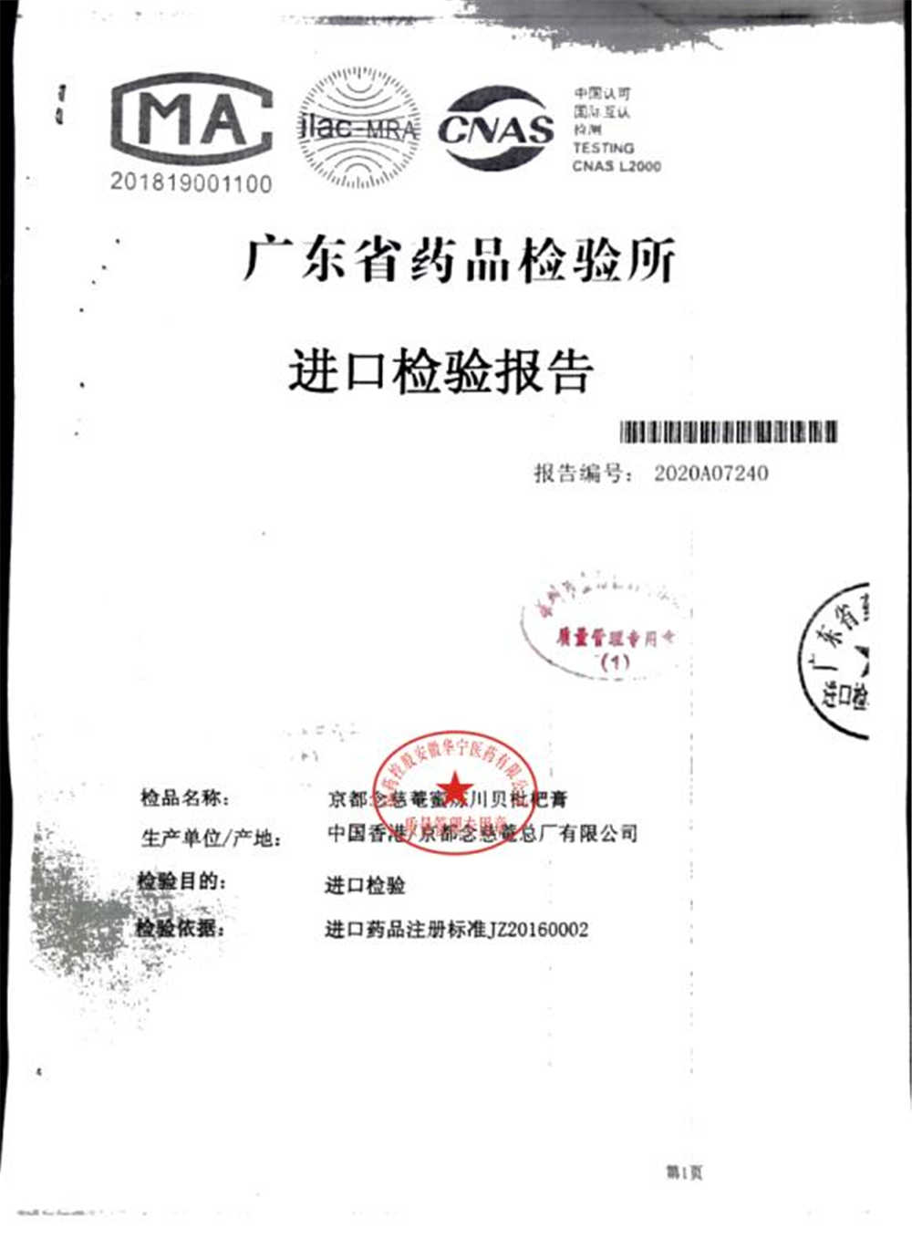 名称 | 规格 | 批号 | 药检报告 |