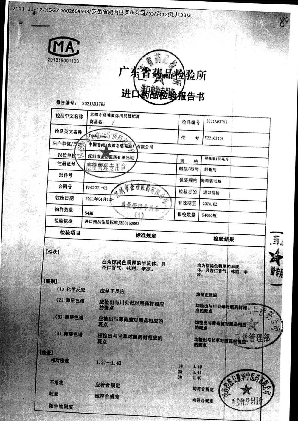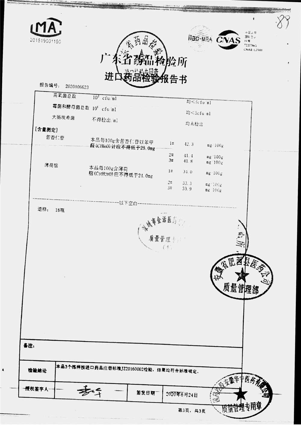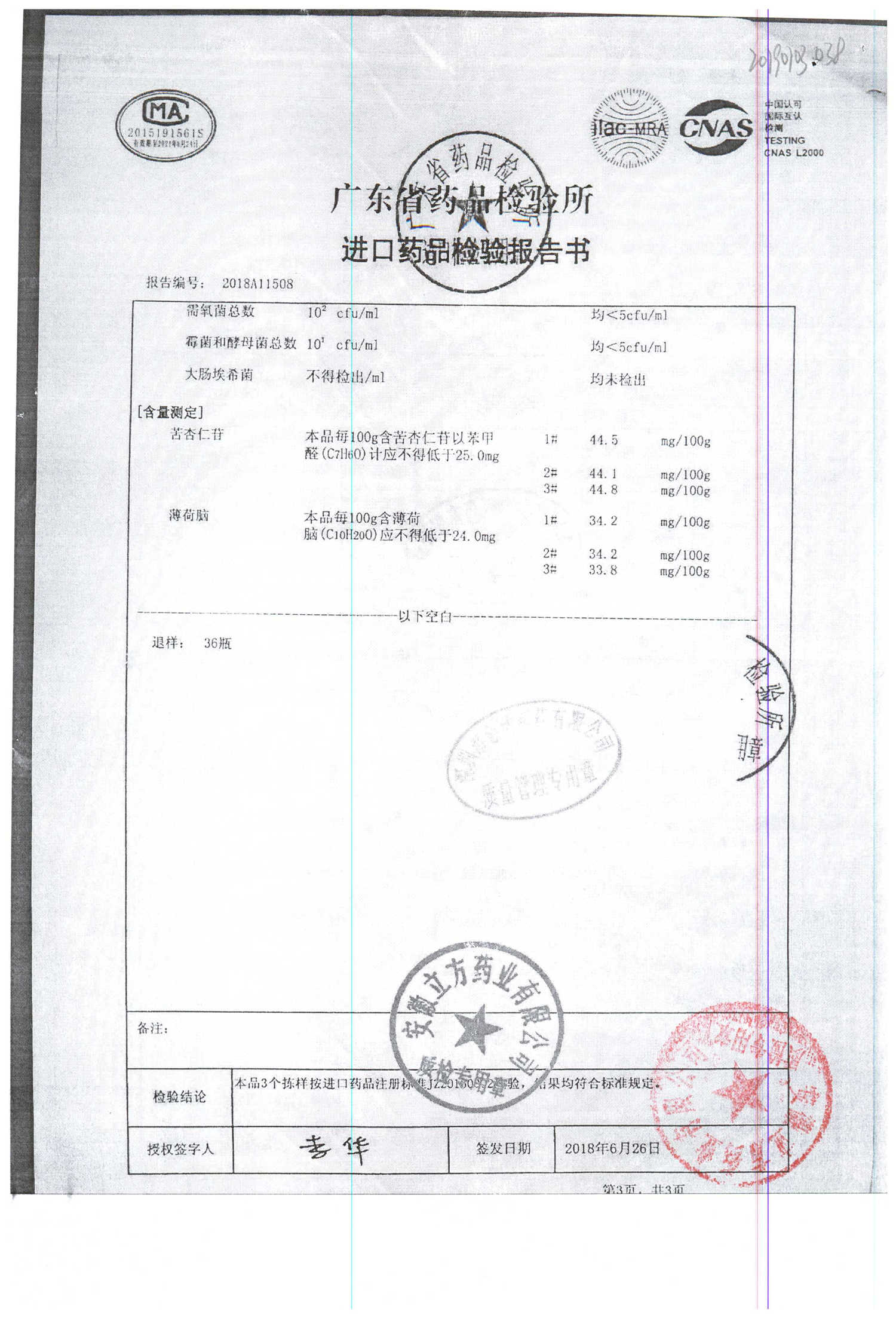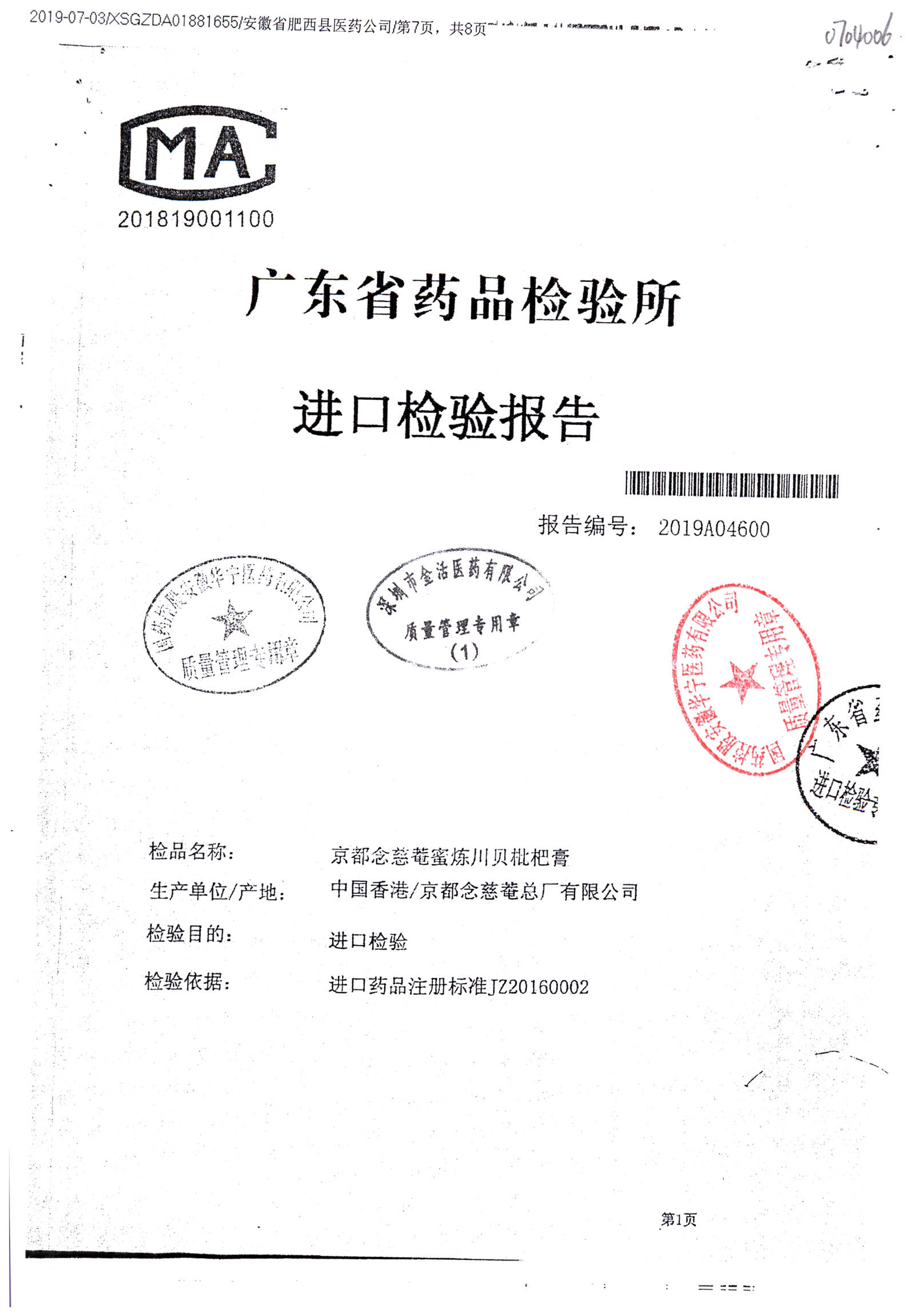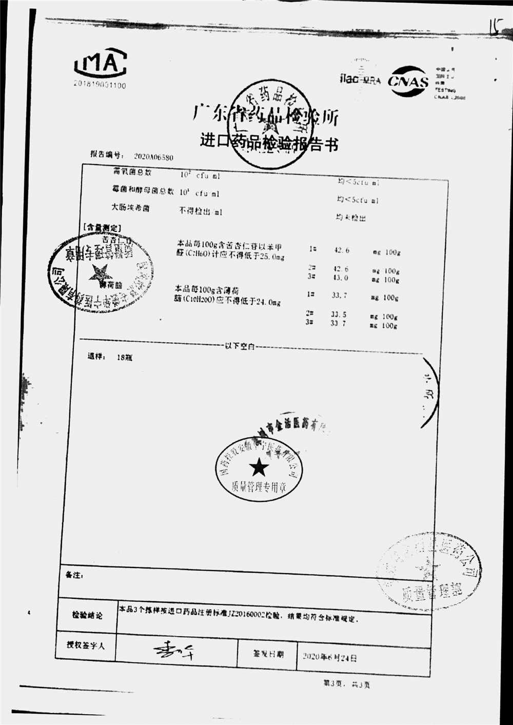 名称 | 规格 | 批号 | 药检报告 |