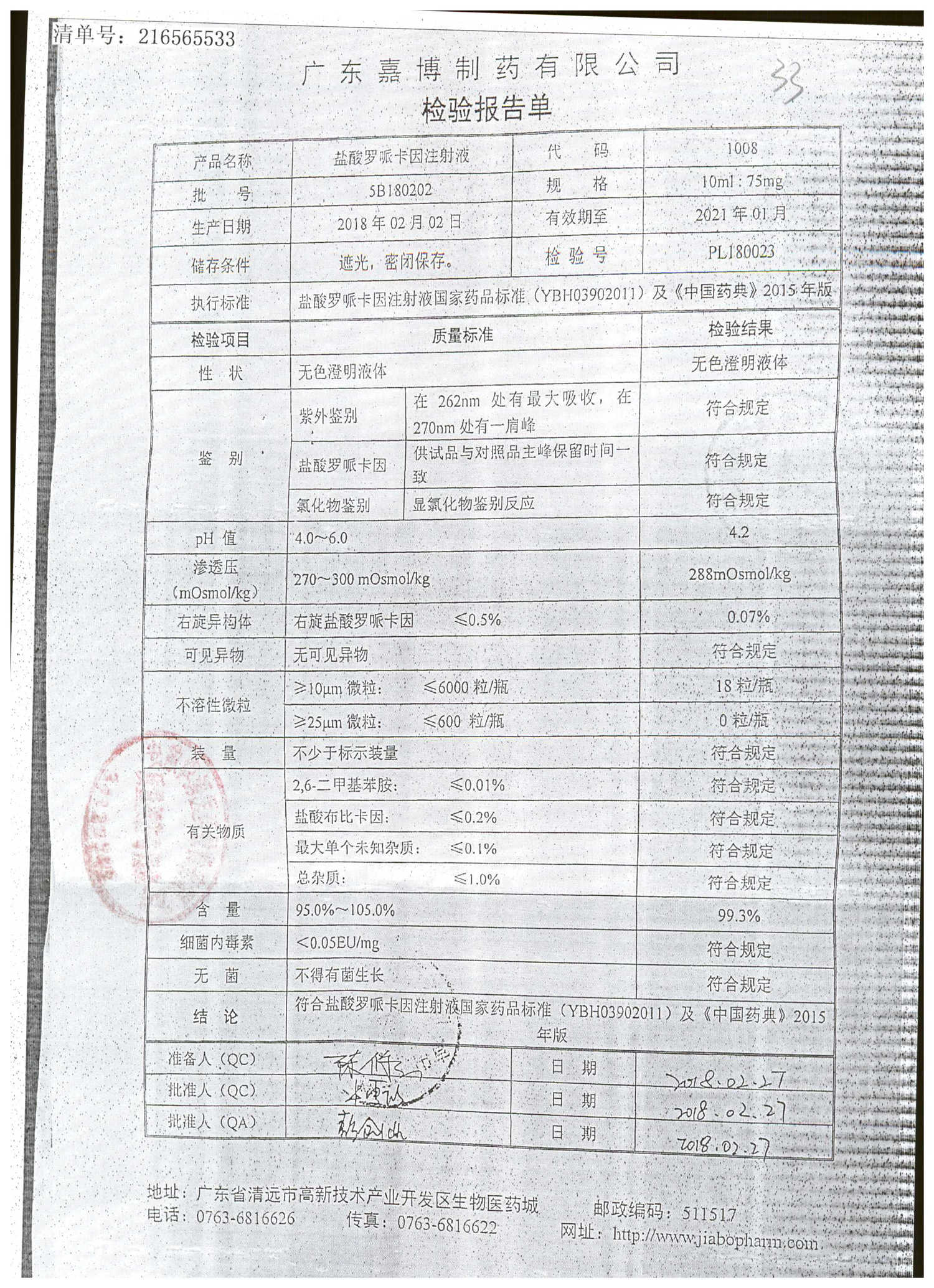 盐酸罗哌卡因注射液 | 10ml:75mg | 5B180202 | 查看详情 |