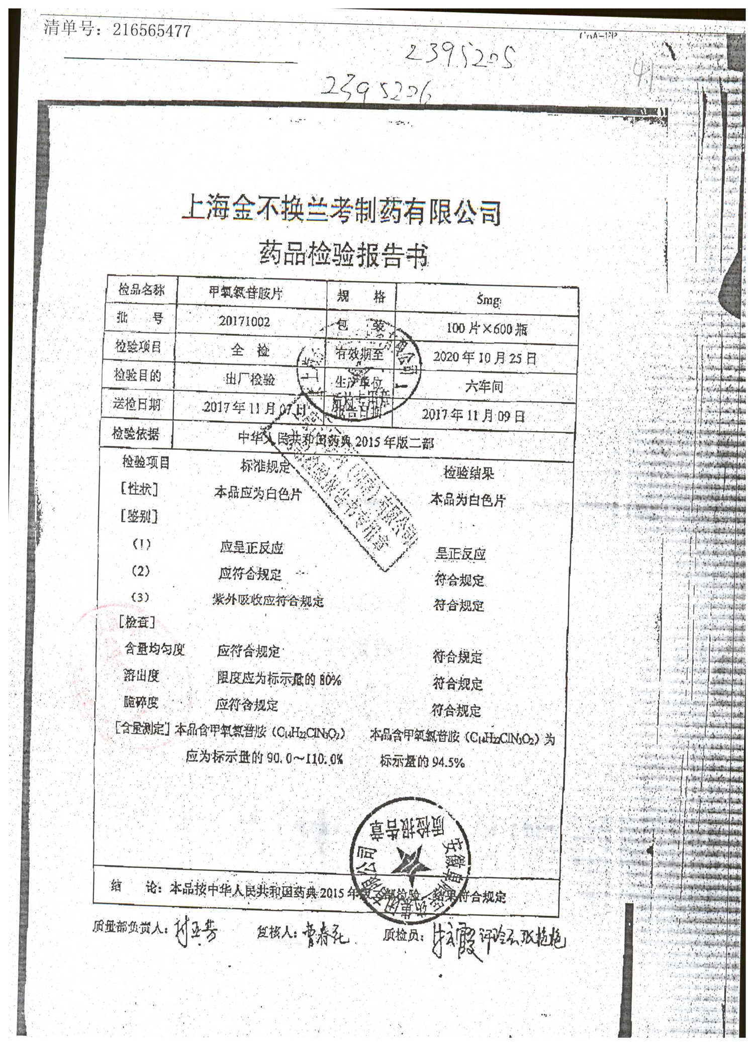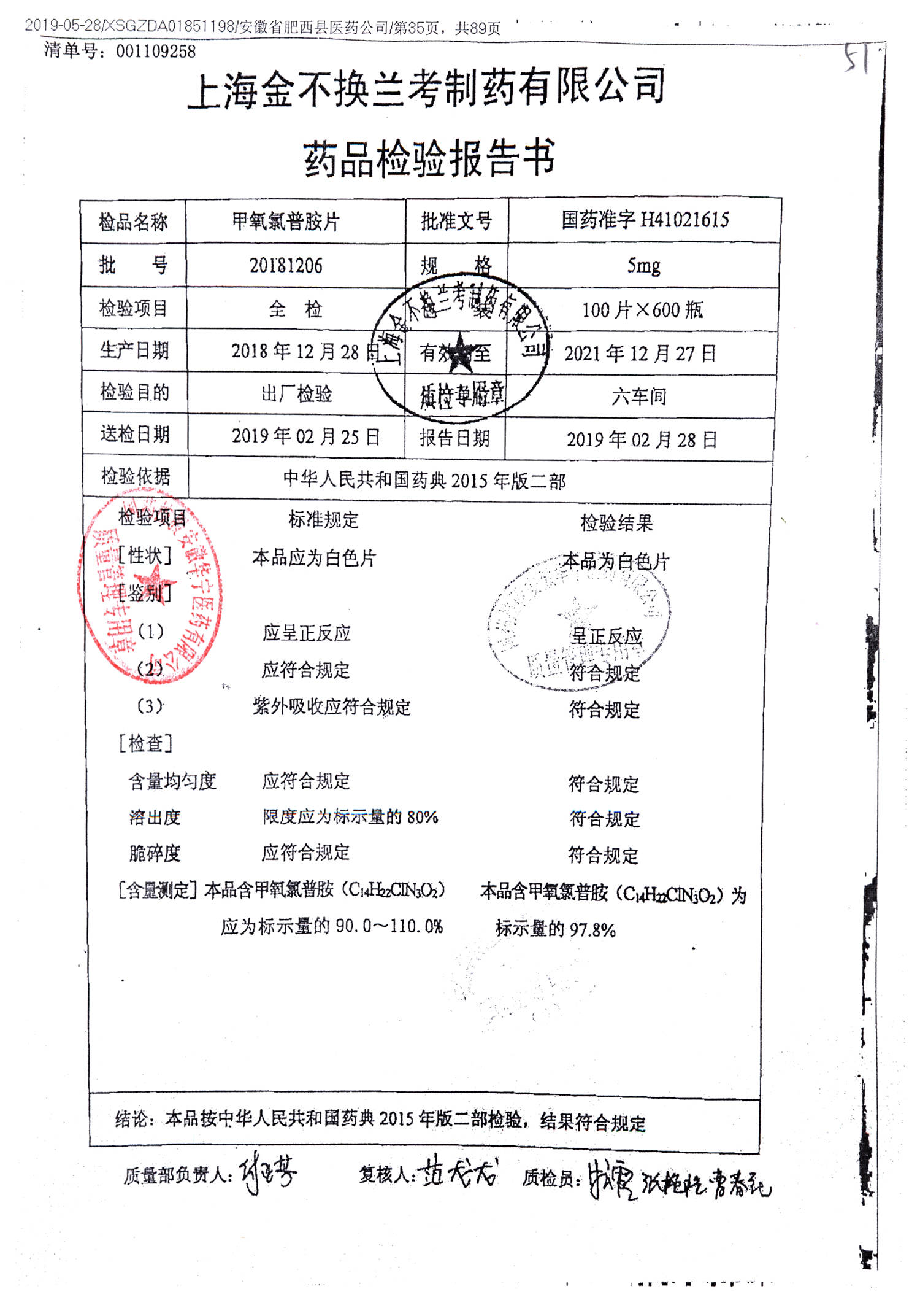 甲氧氯普胺片 | 5mg*100片 | 20181206 | 查看详情 |