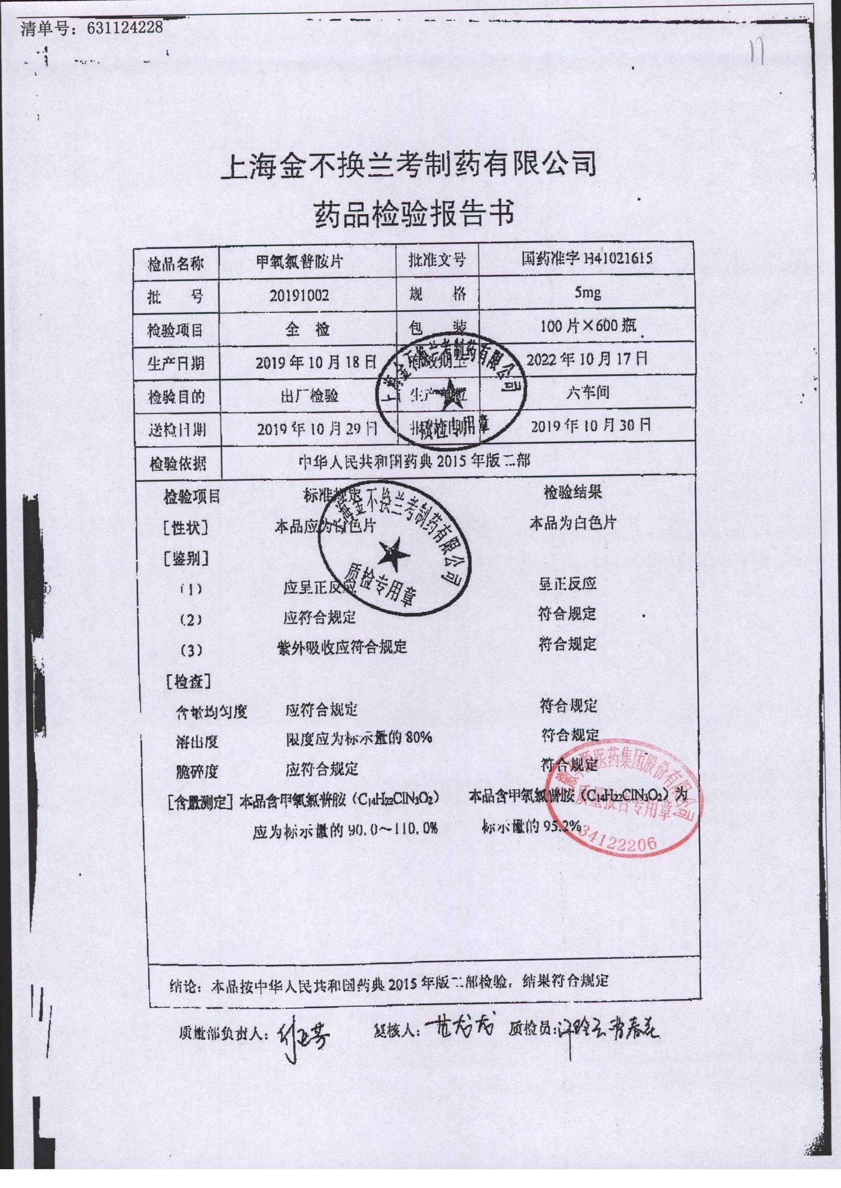 甲氧氯普胺片 | 5mg*100片 | 20191002 | 查看详情 |
