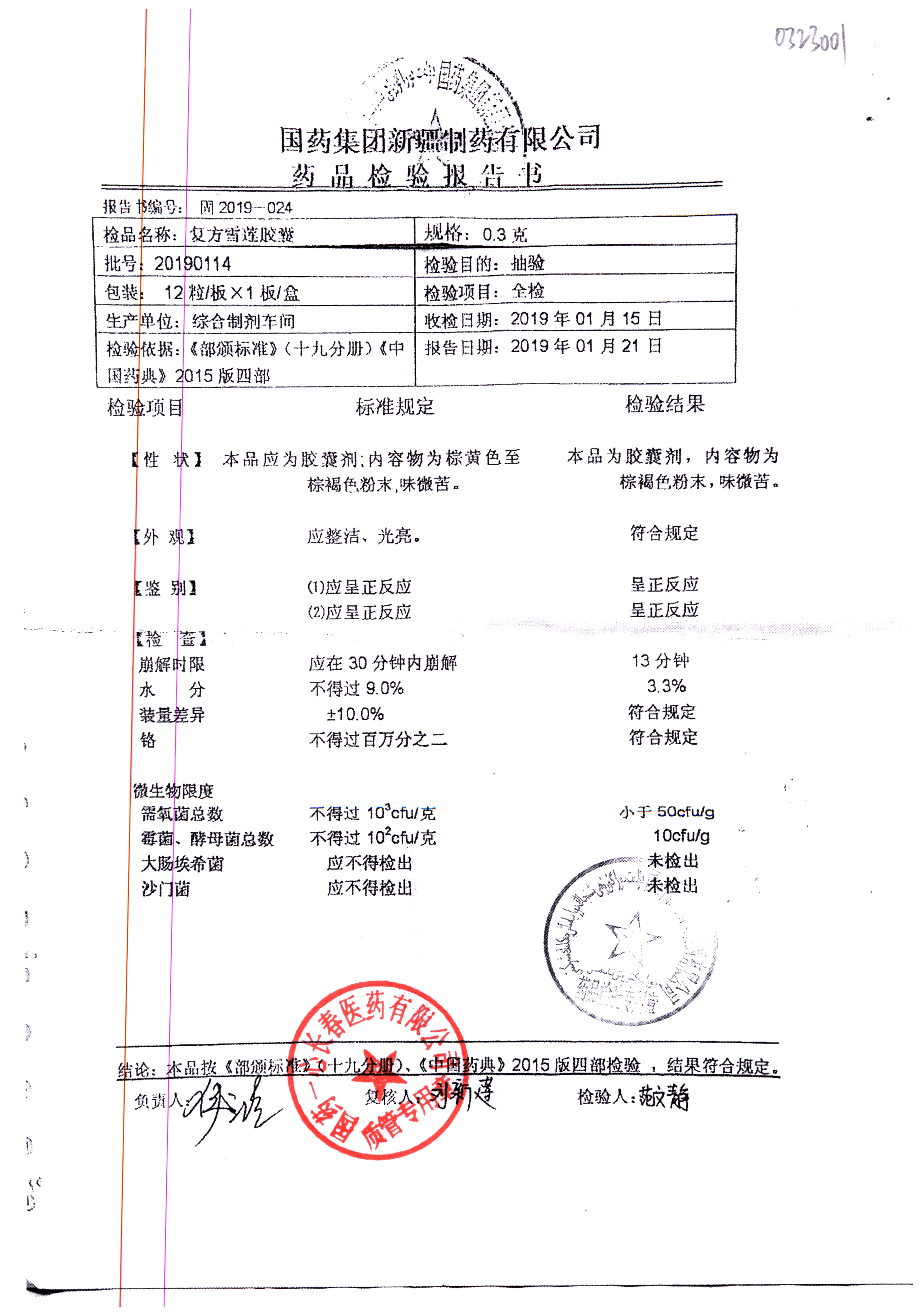复方雪莲胶囊 | 0.3g*12粒 | 20190403 | 查看详情 |