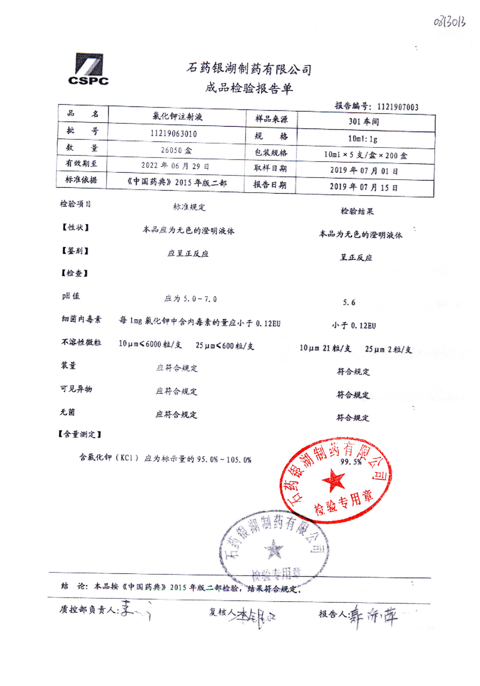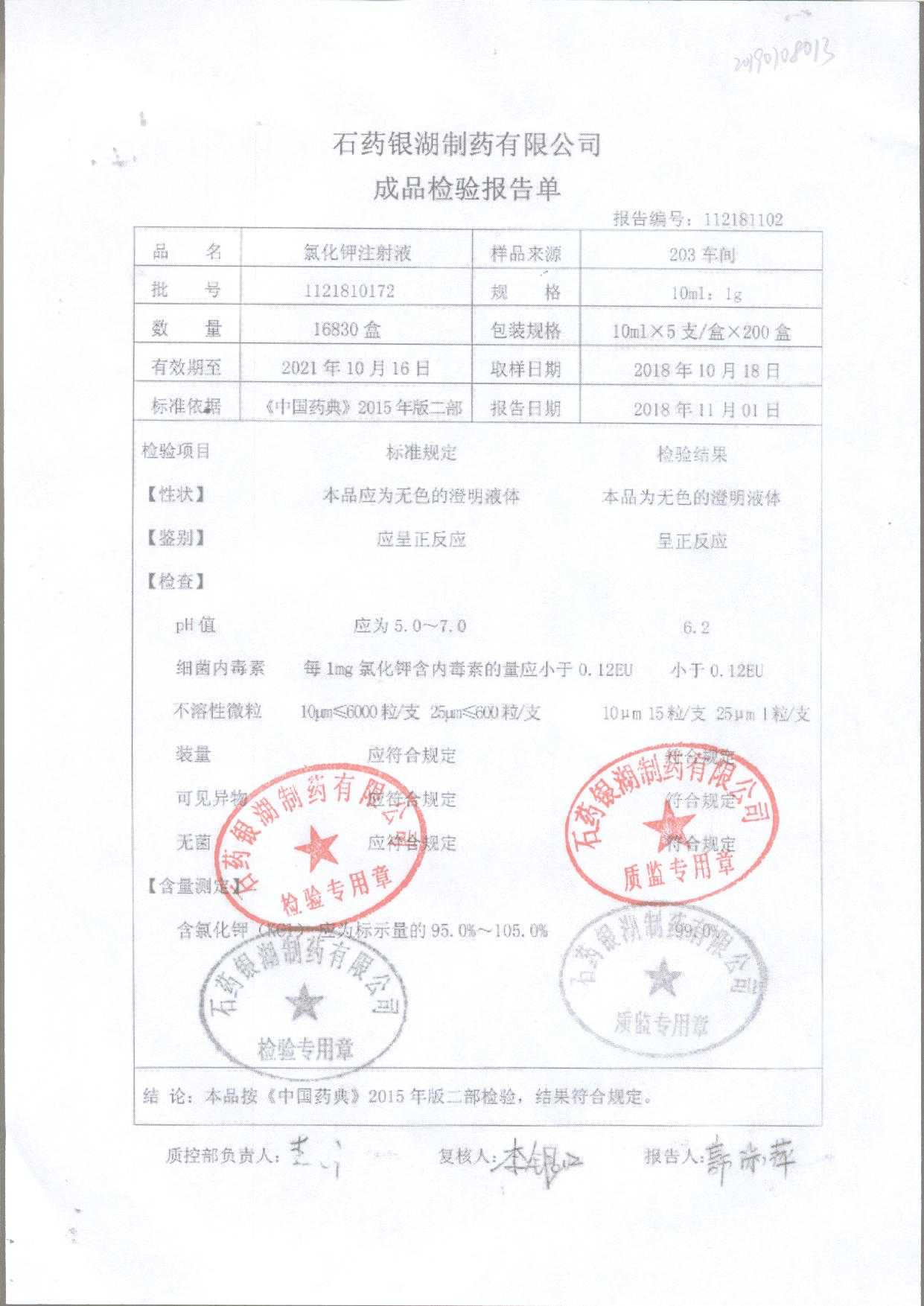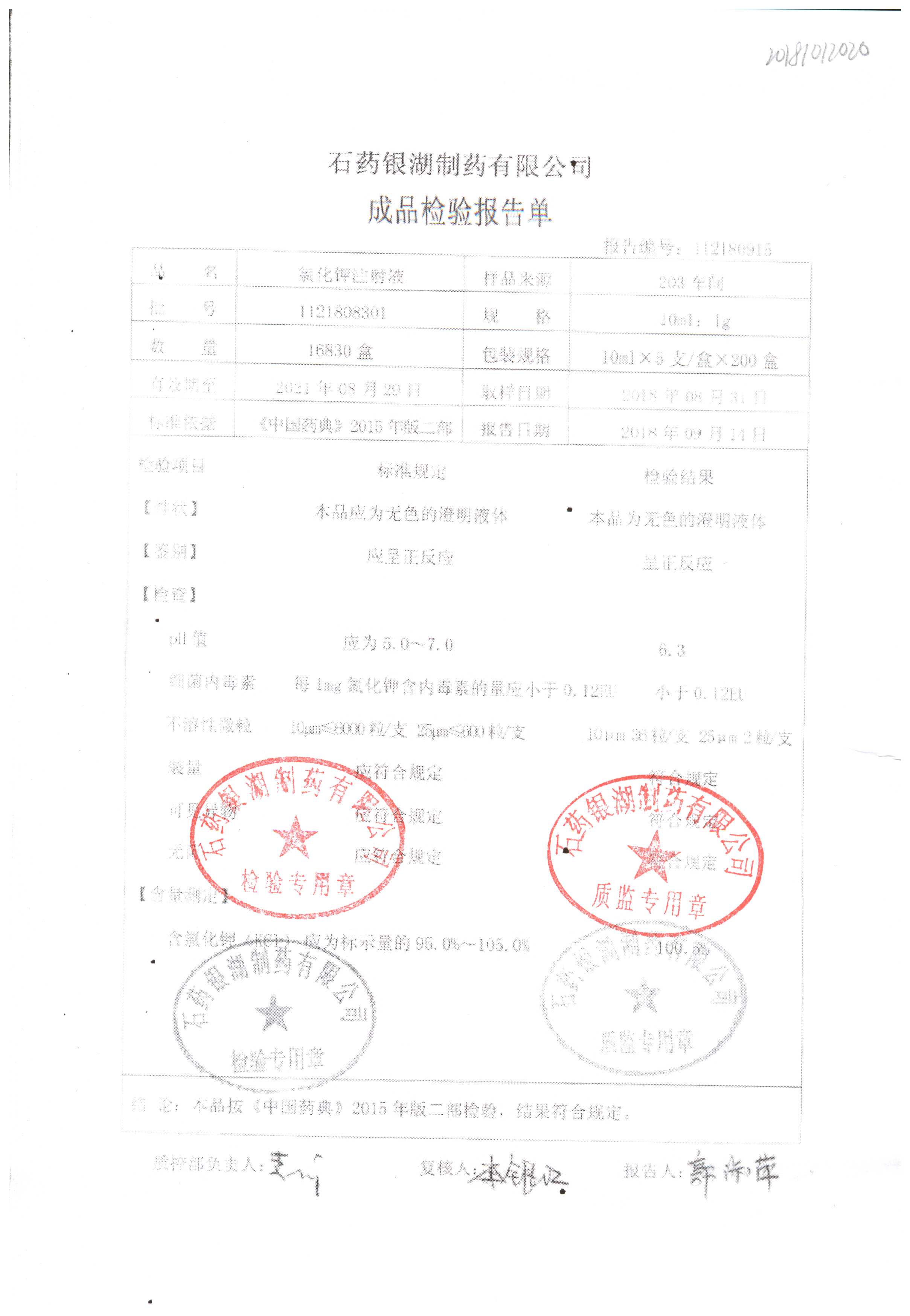 氯化钾注射液 | 10ml:1g | 11219072010 | 查看详情 |