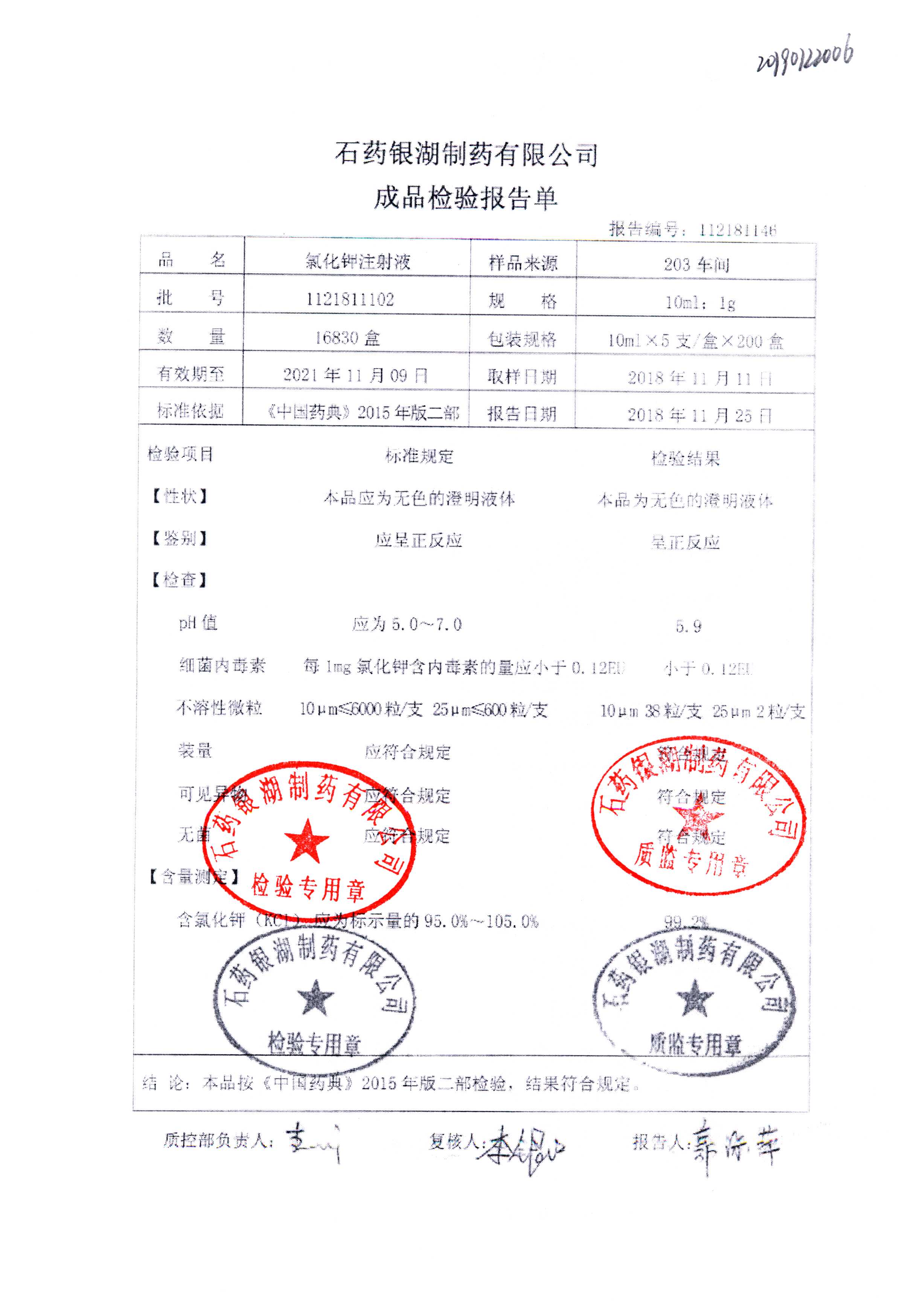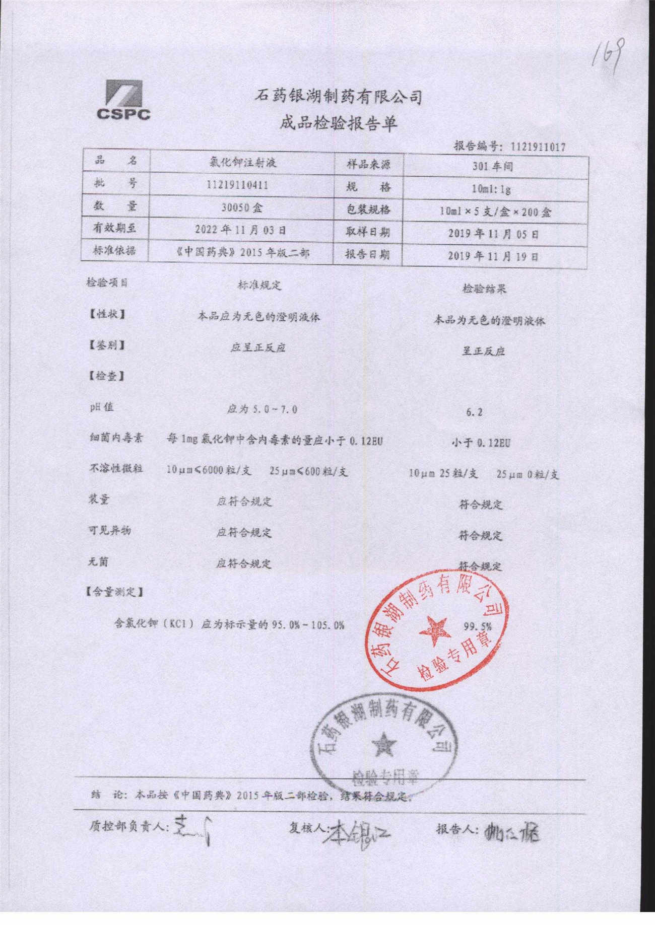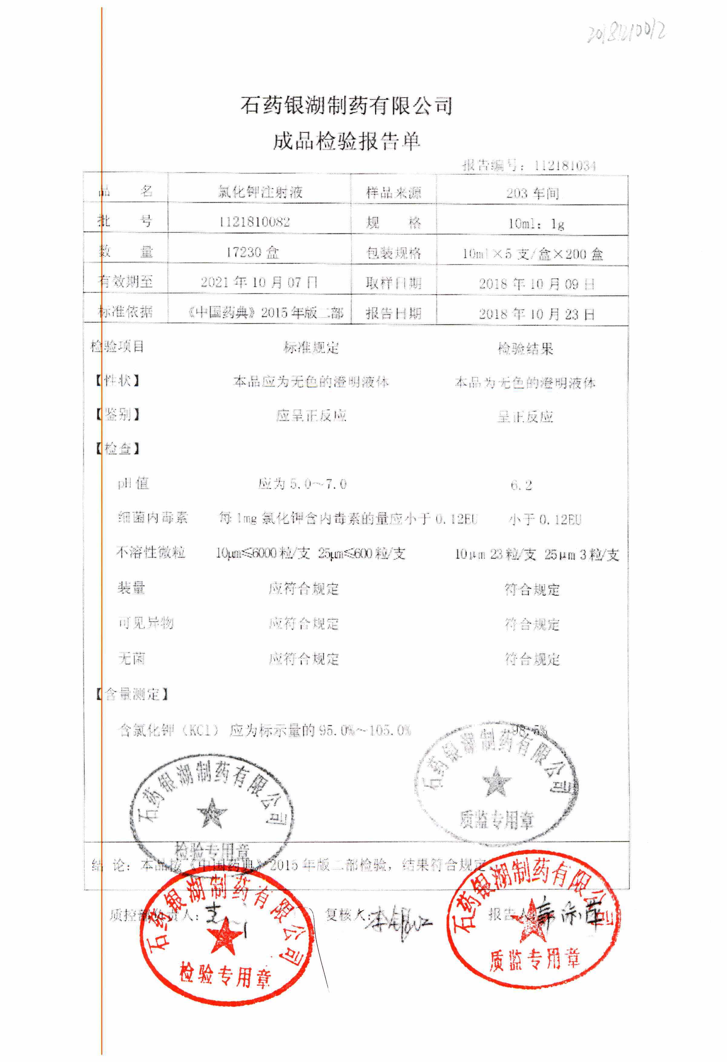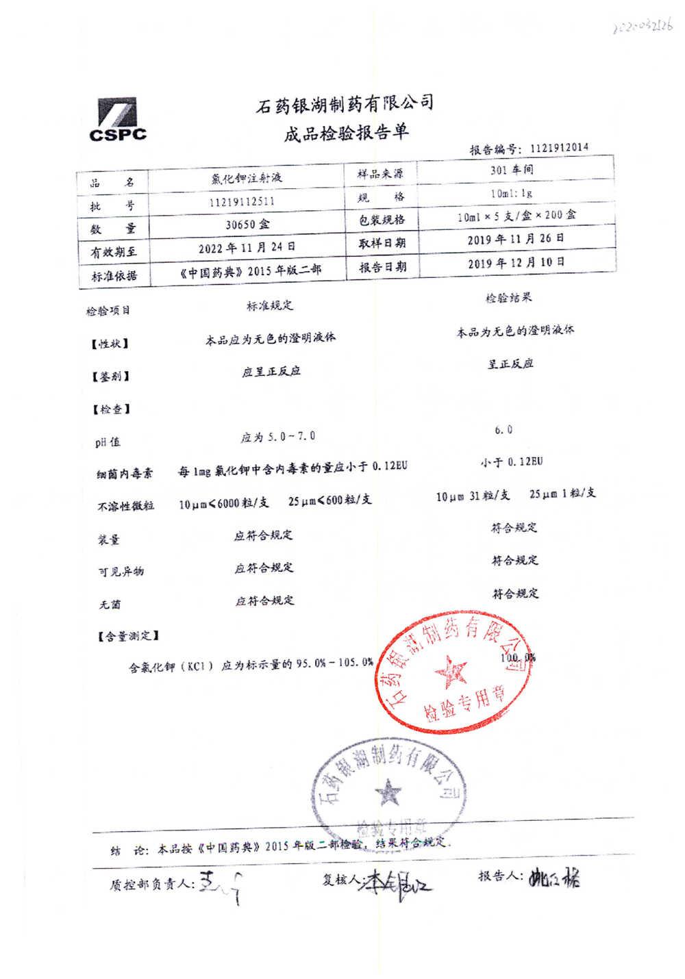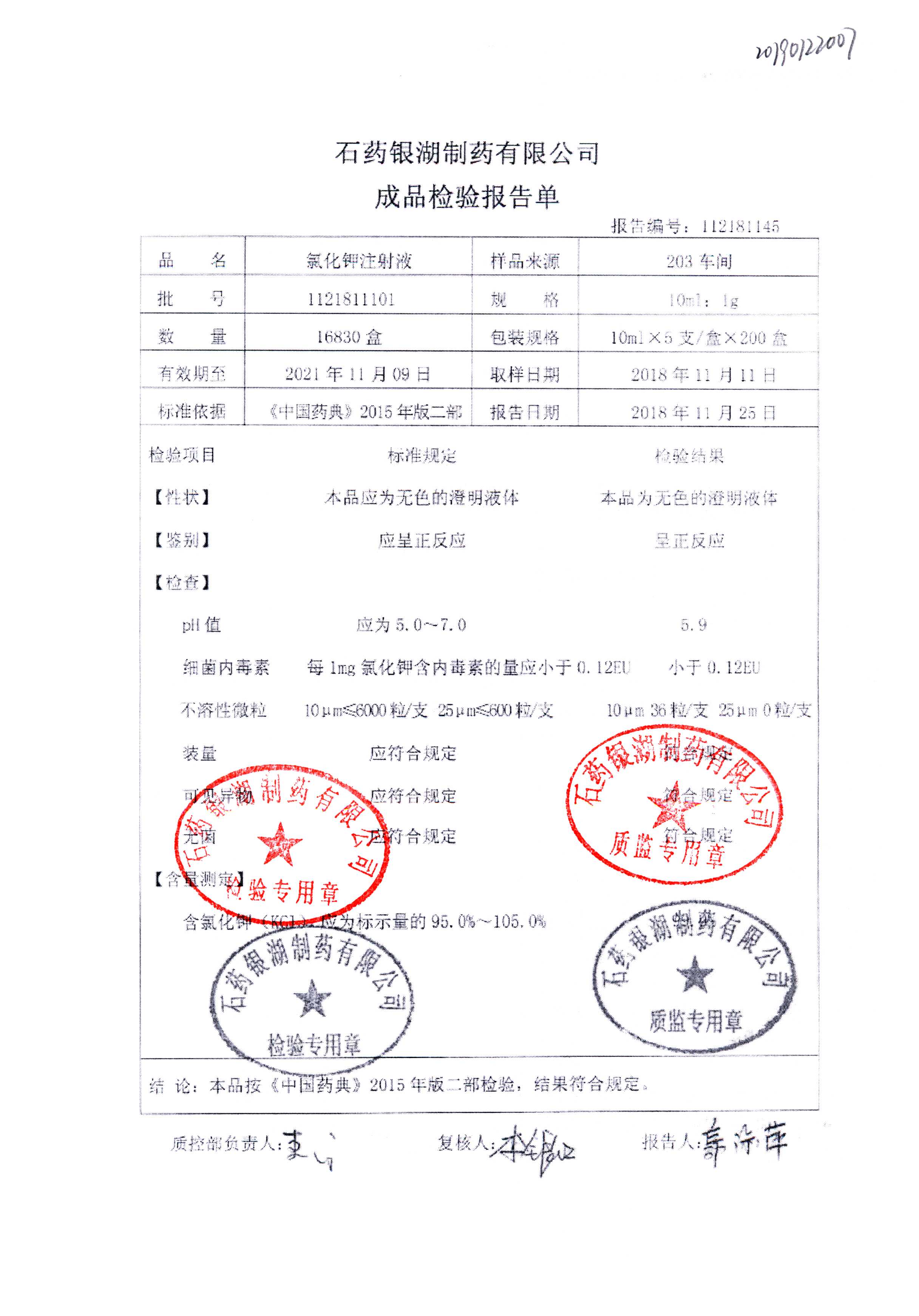 氯化钾注射液 | 10ml:1g | 11219041010 | 查看详情 |