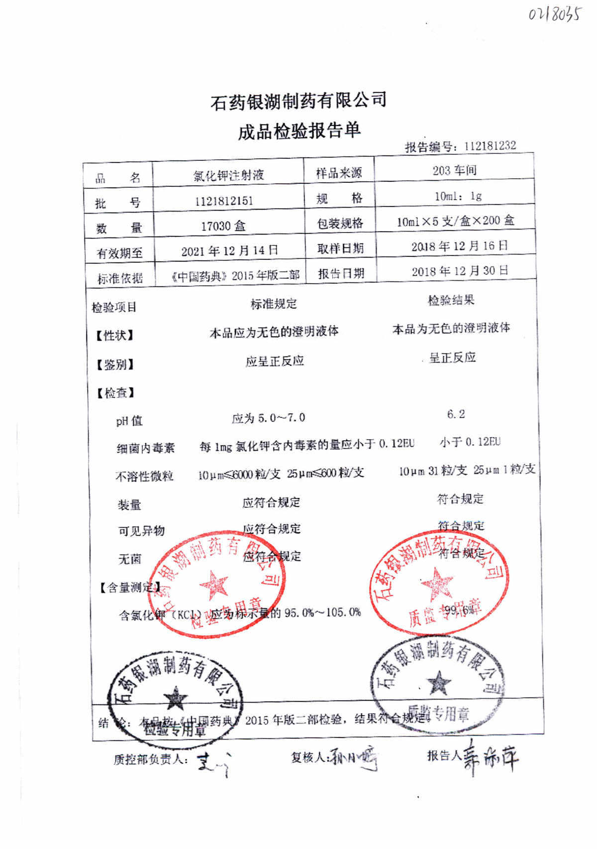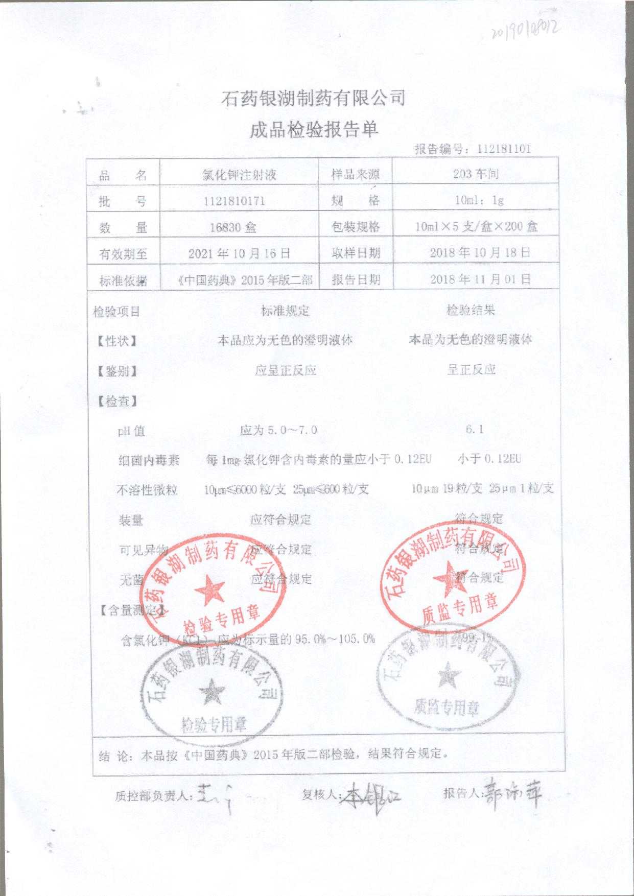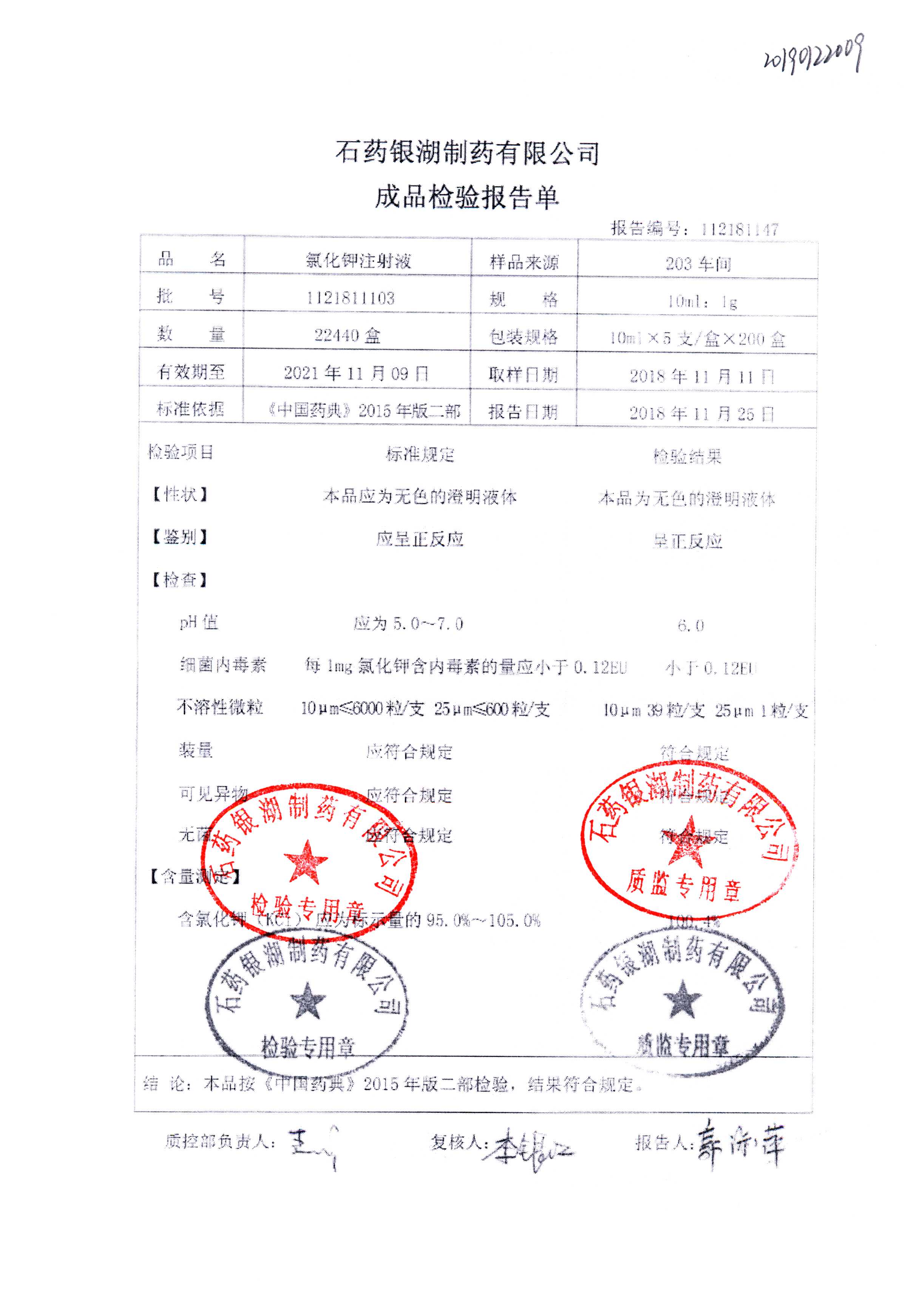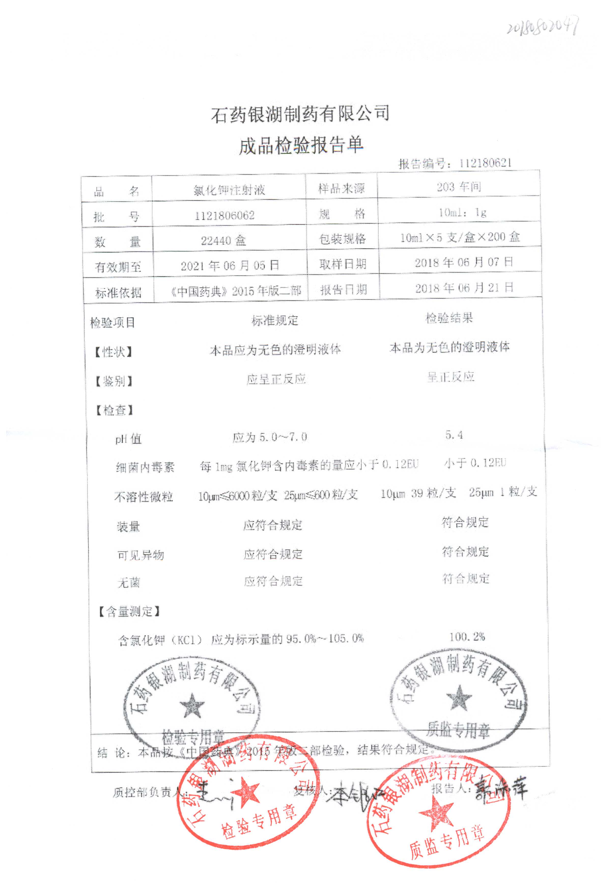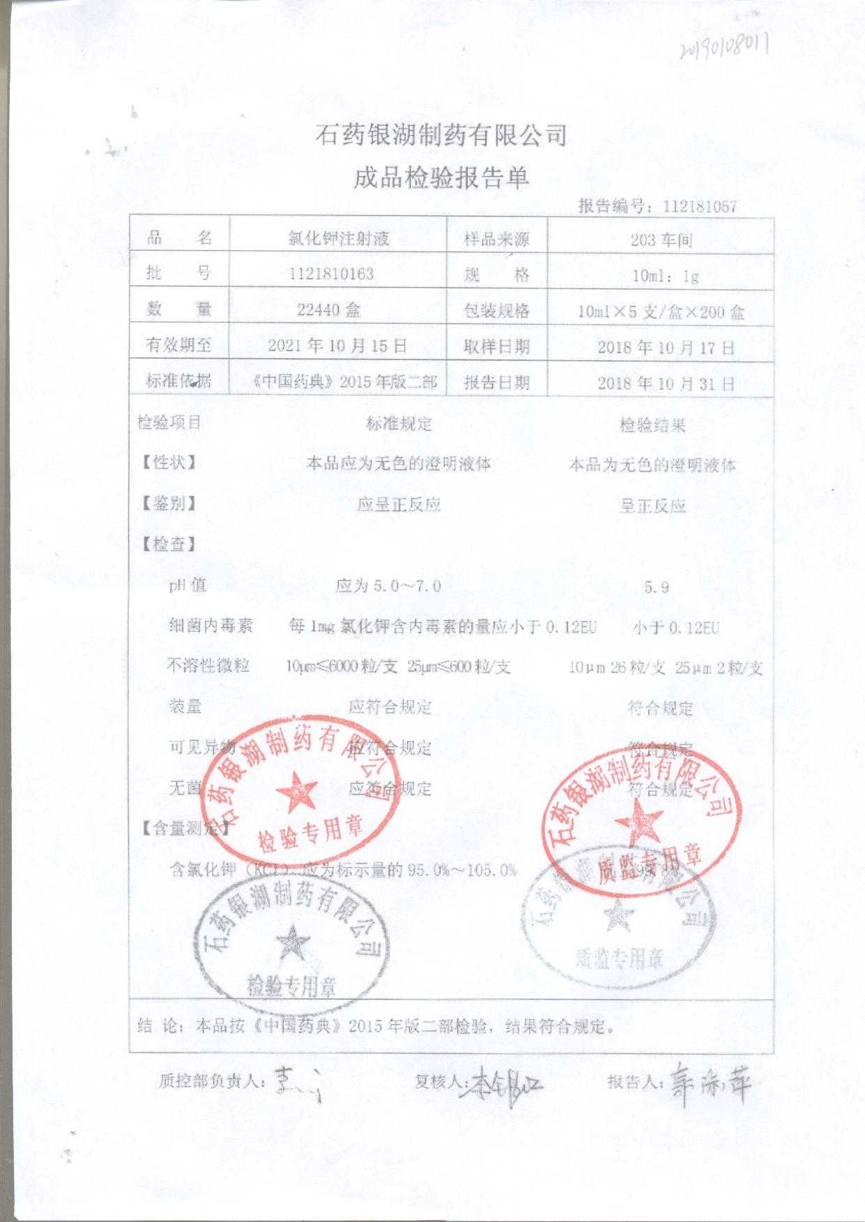 氯化钾注射液 | 10ml:1g | 11219041010 | 查看详情 |
