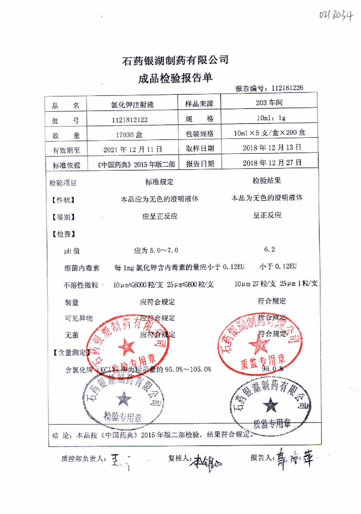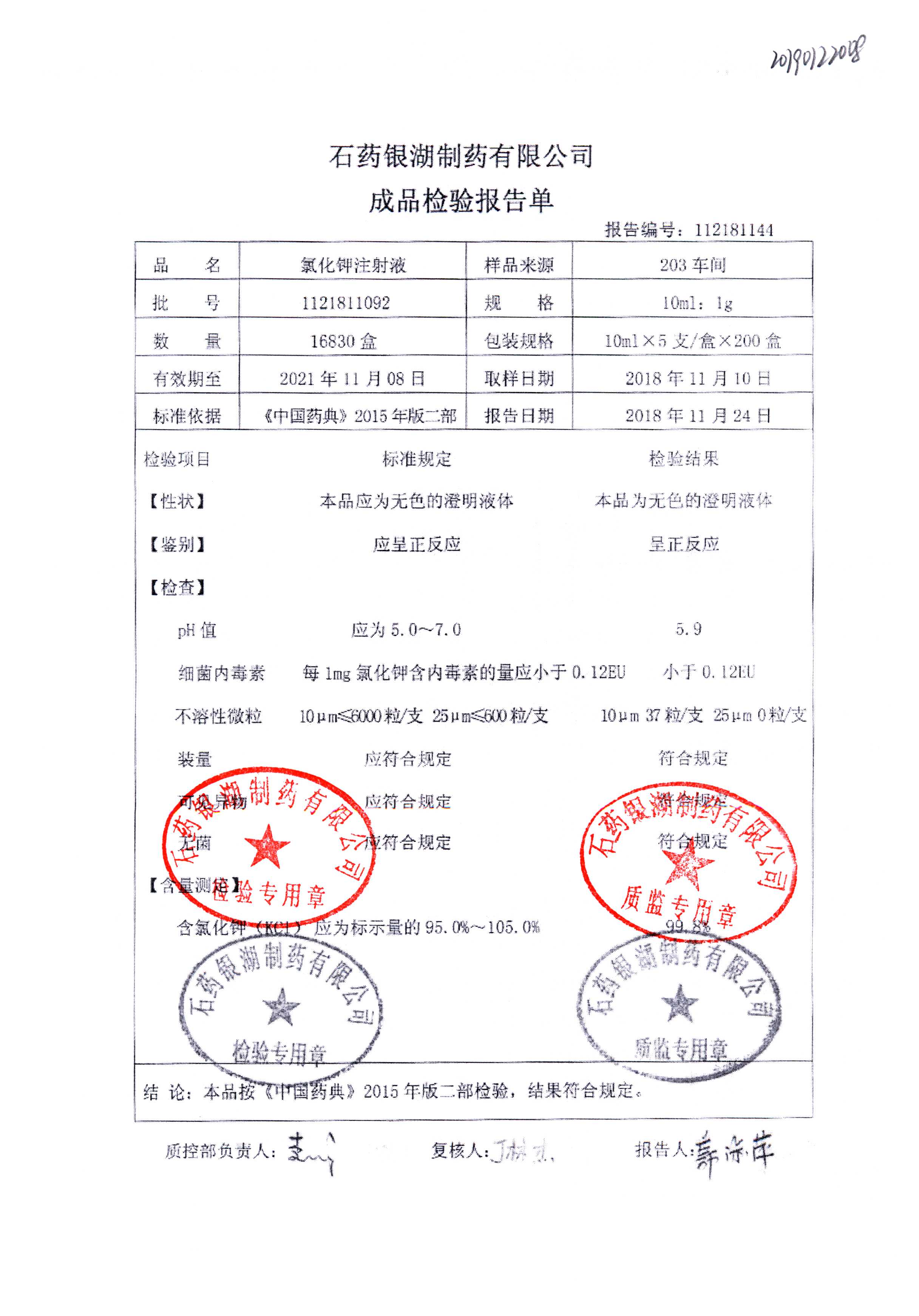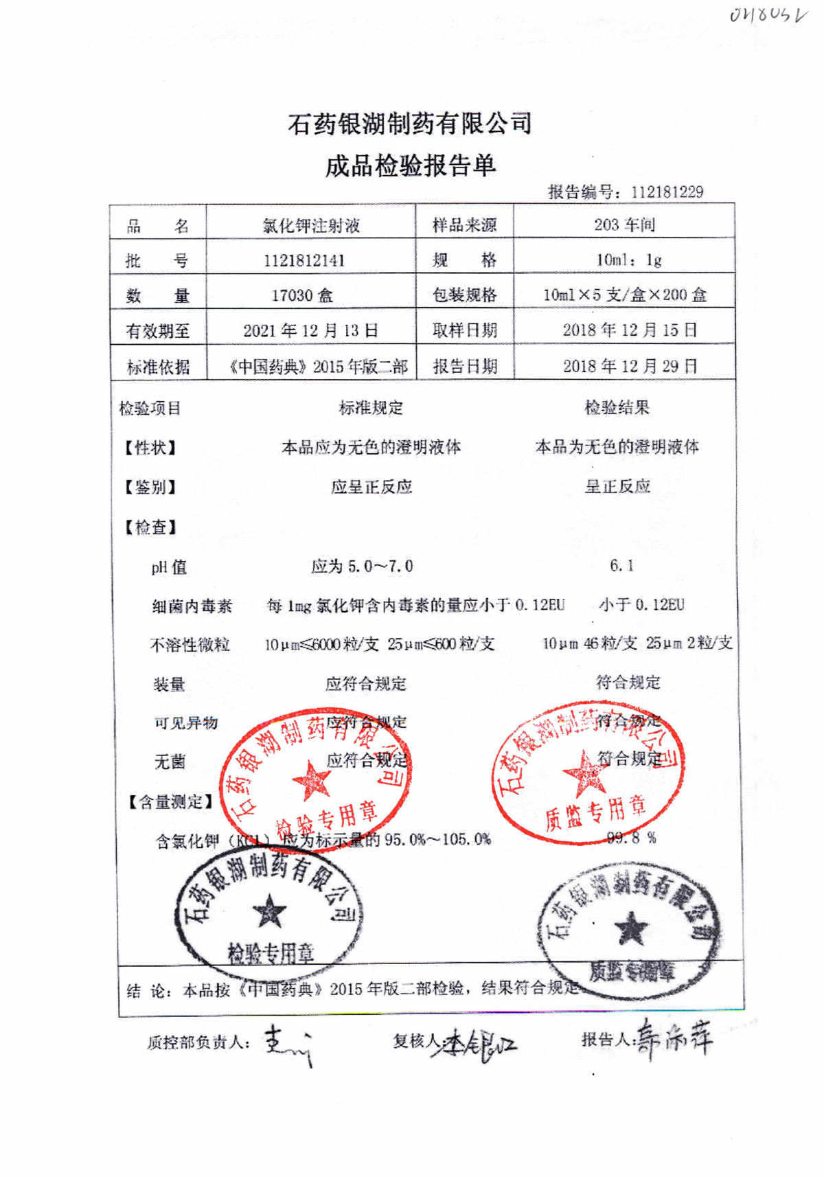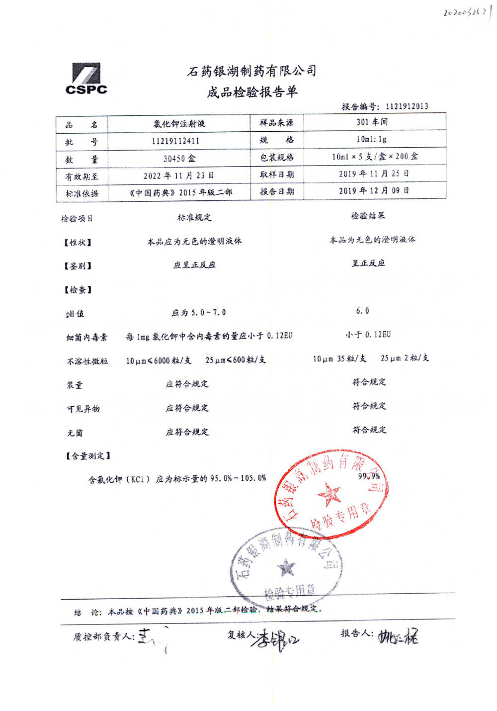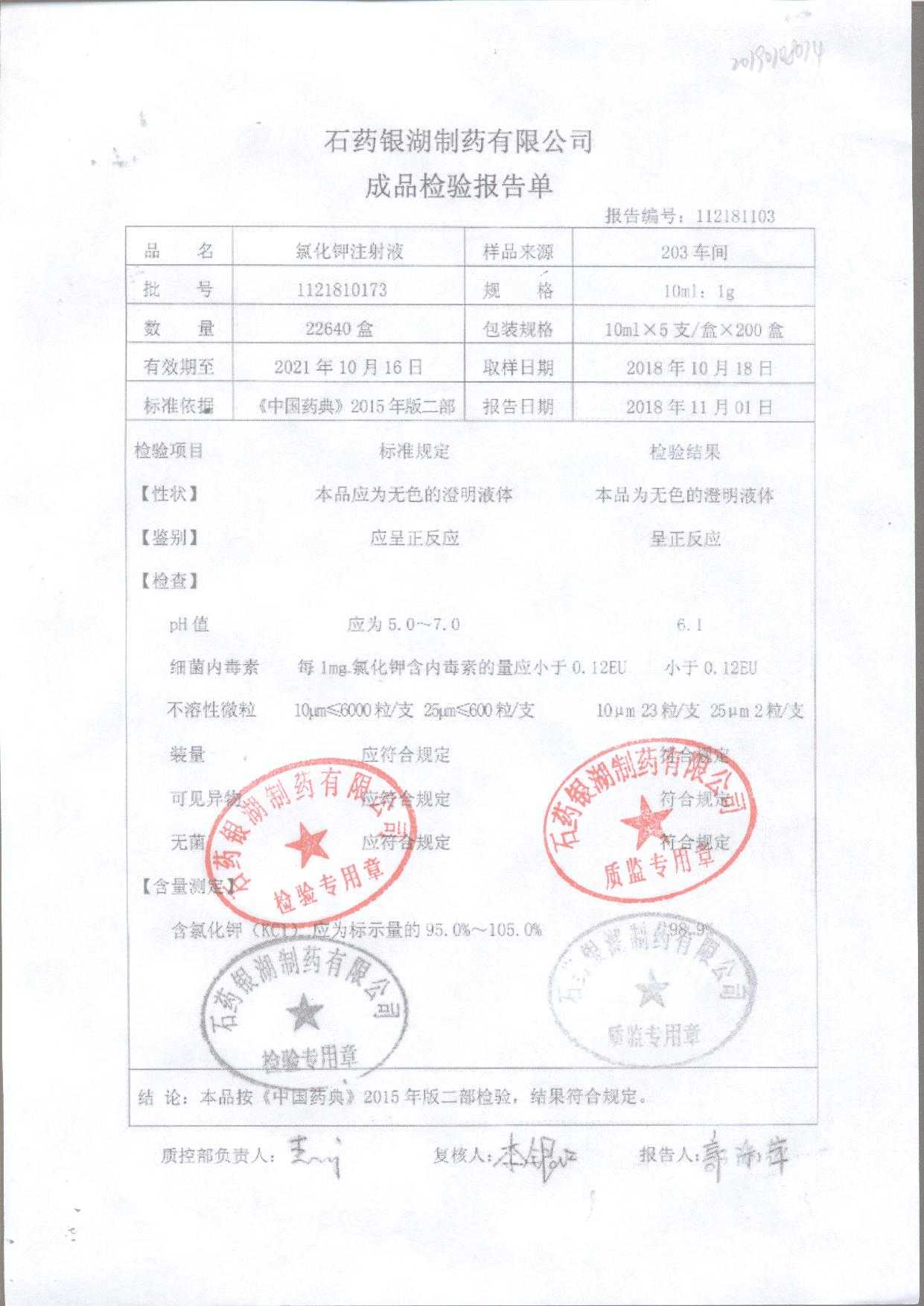 氯化钾注射液 | 10ml:1g | 11219041010 | 查看详情 |