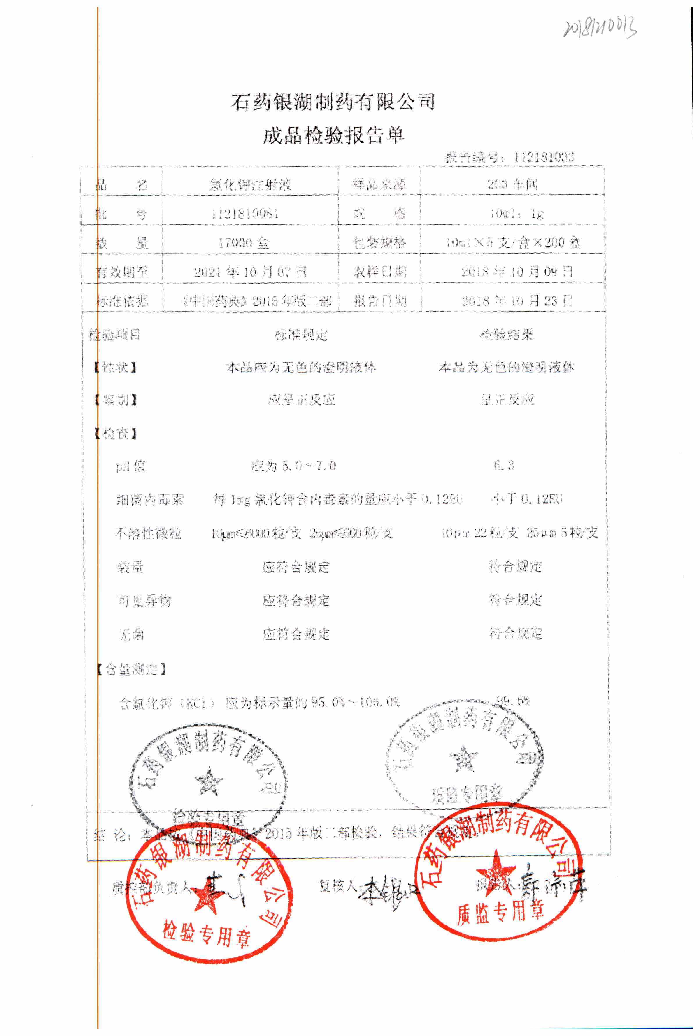 氯化钾注射液 | 10ml:1g | 1121811101 | 查看详情 |