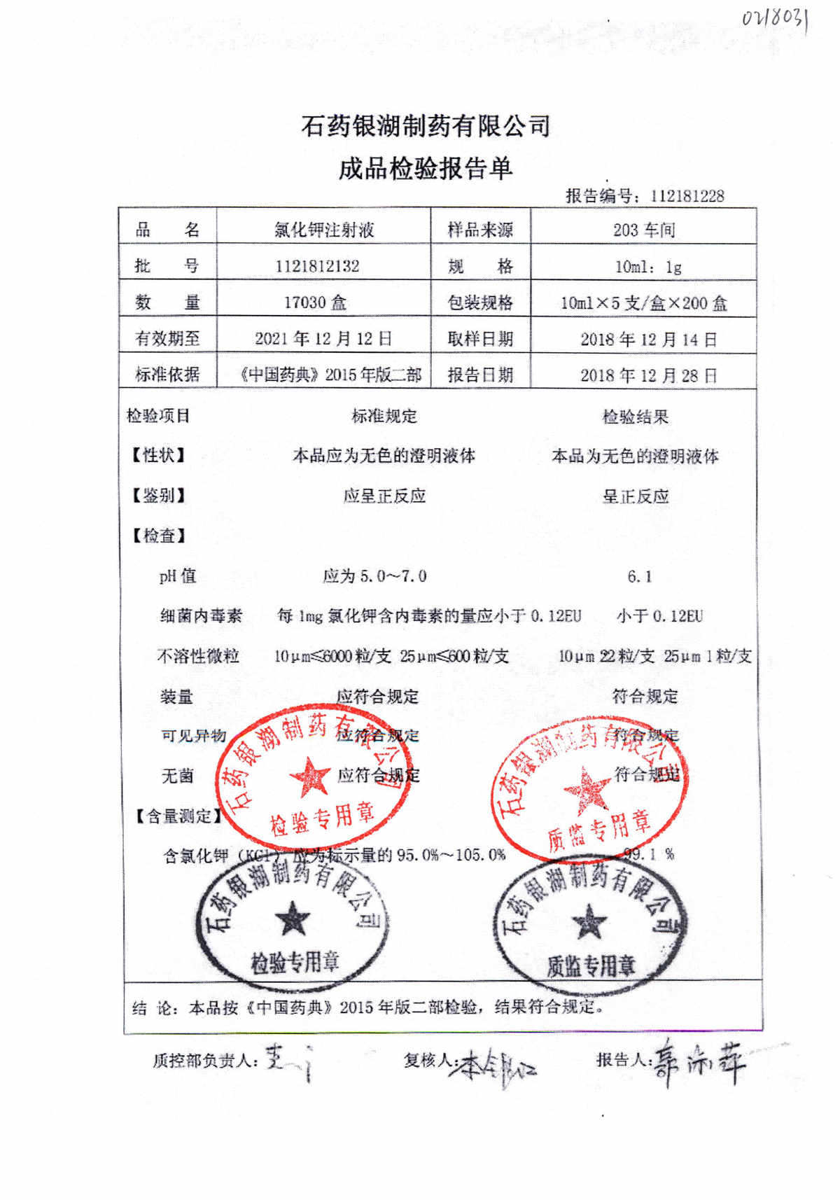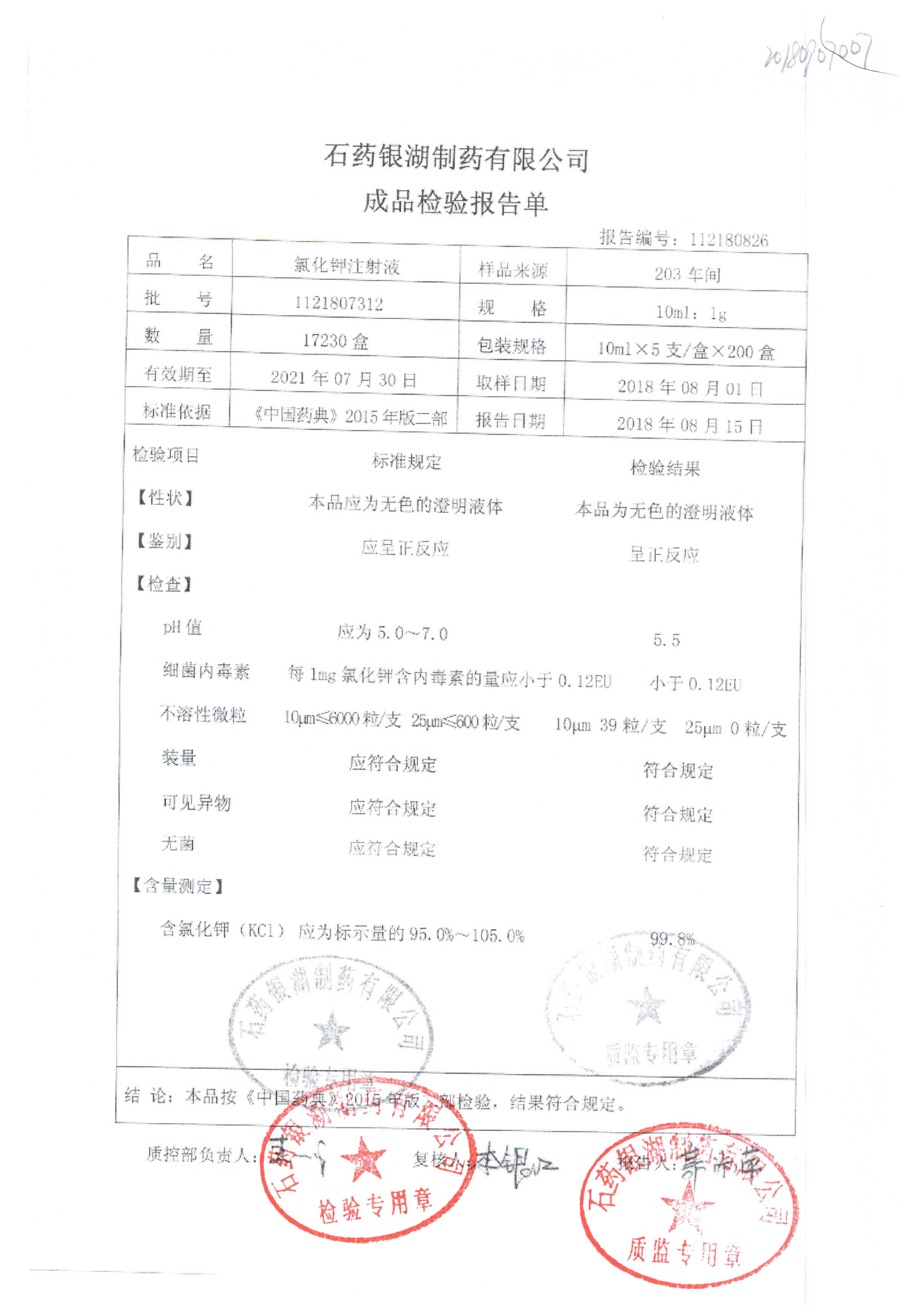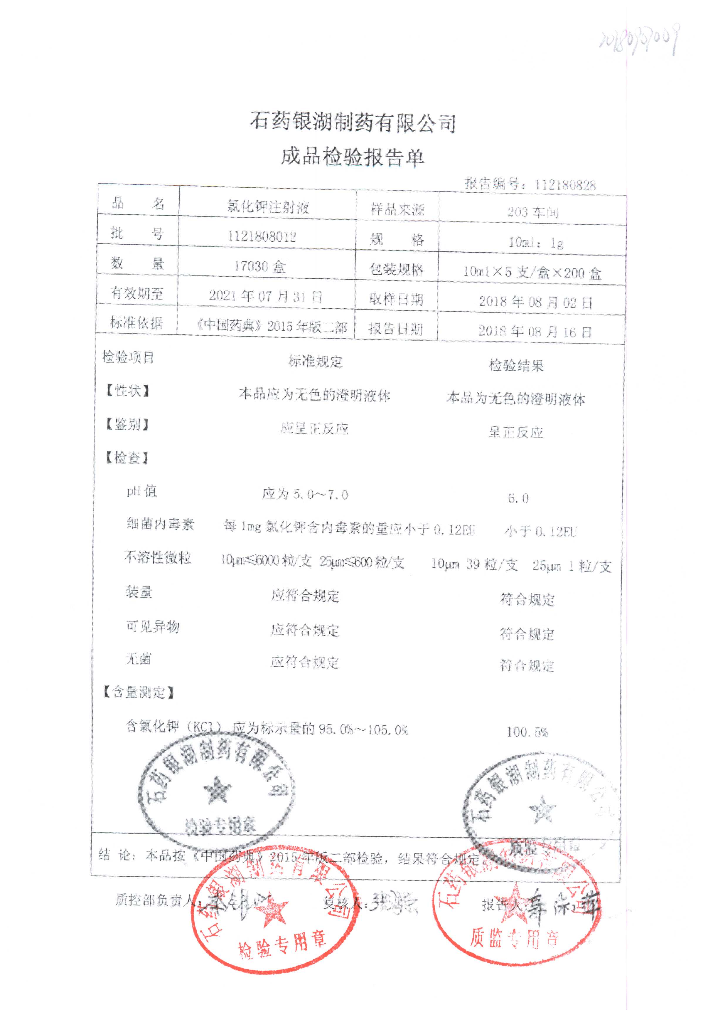 氯化钾注射液 | 10ml:1g | 1121808301 | 查看详情 |