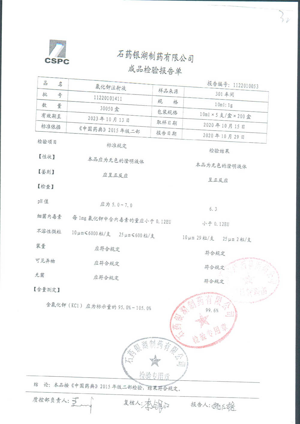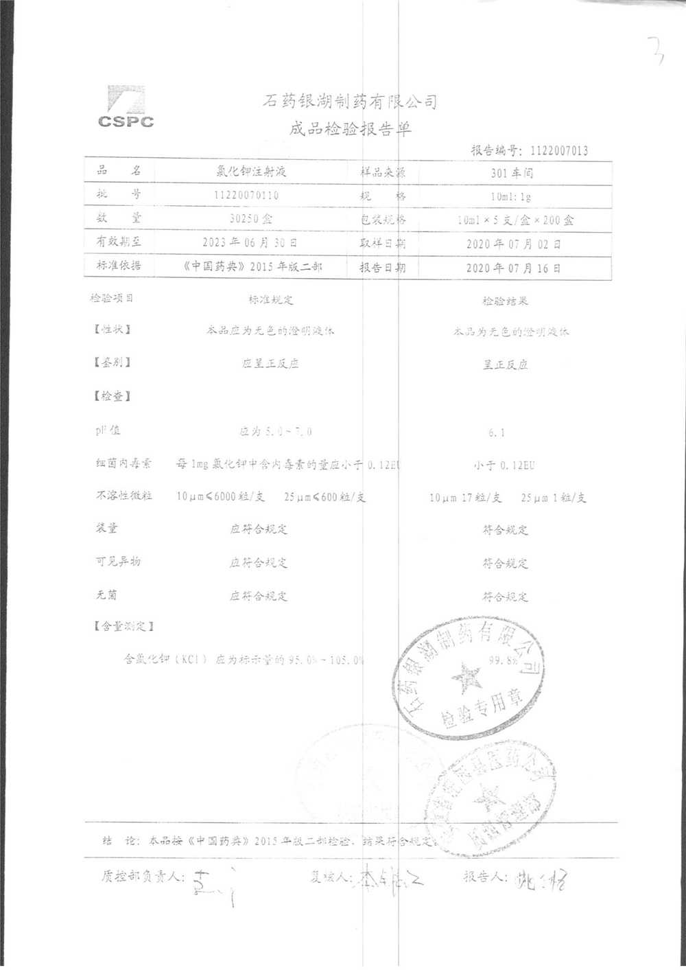 氯化钾注射液 | 10ml:1g | 11220070110 | 查看详情 |