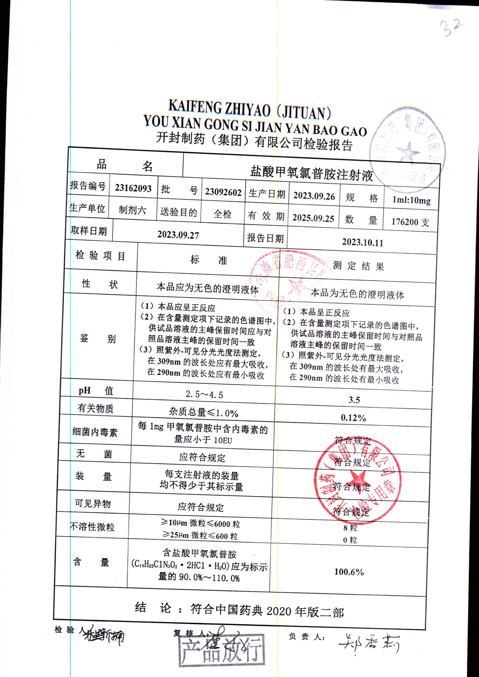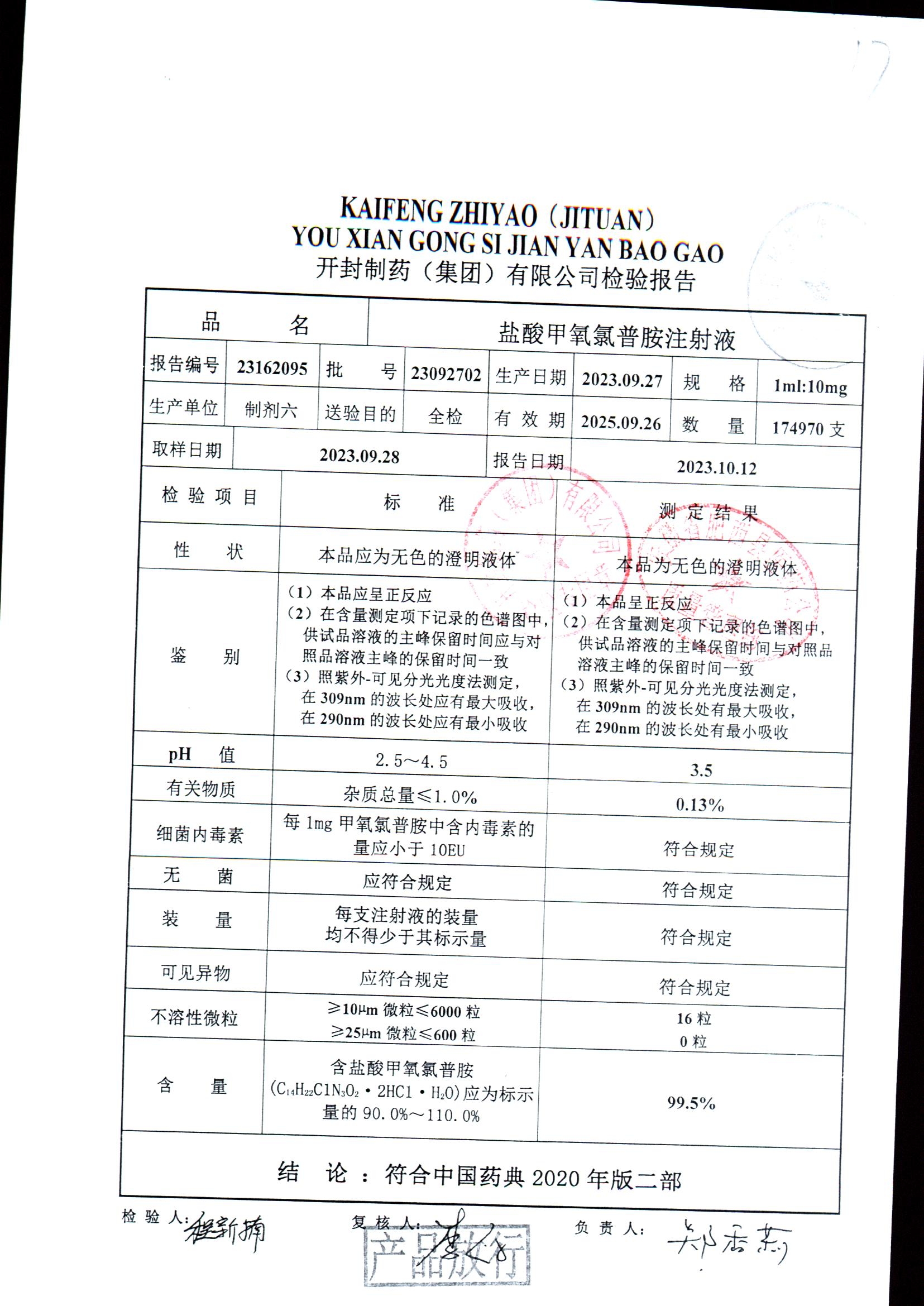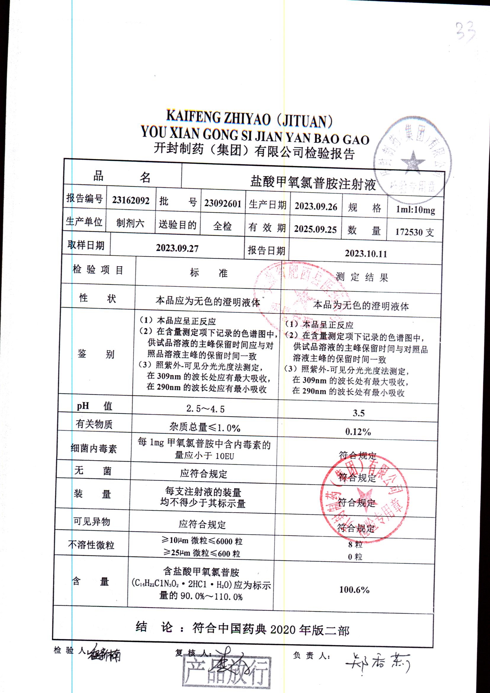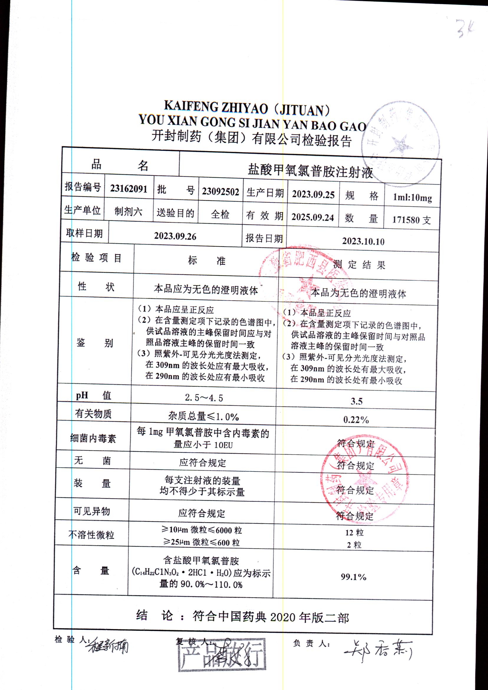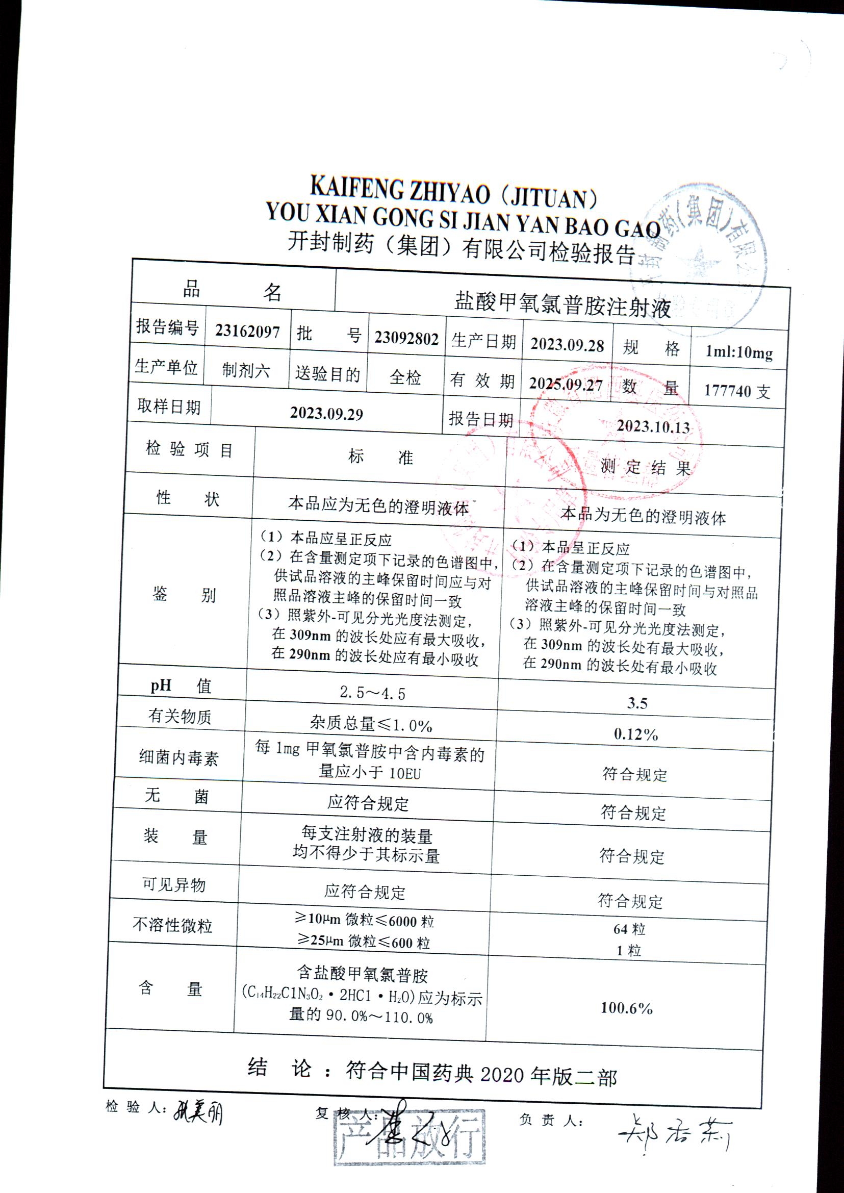 盐酸甲氧氯普胺注射液 | 1ml:10mg | 23092501 | 查看详情 |