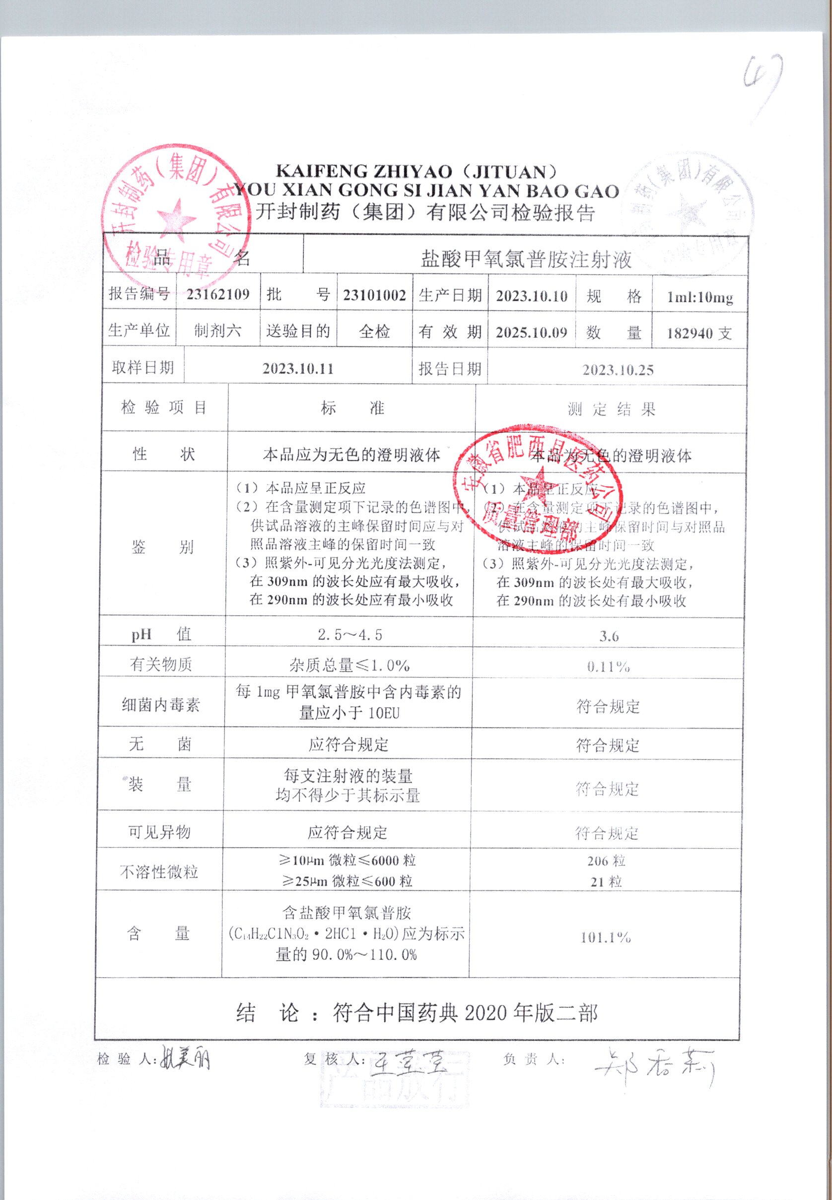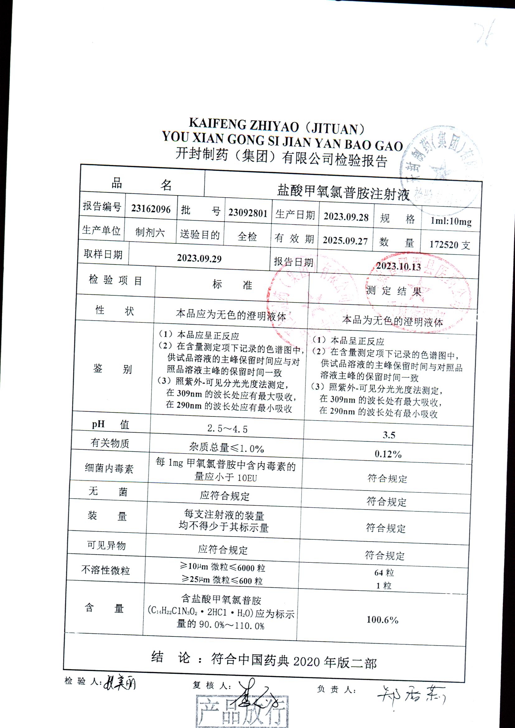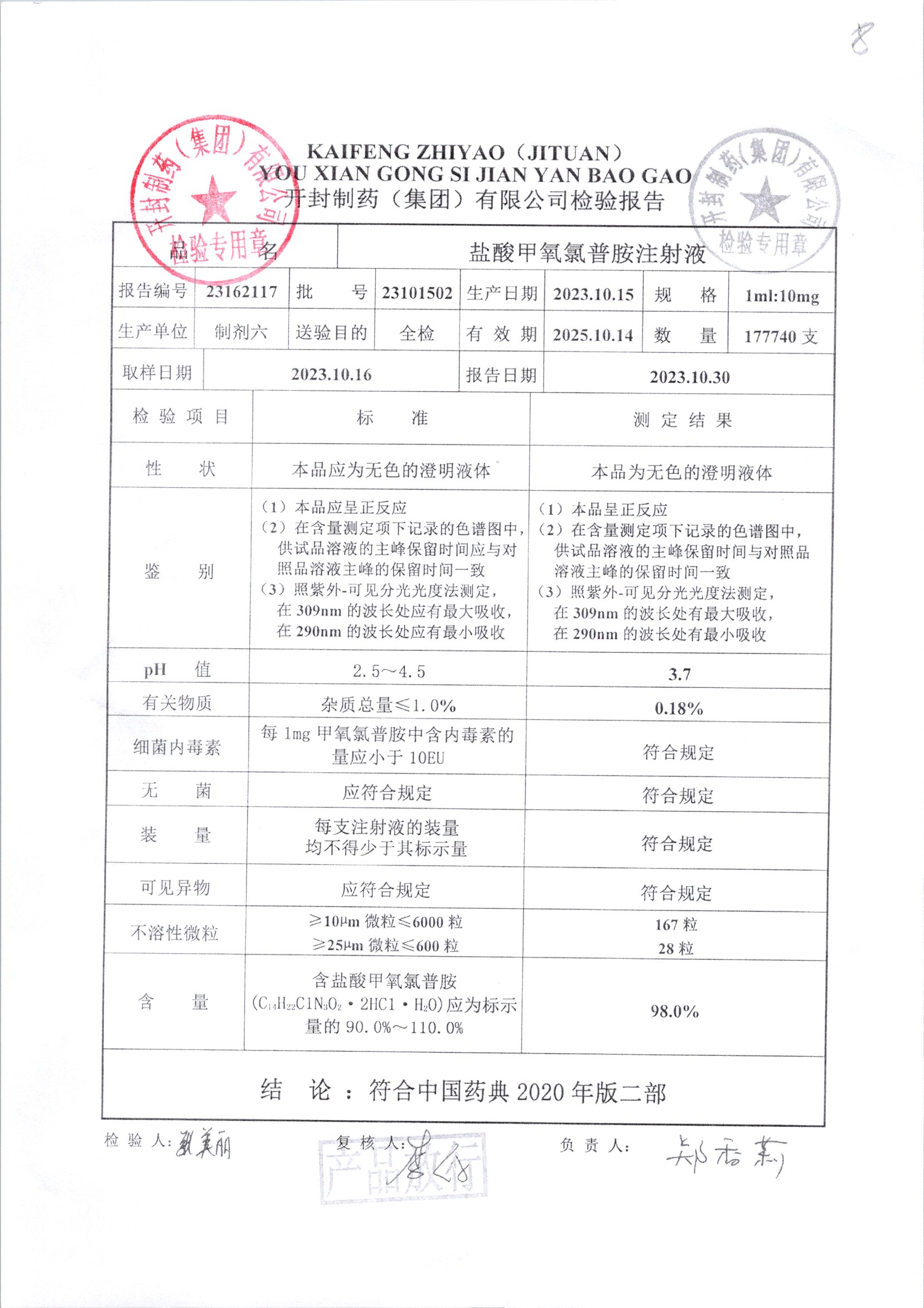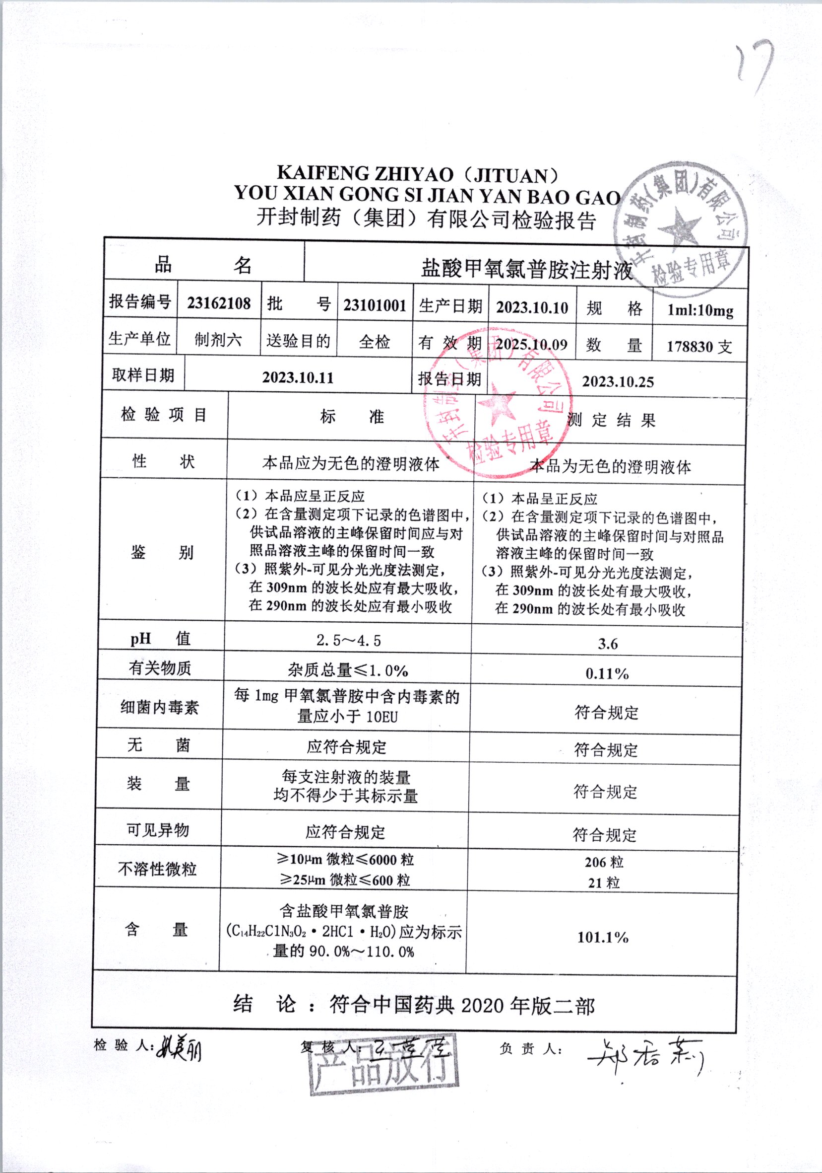 盐酸甲氧氯普胺注射液 | 1ml:10mg | 23092501 | 查看详情 |