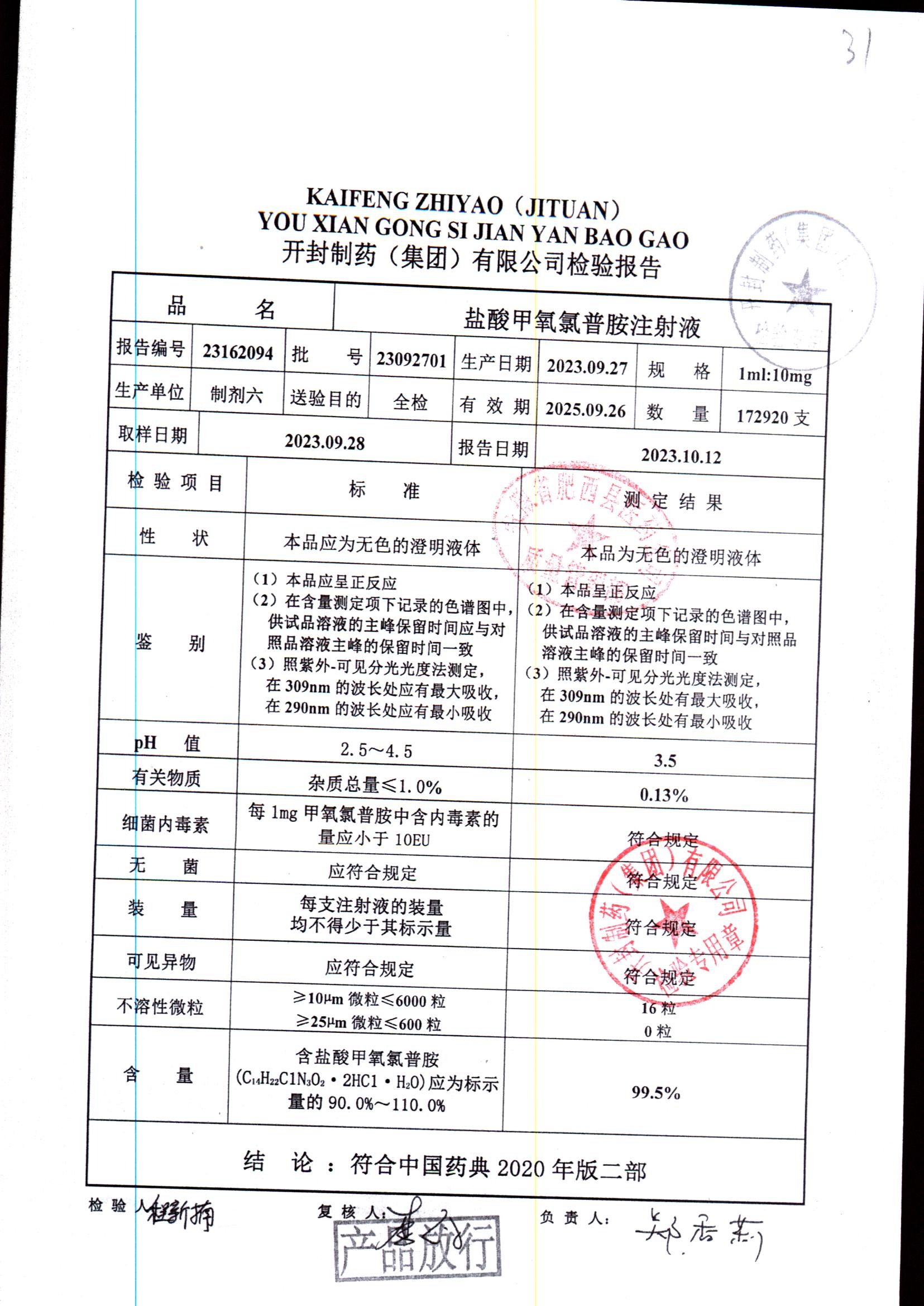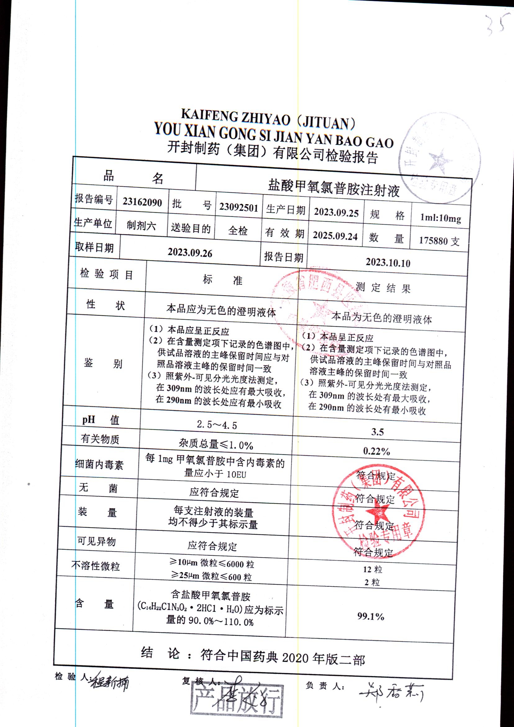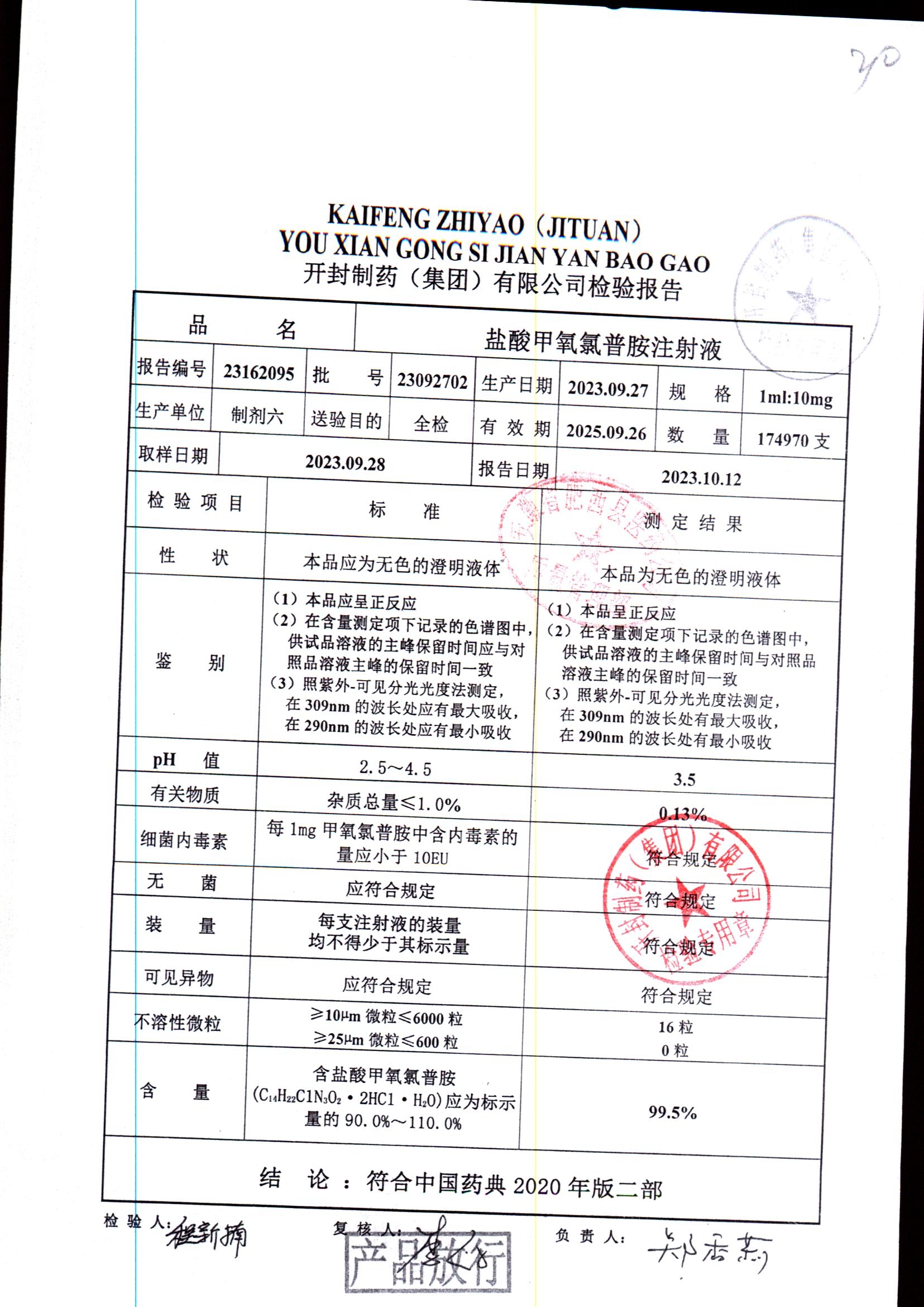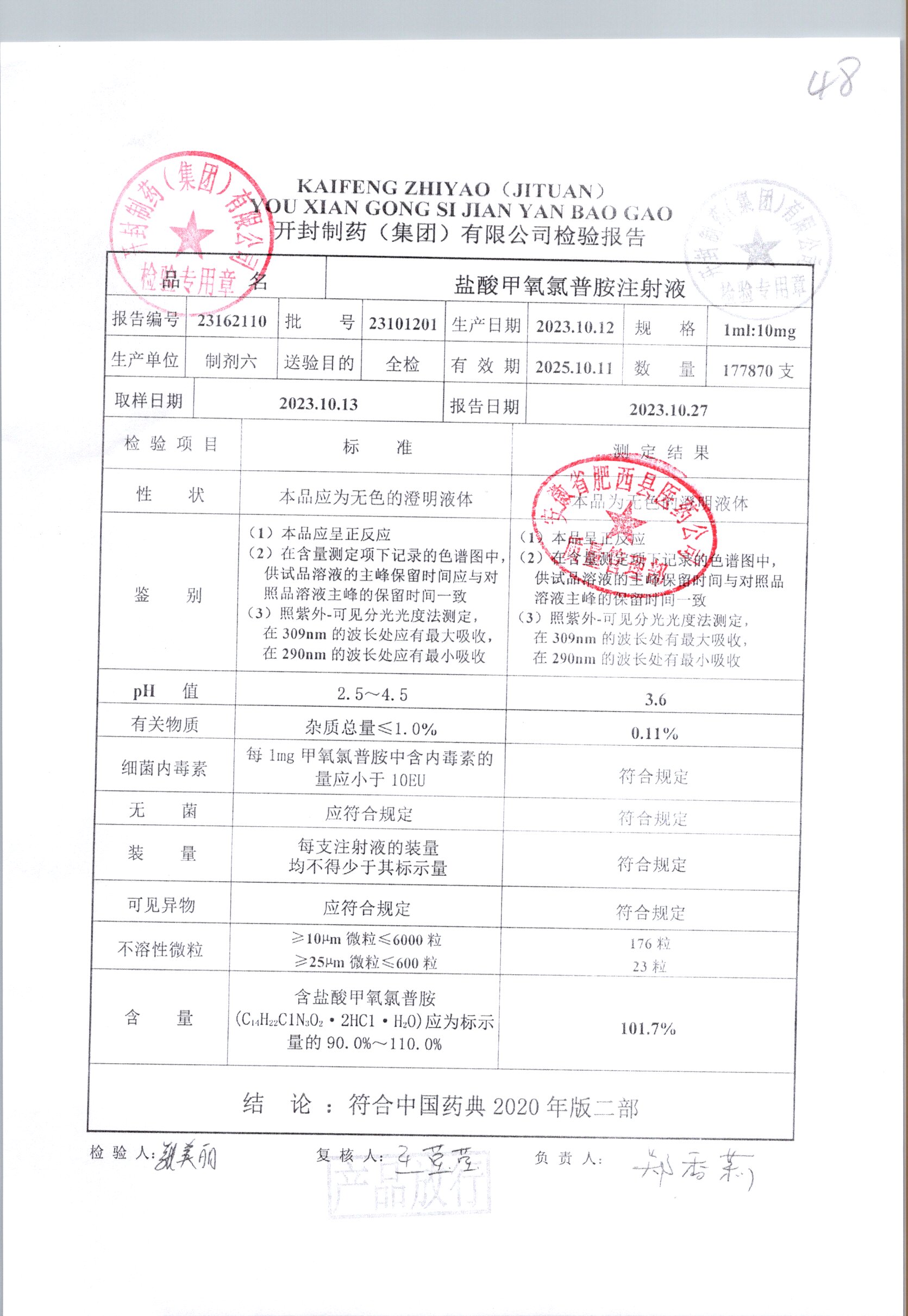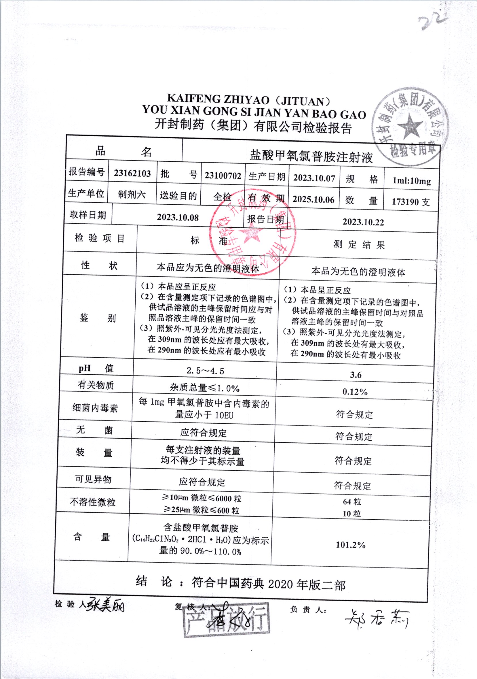 盐酸甲氧氯普胺注射液 | 1ml:10mg | 23092501 | 查看详情 |