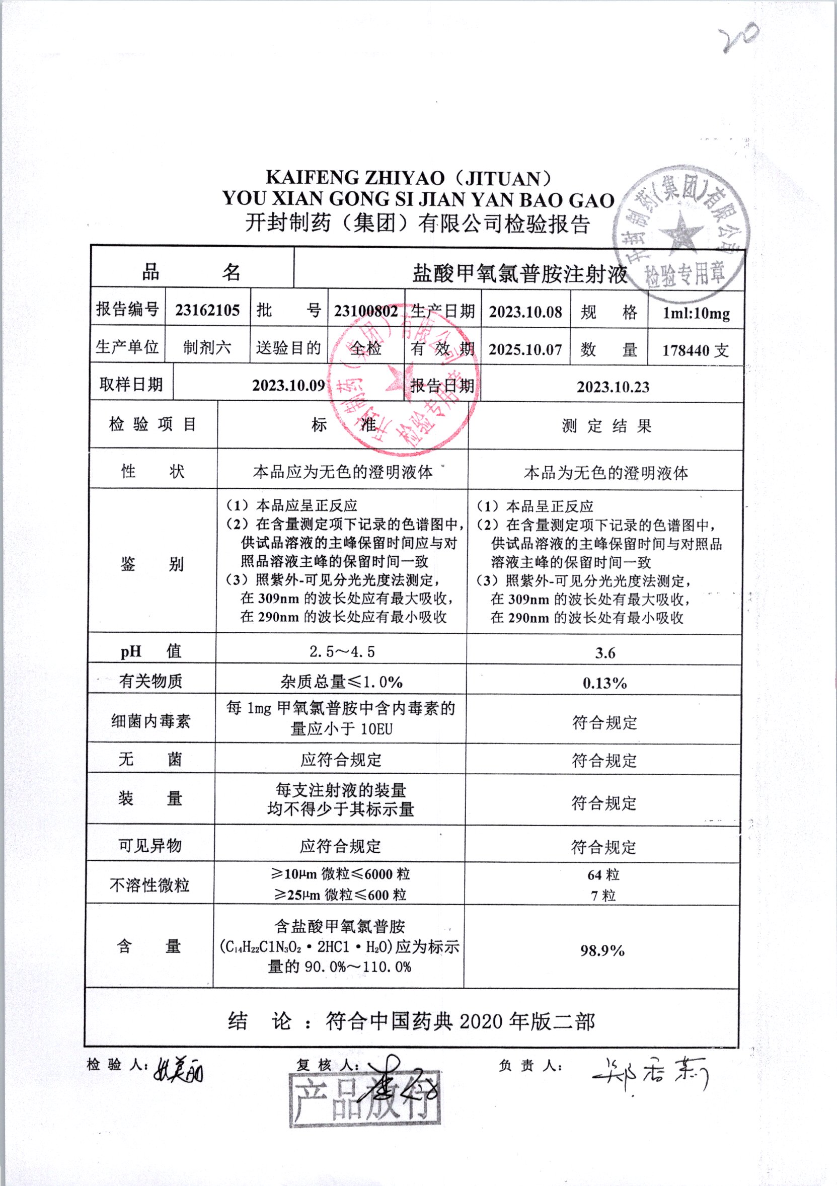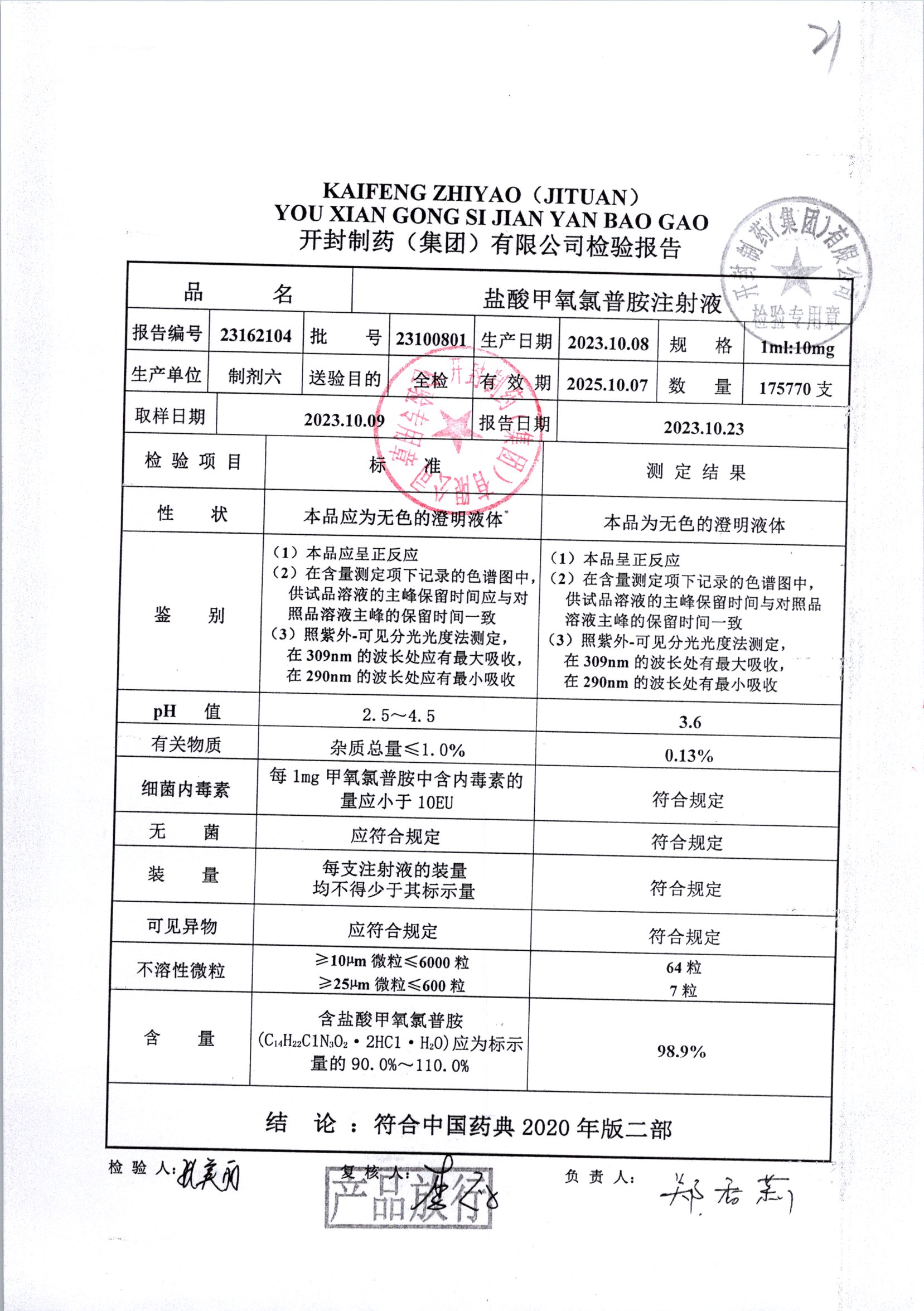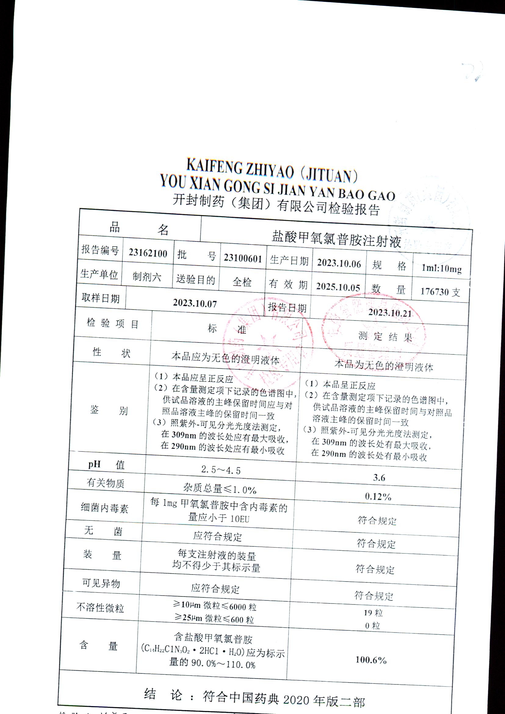 盐酸甲氧氯普胺注射液 | 1ml:10mg | 23100801 | 查看详情 |