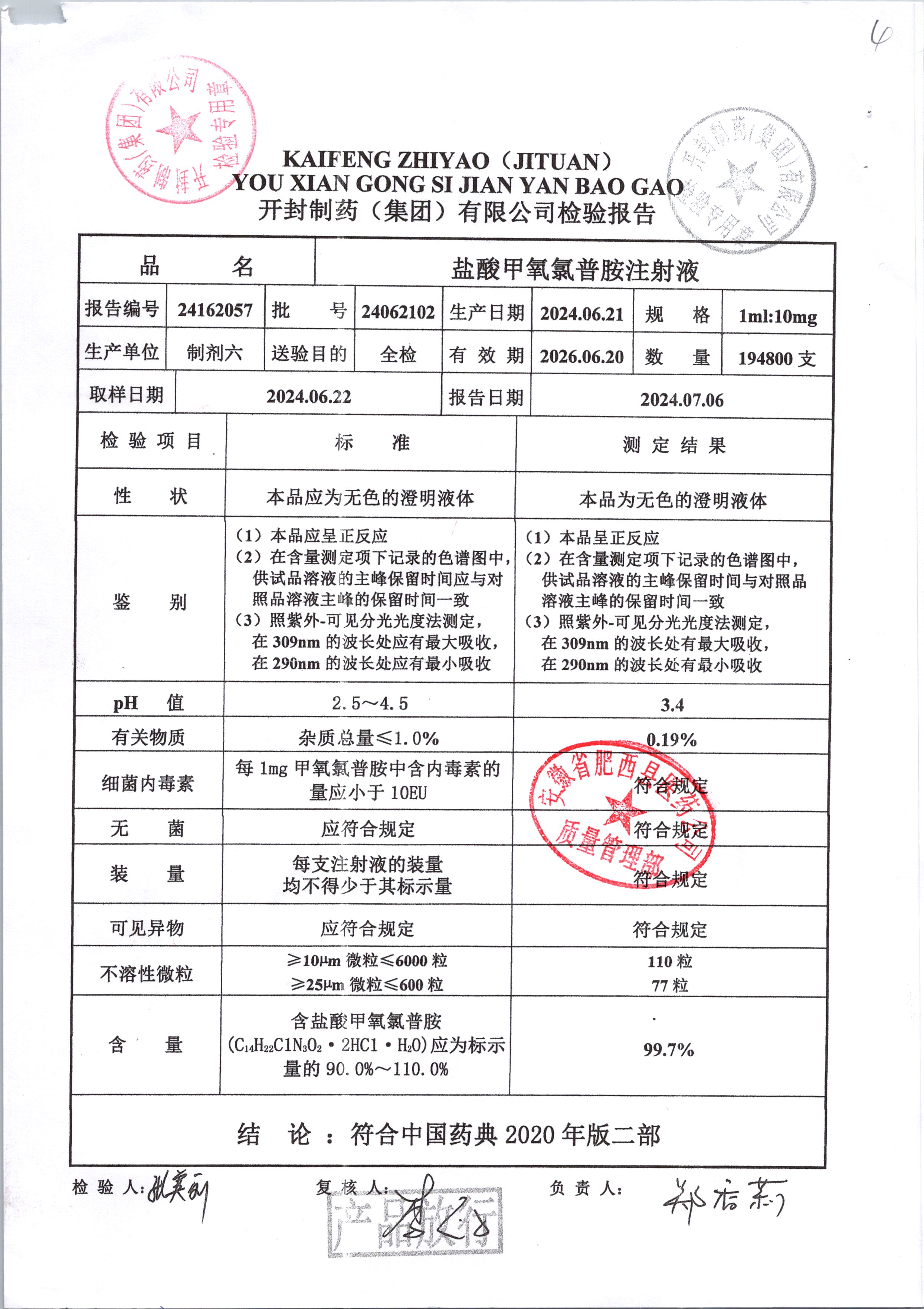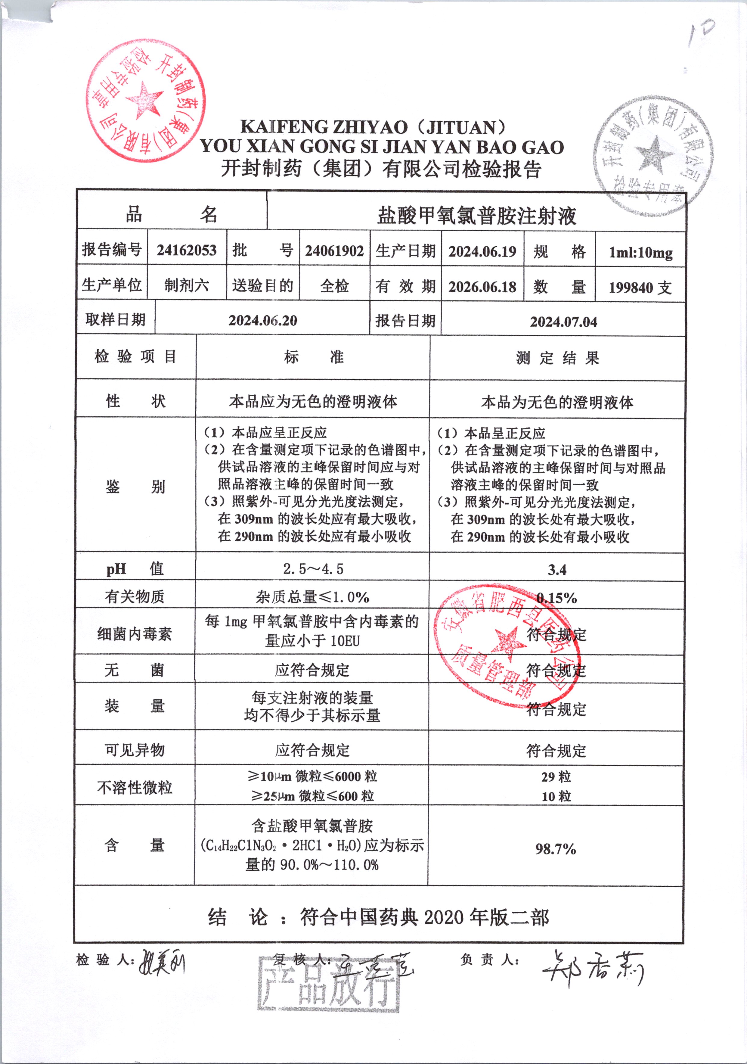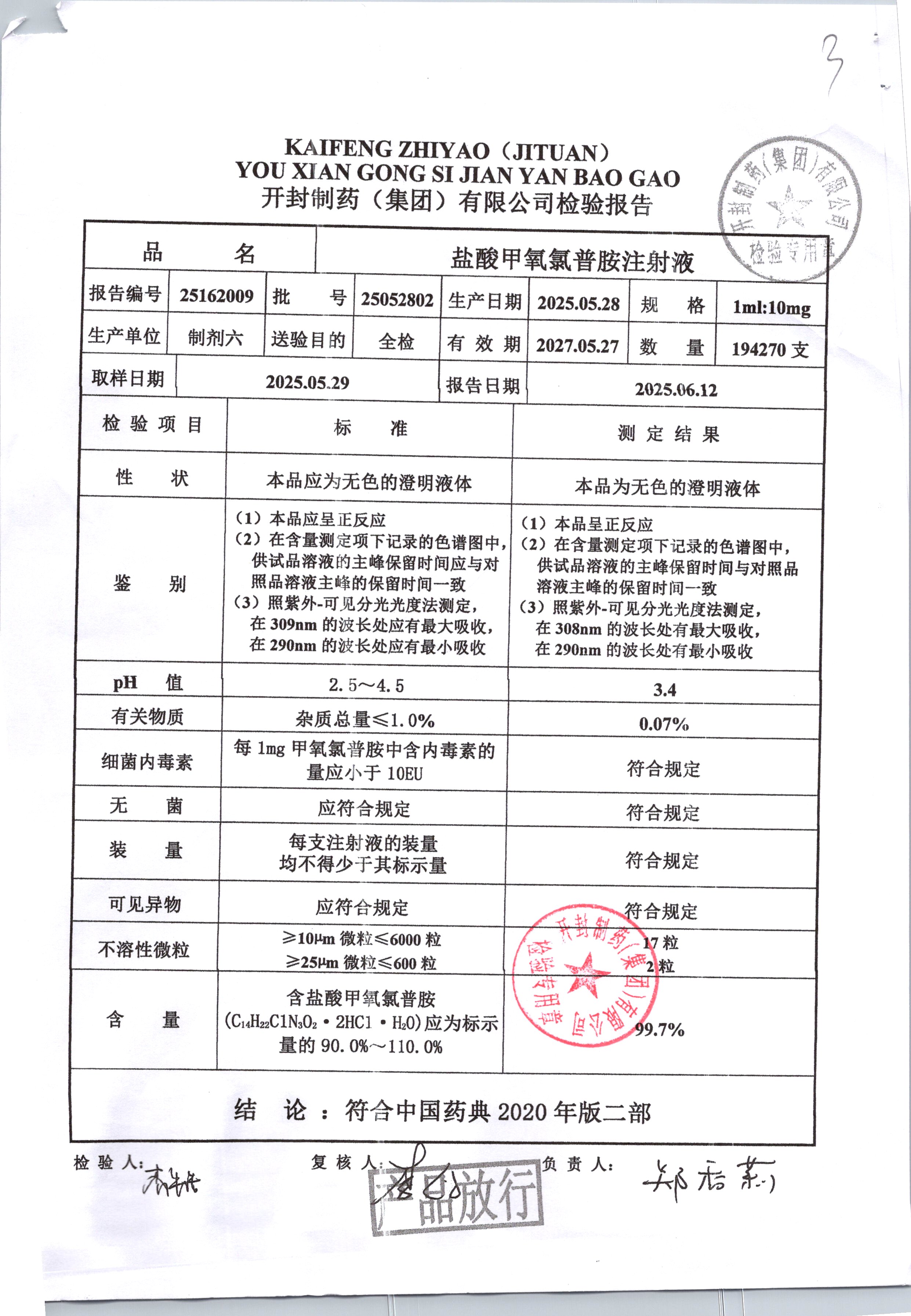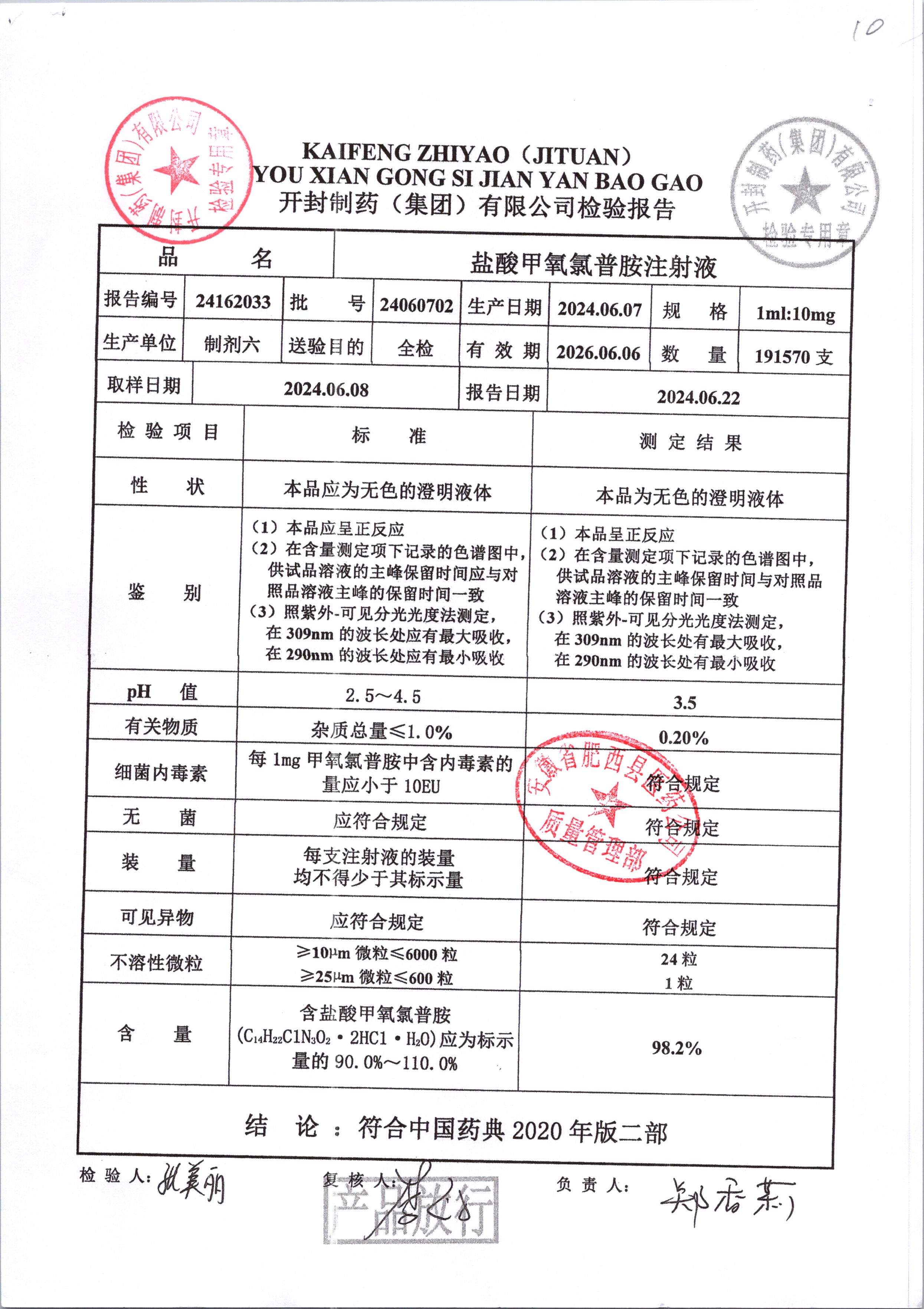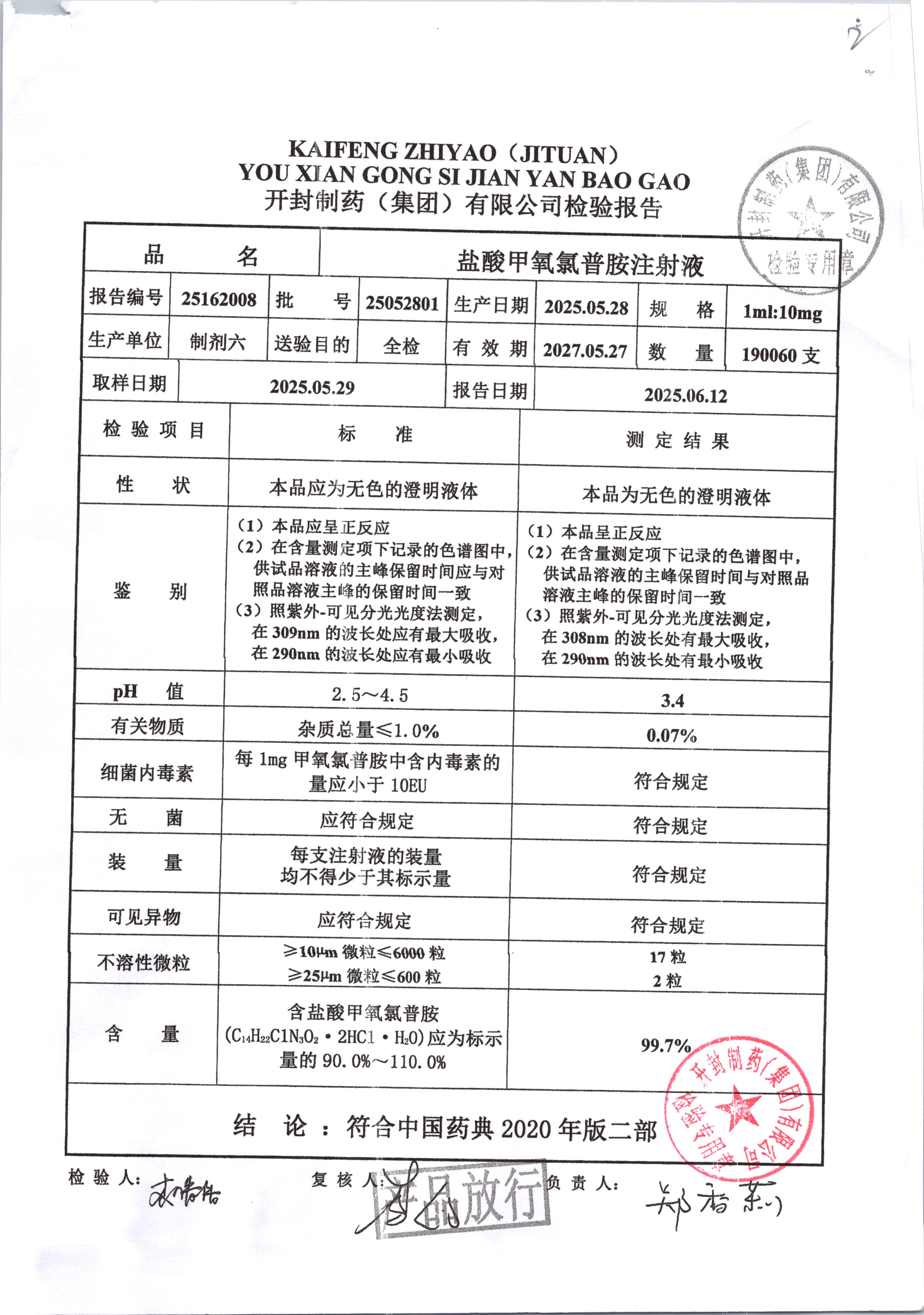 盐酸甲氧氯普胺注射液 | 1ml:10mg | 24062001 | 查看详情 |