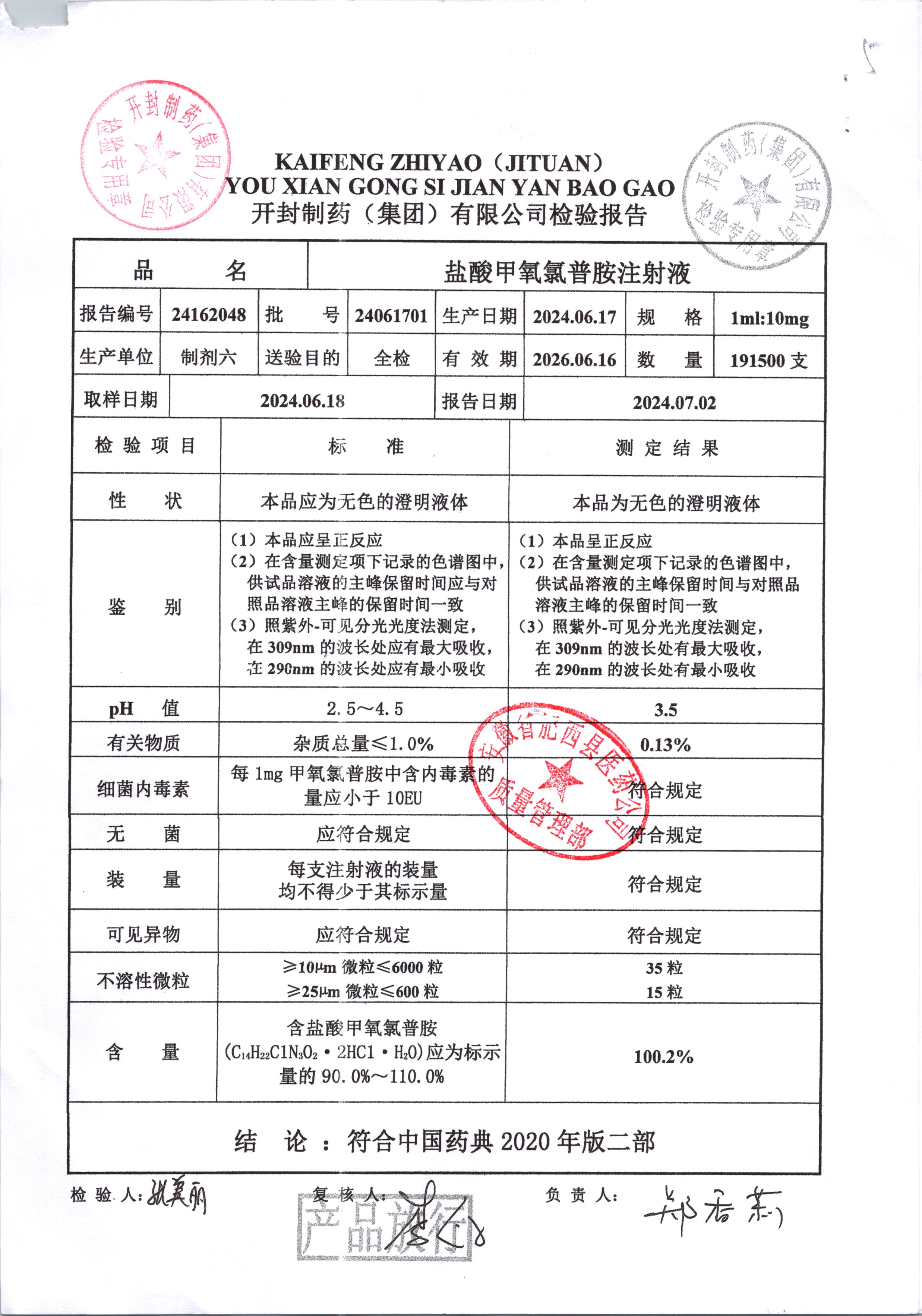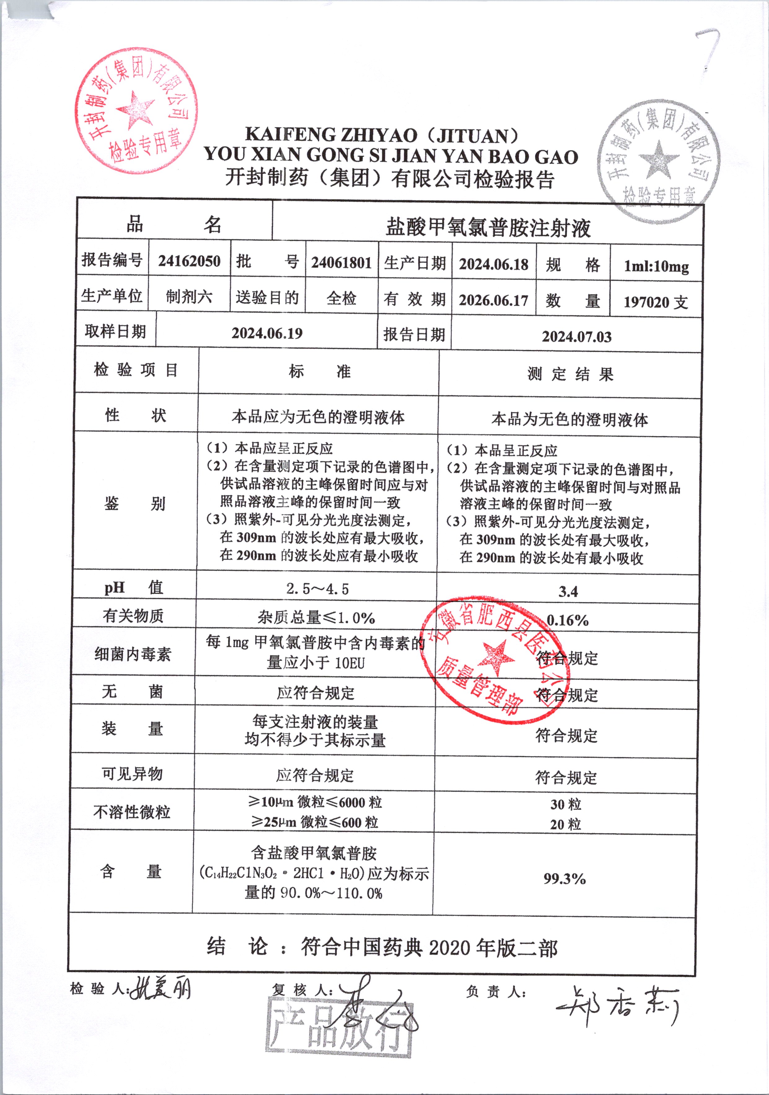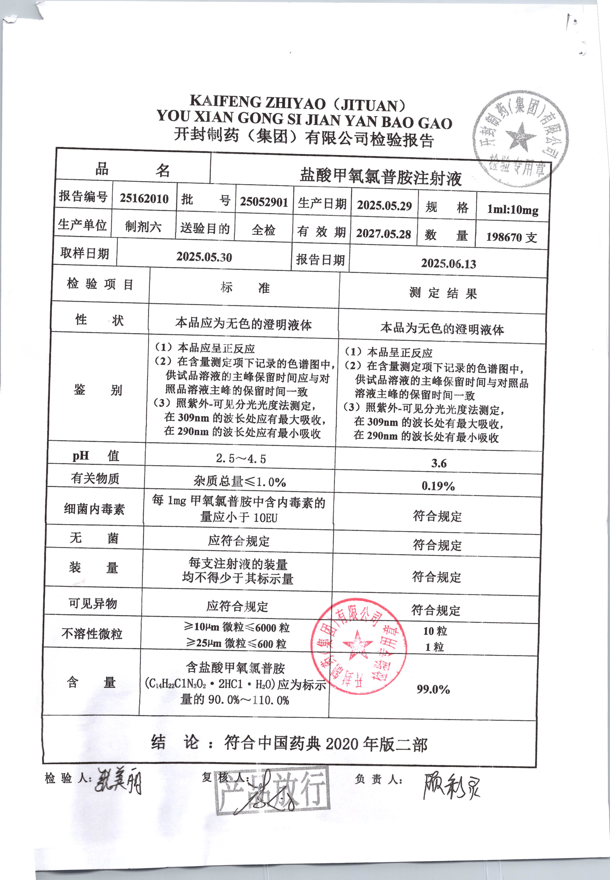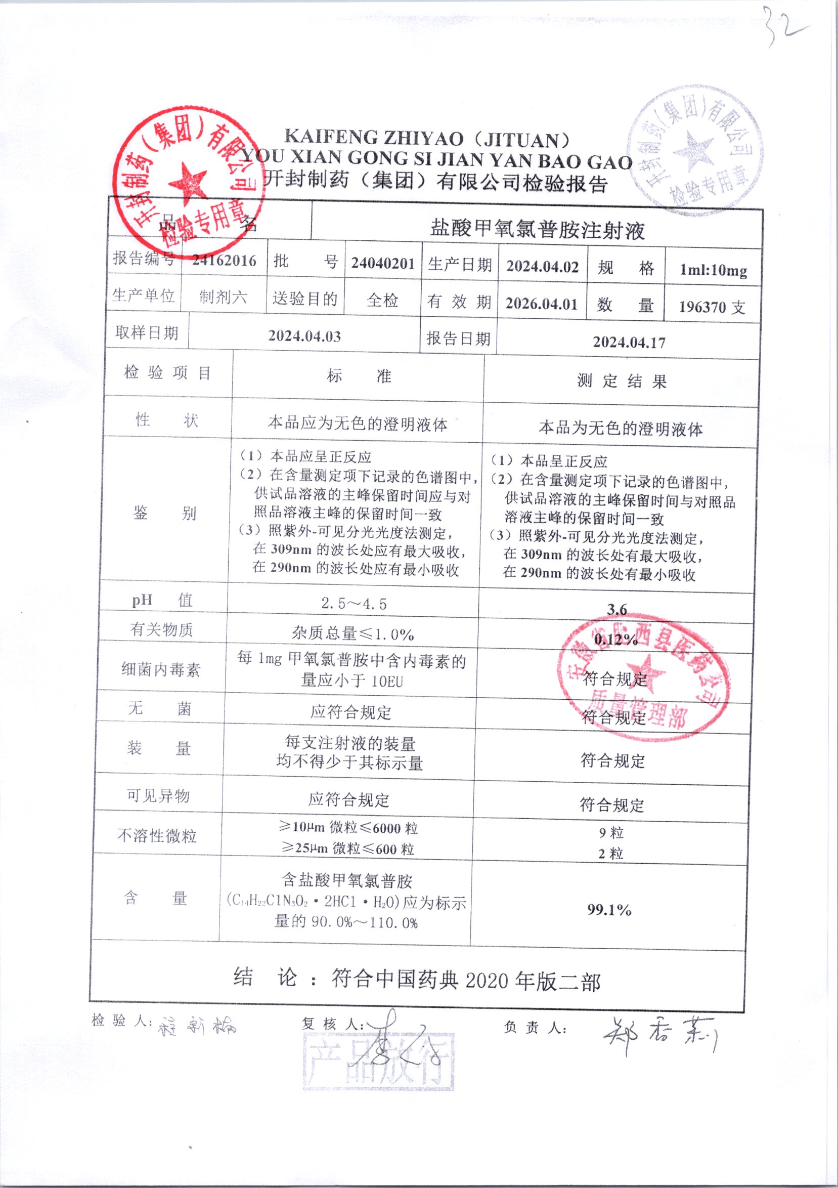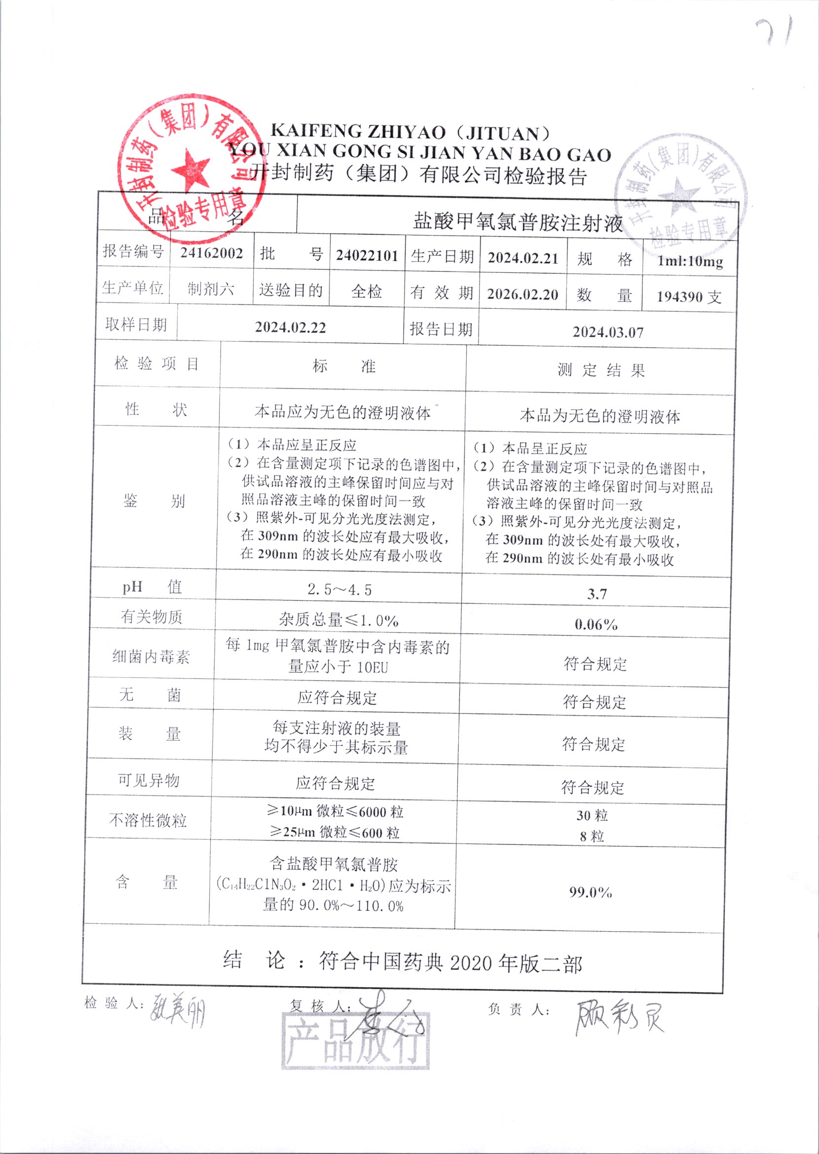 盐酸甲氧氯普胺注射液 | 1ml:10mg | 24062001 | 查看详情 |