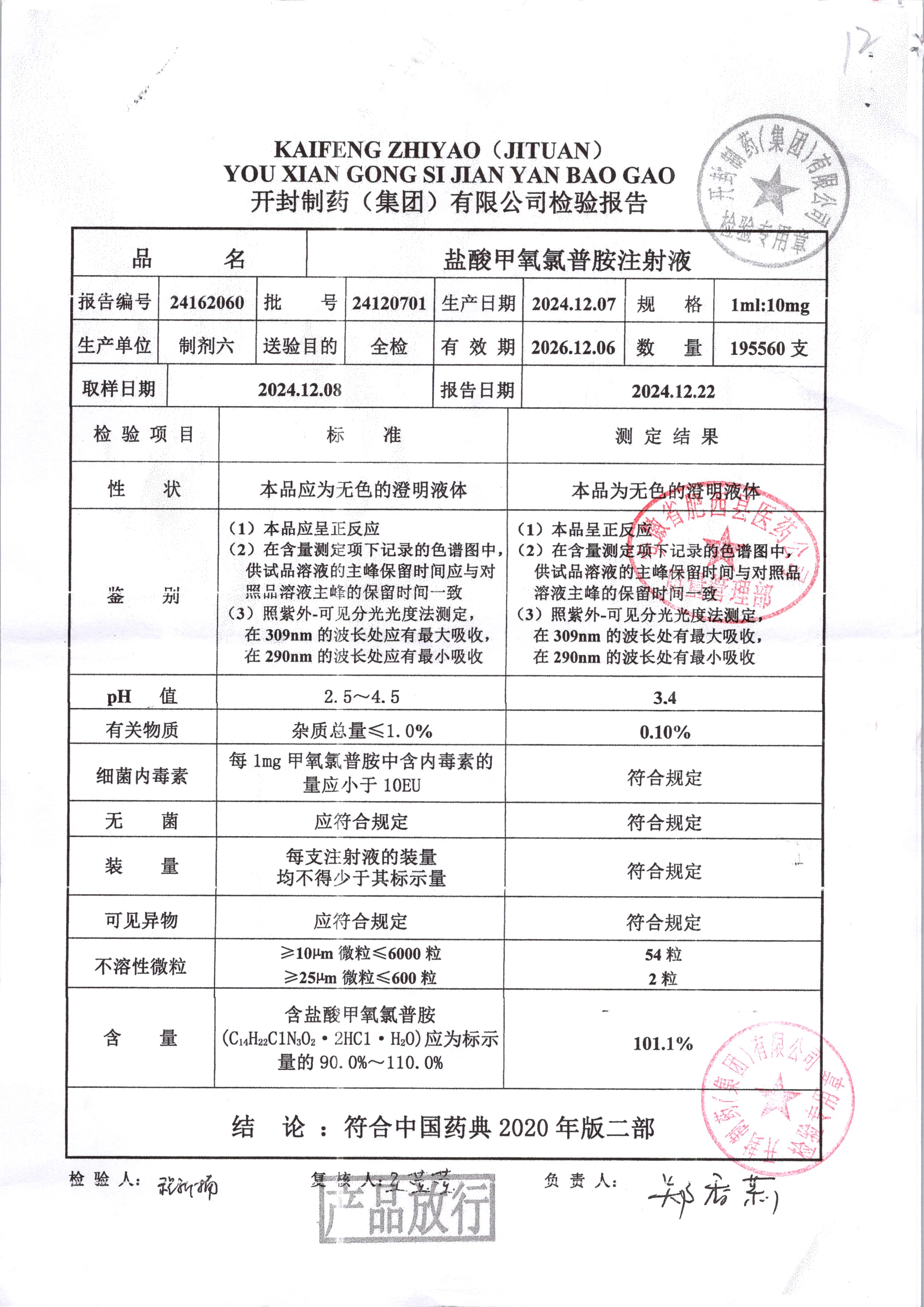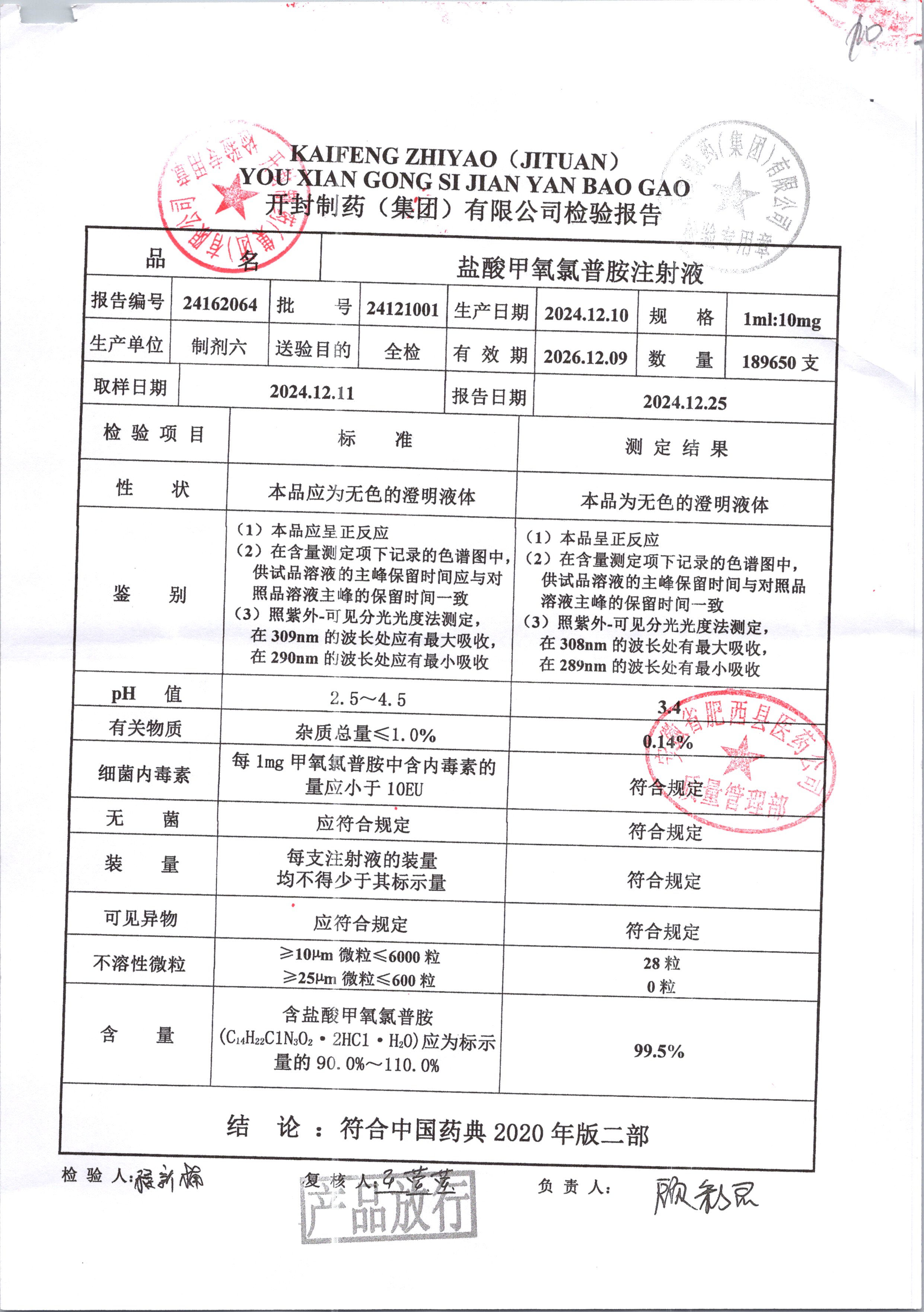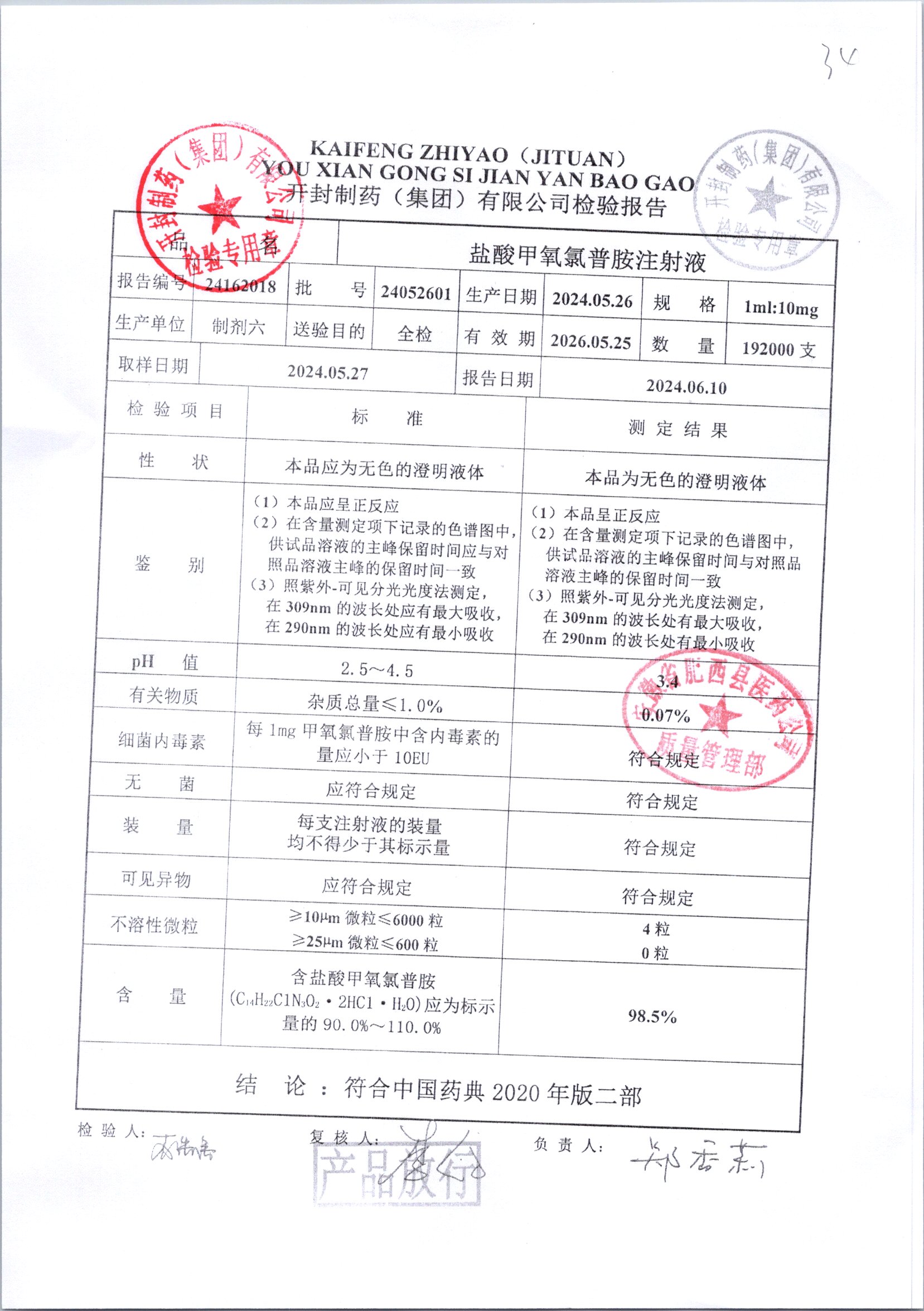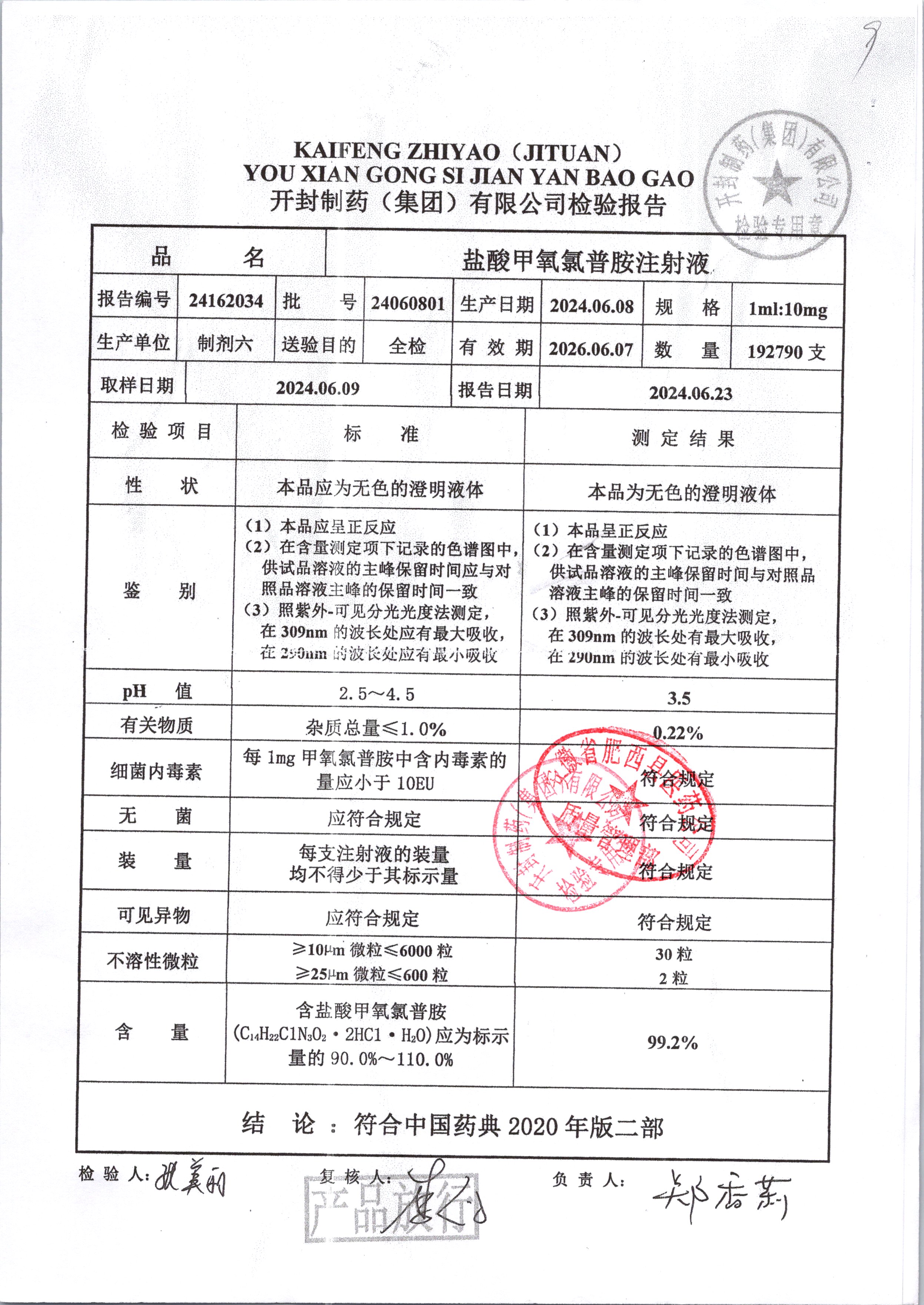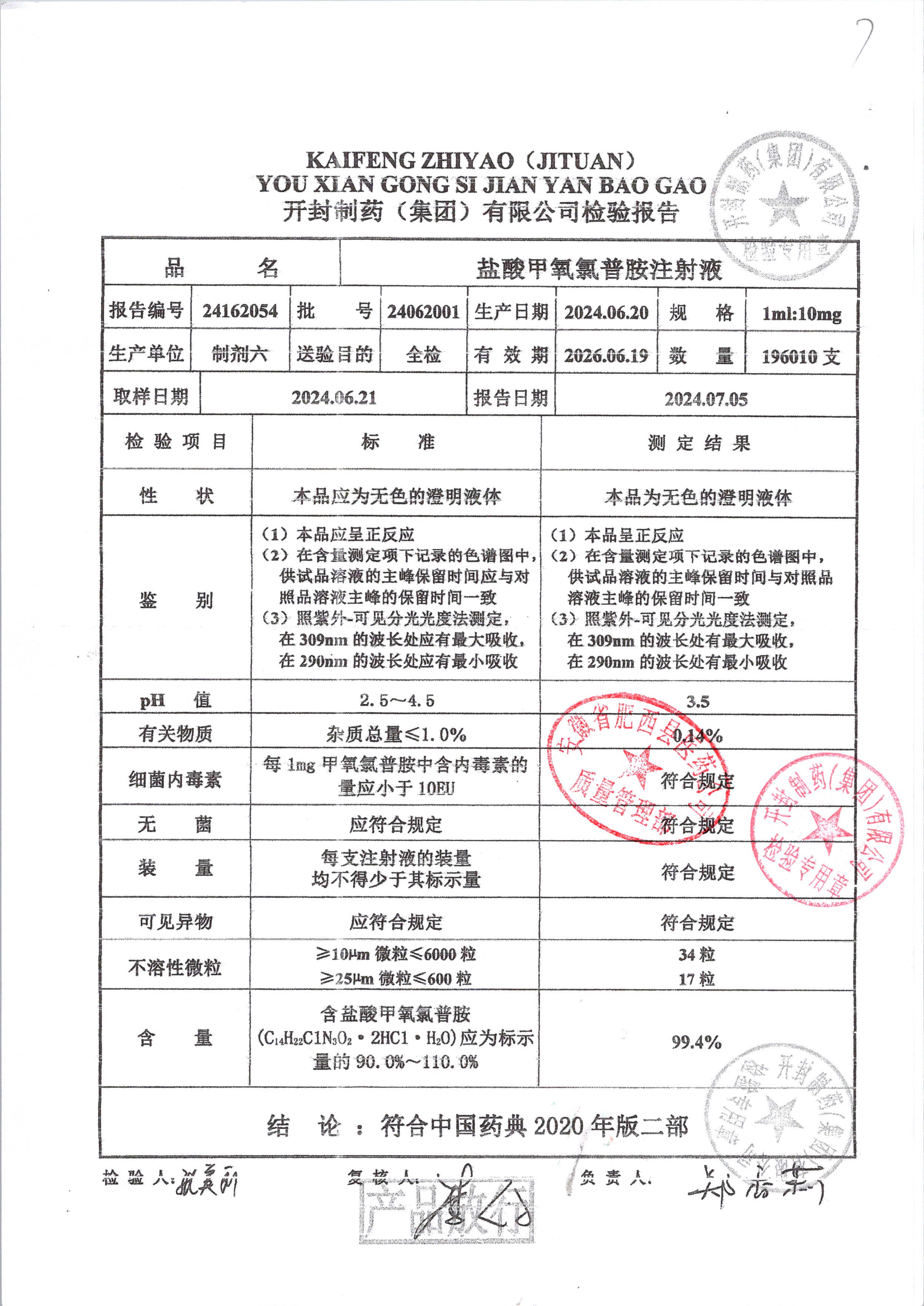 盐酸甲氧氯普胺注射液 | 1ml:10mg | 24062001 | 查看详情 |
