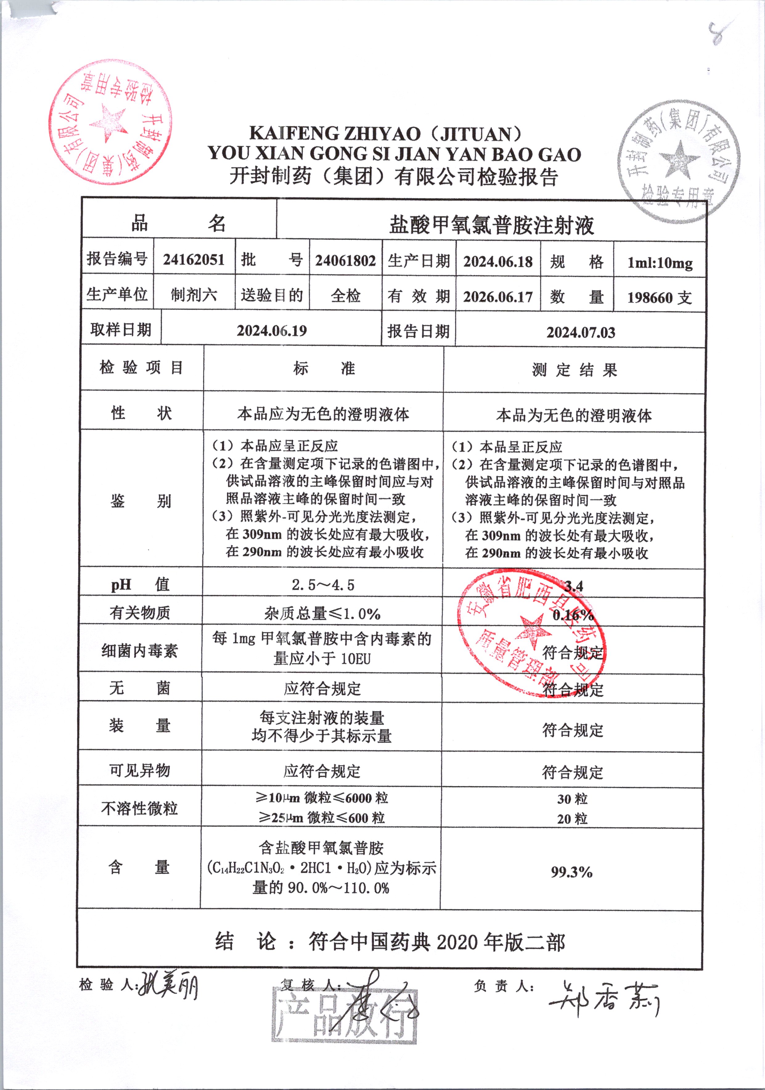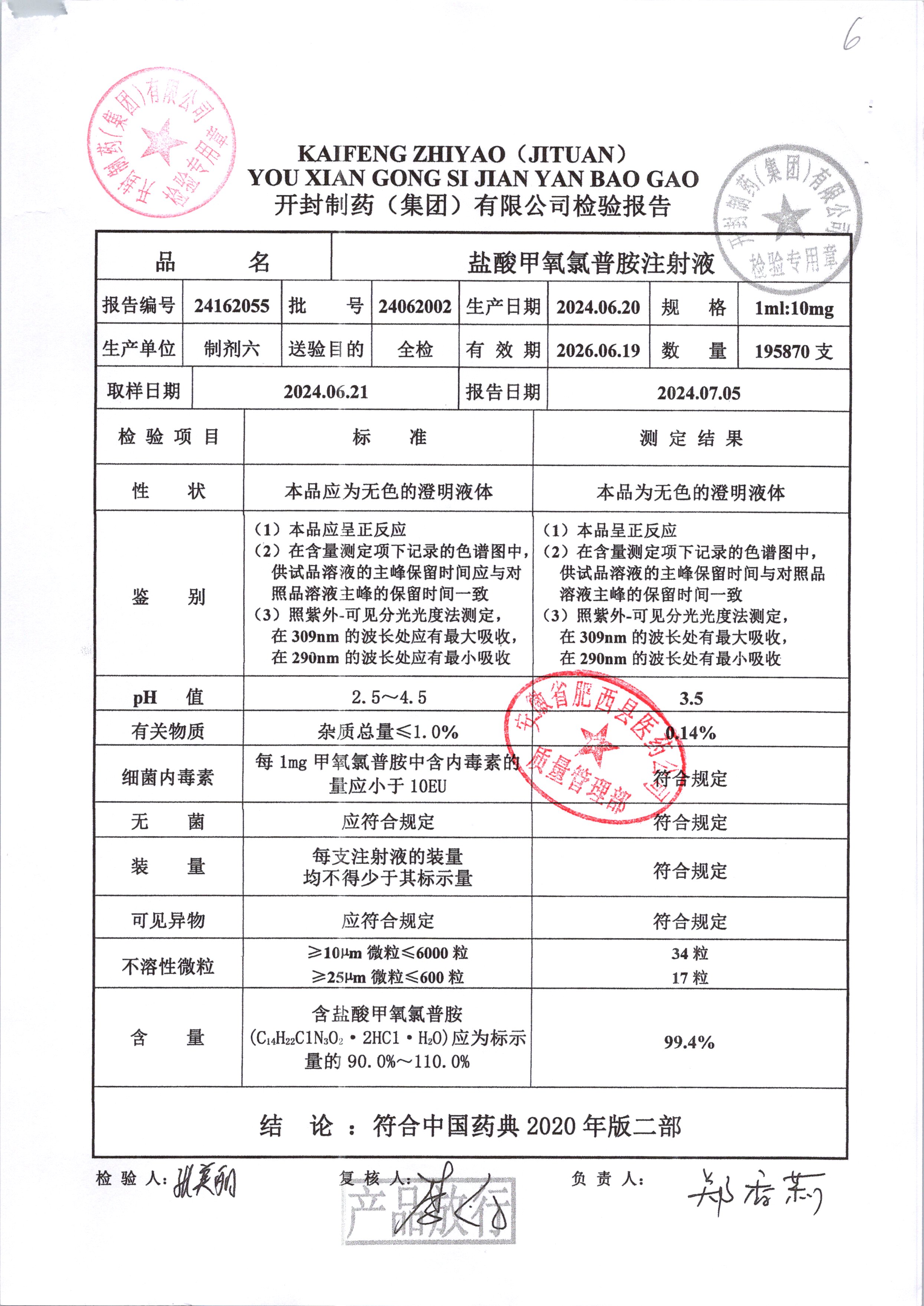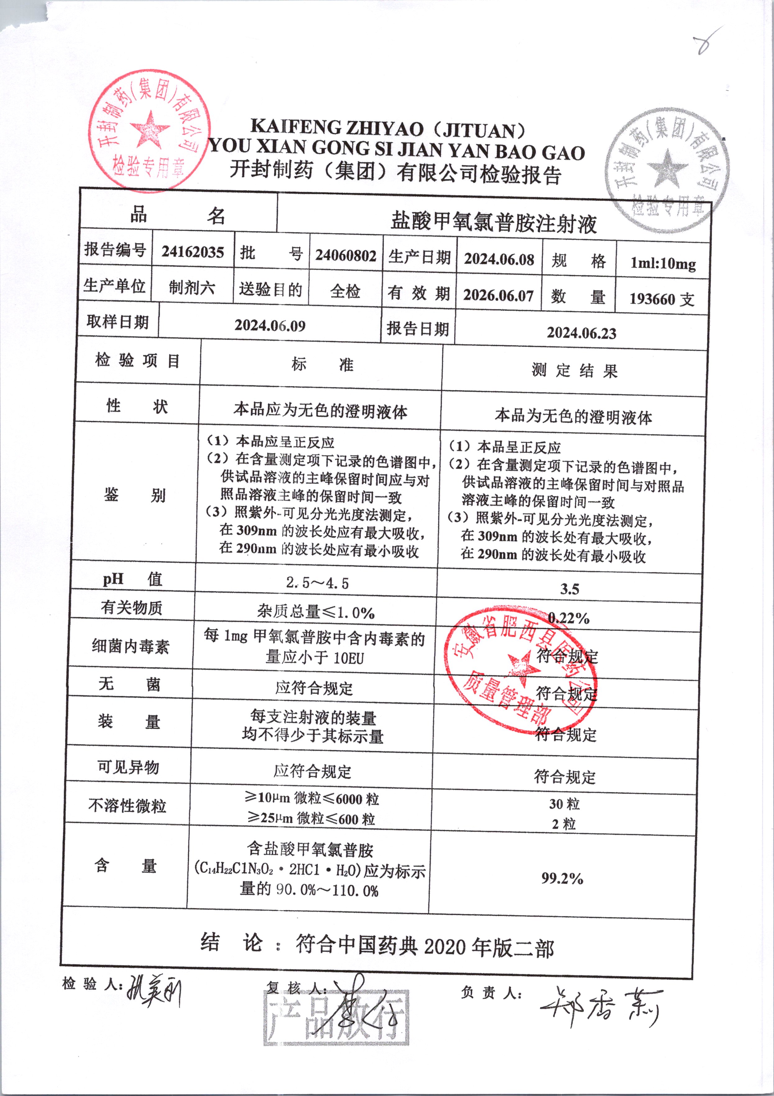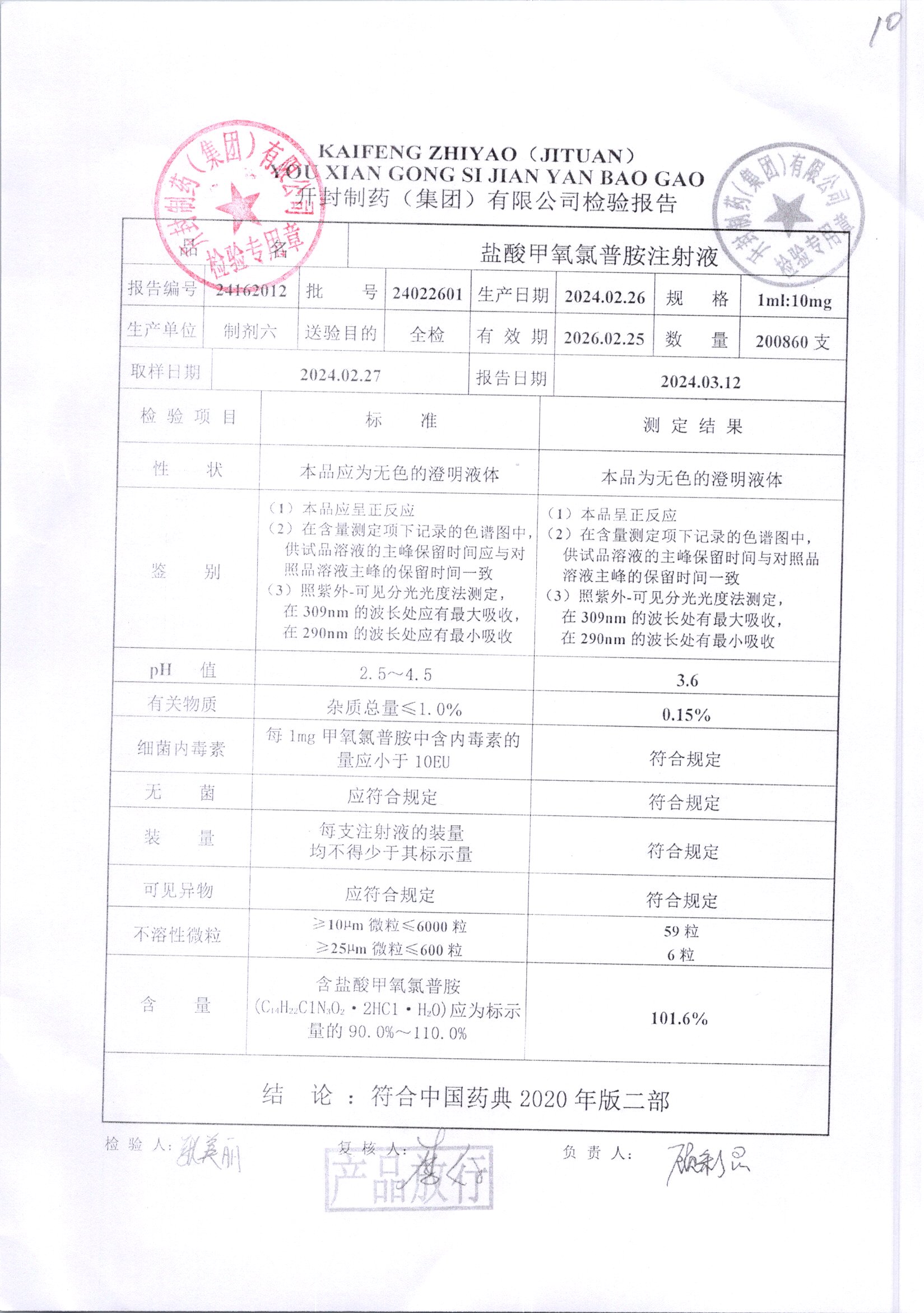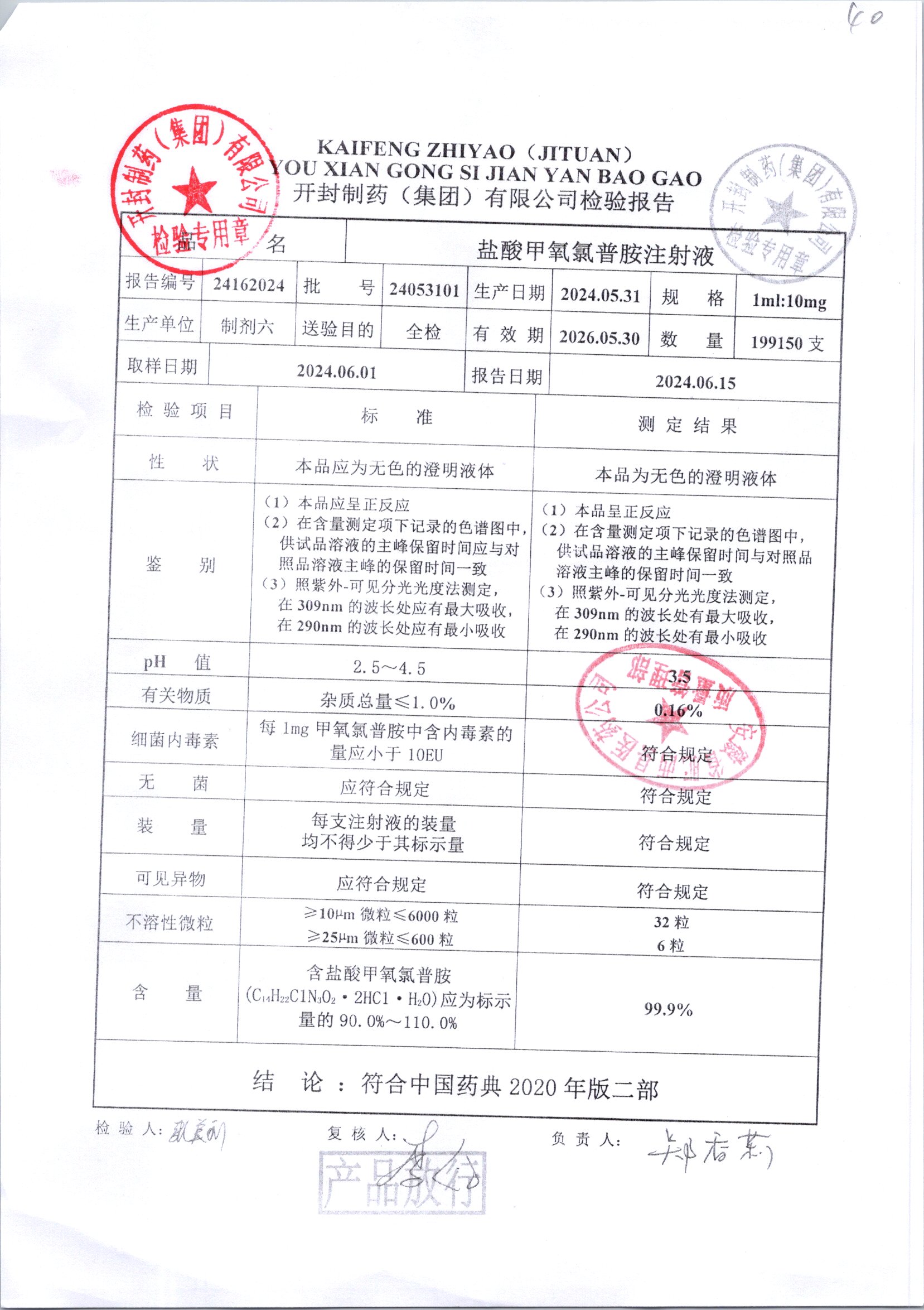 盐酸甲氧氯普胺注射液 | 1ml:10mg | 24062001 | 查看详情 |