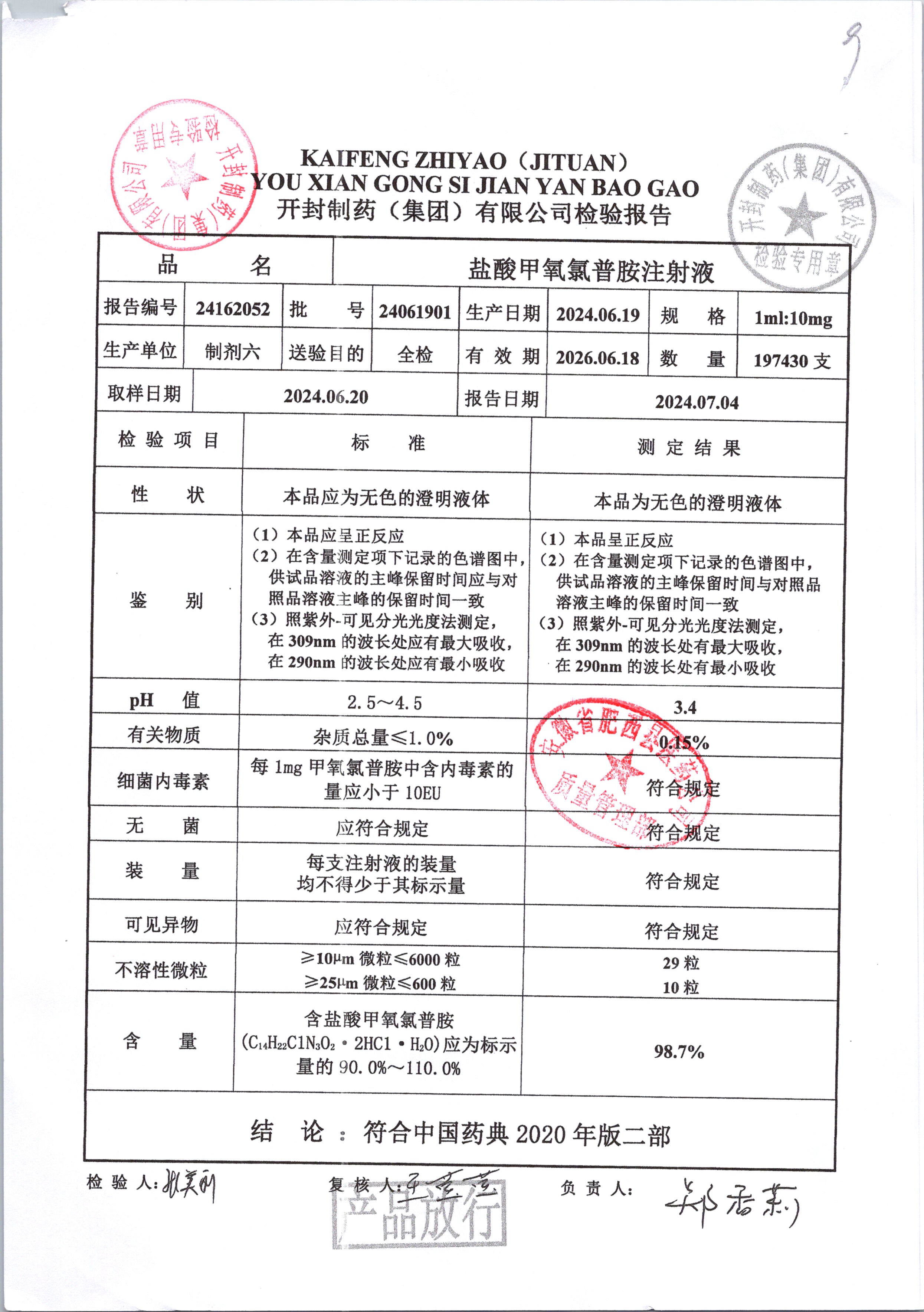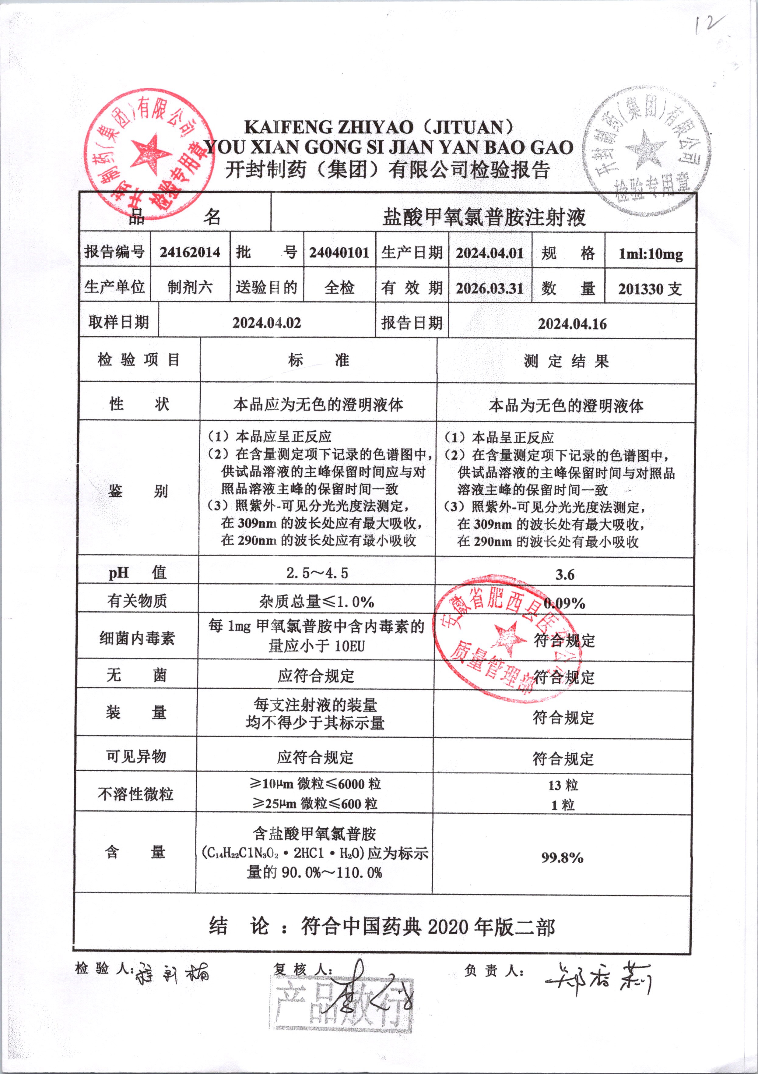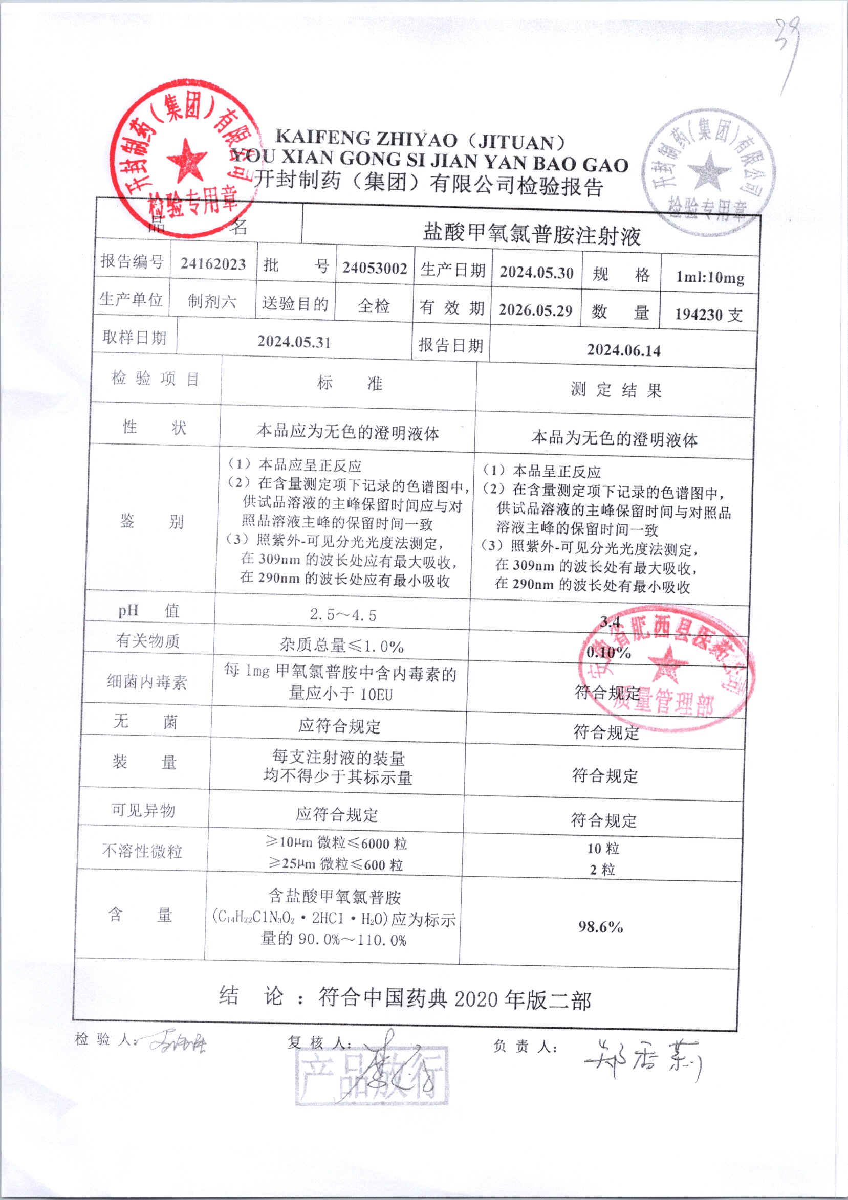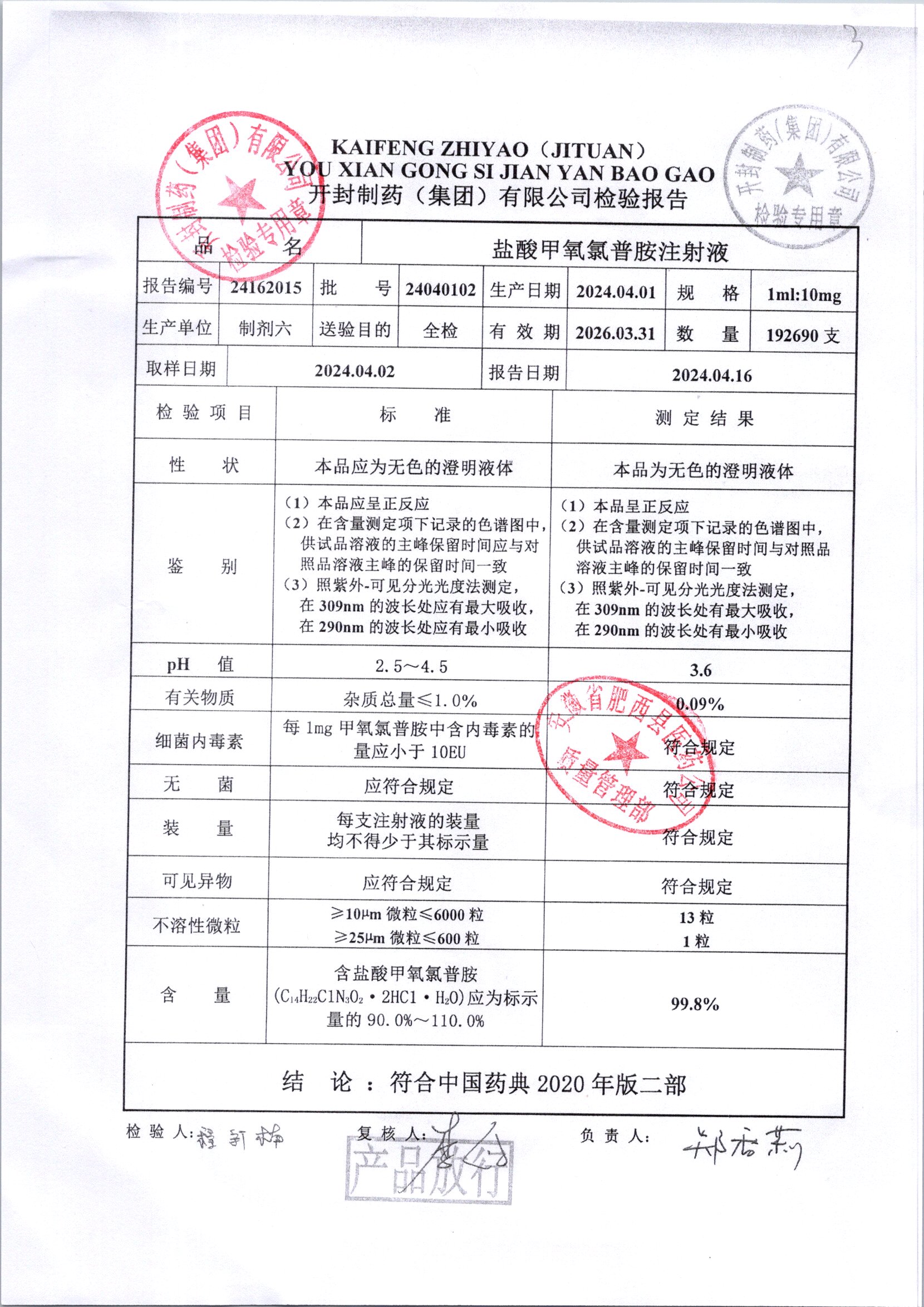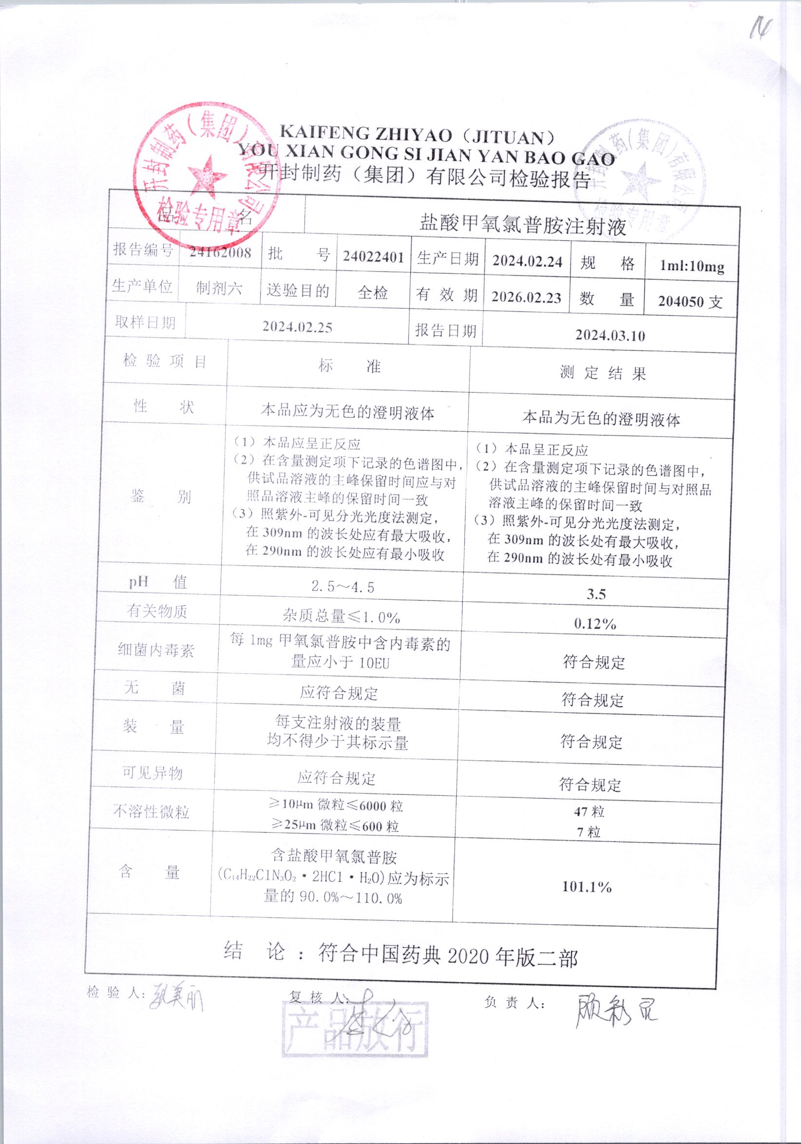 盐酸甲氧氯普胺注射液 | 1ml:10mg | 24062001 | 查看详情 |