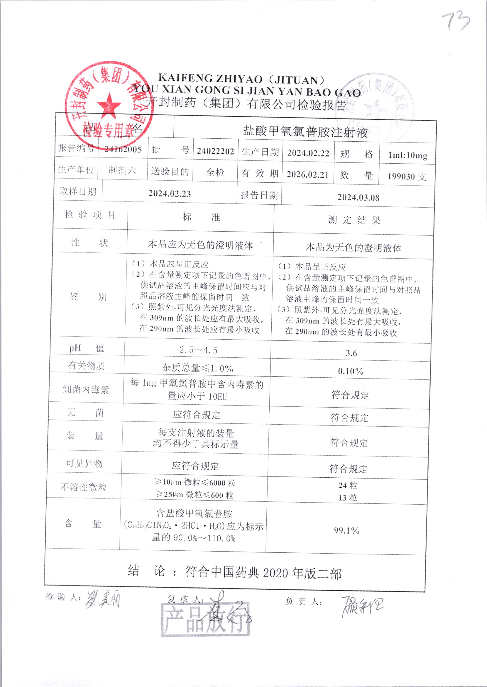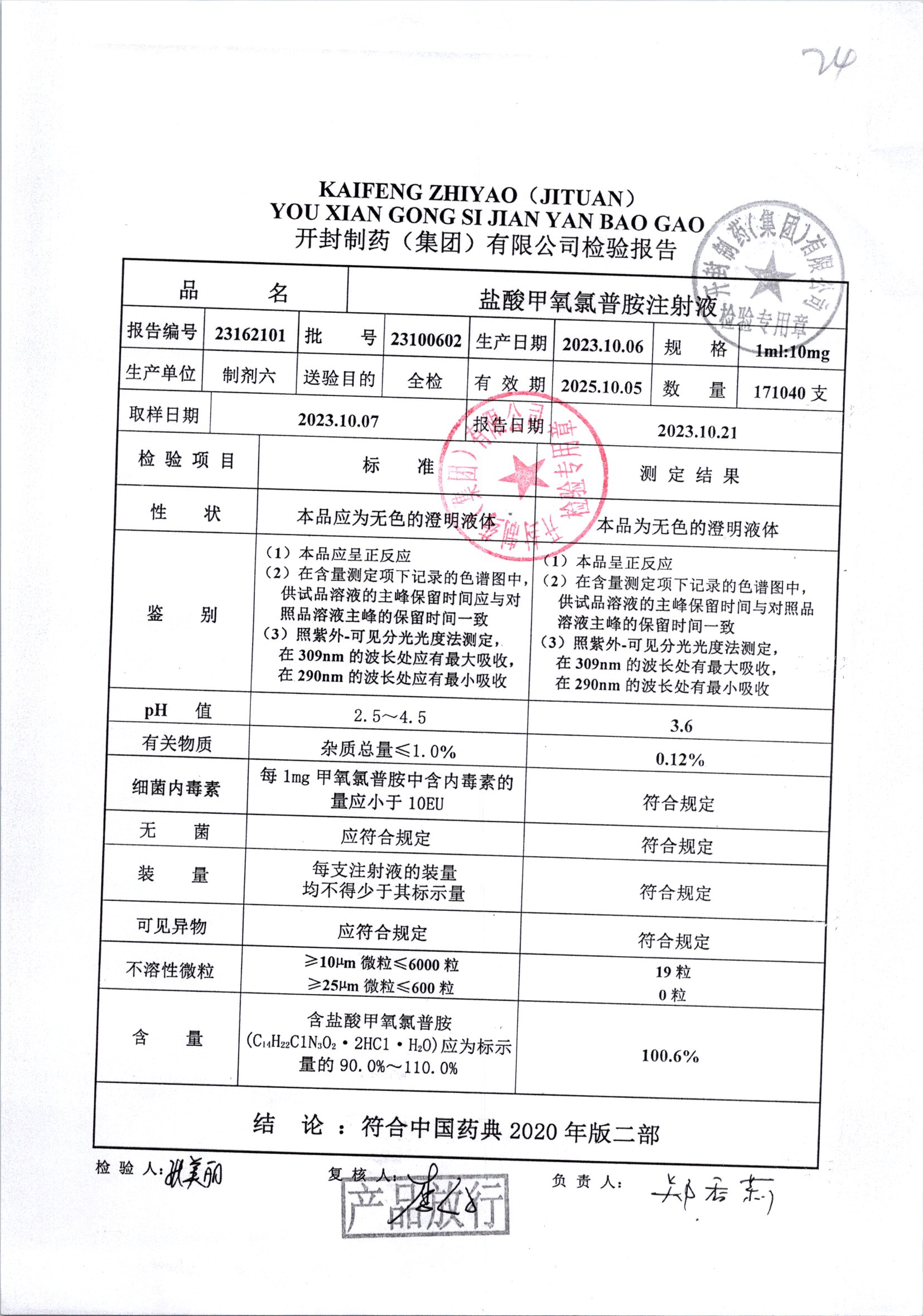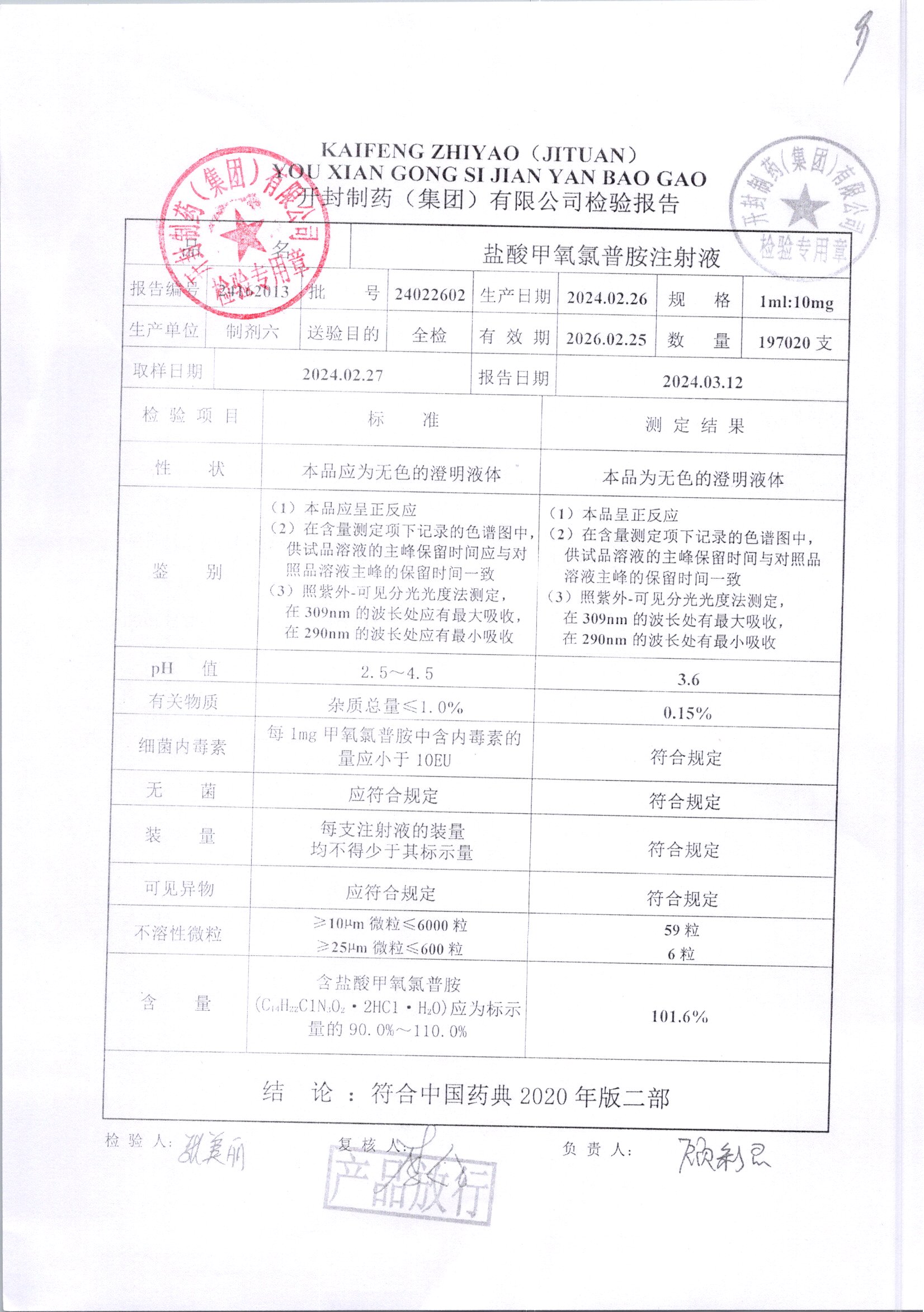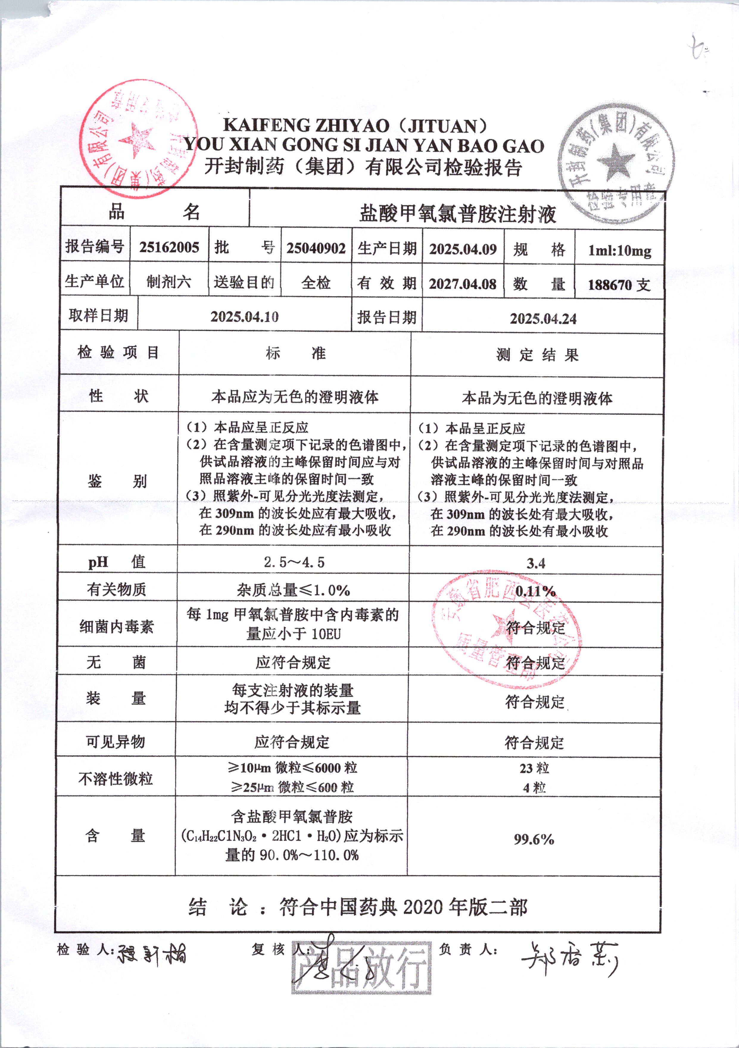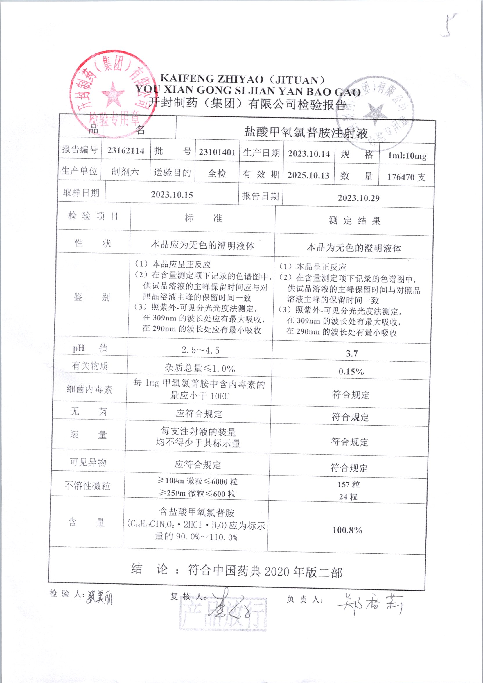 盐酸甲氧氯普胺注射液 | 1ml:10mg | 24062001 | 查看详情 |