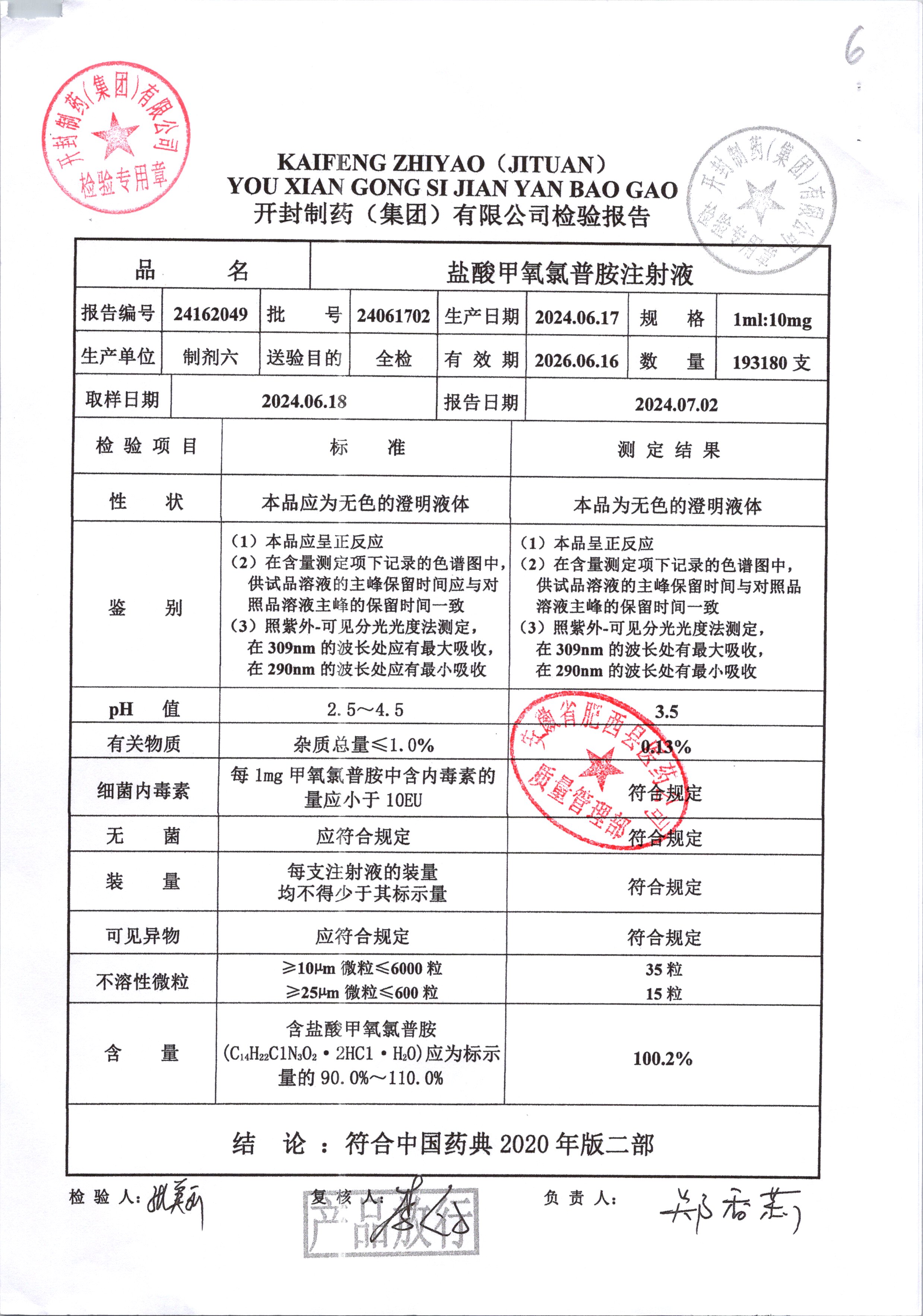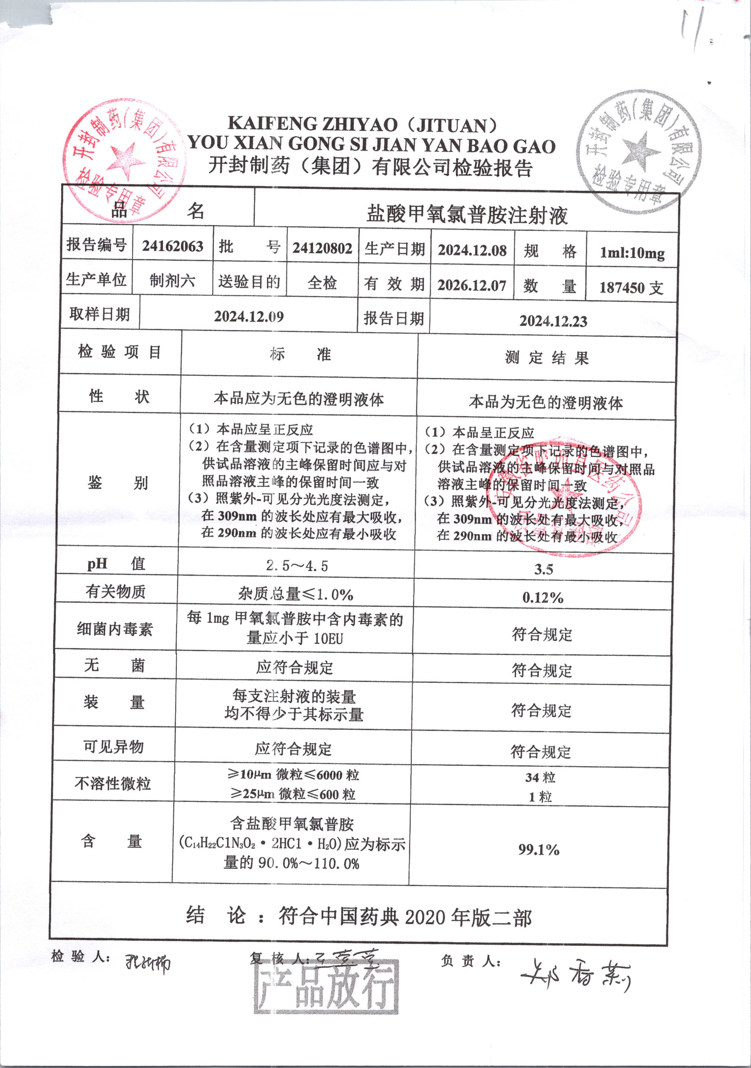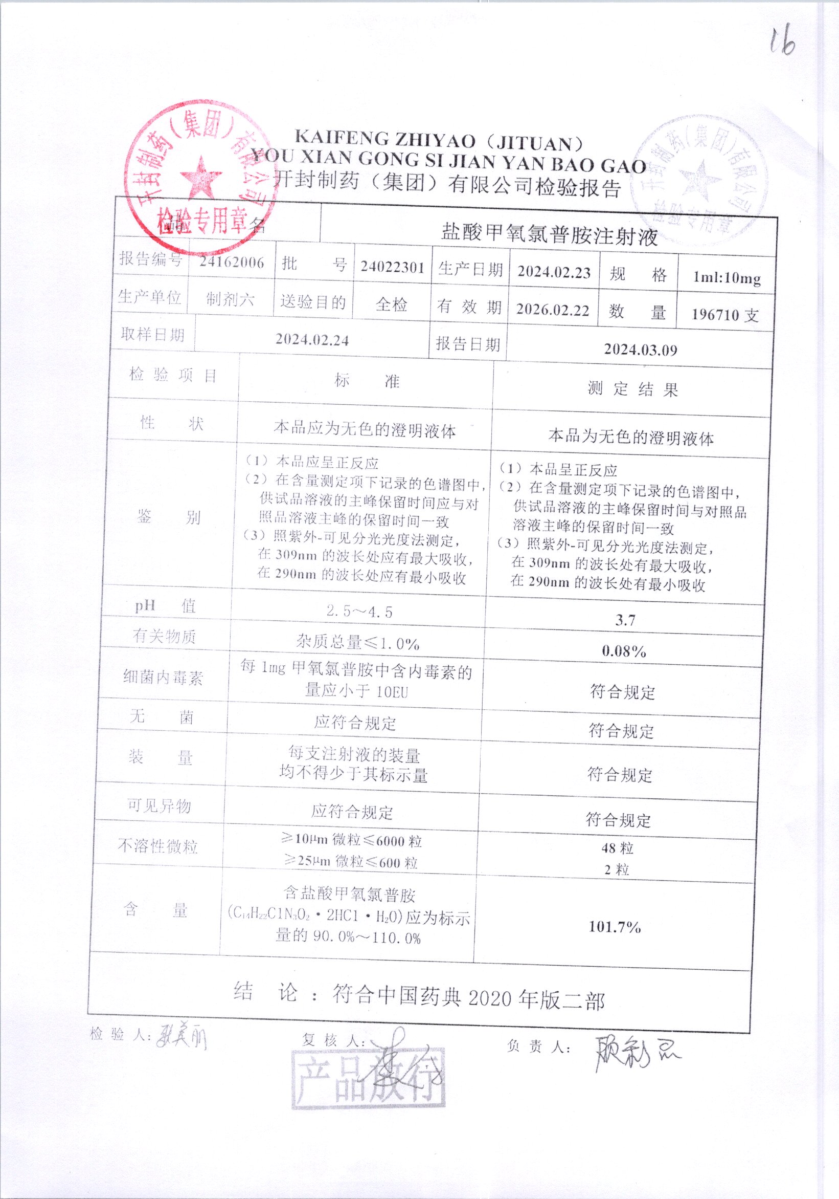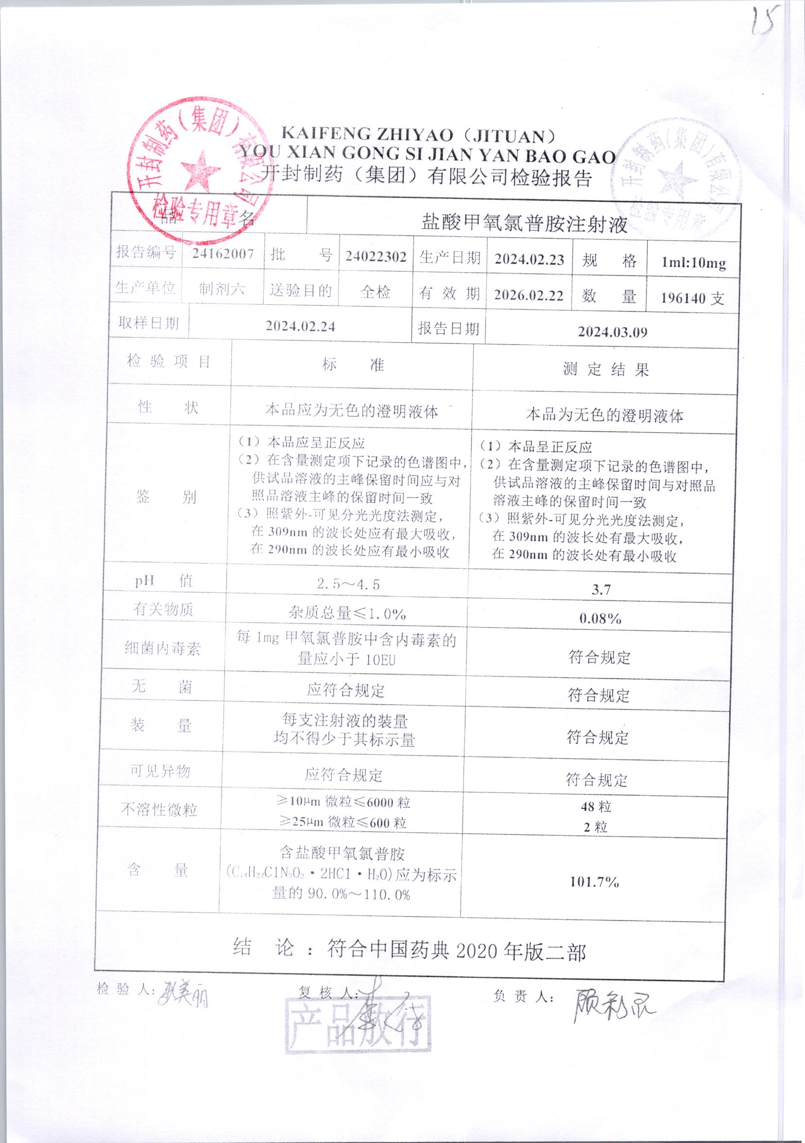 盐酸甲氧氯普胺注射液 | 1ml:10mg | 24062001 | 查看详情 |
