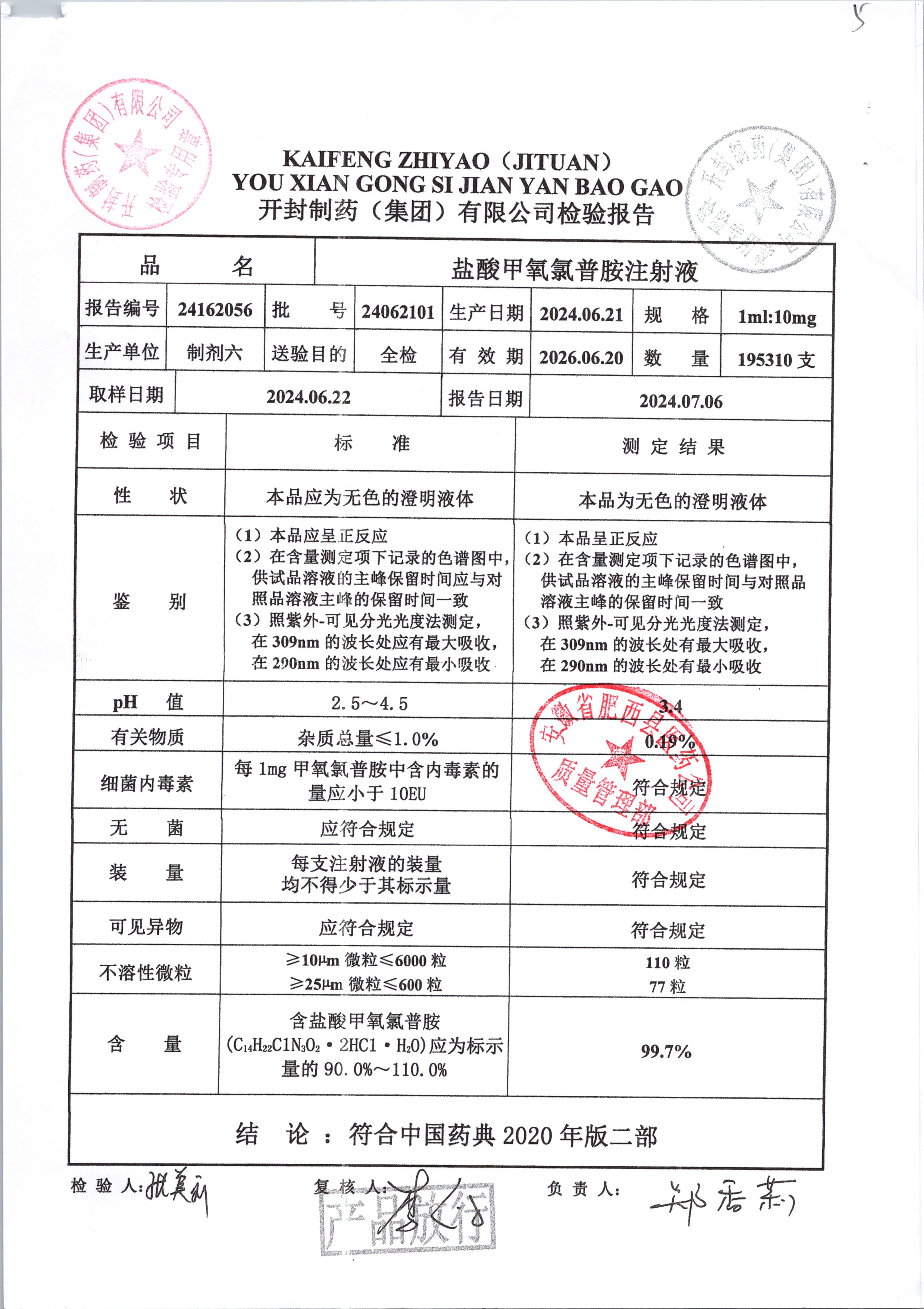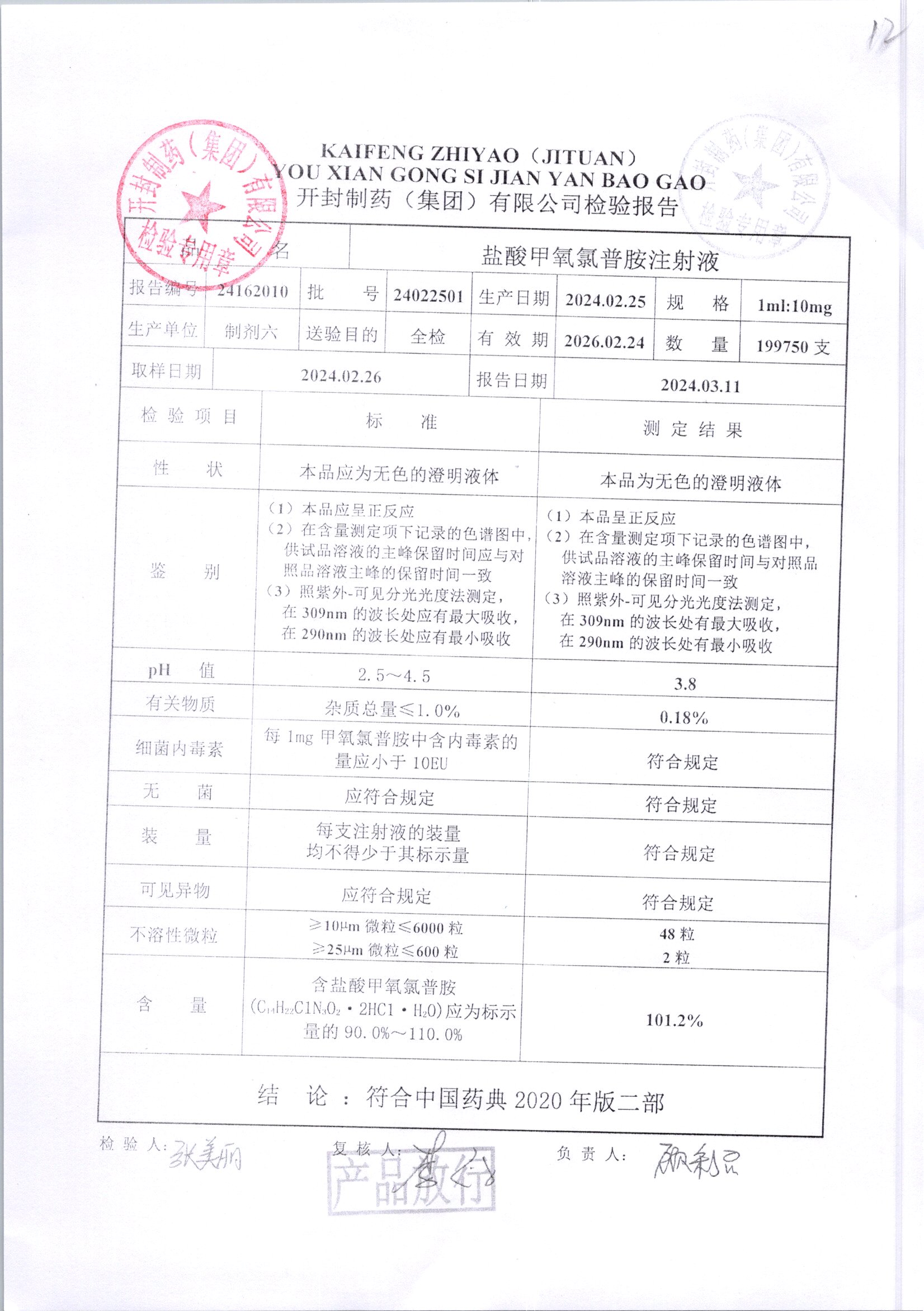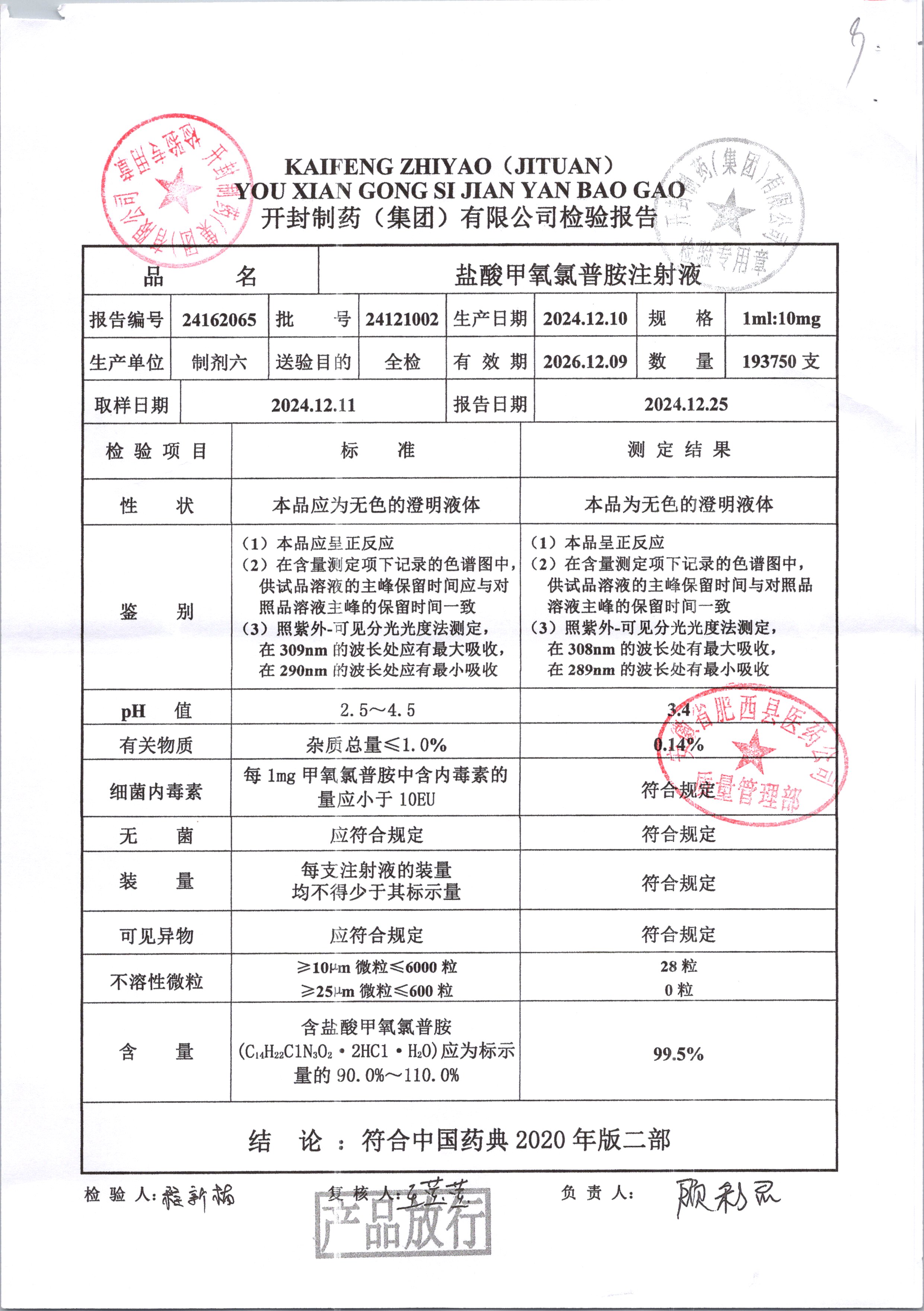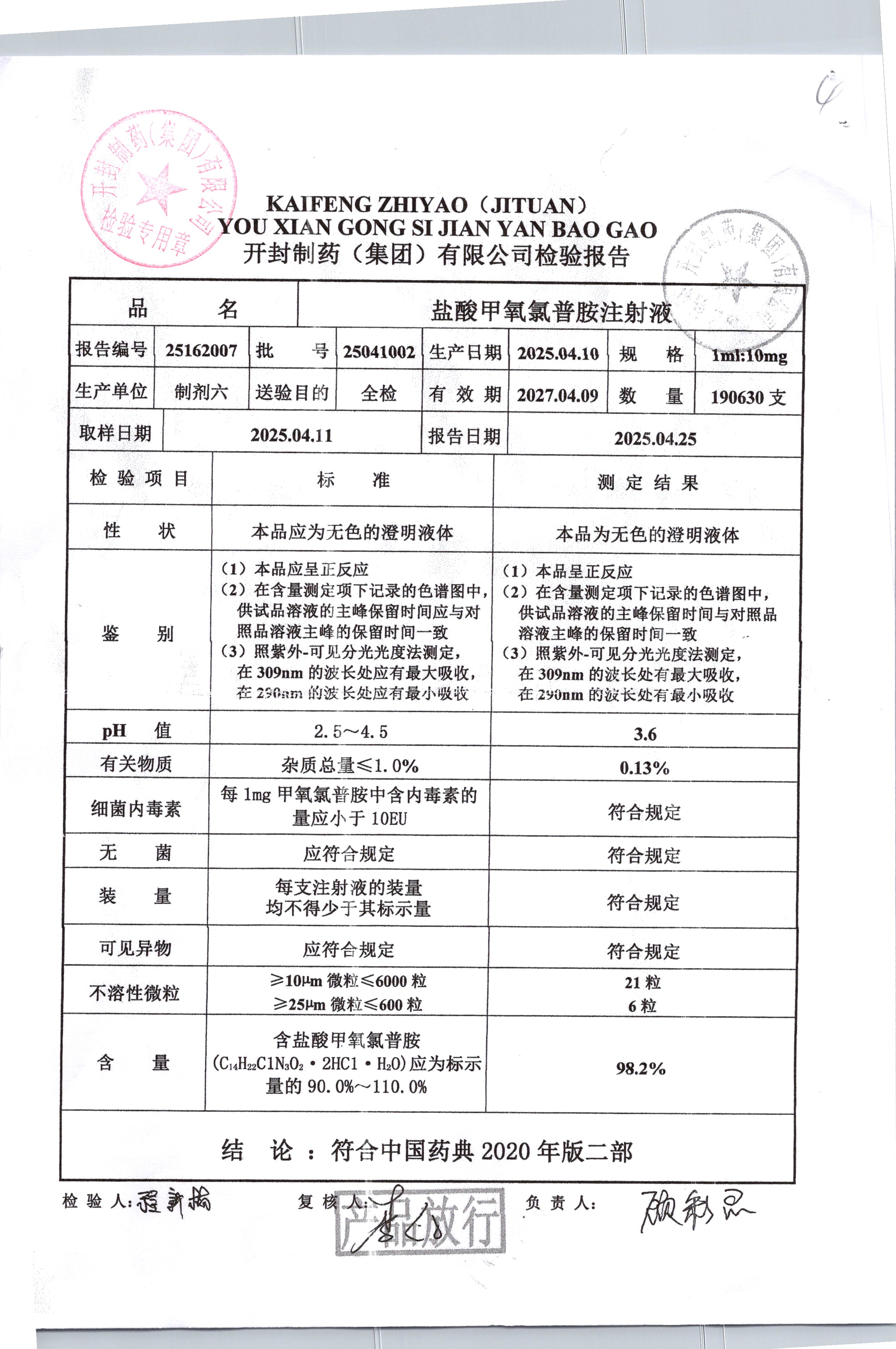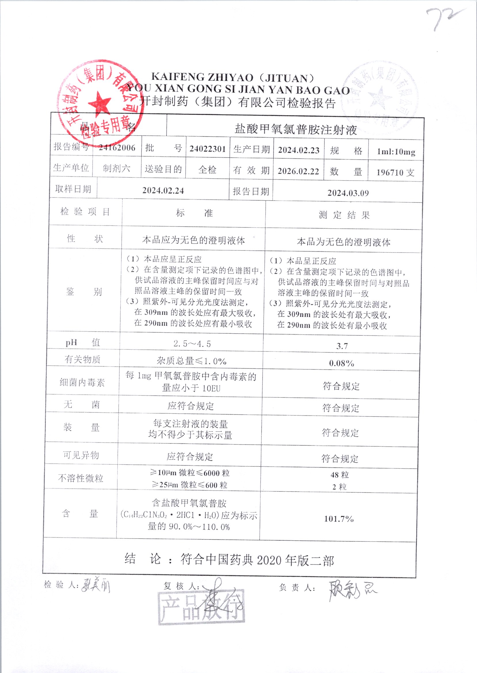 盐酸甲氧氯普胺注射液 | 1ml:10mg | 24062001 | 查看详情 |