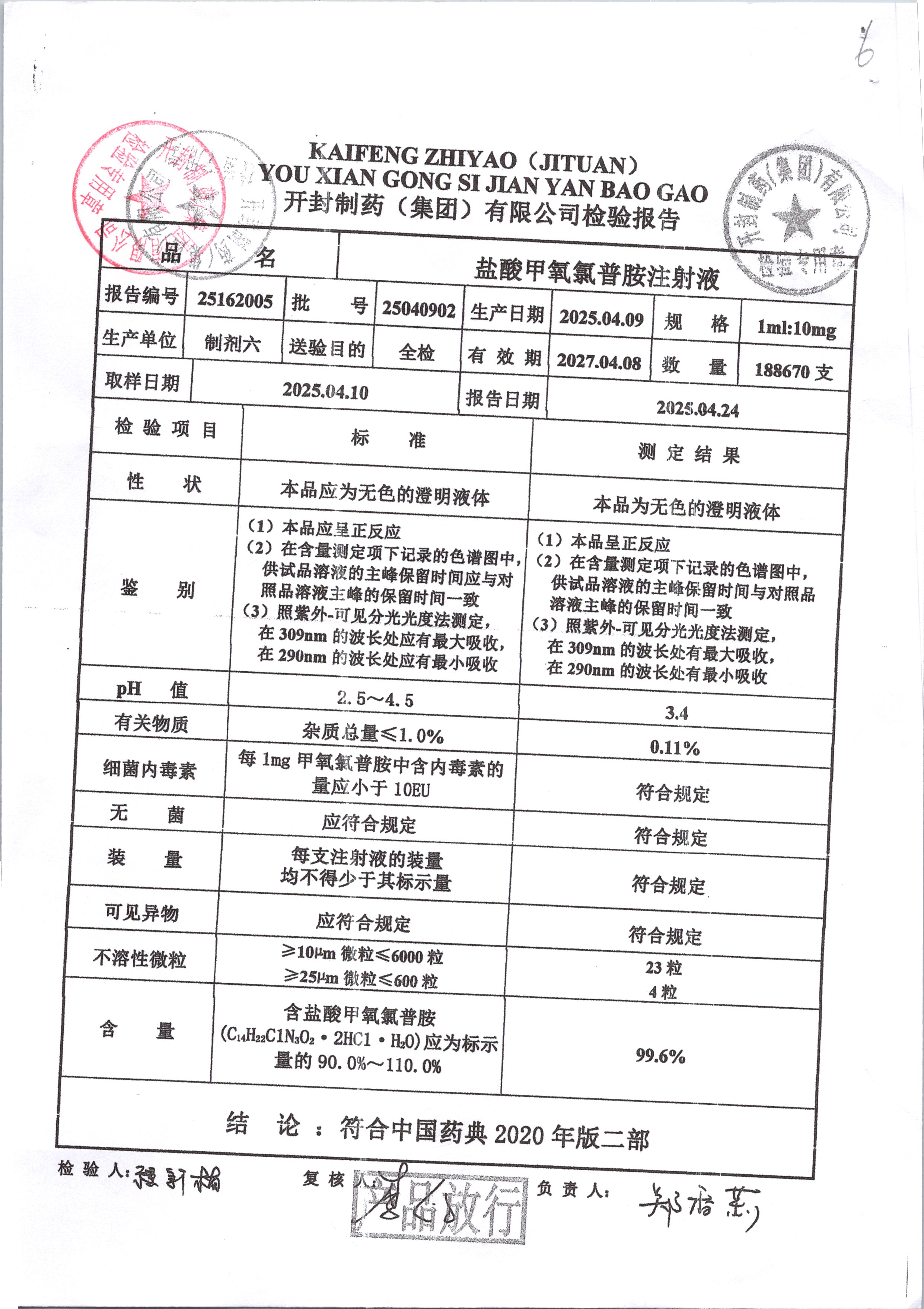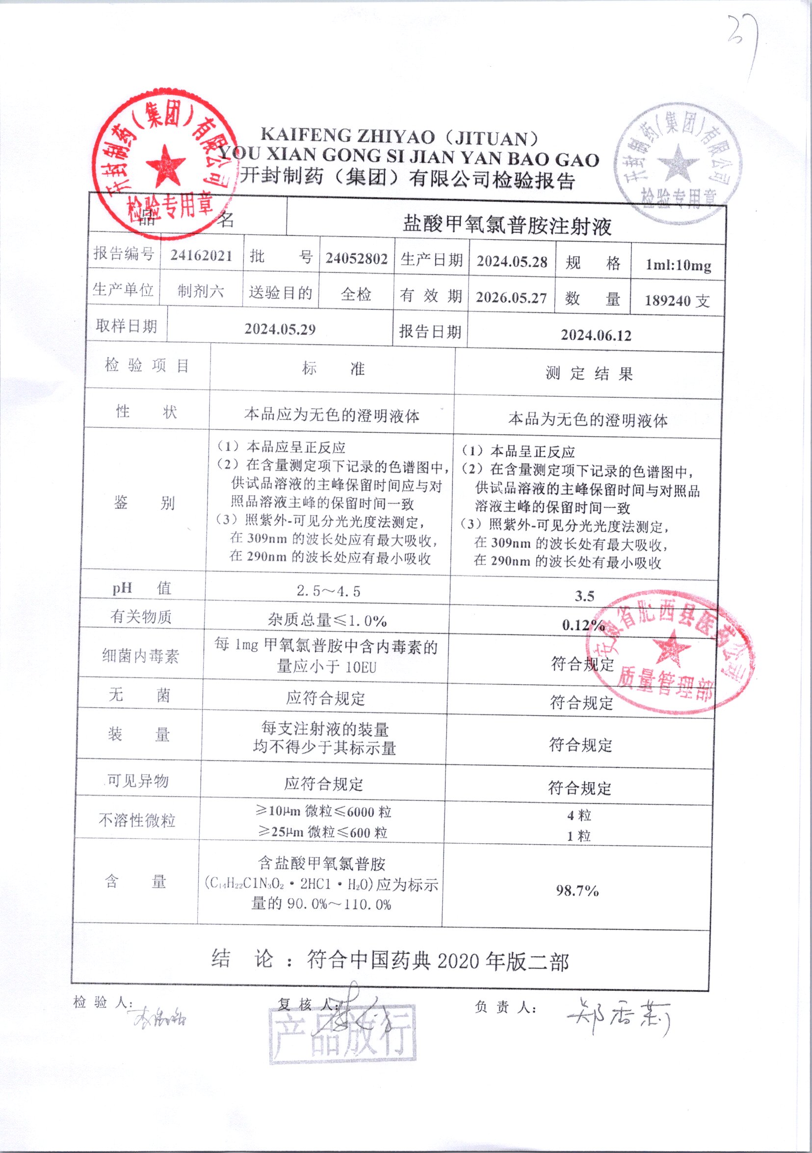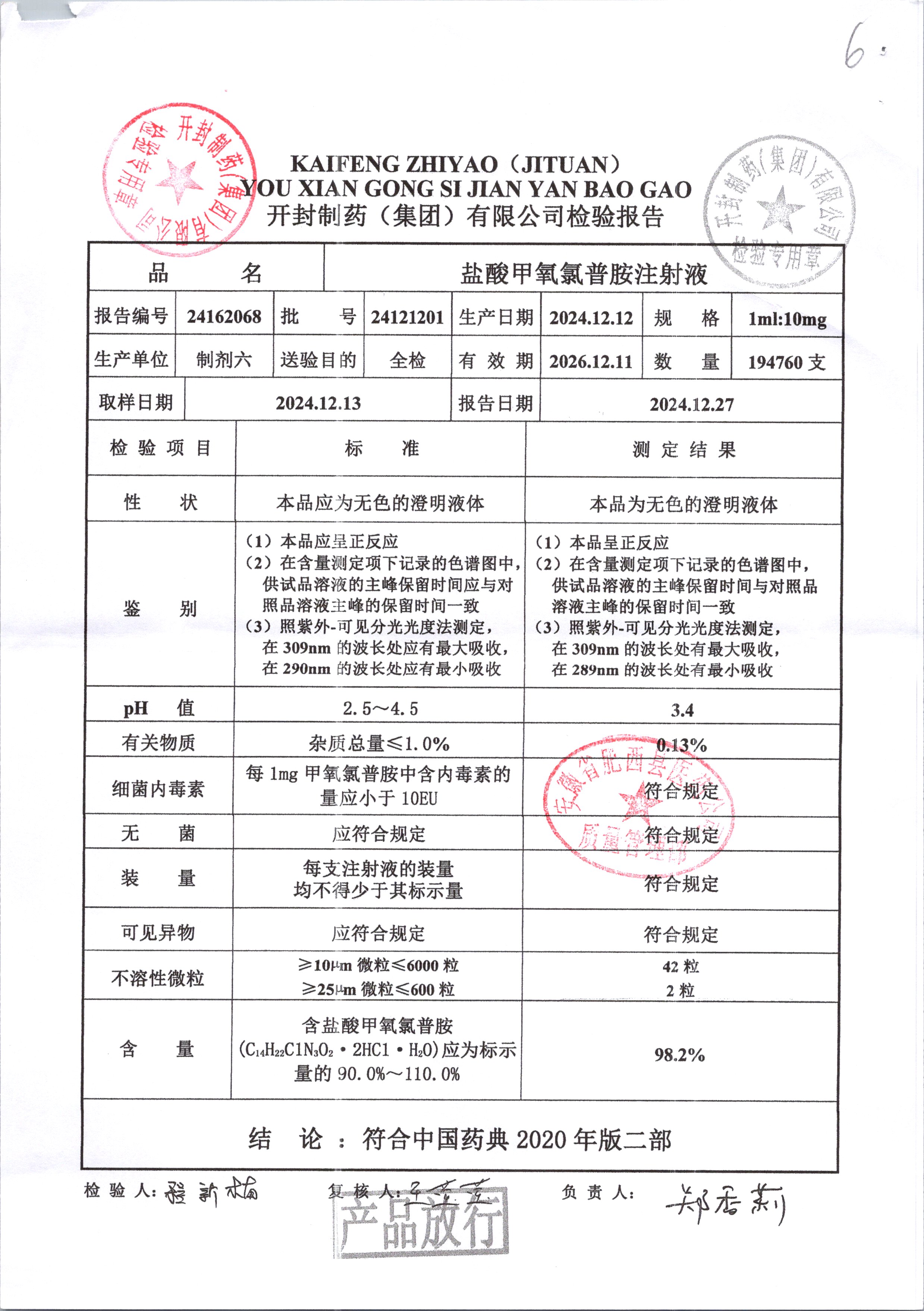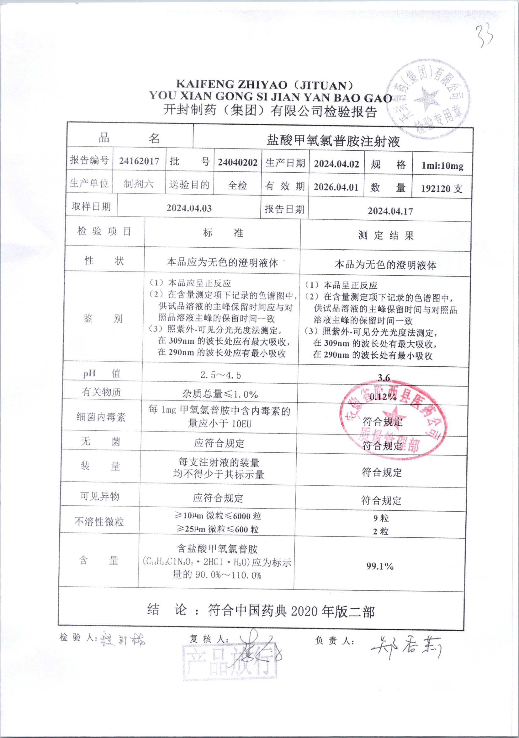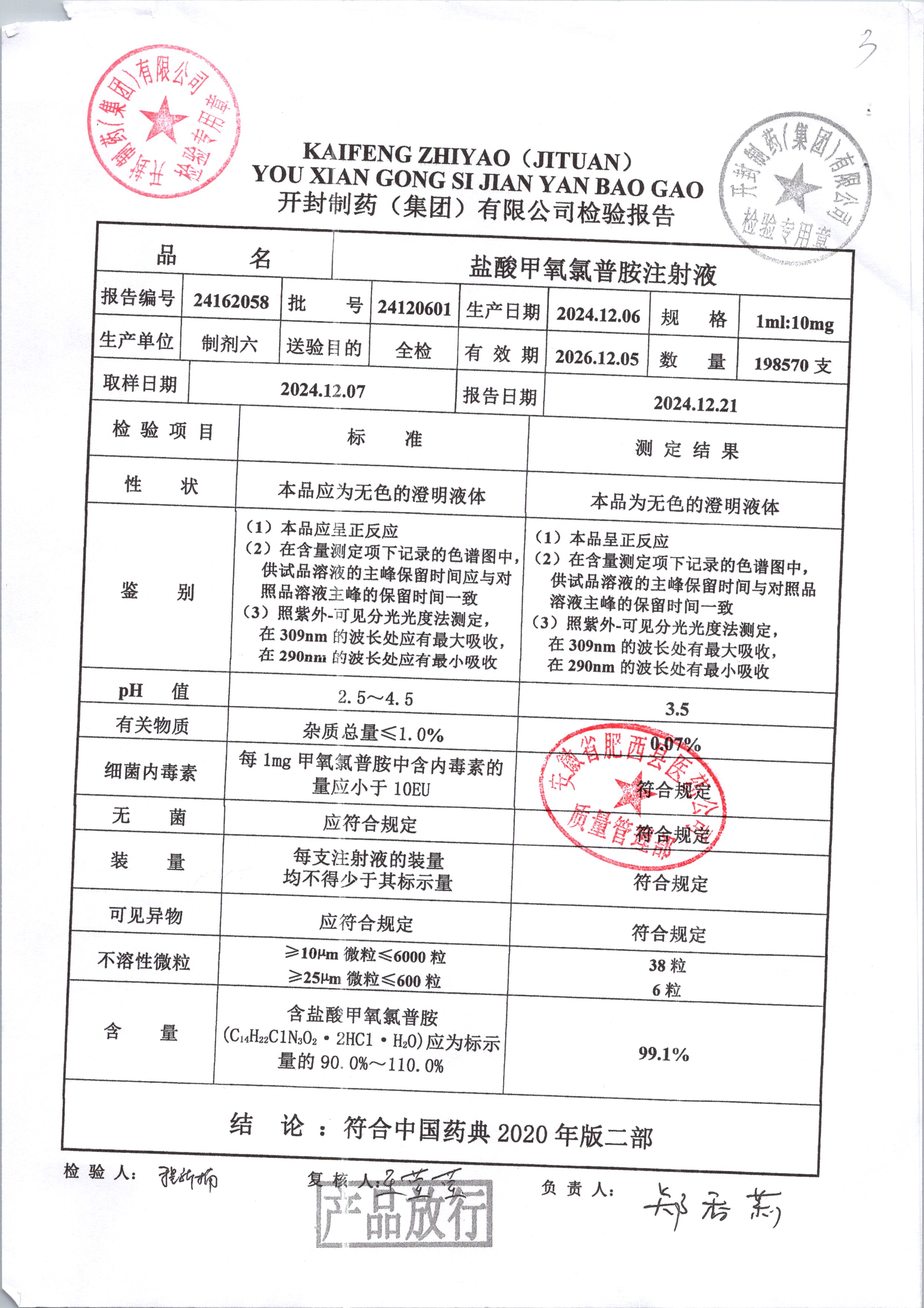 盐酸甲氧氯普胺注射液 | 1ml:10mg | 24062001 | 查看详情 |