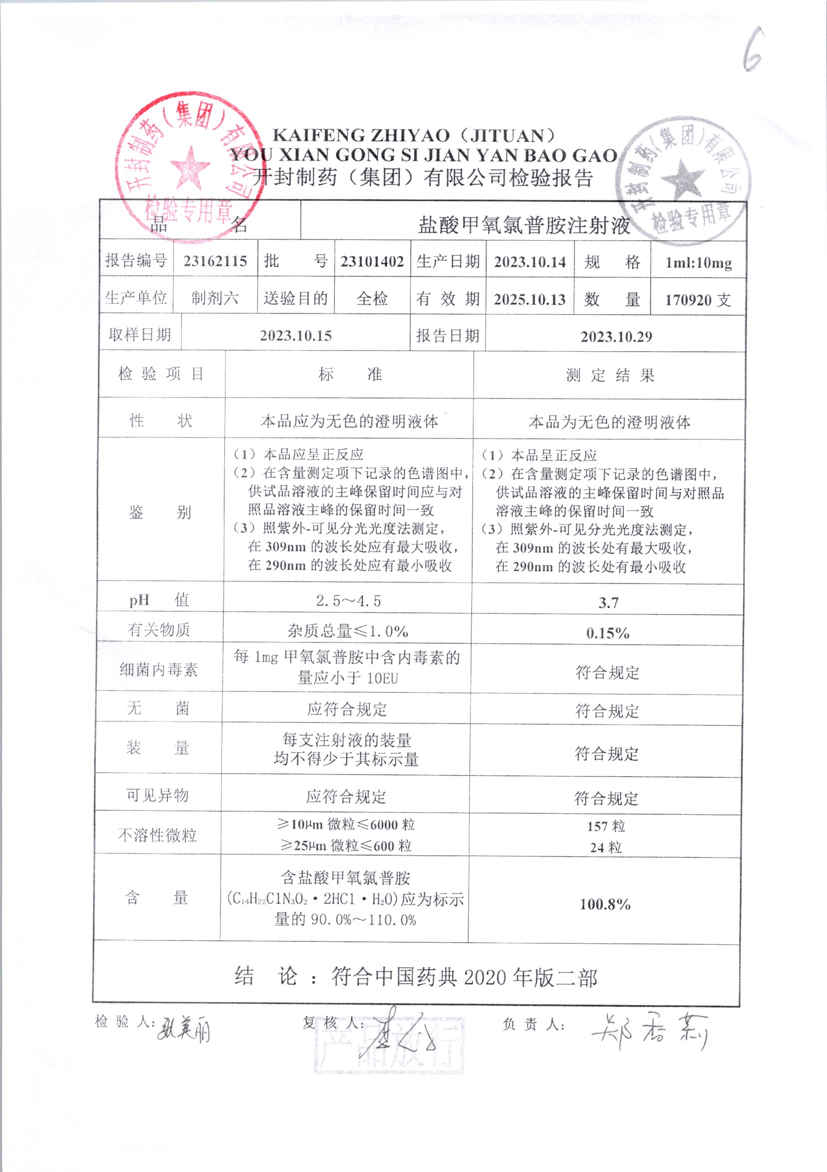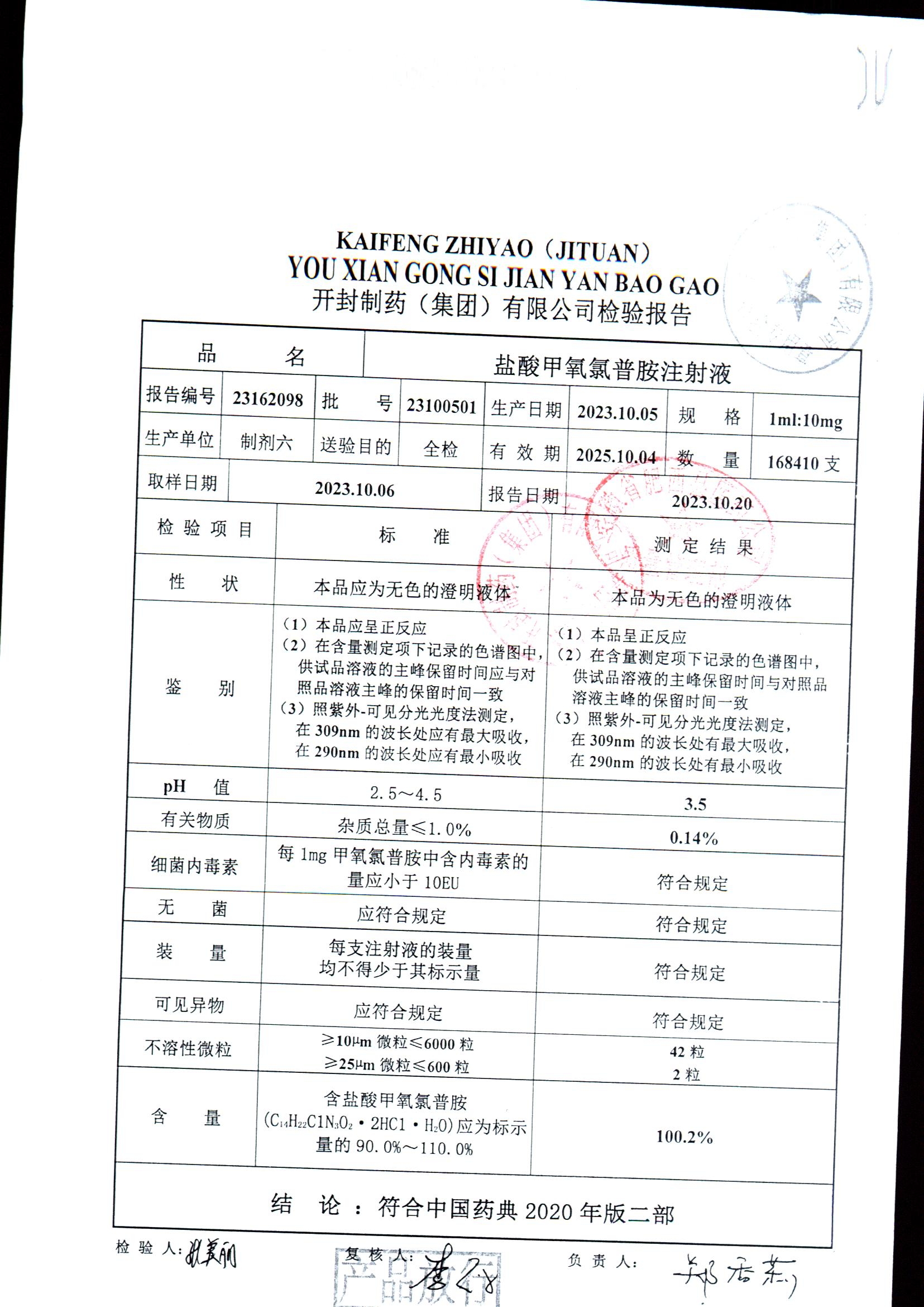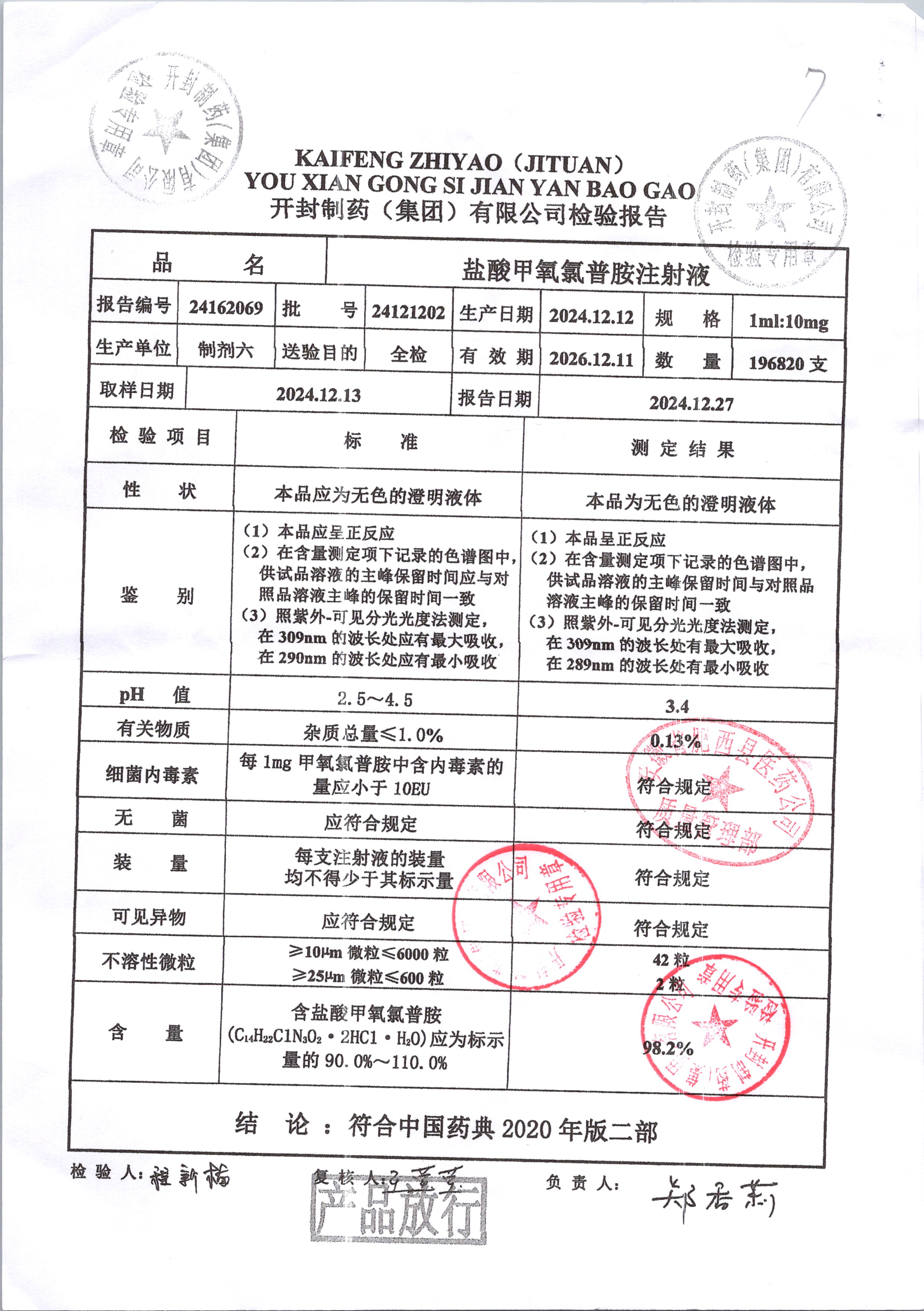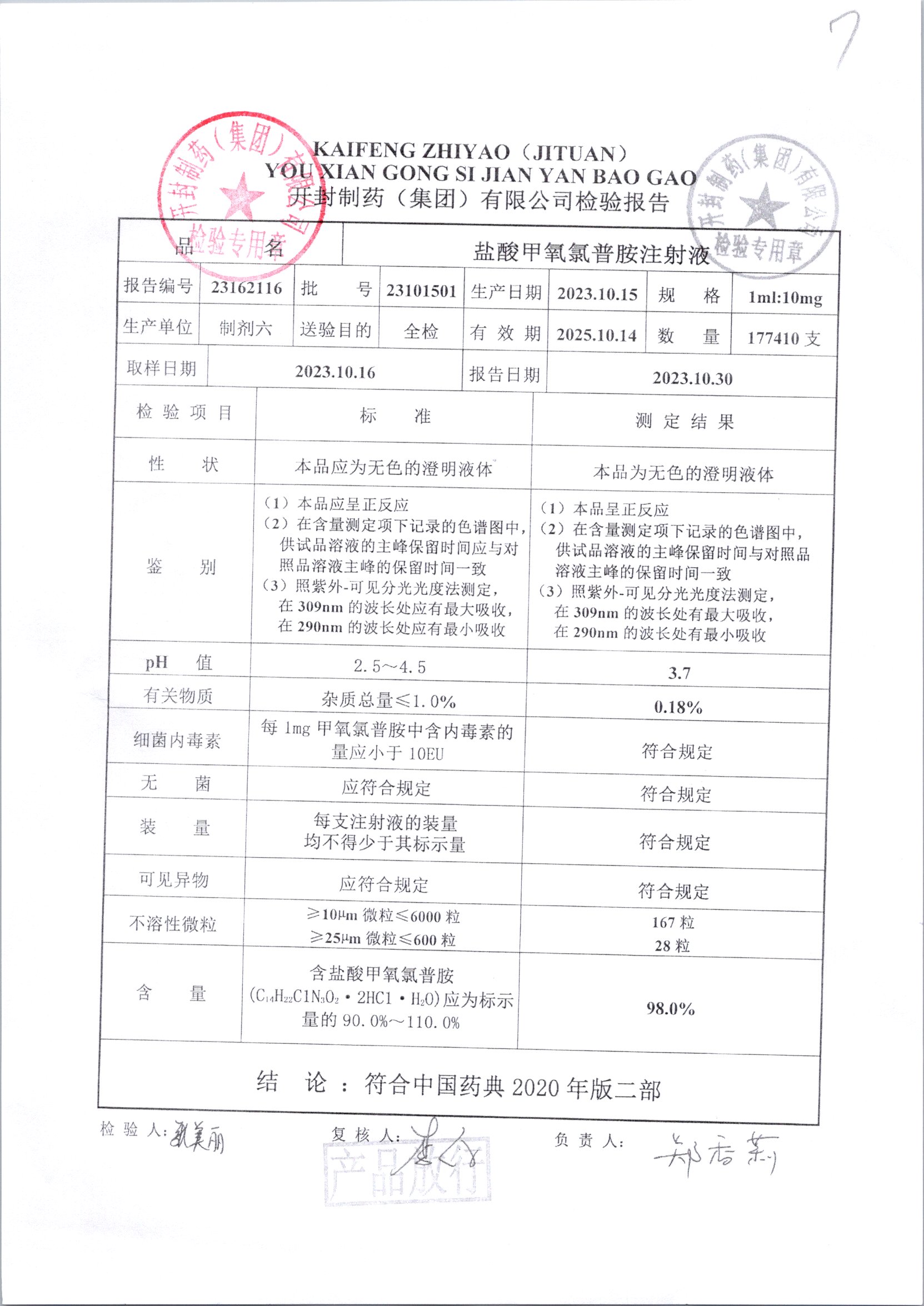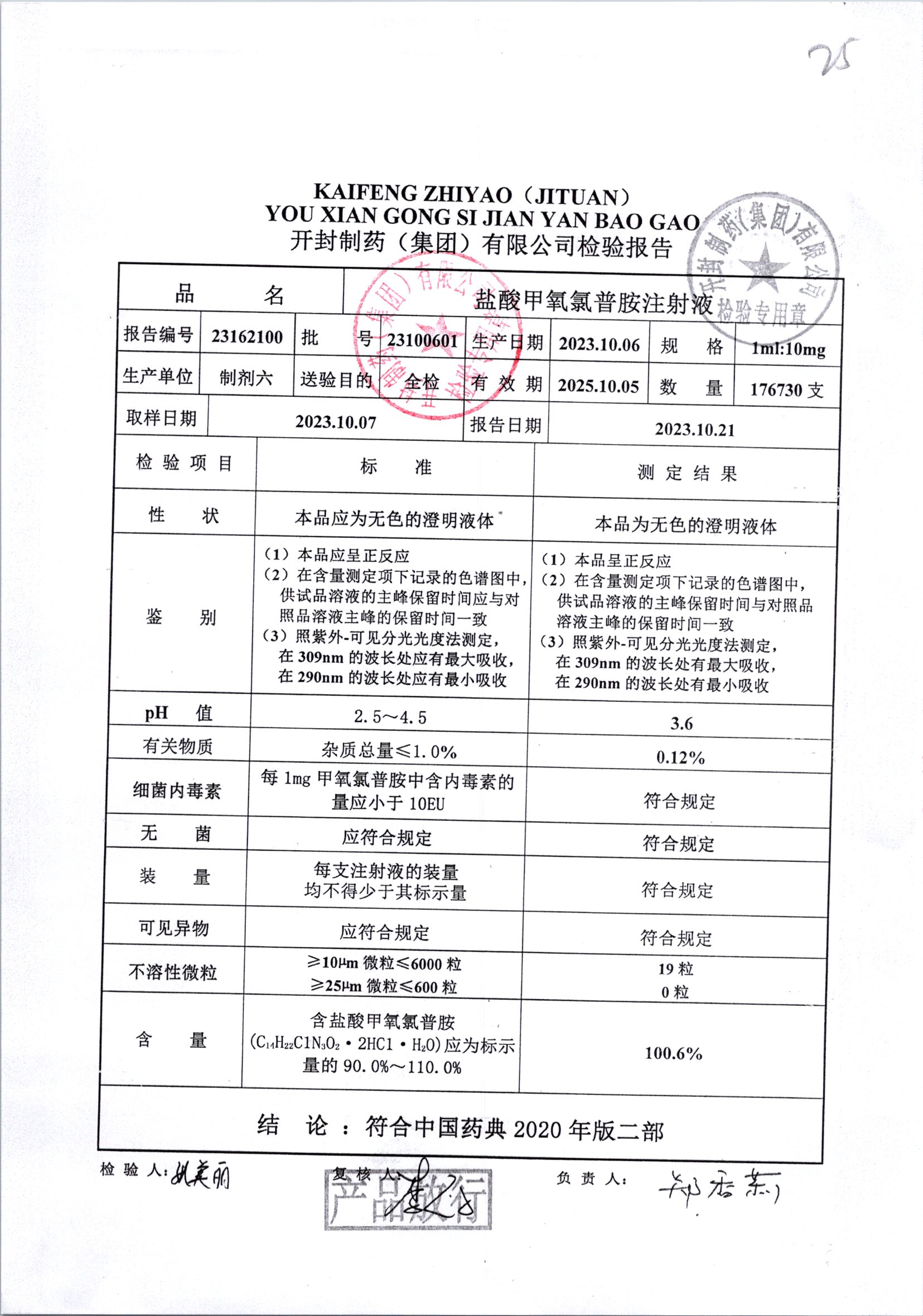盐酸甲氧氯普胺注射液 | 1ml:10mg | 24062001 | 查看详情 |