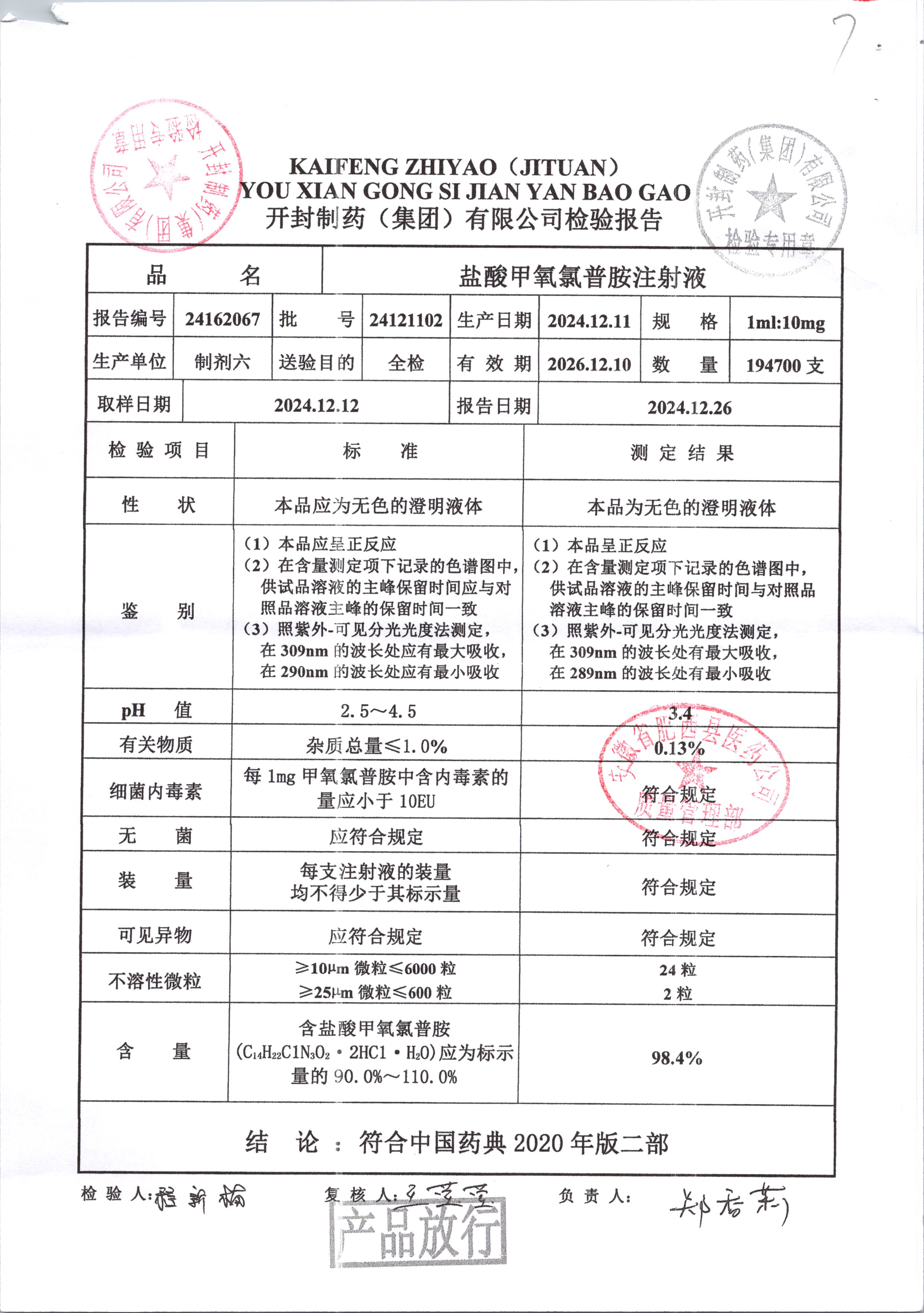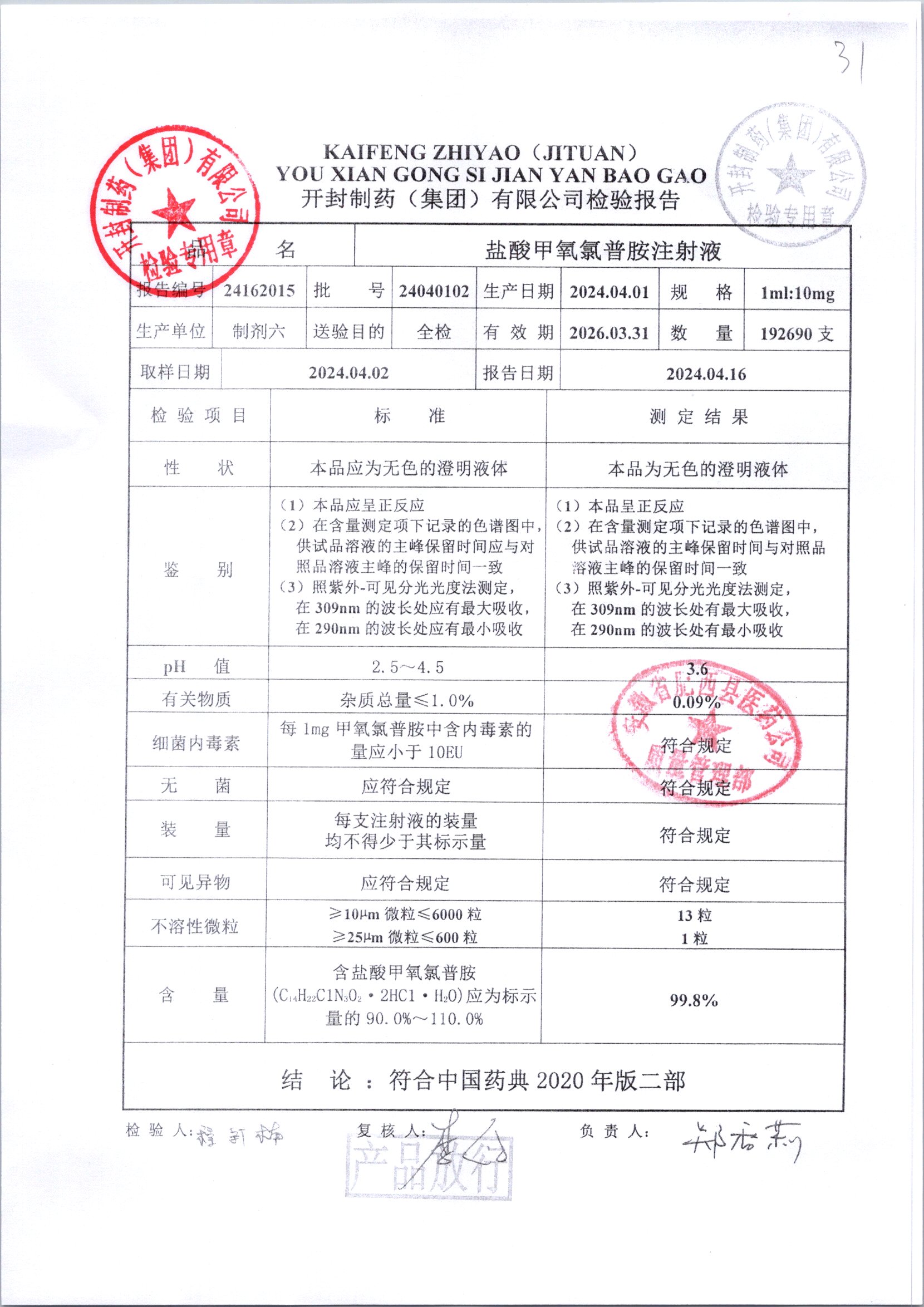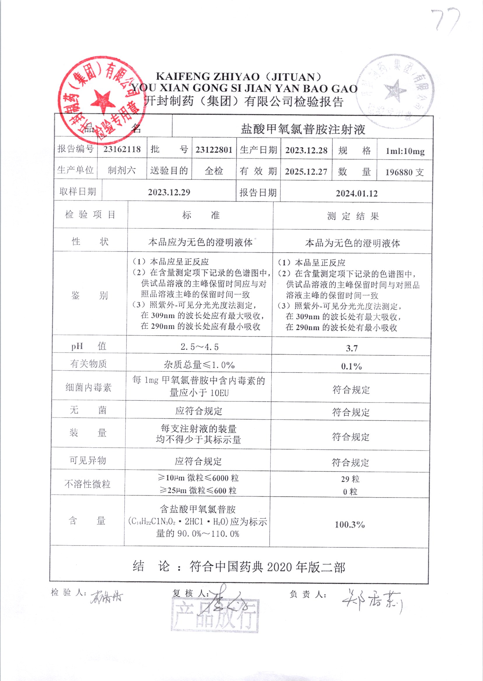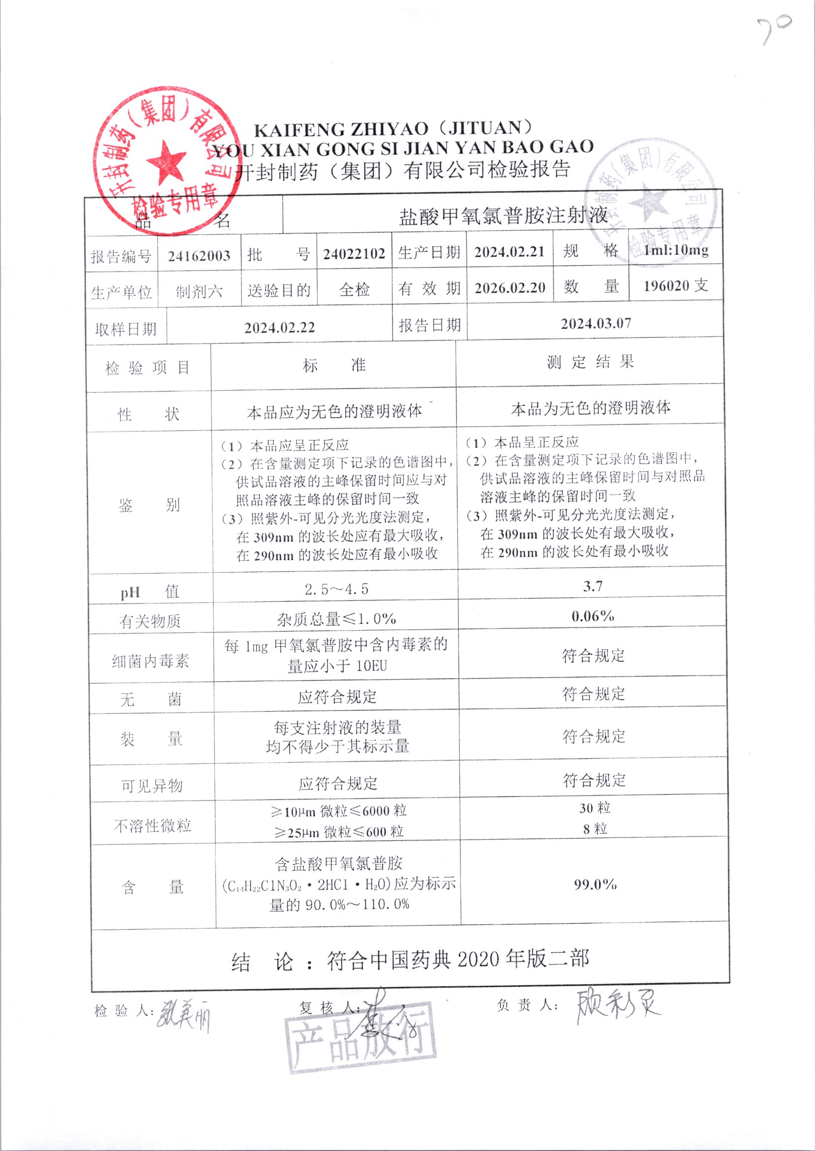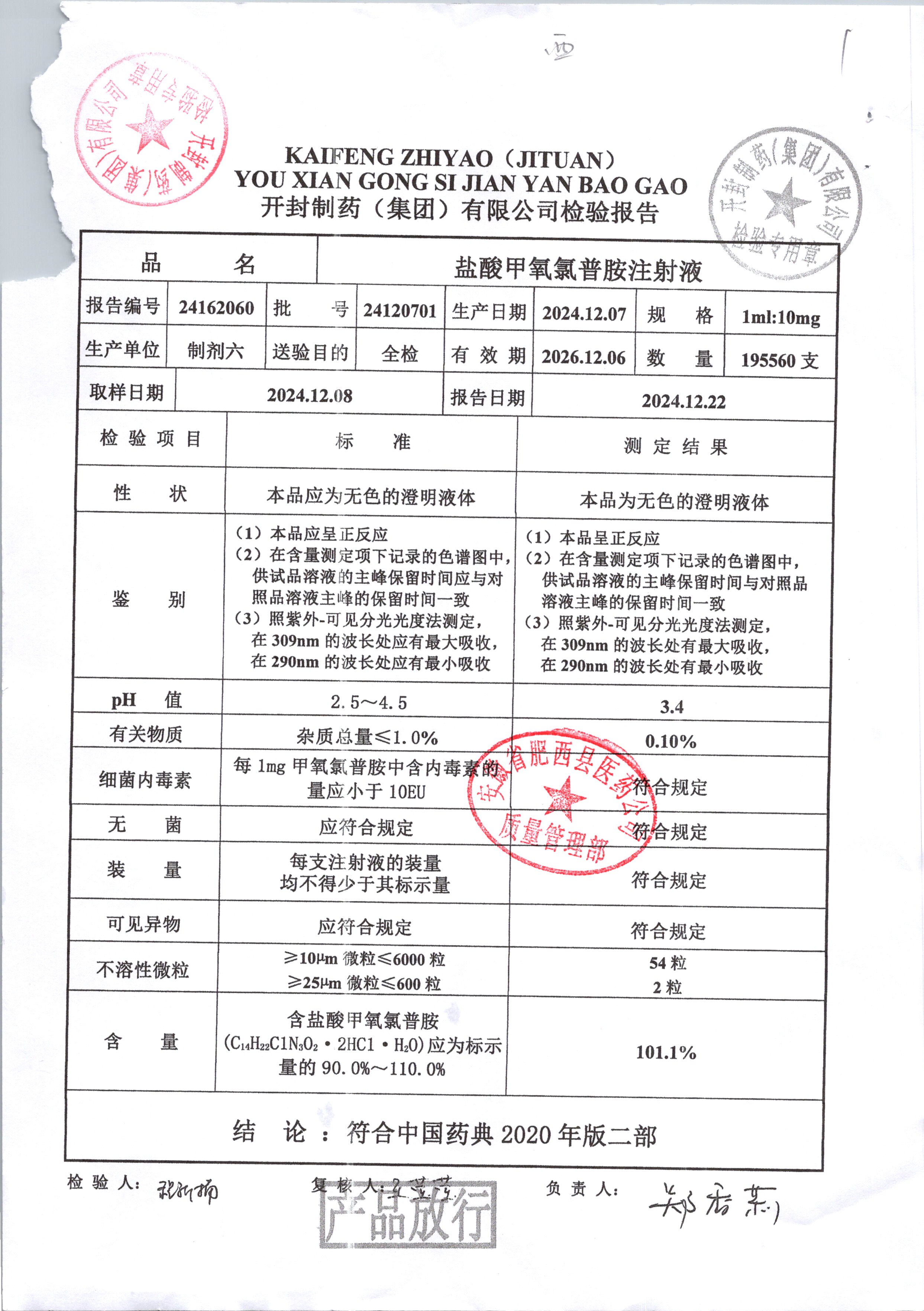 盐酸甲氧氯普胺注射液 | 1ml:10mg | 24062001 | 查看详情 |