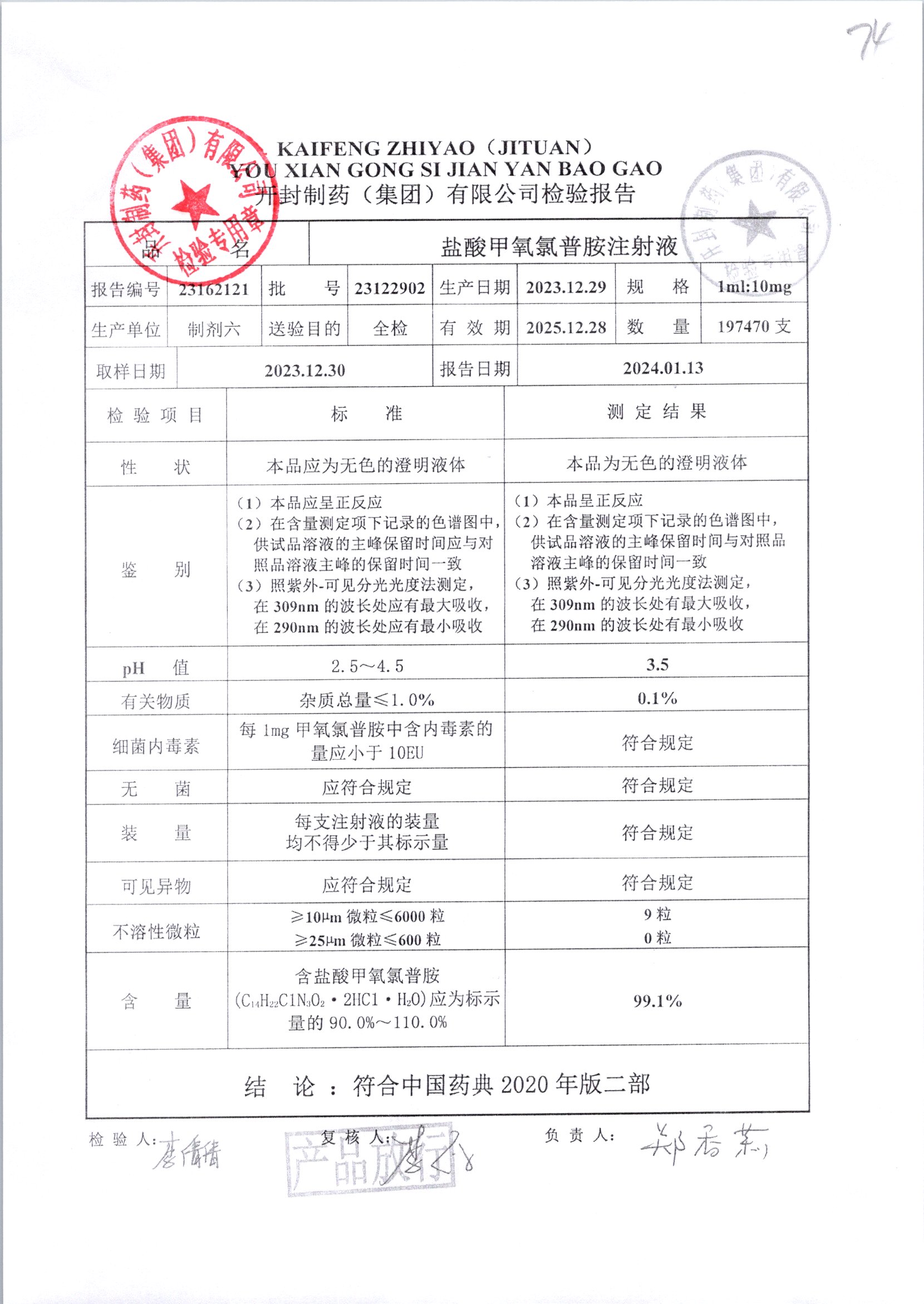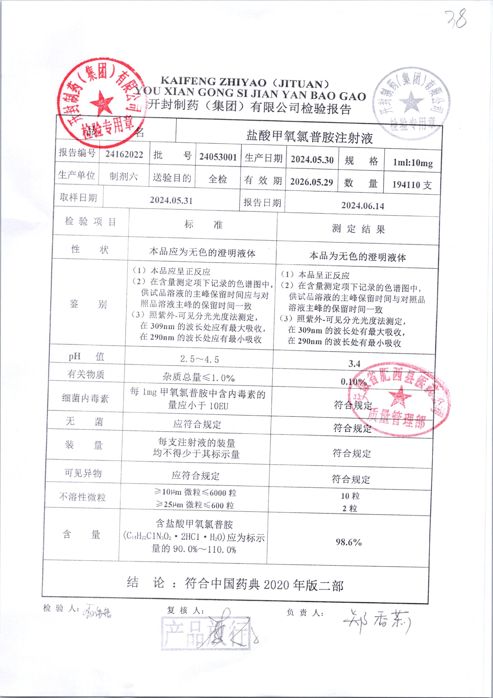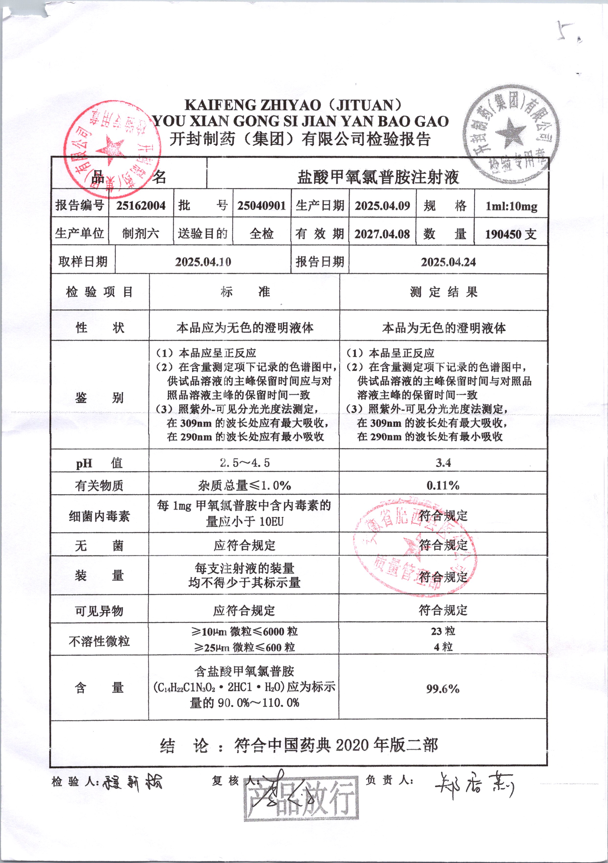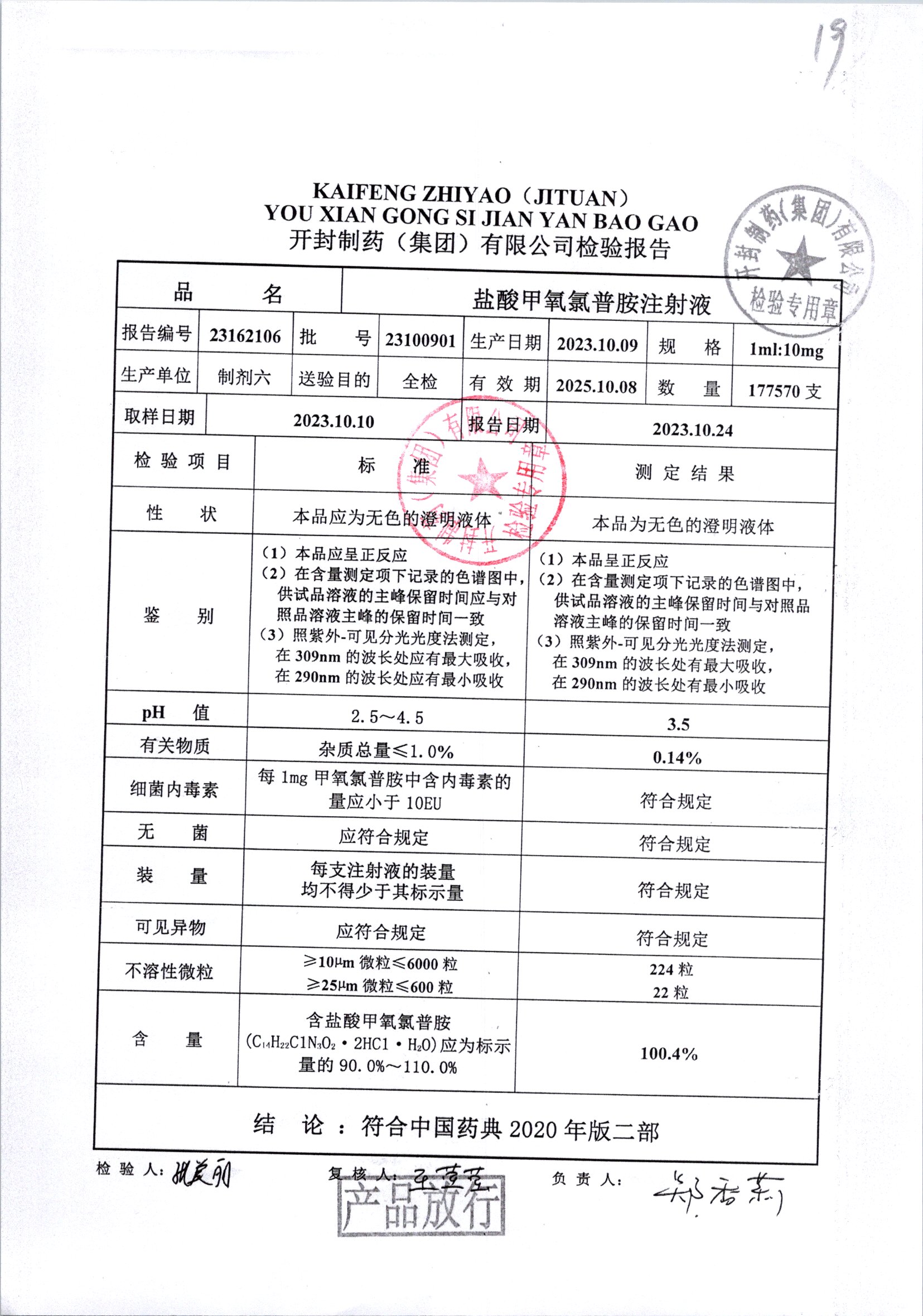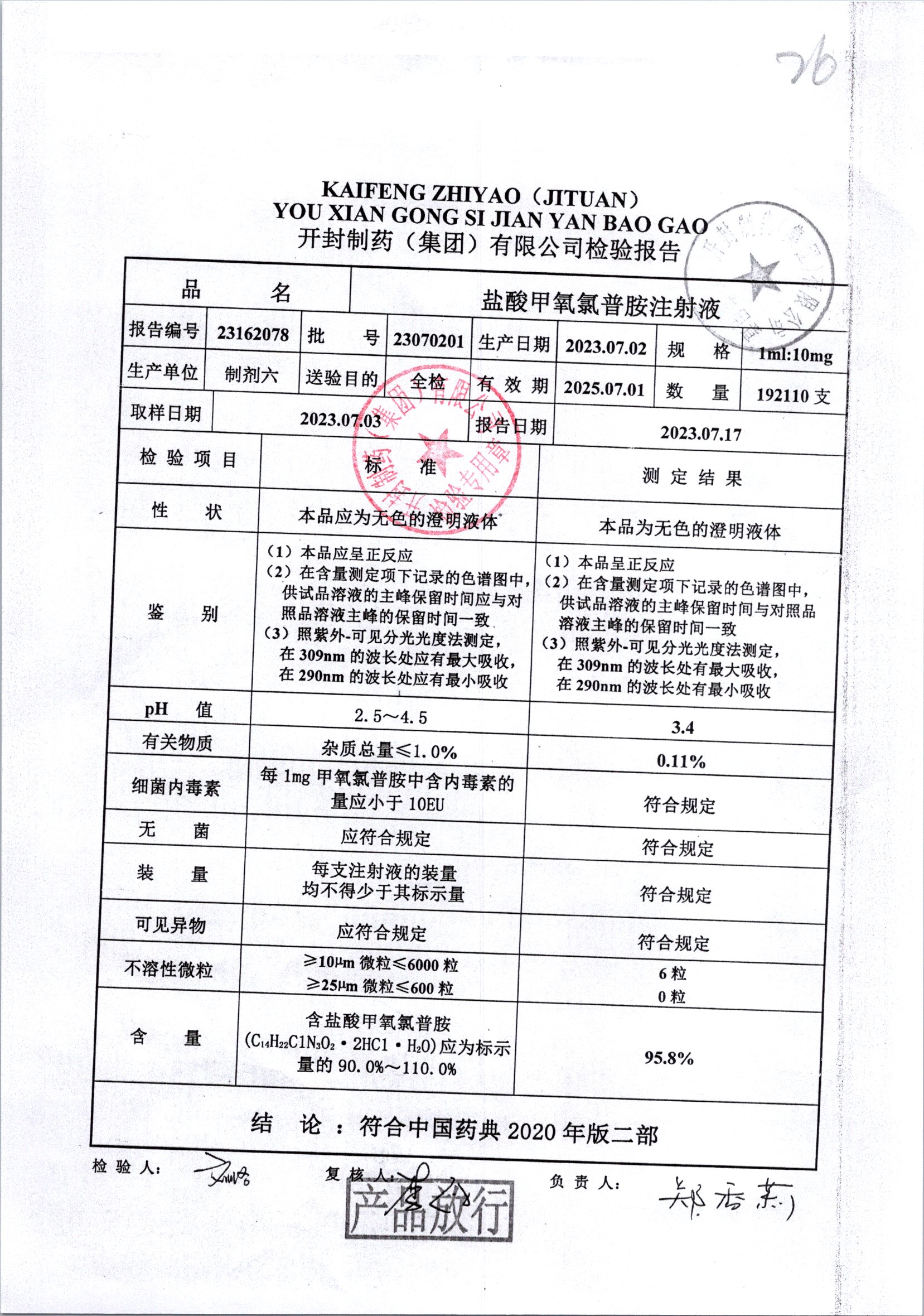 盐酸甲氧氯普胺注射液 | 1ml:10mg | 24062001 | 查看详情 |