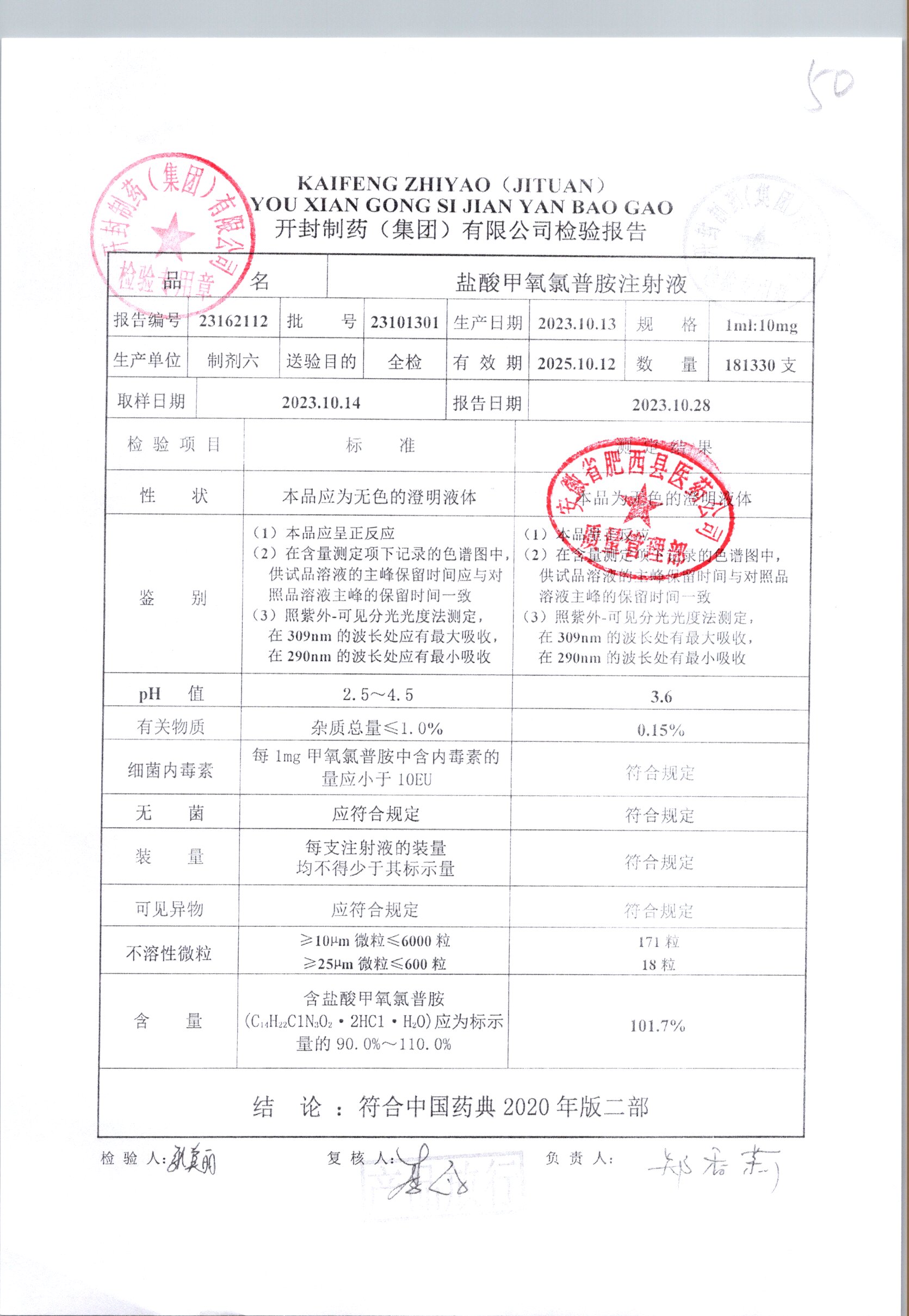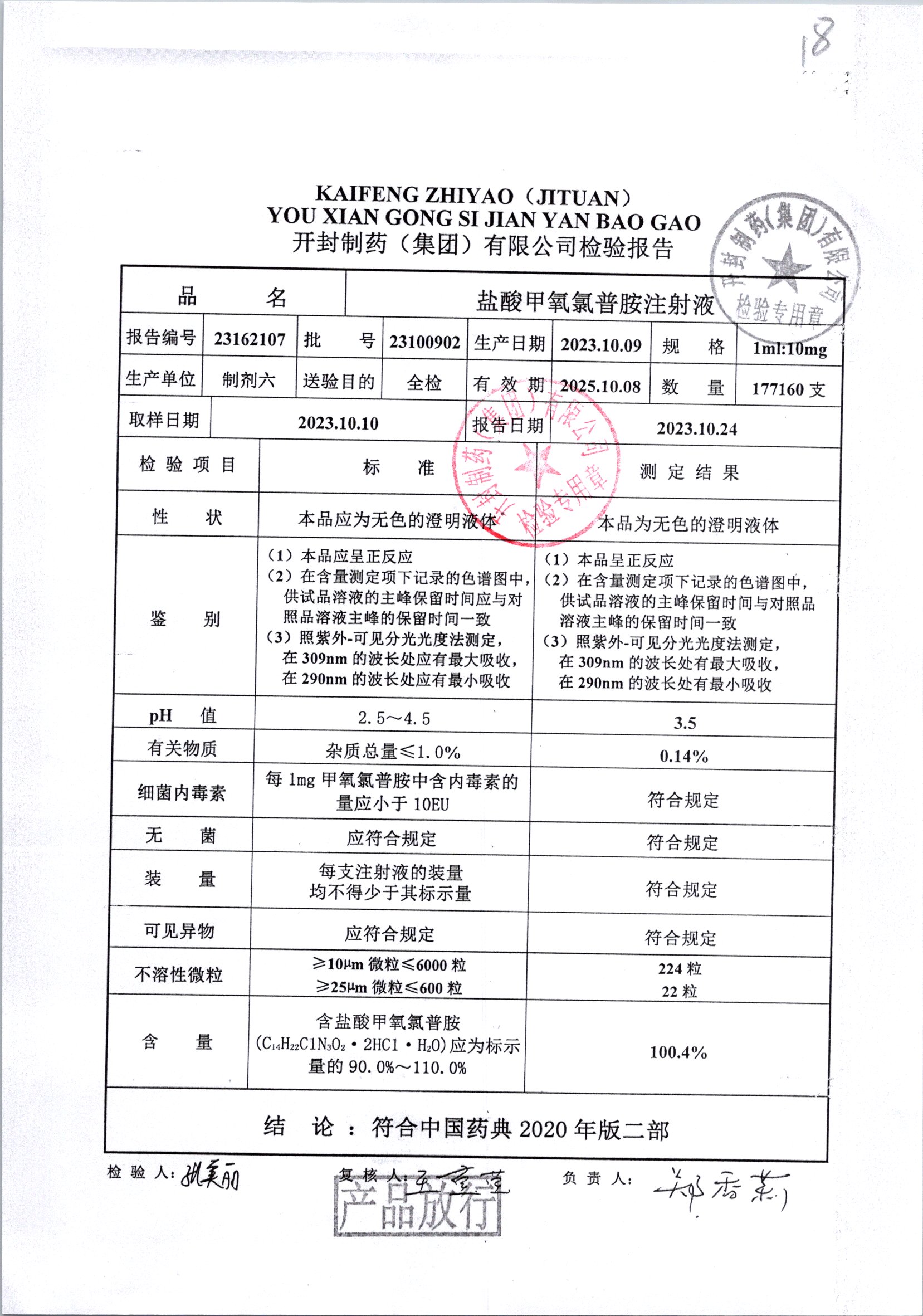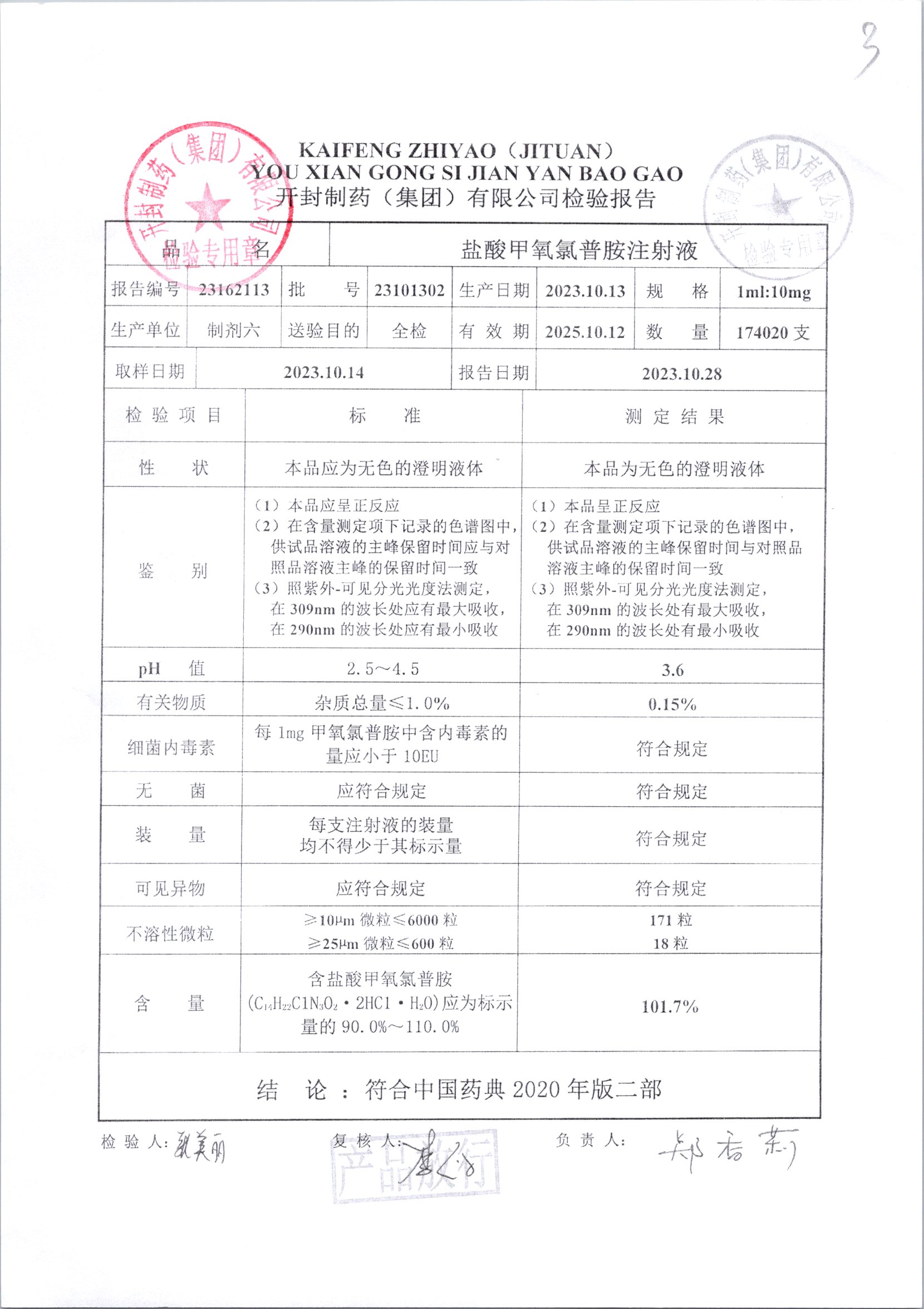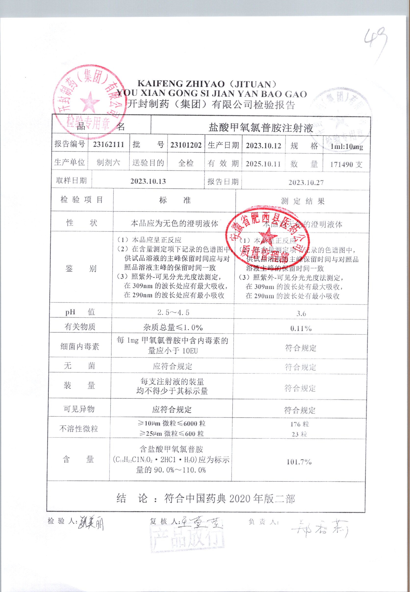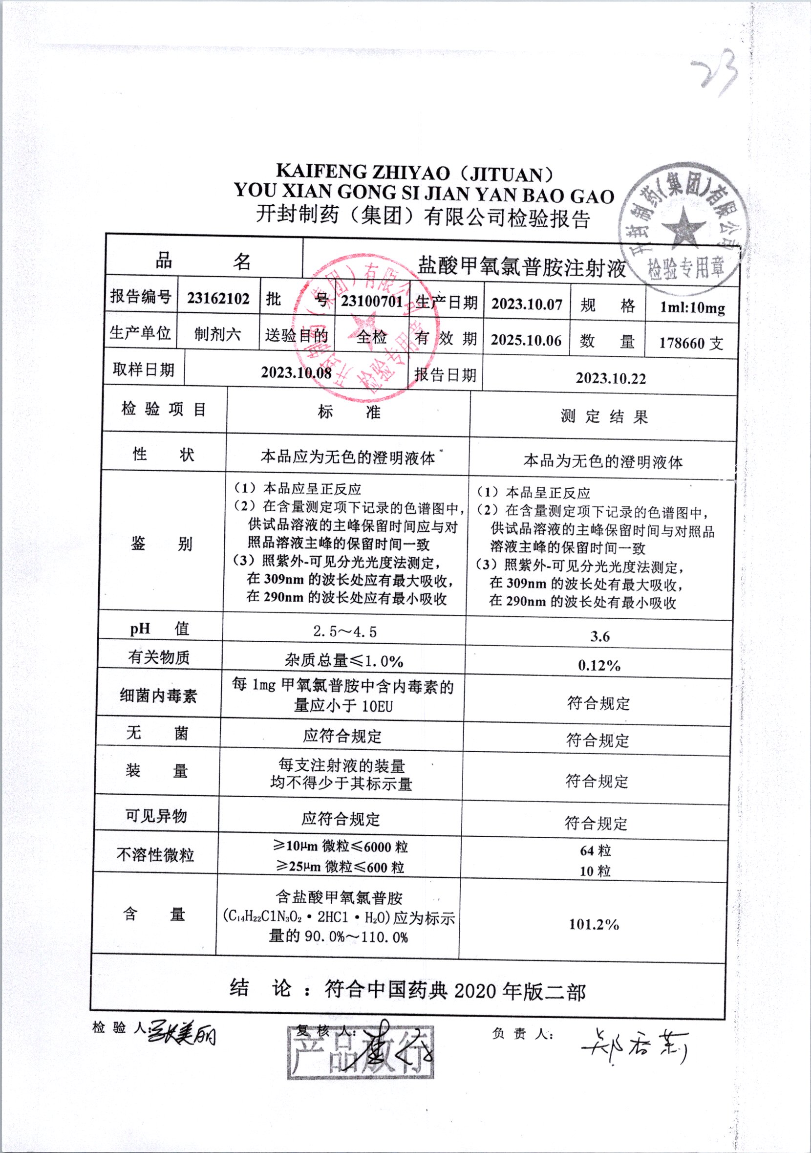盐酸甲氧氯普胺注射液 | 1ml:10mg | 23100901 | 查看详情 |
