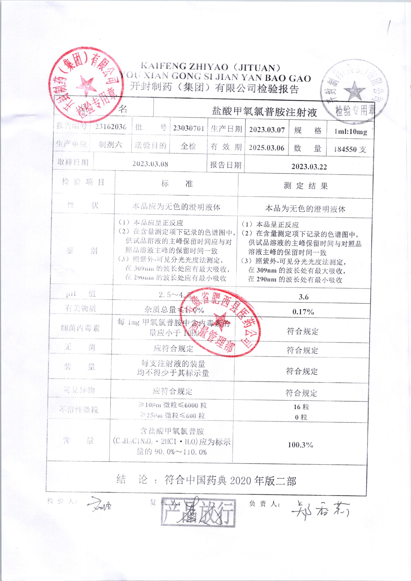 盐酸甲氧氯普胺注射液 | 1ml:10mg | 23100701 | 查看详情 |