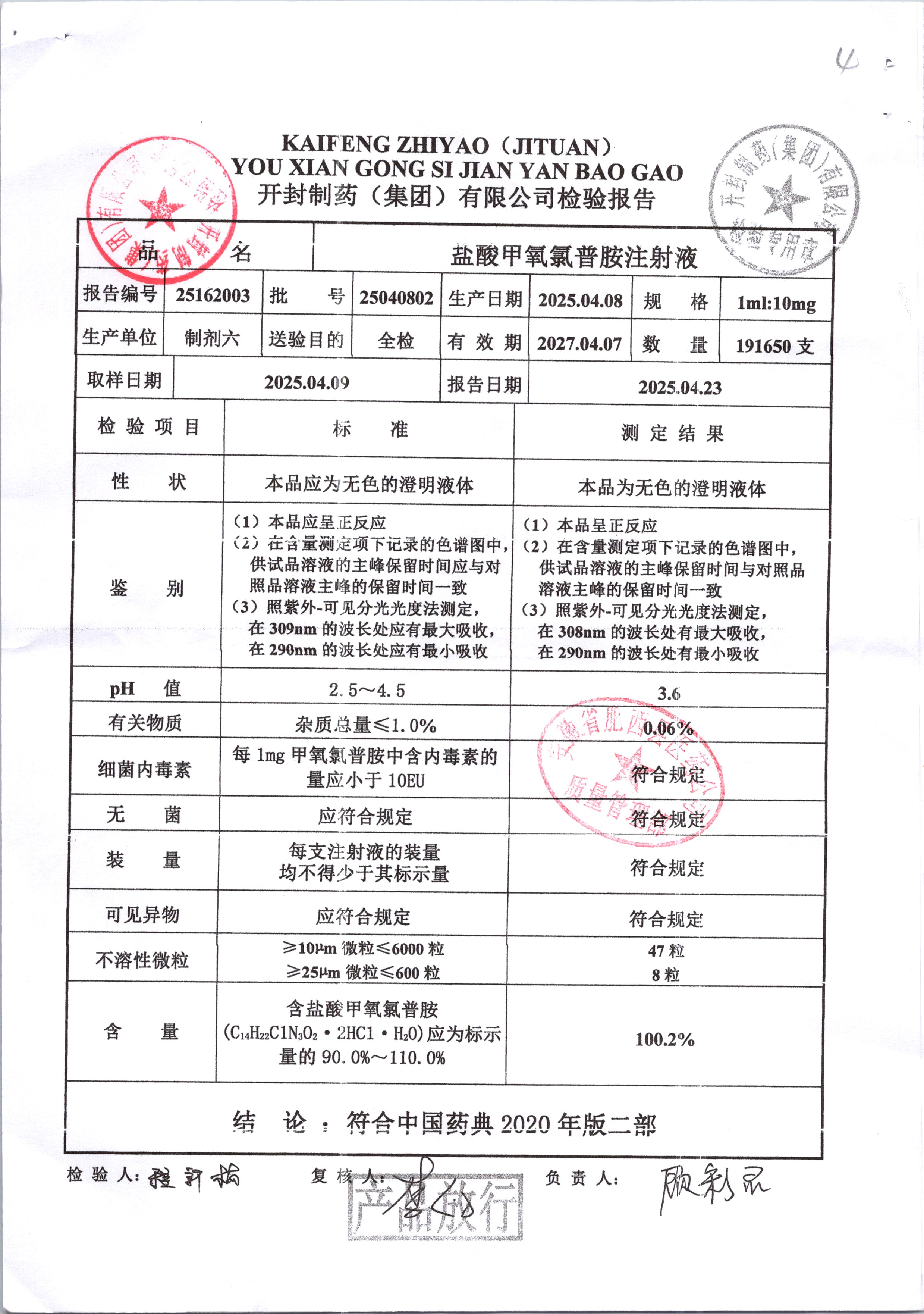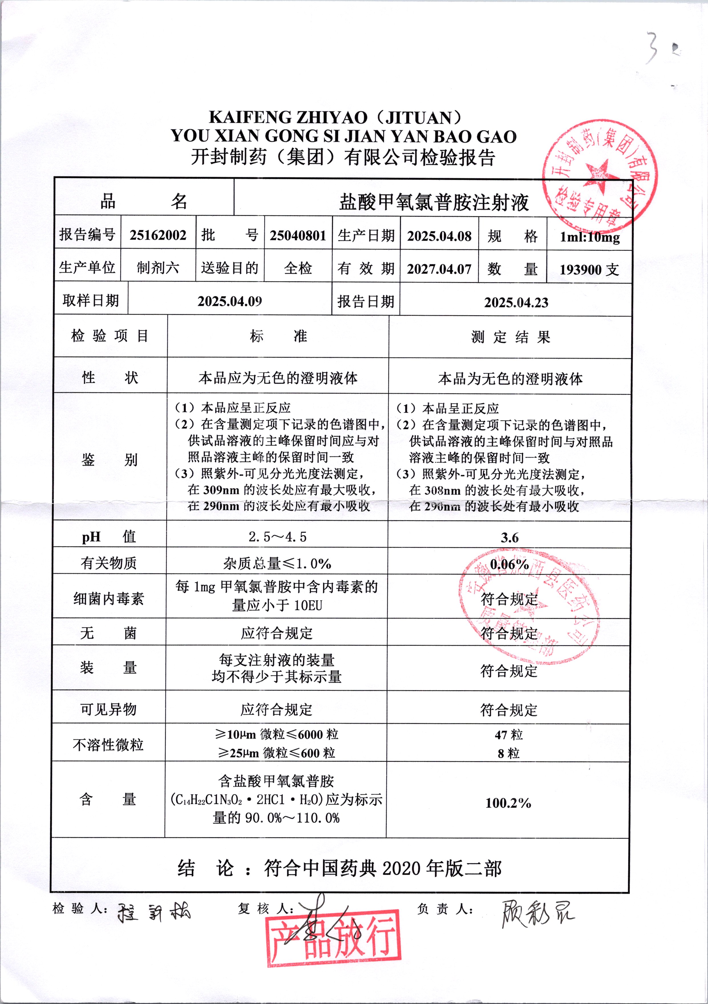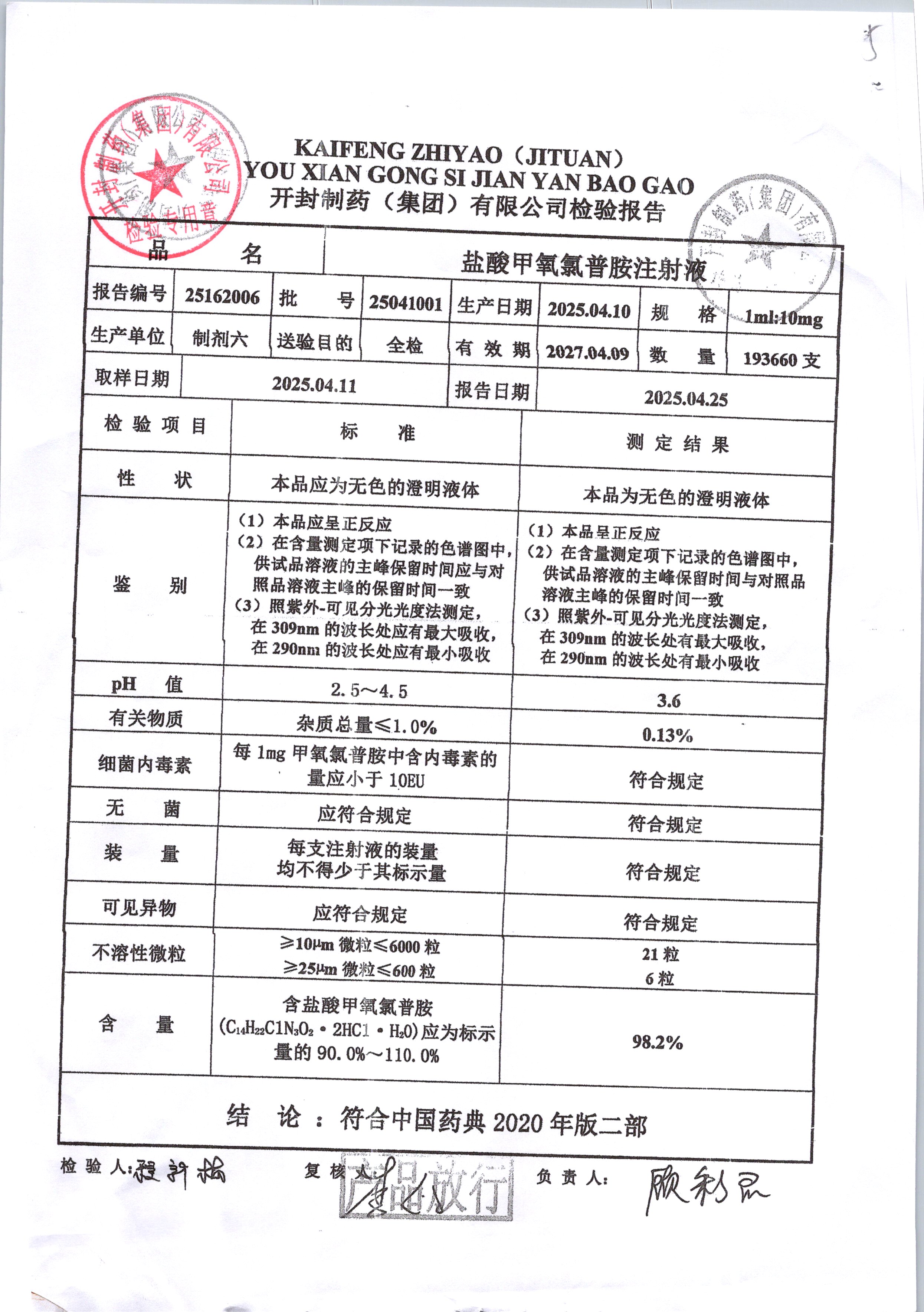 盐酸甲氧氯普胺注射液 | 1ml:10mg | 25040801 | 查看详情 |
