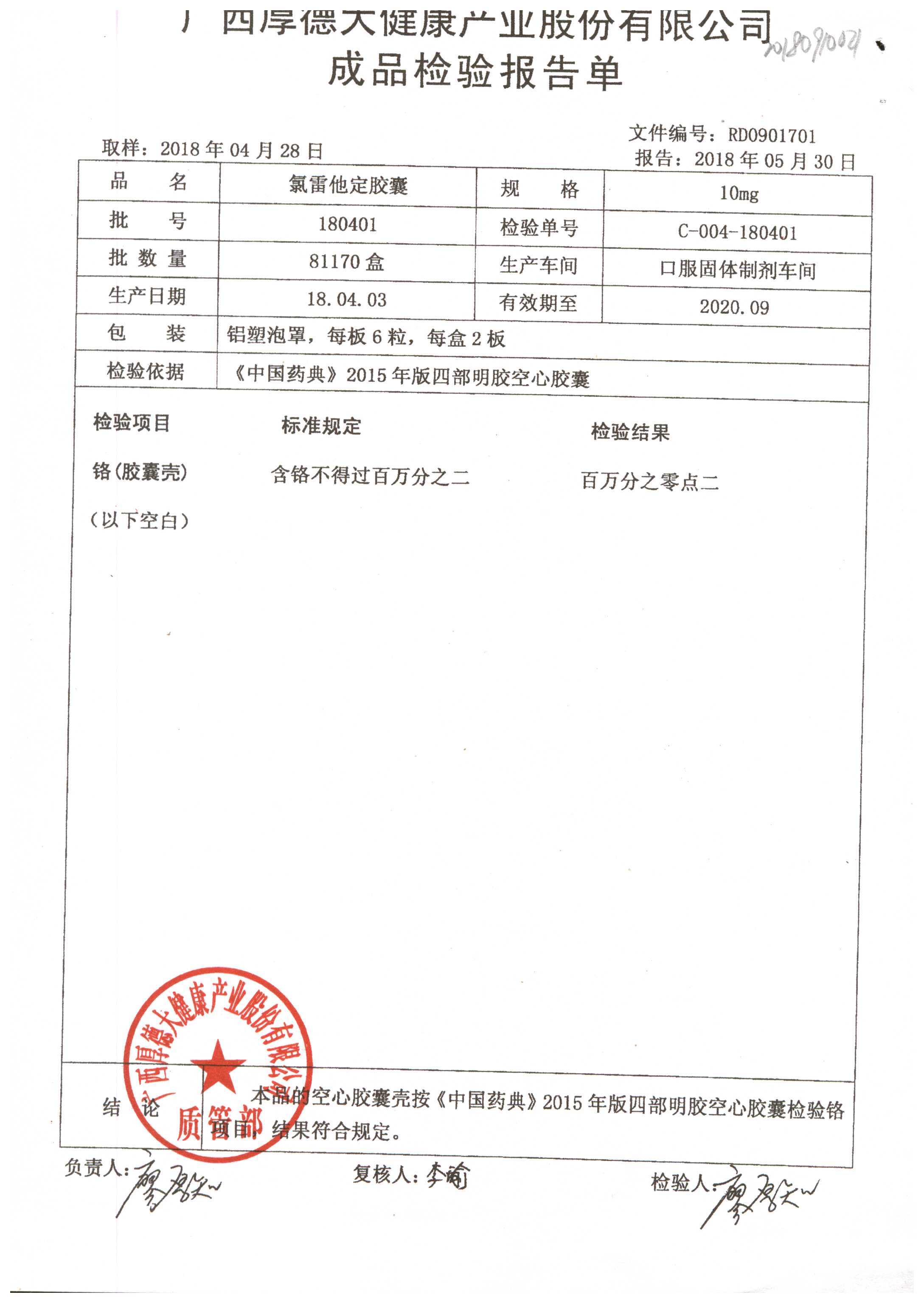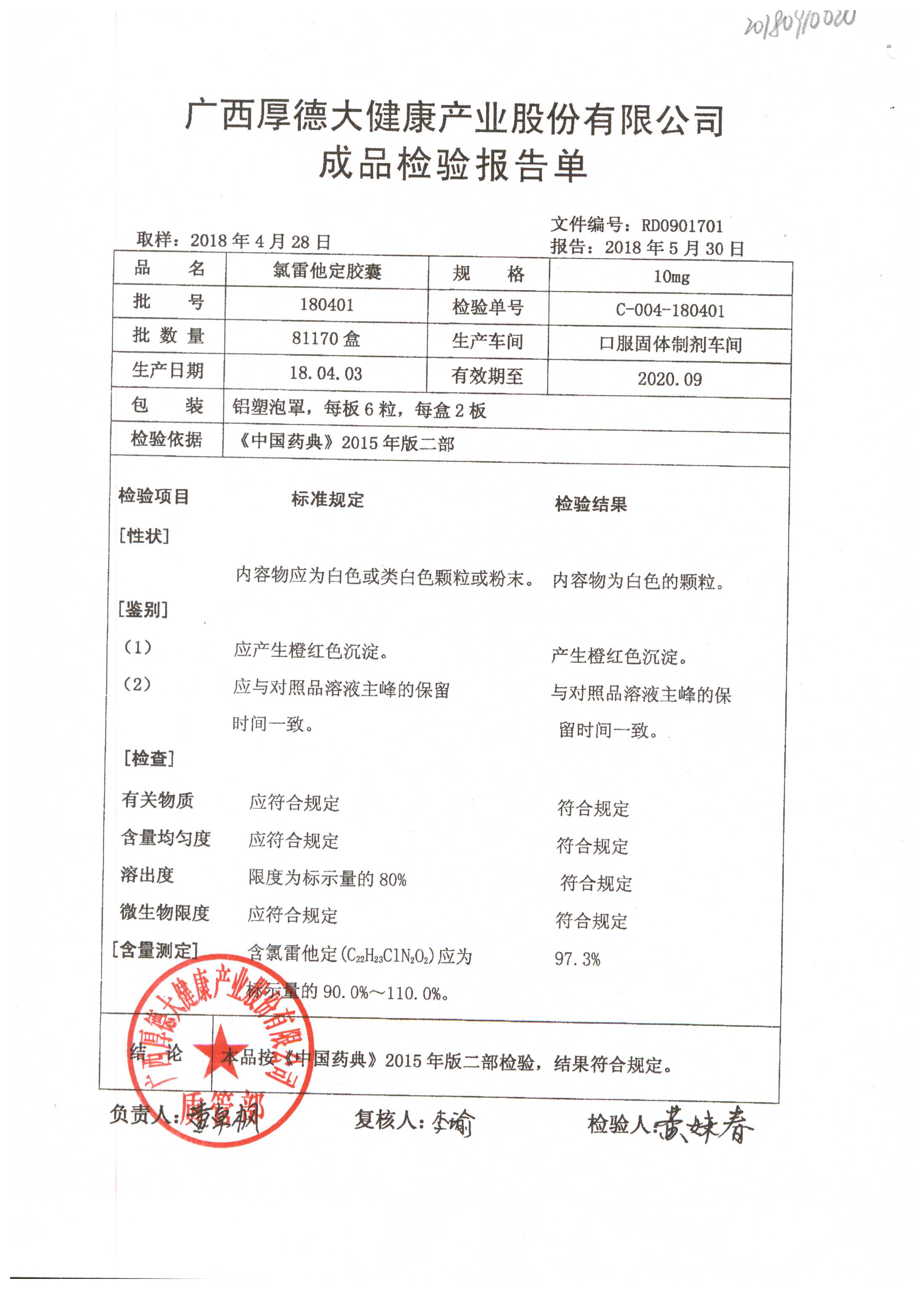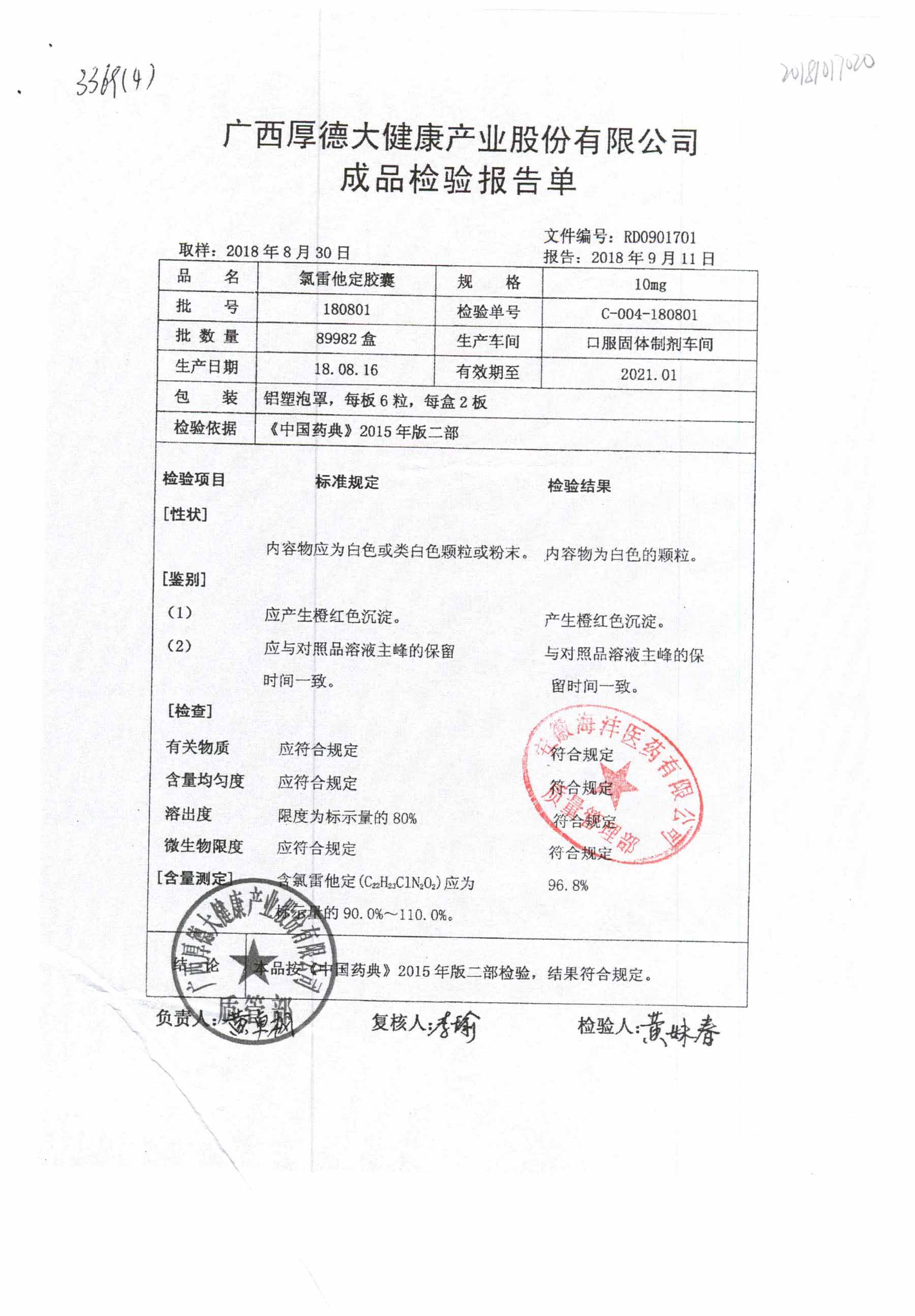 氯雷他定胶囊 | 10mg*12粒 | 180401(铬) | 查看详情 |